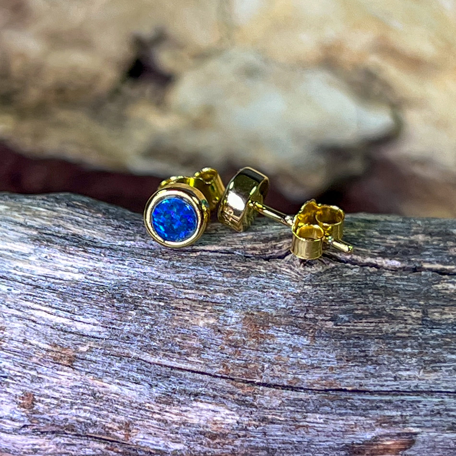Add some sparkle to your look with these dainty gold plated sterling silver earrings featuring 4mm opal triplet round studs. These earrings are perfect for adding a touch of elegance and playfulness to any outfit. Embrace your unique style with these gold opal studs.
