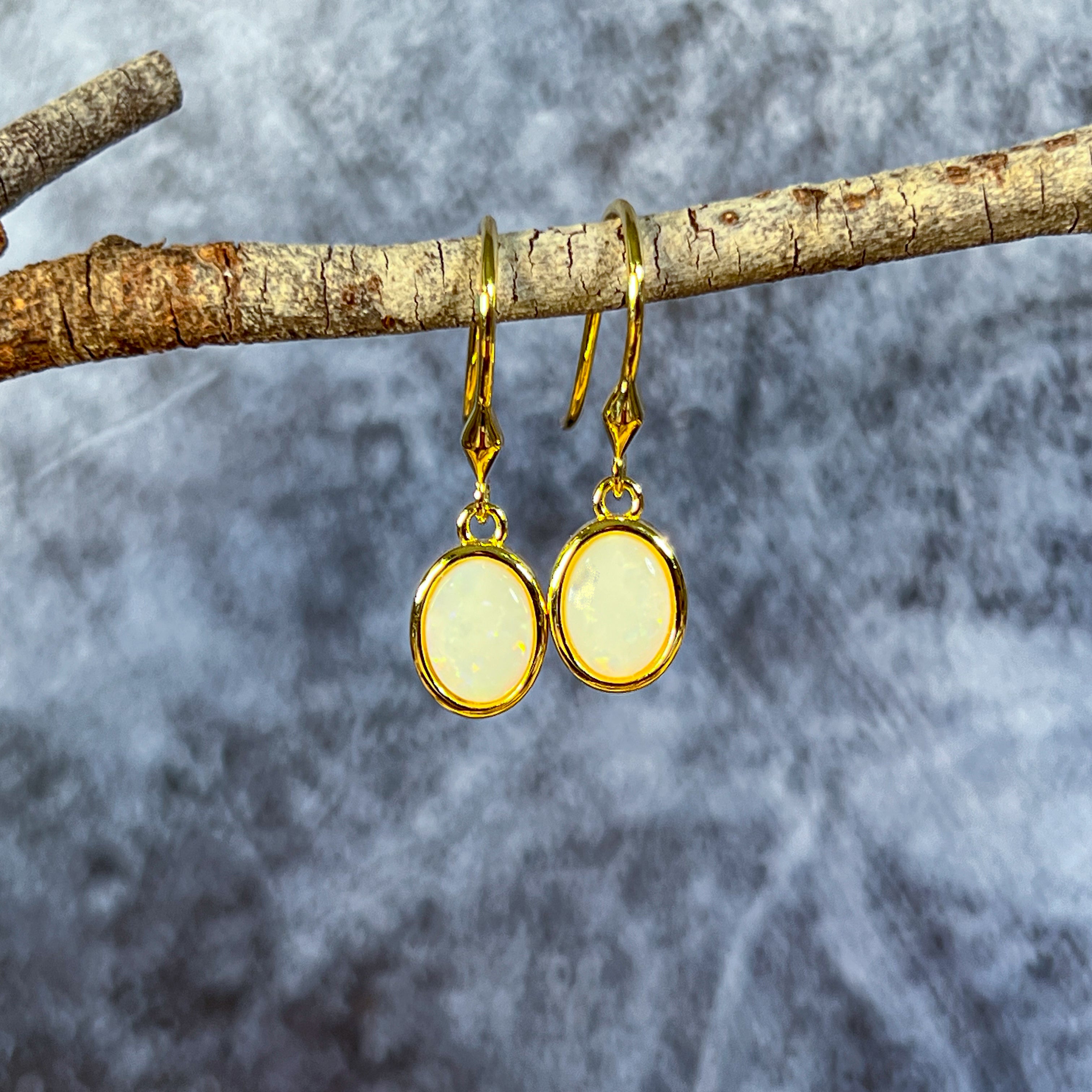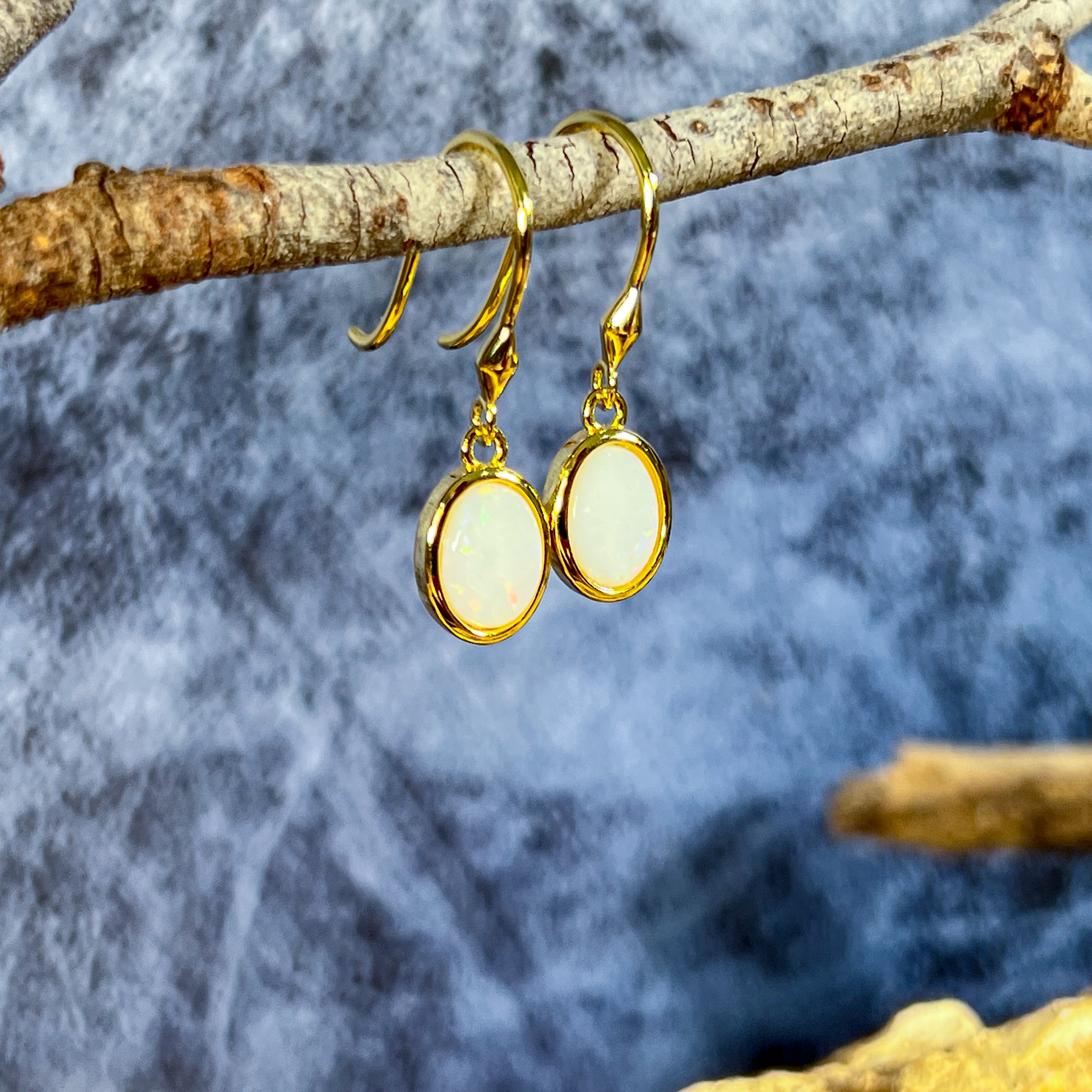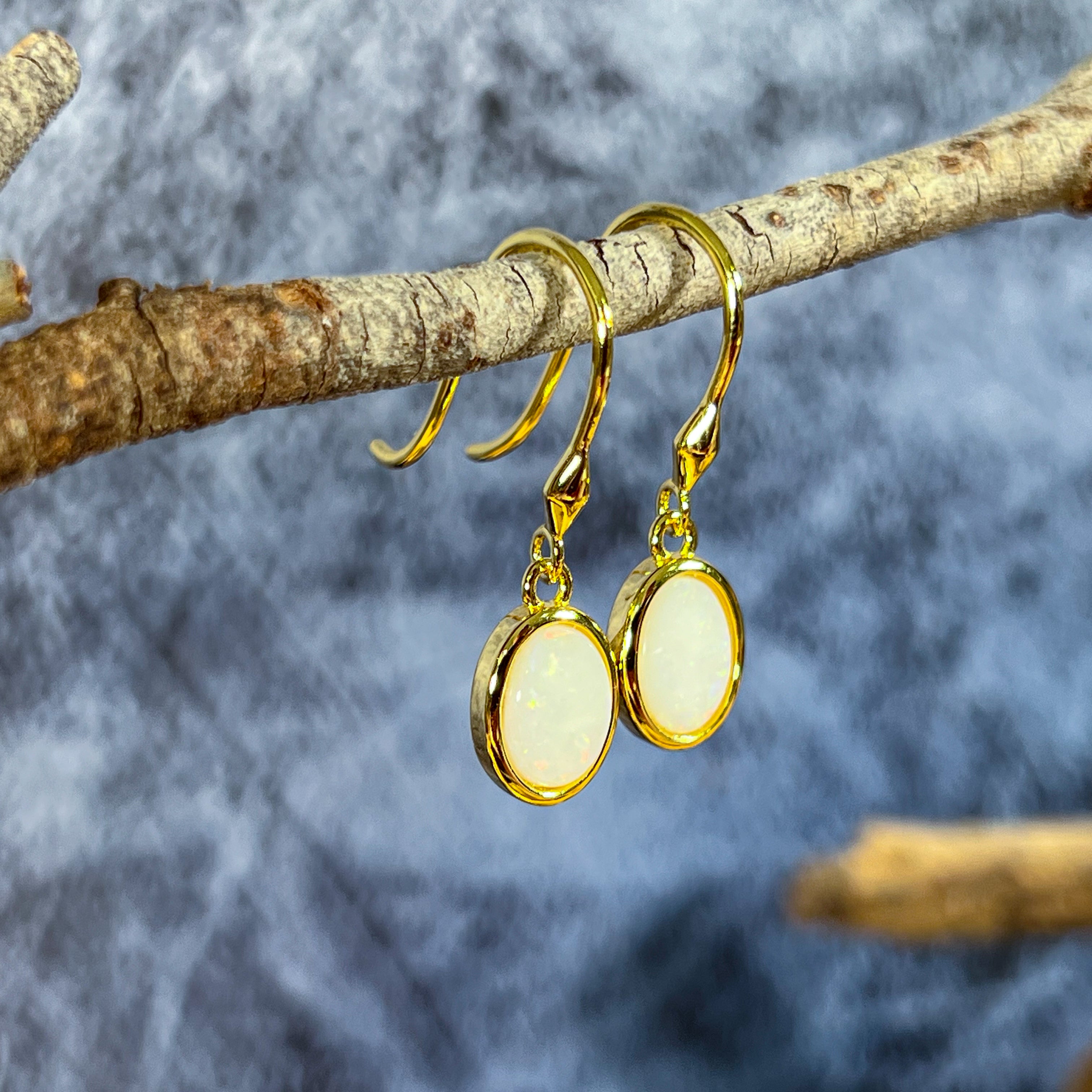 Crafted with expertly sourced White Opal from South Australia, these Gold Plated Sterling Silver drop earrings showcase a stunning 8x6mm bezel set stone. Elevate your style with the timeless beauty of these opulent earrings, perfect for gifting or treating yourself to a luxurious accessory.