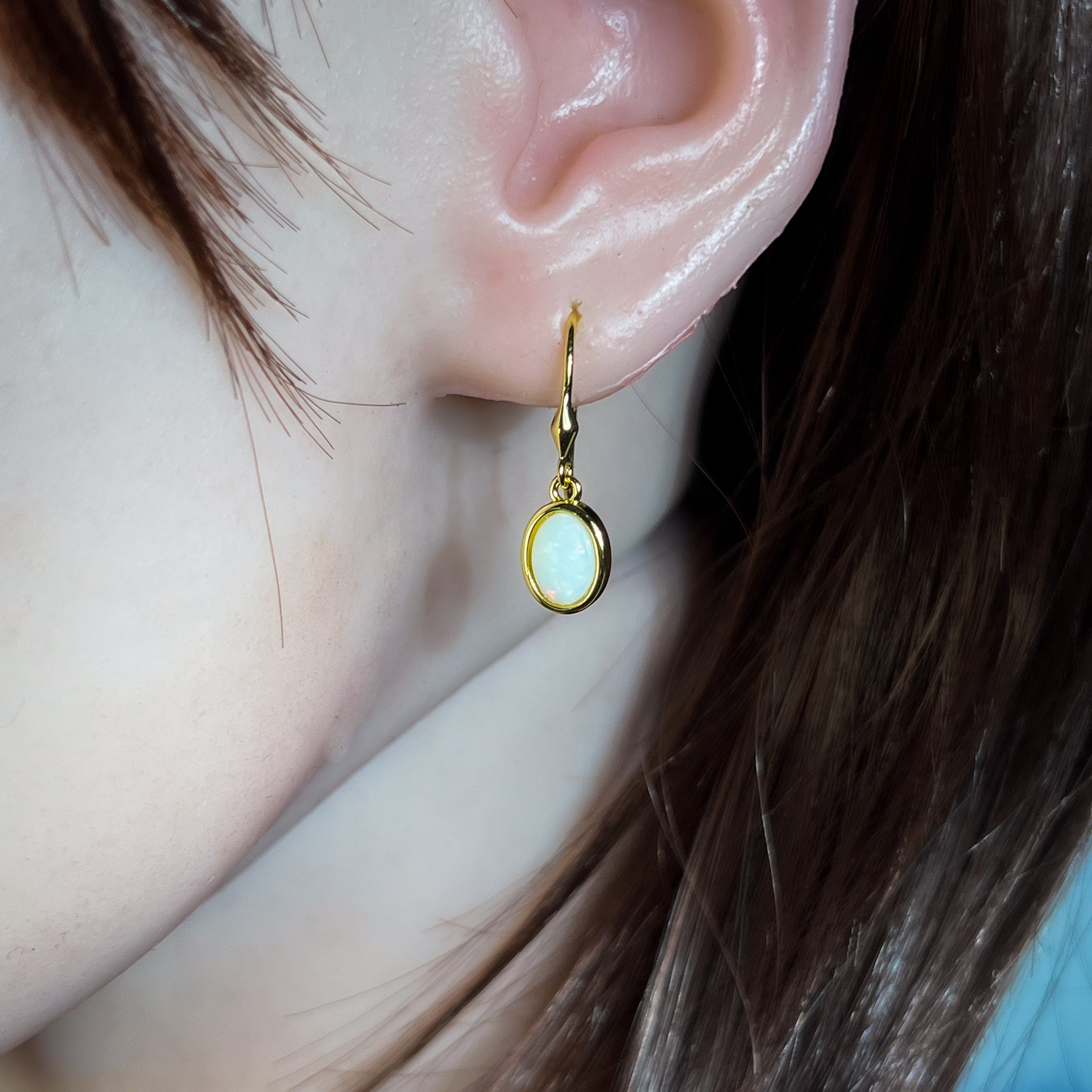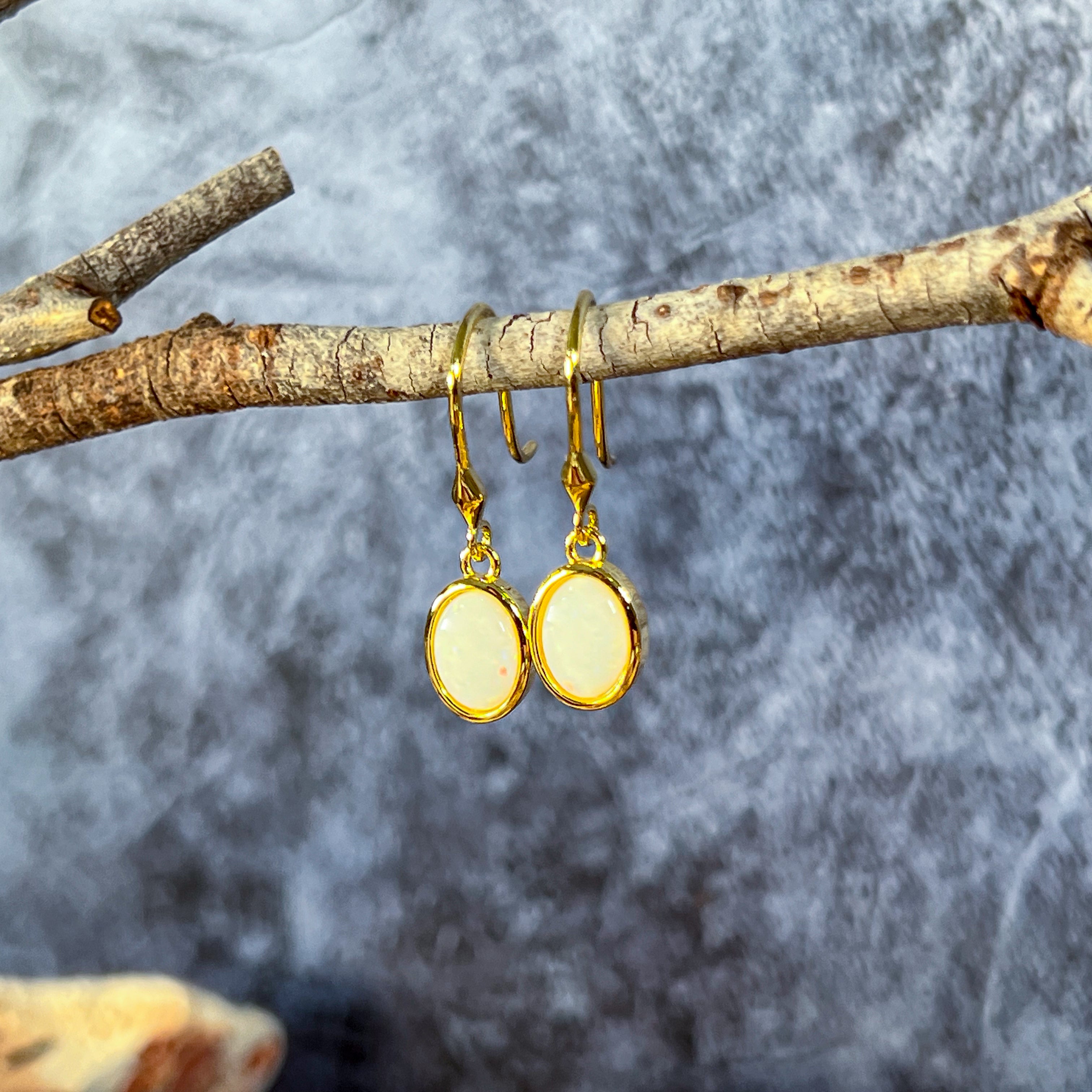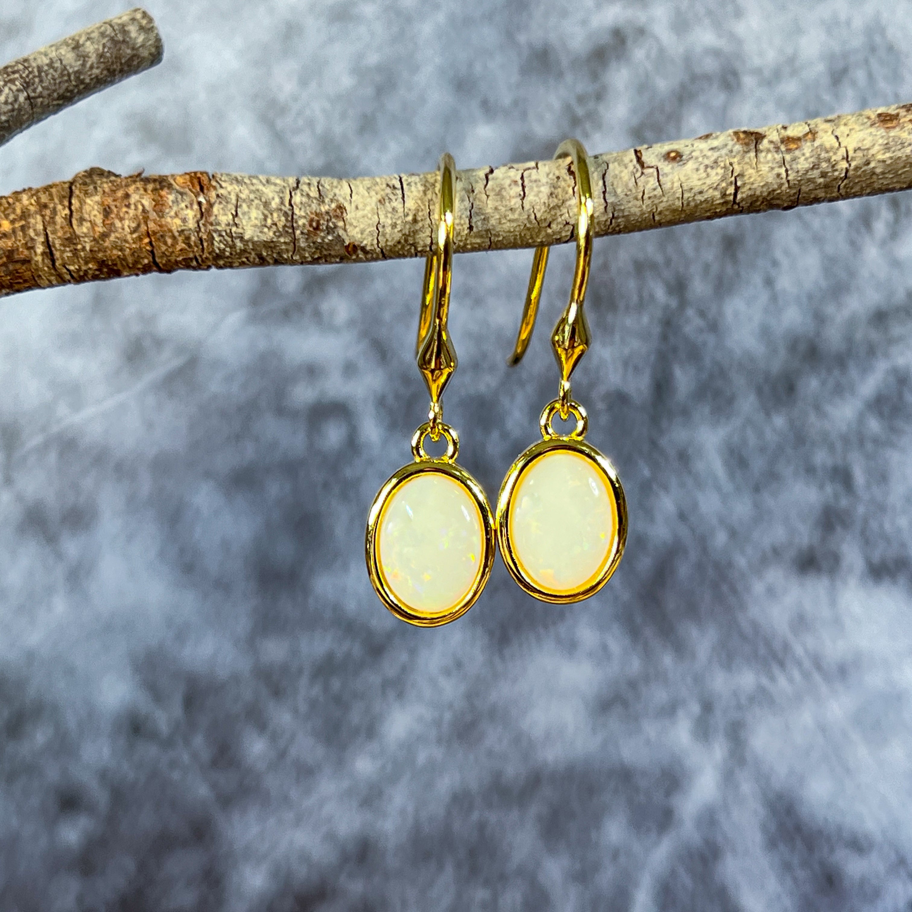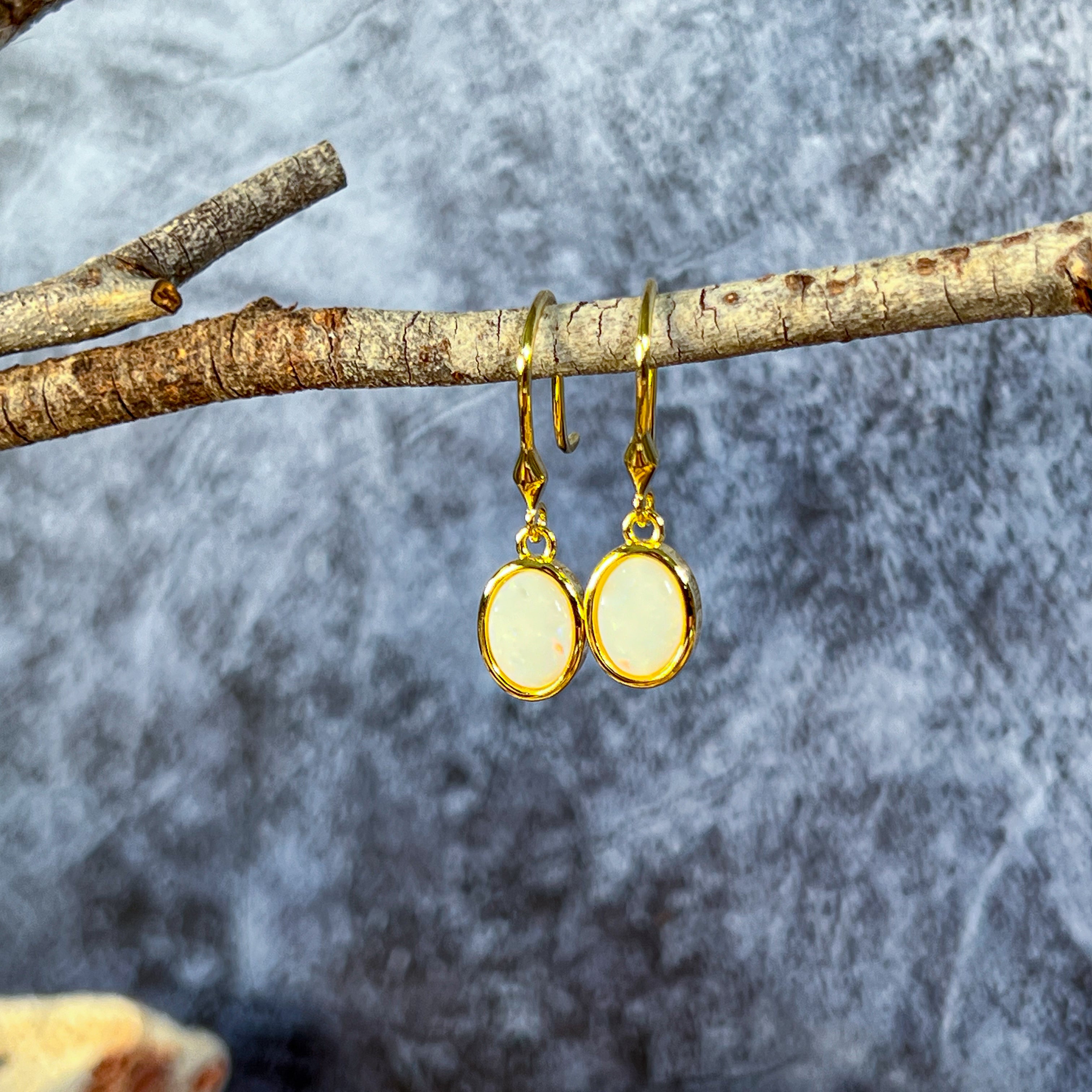 Crafted with expertly sourced White Opal from South Australia, these Gold Plated Sterling Silver drop earrings showcase a stunning 8x6mm bezel set stone. Elevate your style with the timeless beauty of these opulent earrings, perfect for gifting or treating yourself to a luxurious accessory.