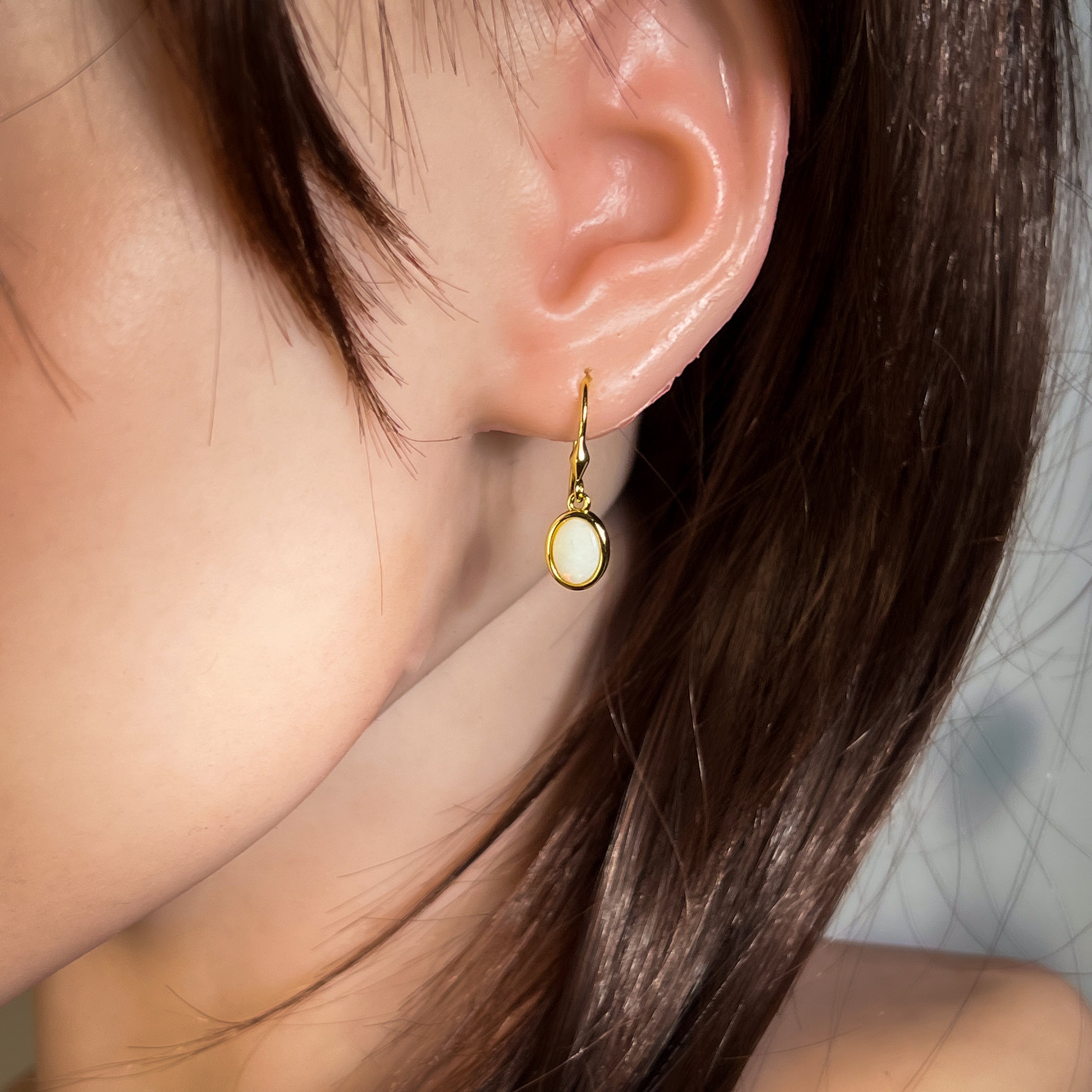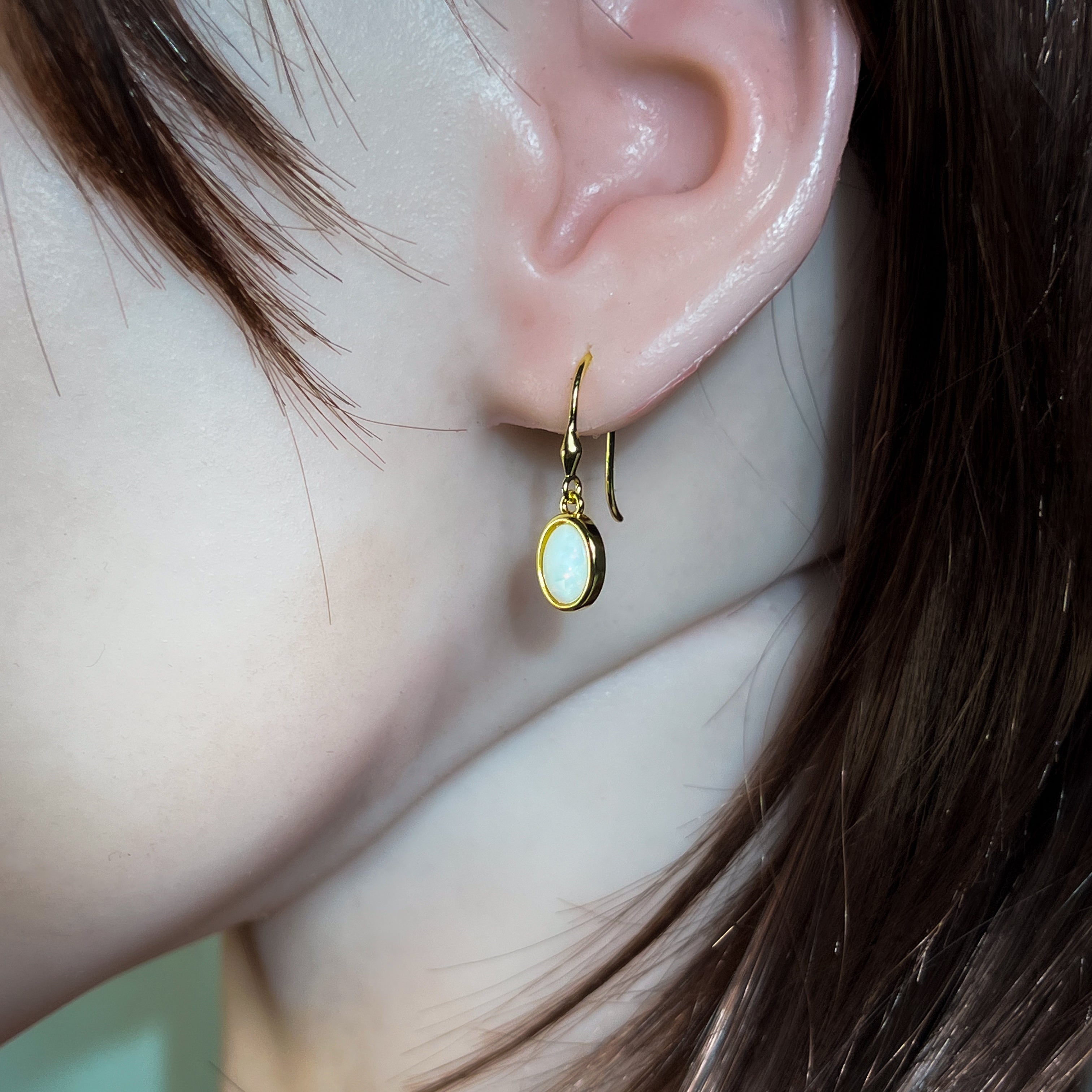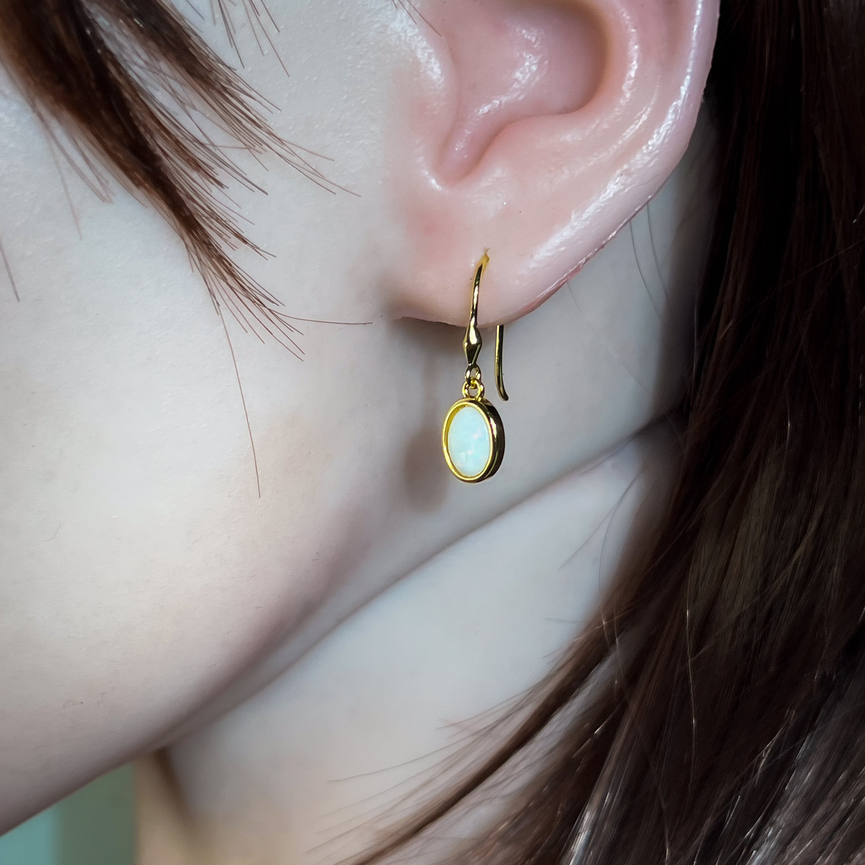 Gold Plated Sterling Silver drop bezel set style White Opal earrings 8x6mm