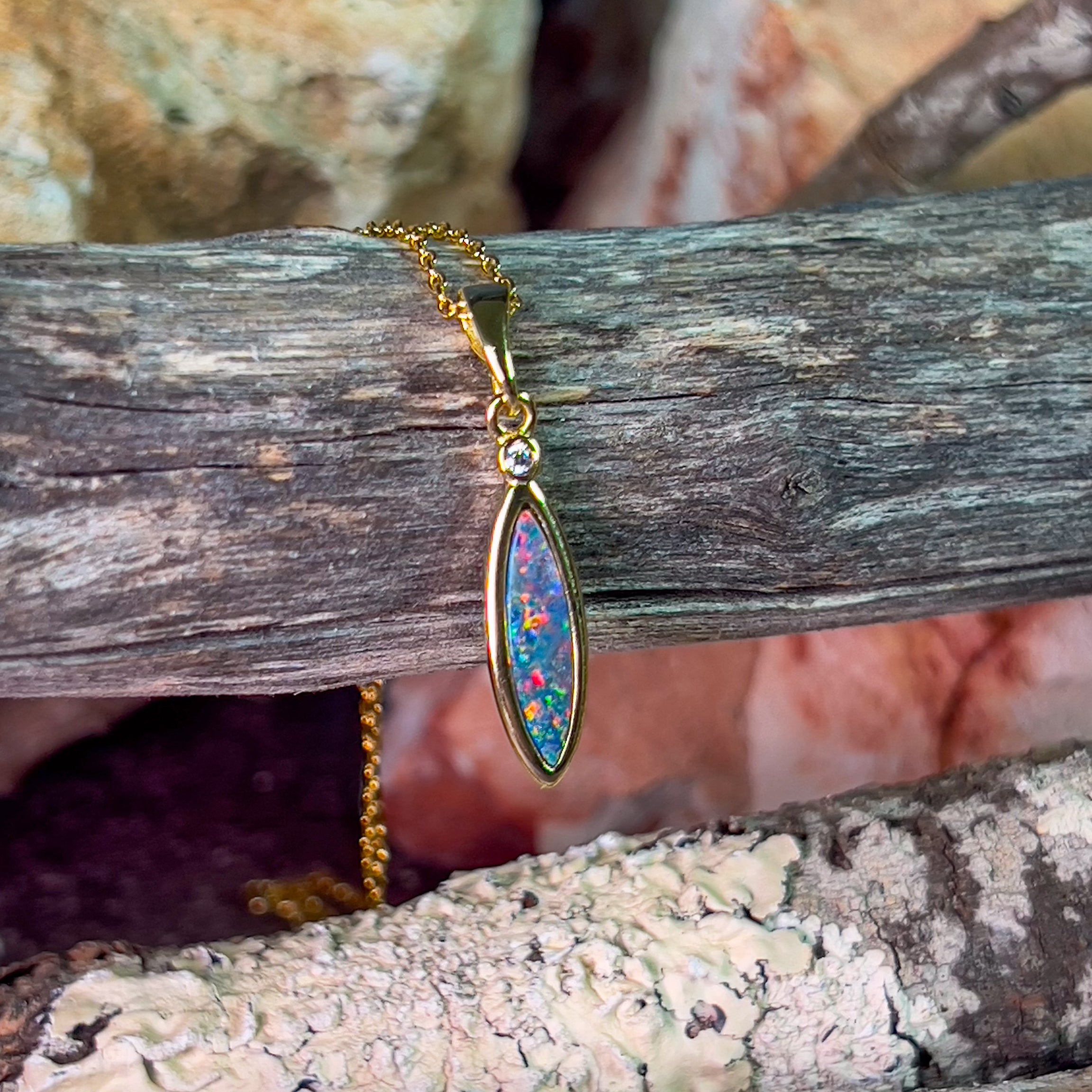 Experience luxury and elegance with our Gold Plated Sterling Silver Marquise shape Opal doublet pendant. The drop design adds a touch of sophistication to any outfit. Elevate your style and make a statement with this stunning piece.