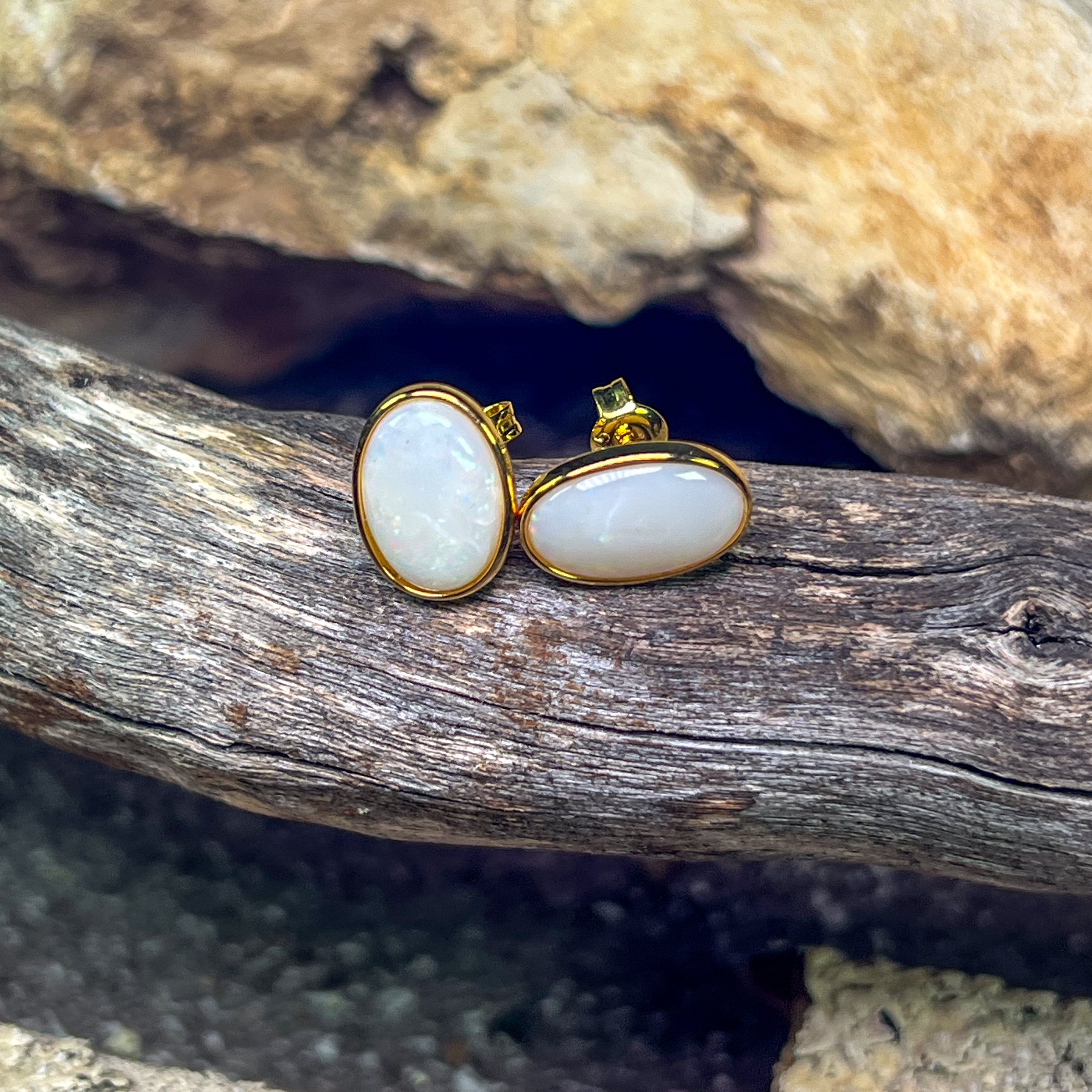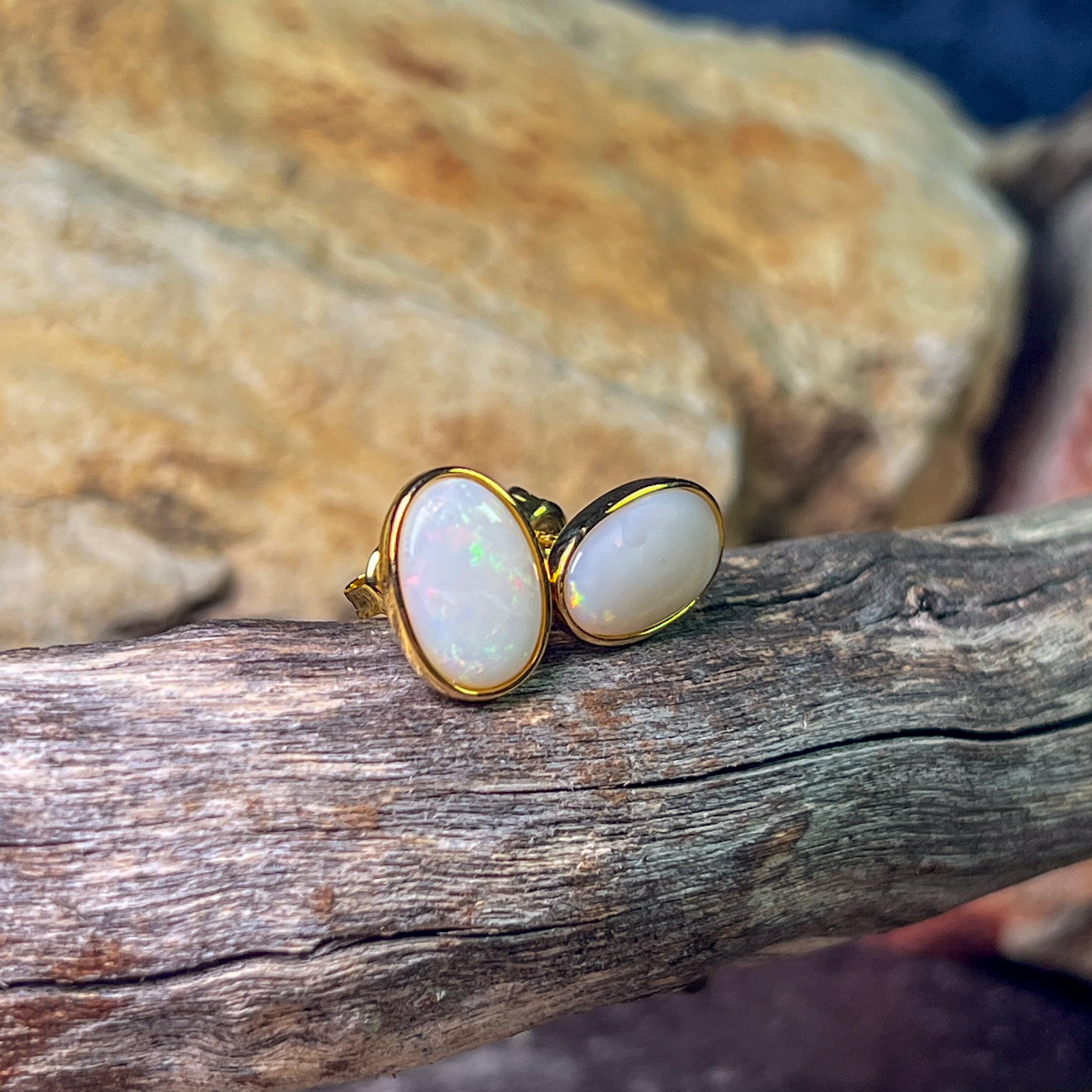 Elevate your style with these stunning Gold Plated Sterling Silver White Opal bezel set studs. The 13x8mm large oval design adds a touch of elegance and the opal's unique iridescence will catch anyone's eye. Treat yourself or someone special to these captivating studs and make a lasting impression.