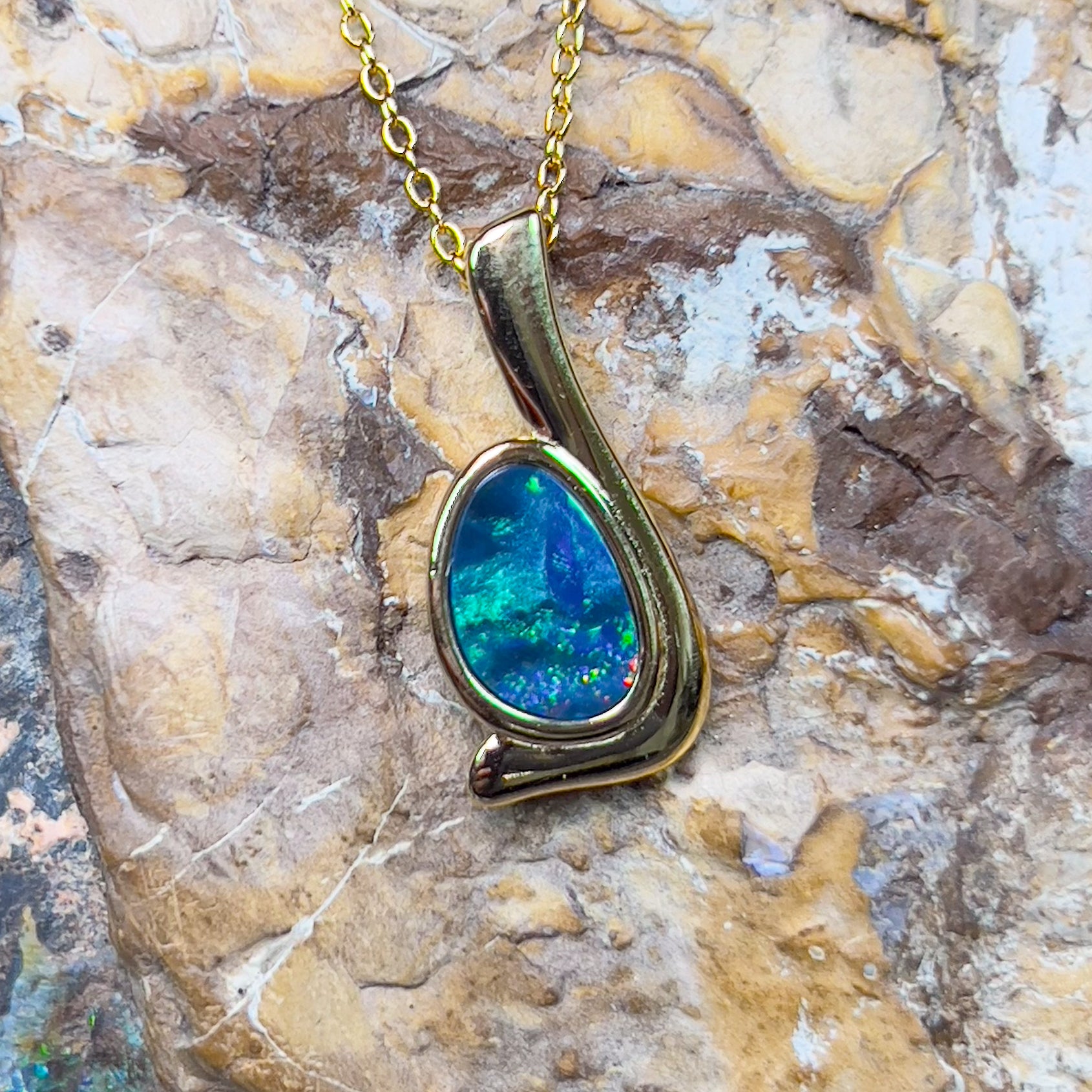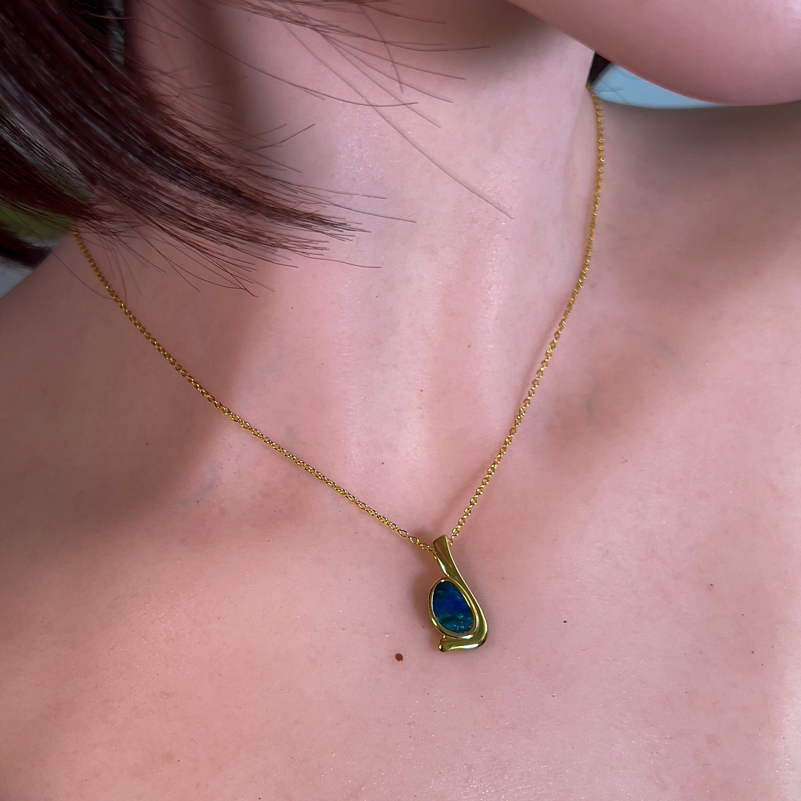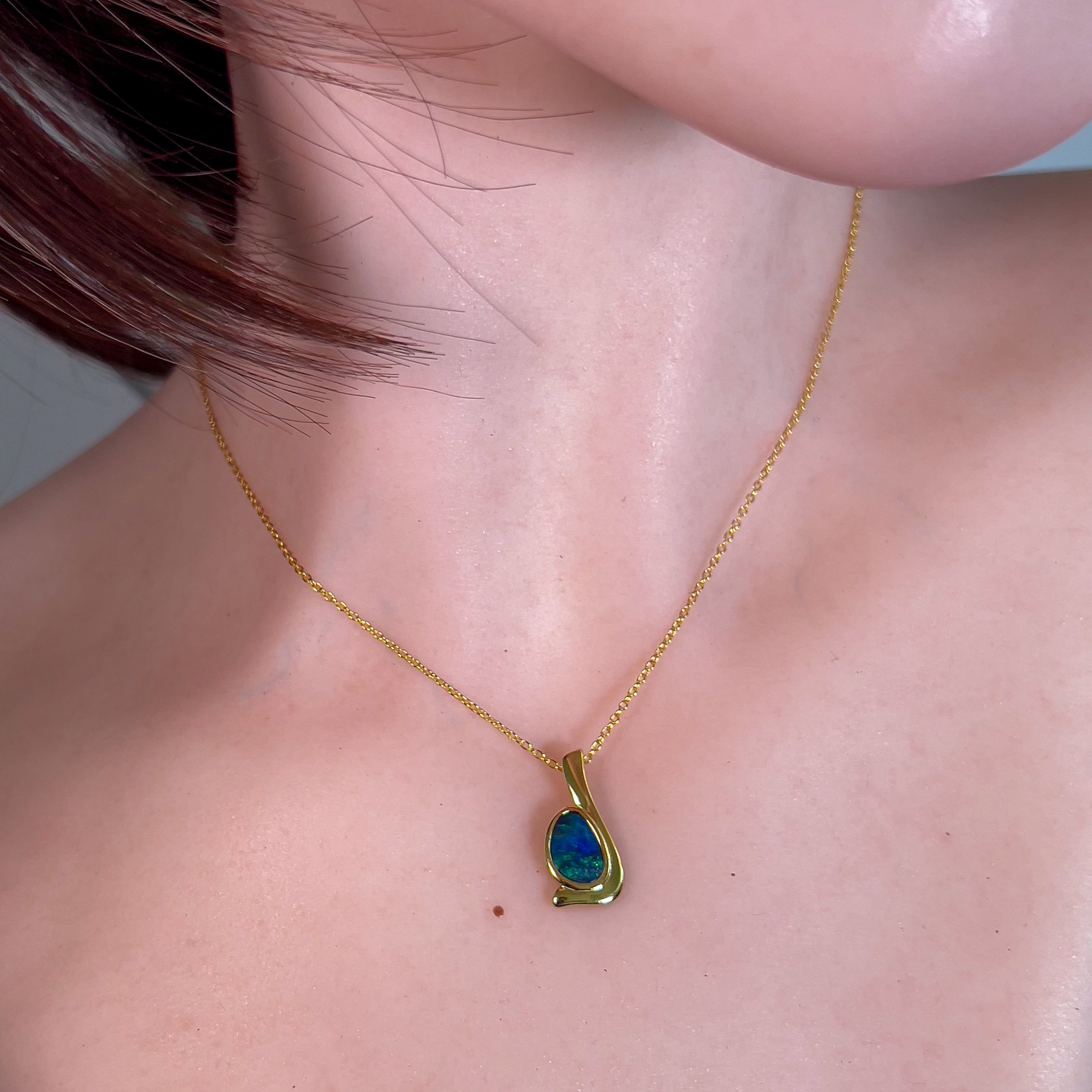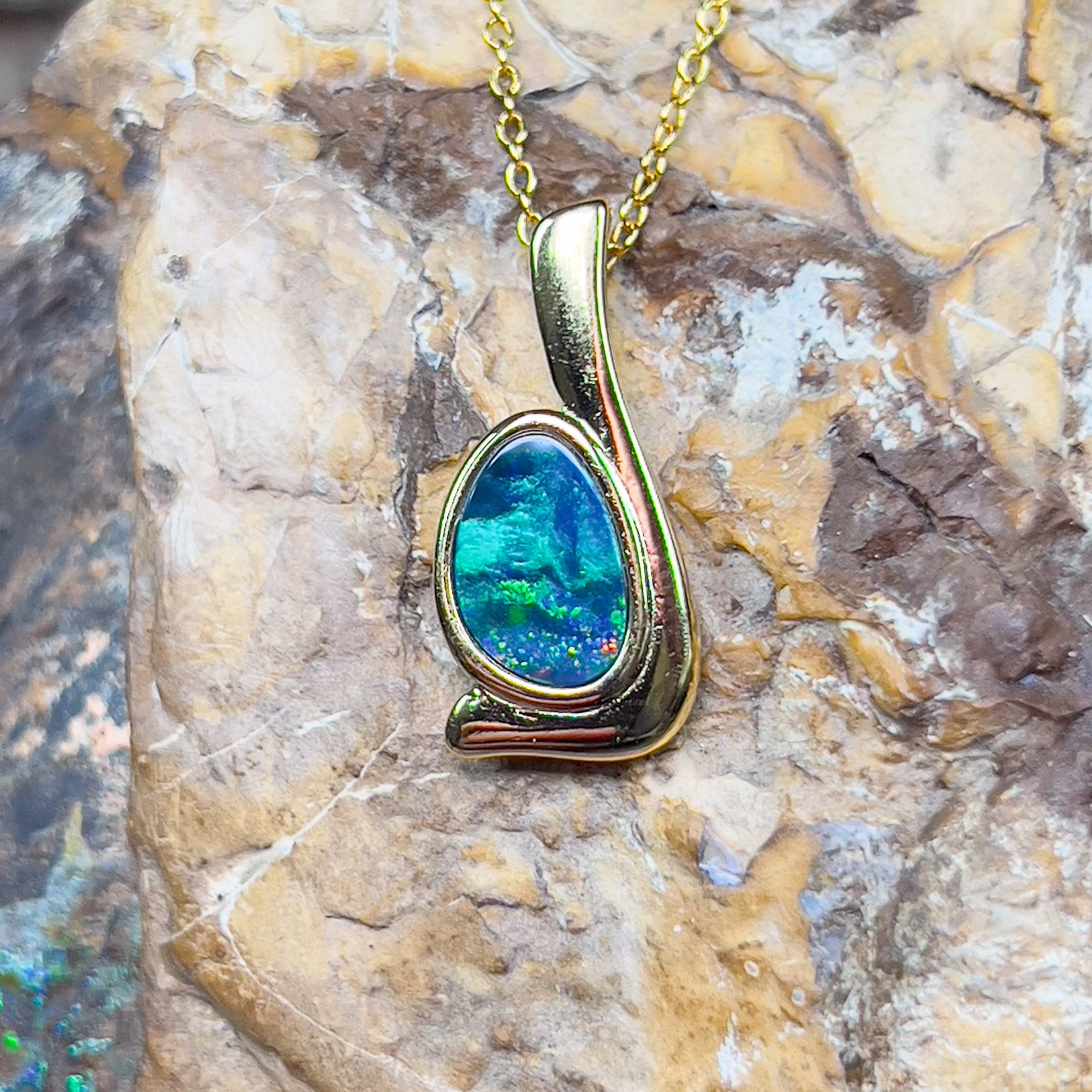 Experience contemporary elegance with our One Gold Plated Sterling Silver L-shape Opal doublet pendant. Crafted with precision, this pendant features a unique and modern design that will add a touch of sophistication to any outfit. The lustrous gold plated finish complements the stunning opal doublet, creating a luxurious and eye-catching piece of jewelry. Elevate your style with this exquisite pendant today!