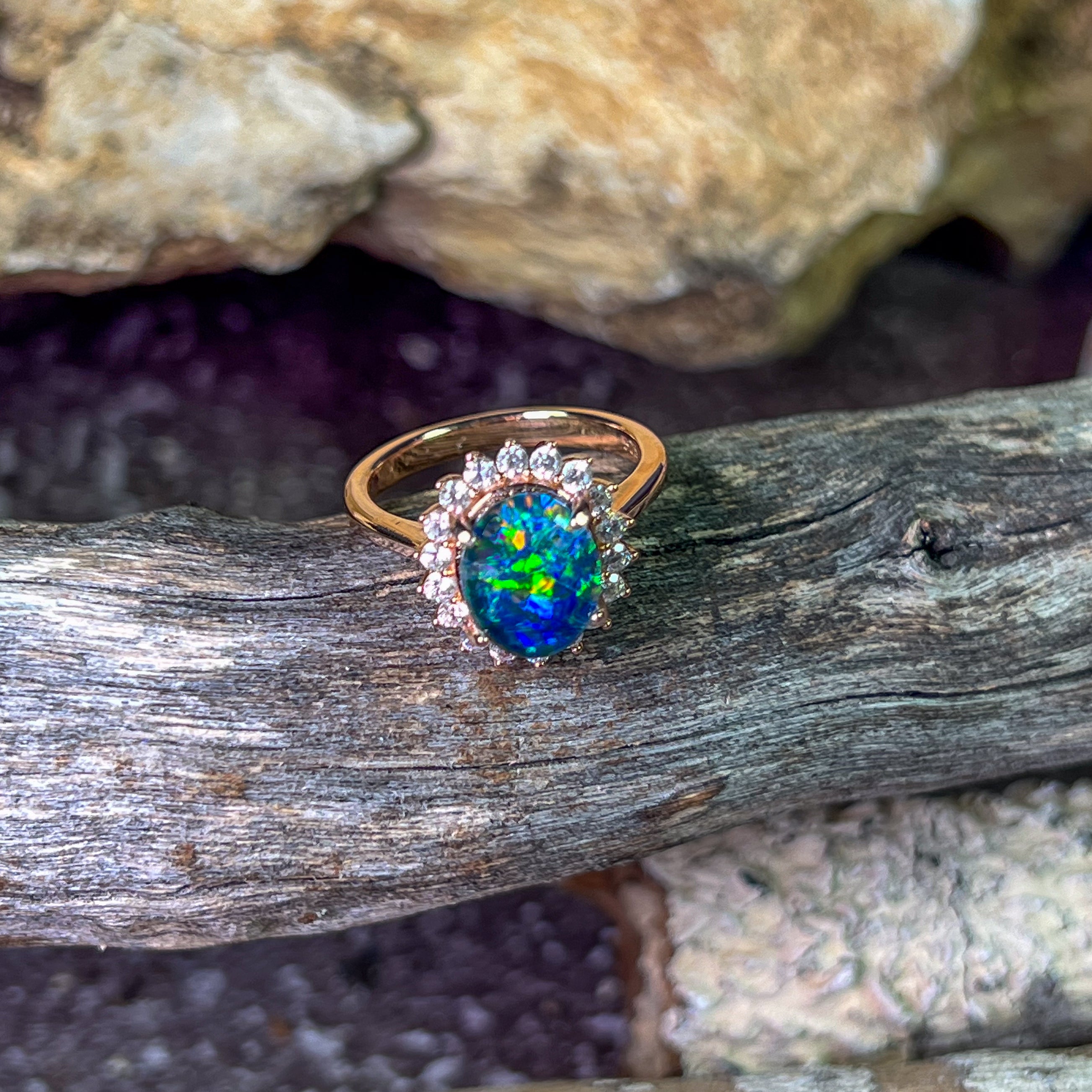 This exquisite One Rose gold plated Opal triplet 10x8mm cluster ring is perfect for engagements or special occasions. The opal stone adds a touch of elegance to the rose gold plated band. This stunning piece of opal jewelry will make a lasting impression and is sure to become a treasured addition to any jewelry collection.