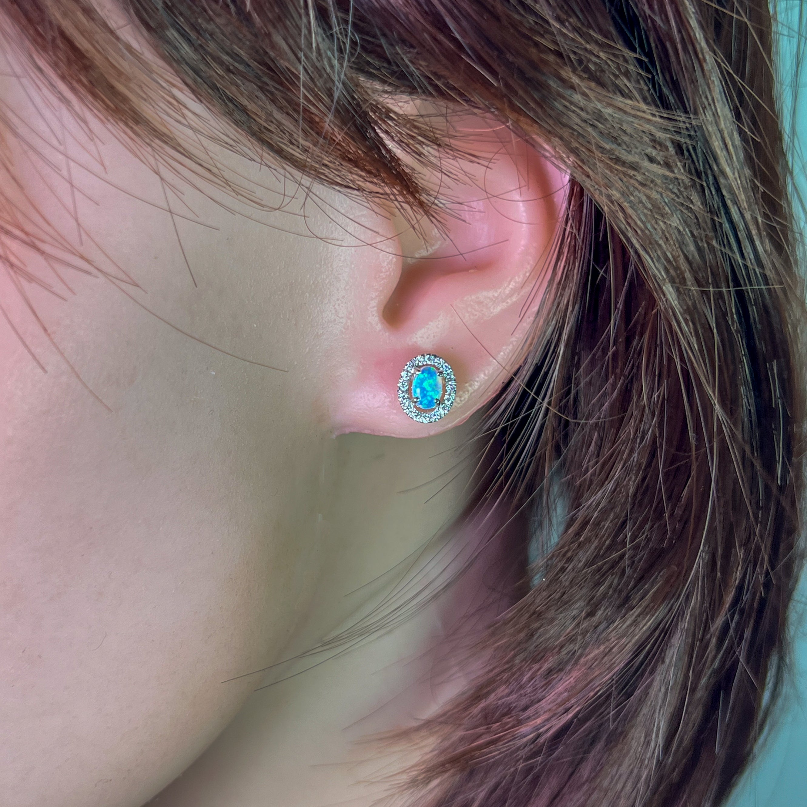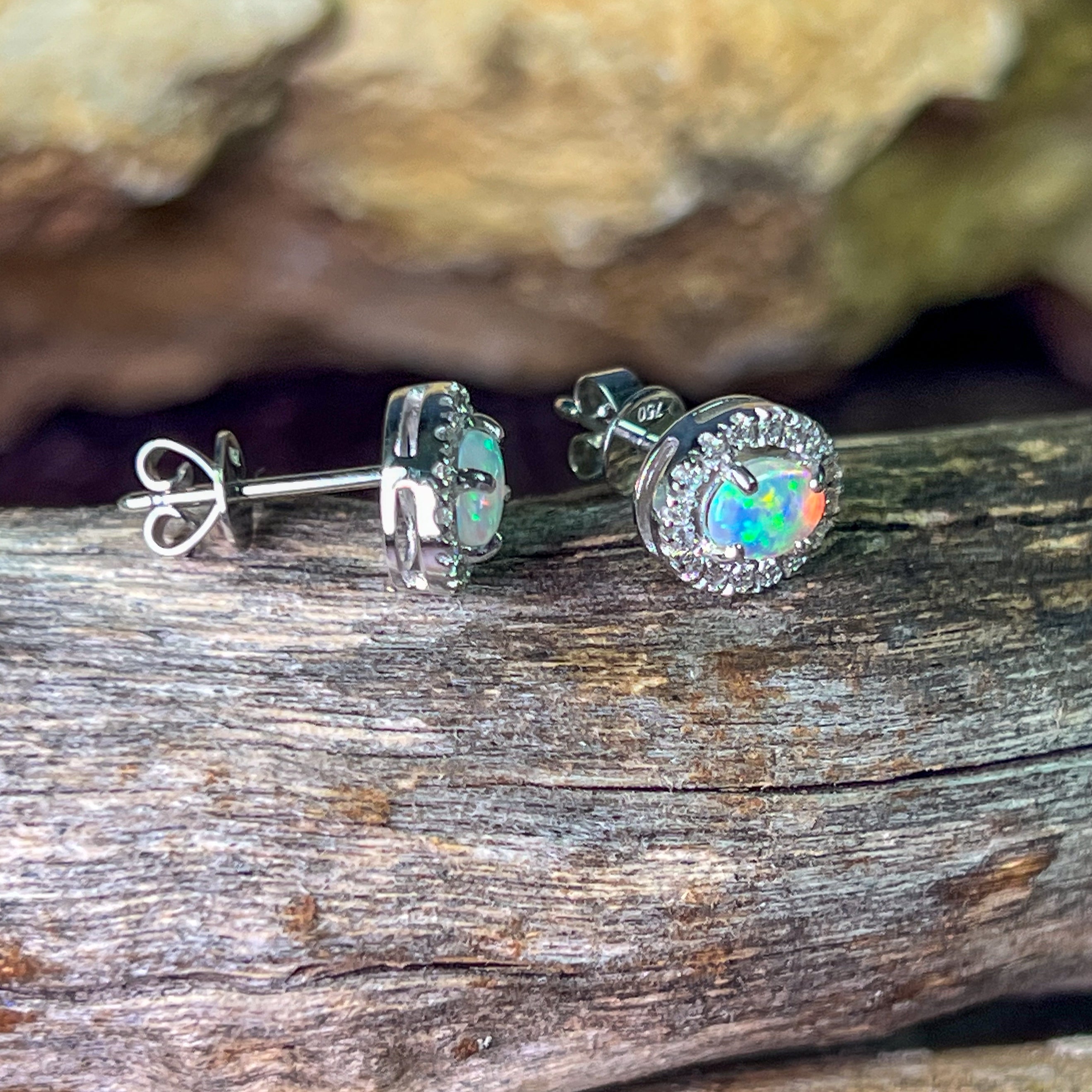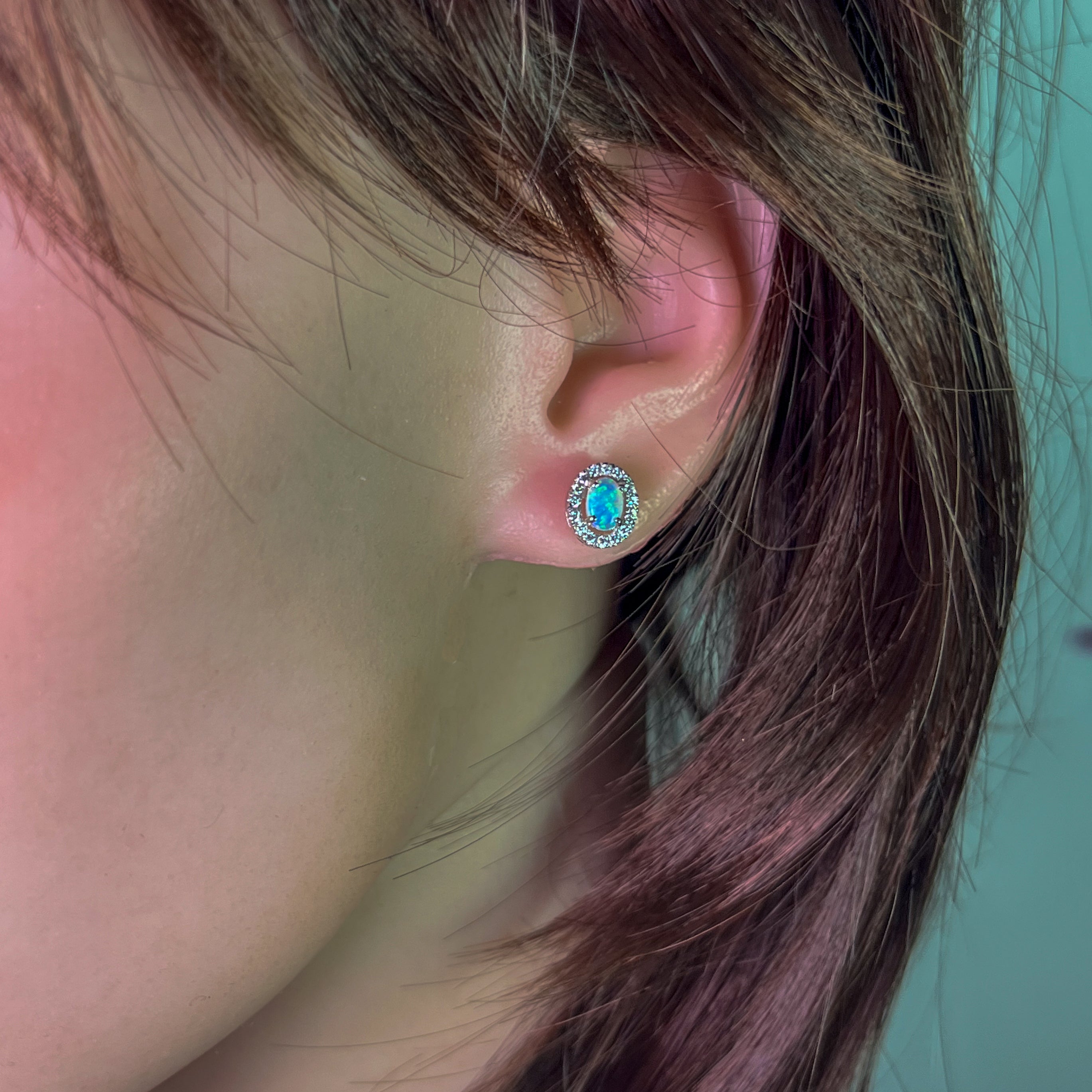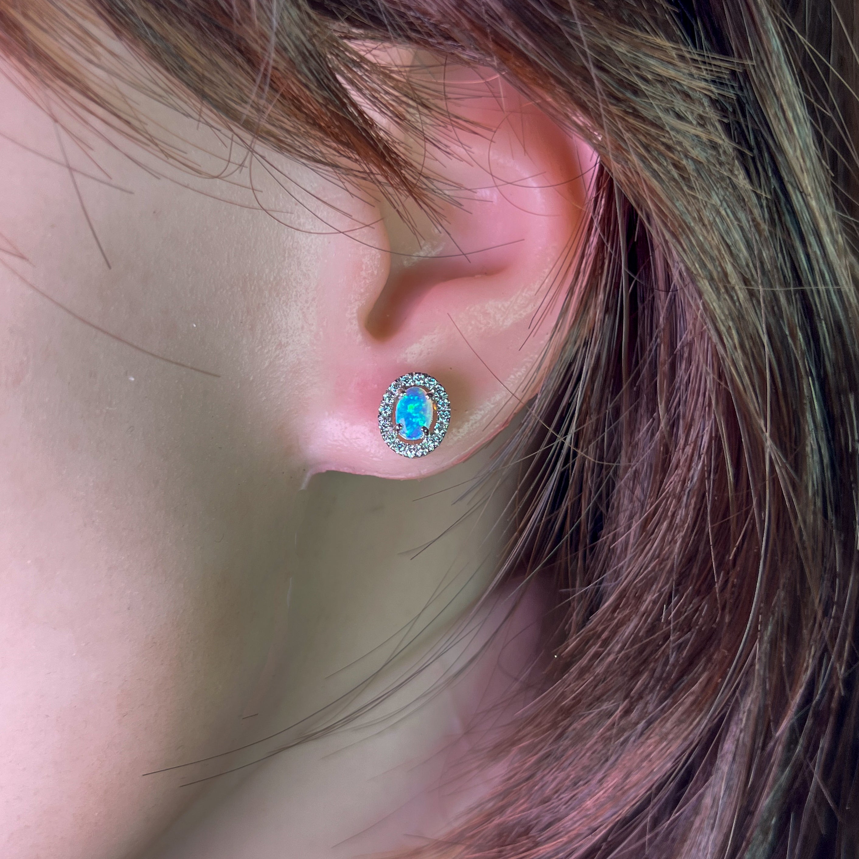 Indulge in timeless elegance with our Pair of 18kt White Gold halo Opal and diamond studs. The classic modern halo design showcases the mesmerizing opal gemstone surrounded by sparkling diamonds. Elevate any outfit and make a sophisticated statement with these luxurious earrings.