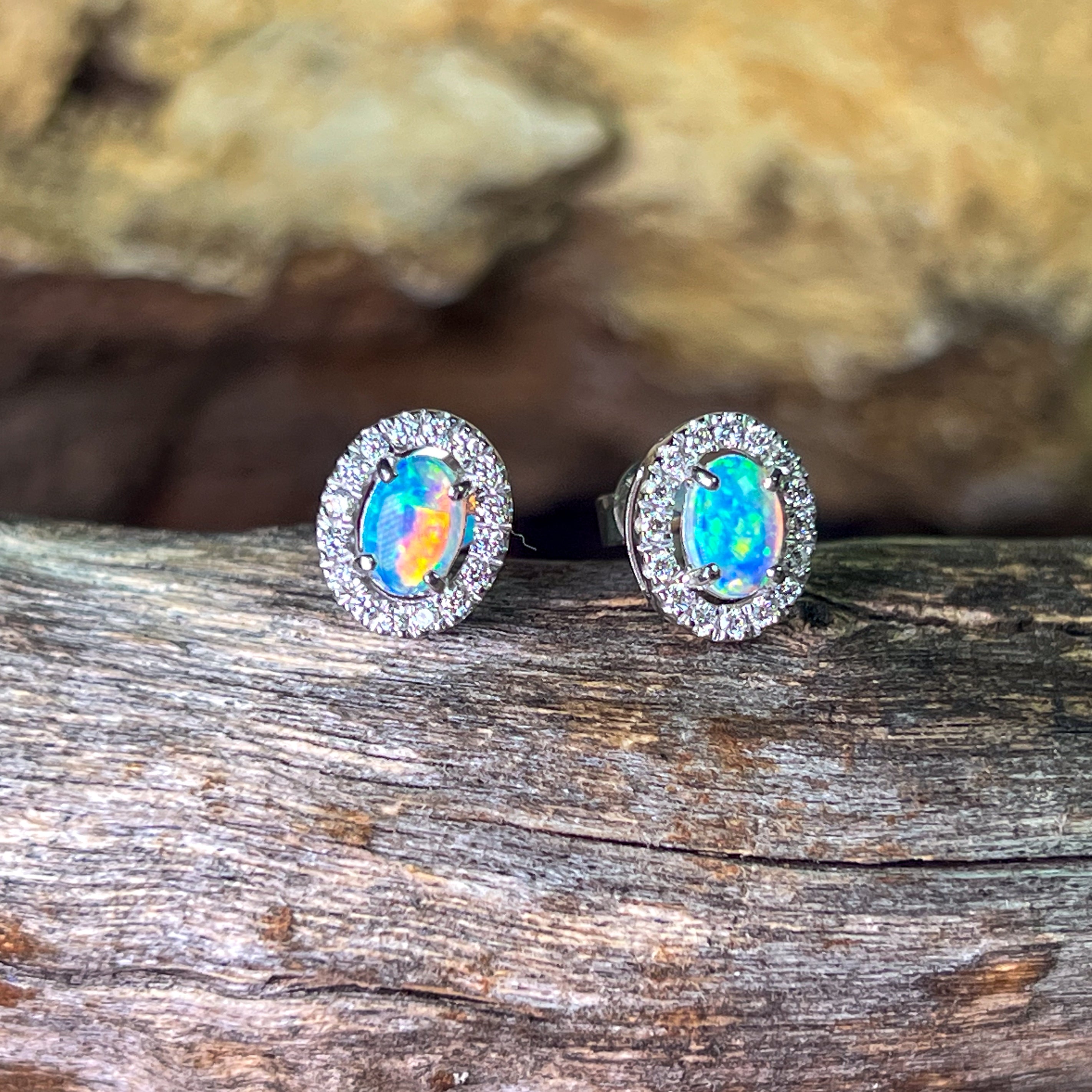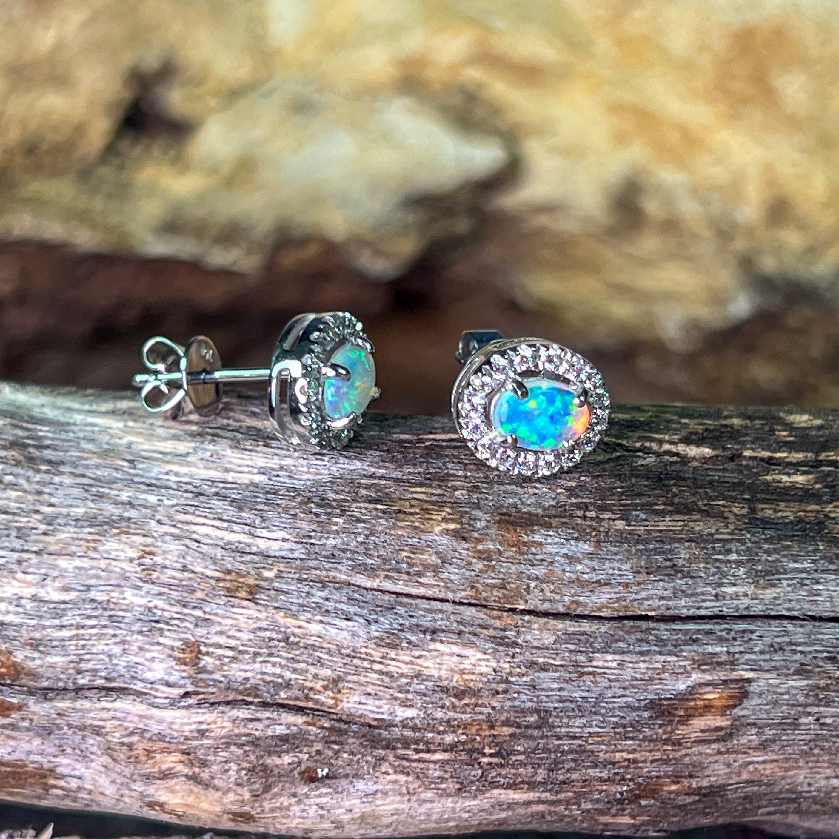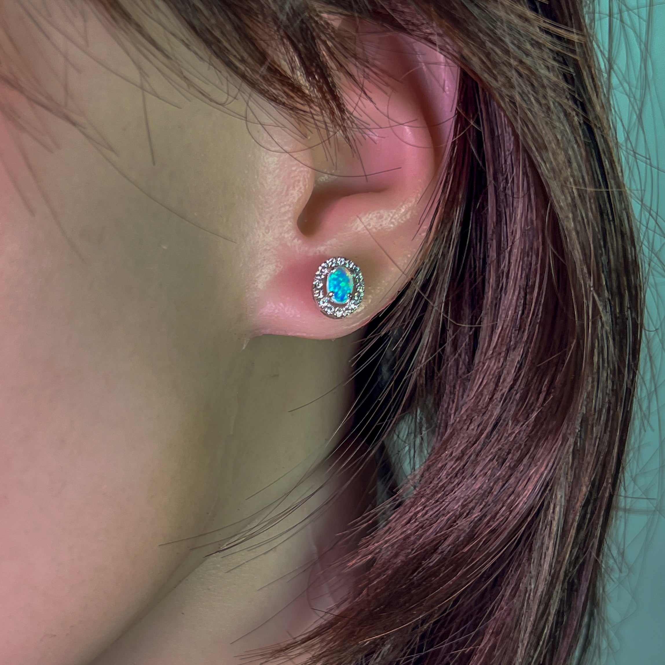 Indulge in timeless elegance with our Pair of 18kt White Gold halo Opal and diamond studs. The classic modern halo design showcases the mesmerizing opal gemstone surrounded by sparkling diamonds. Elevate any outfit and make a sophisticated statement with these luxurious earrings.