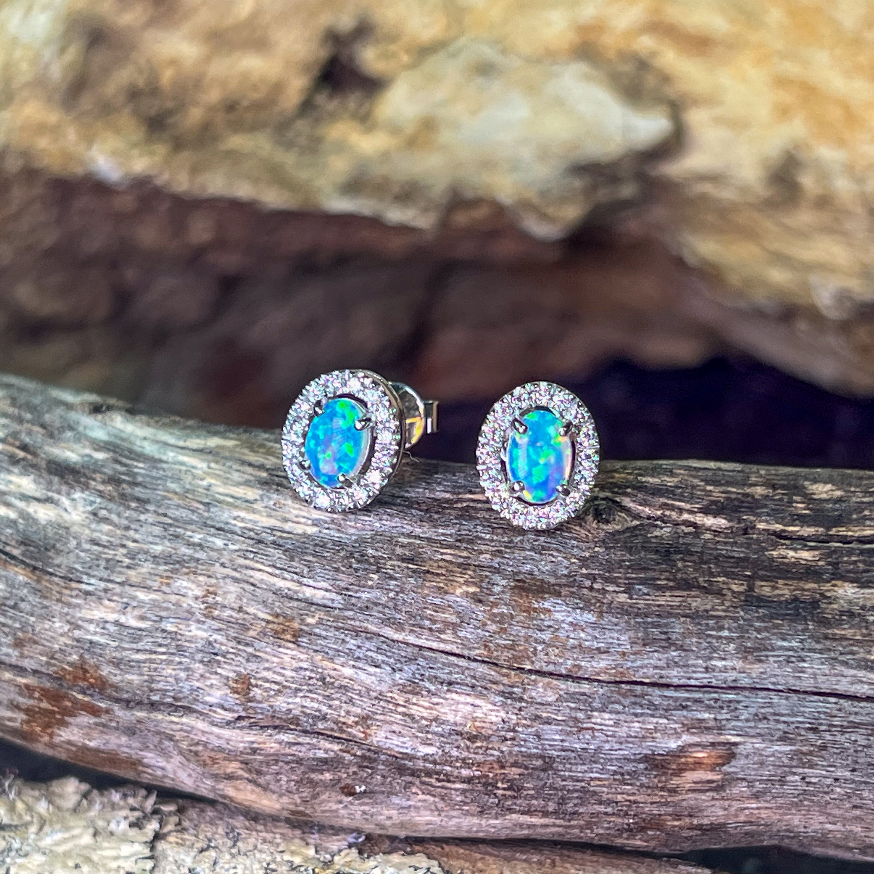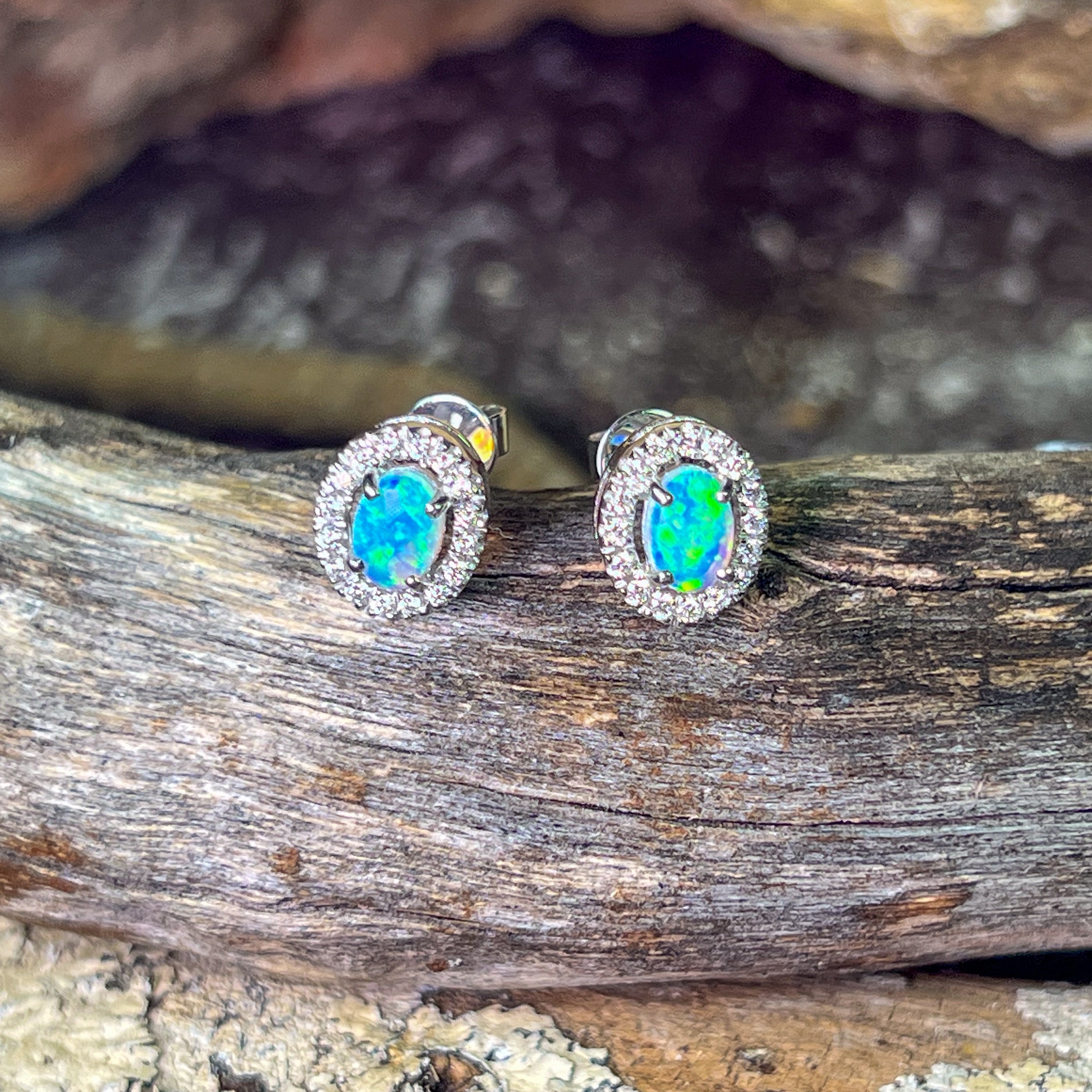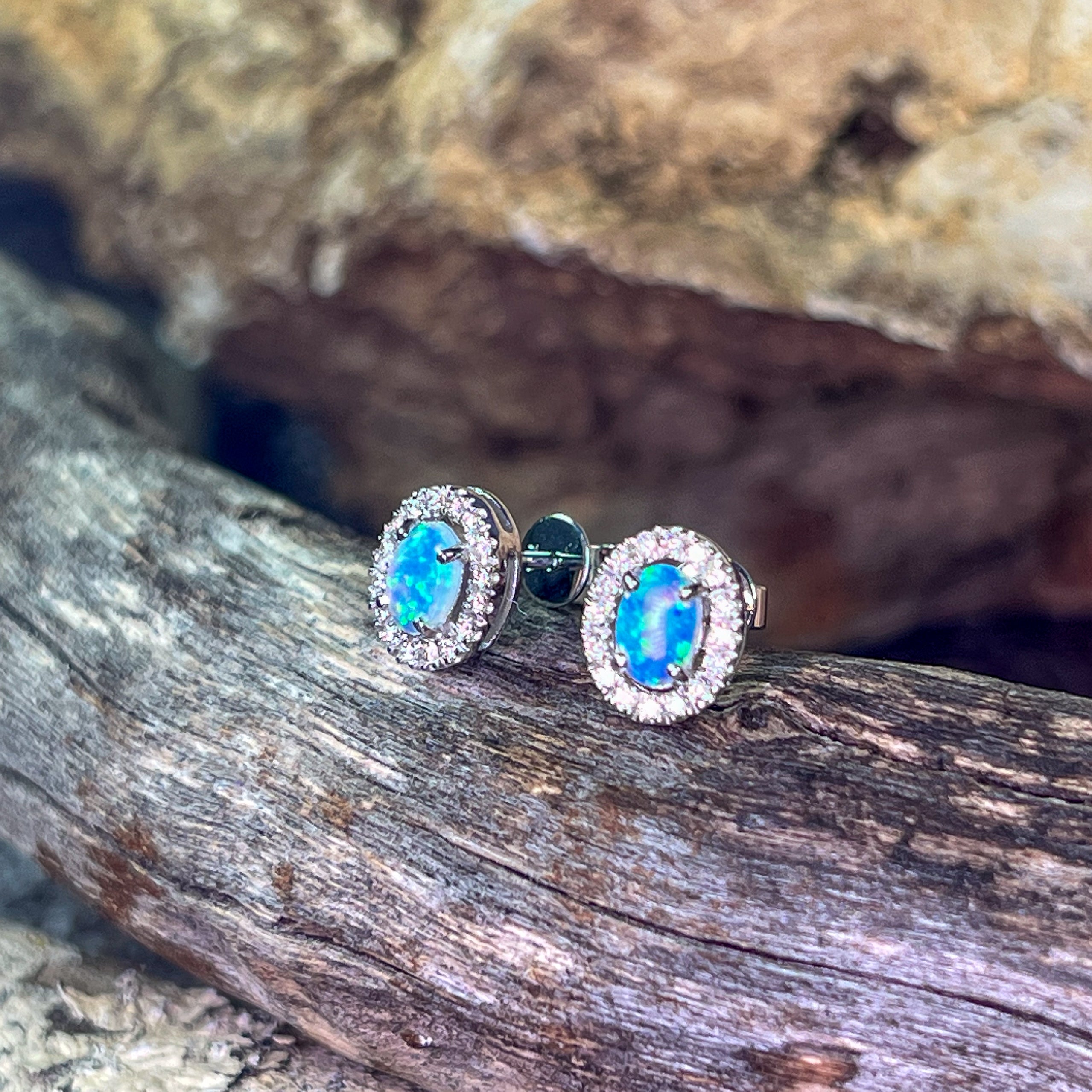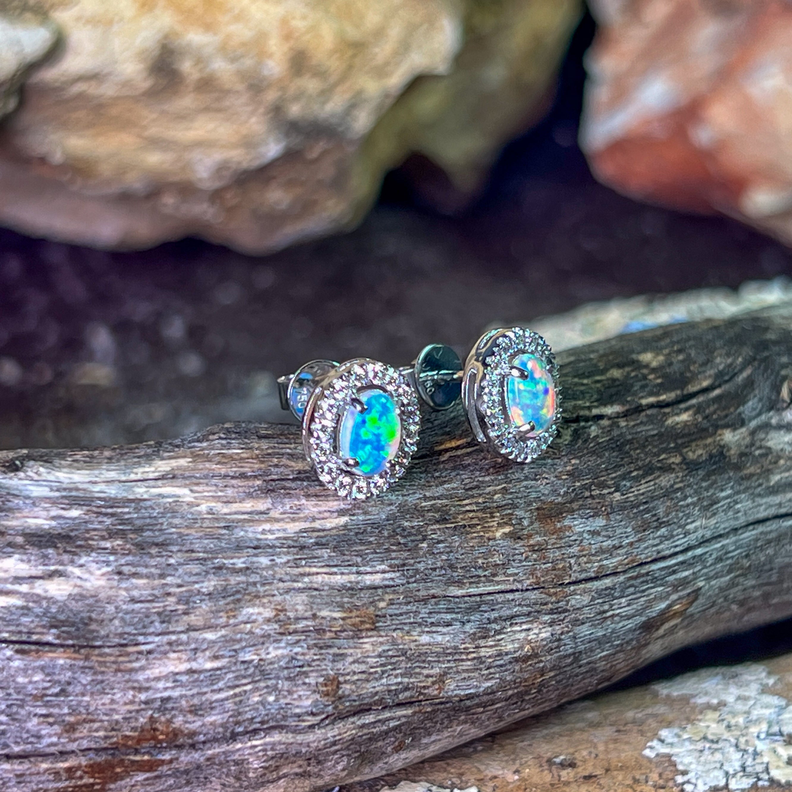 Indulge in timeless elegance with our Pair of 18kt White Gold halo Opal and diamond studs. The classic modern halo design showcases the mesmerizing opal gemstone surrounded by sparkling diamonds. Elevate any outfit and make a sophisticated statement with these luxurious earrings.