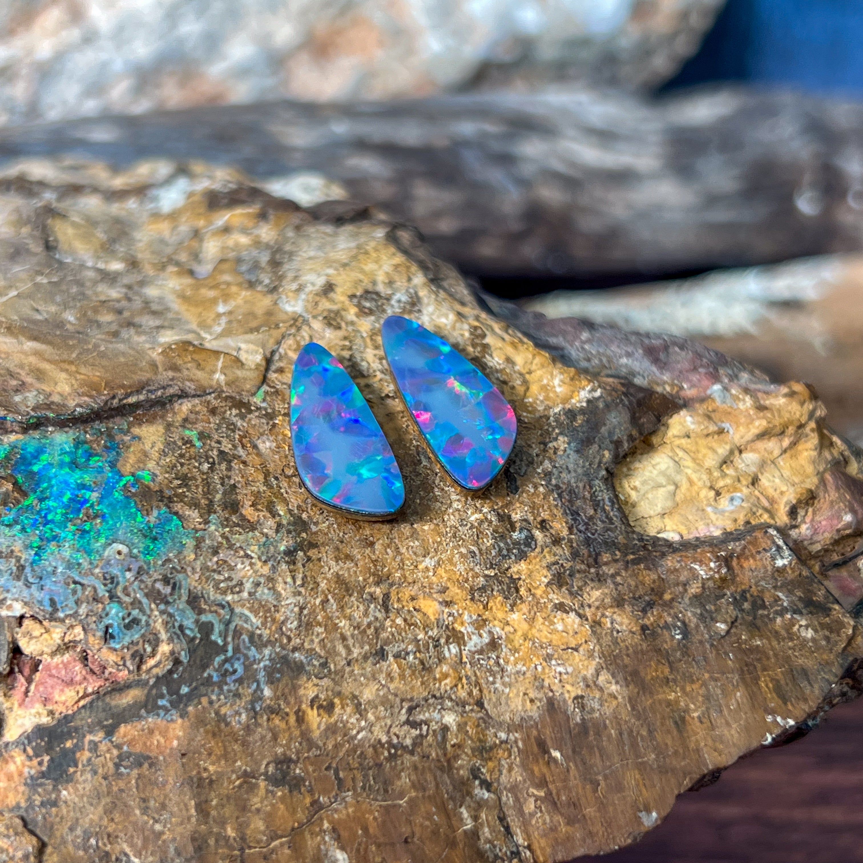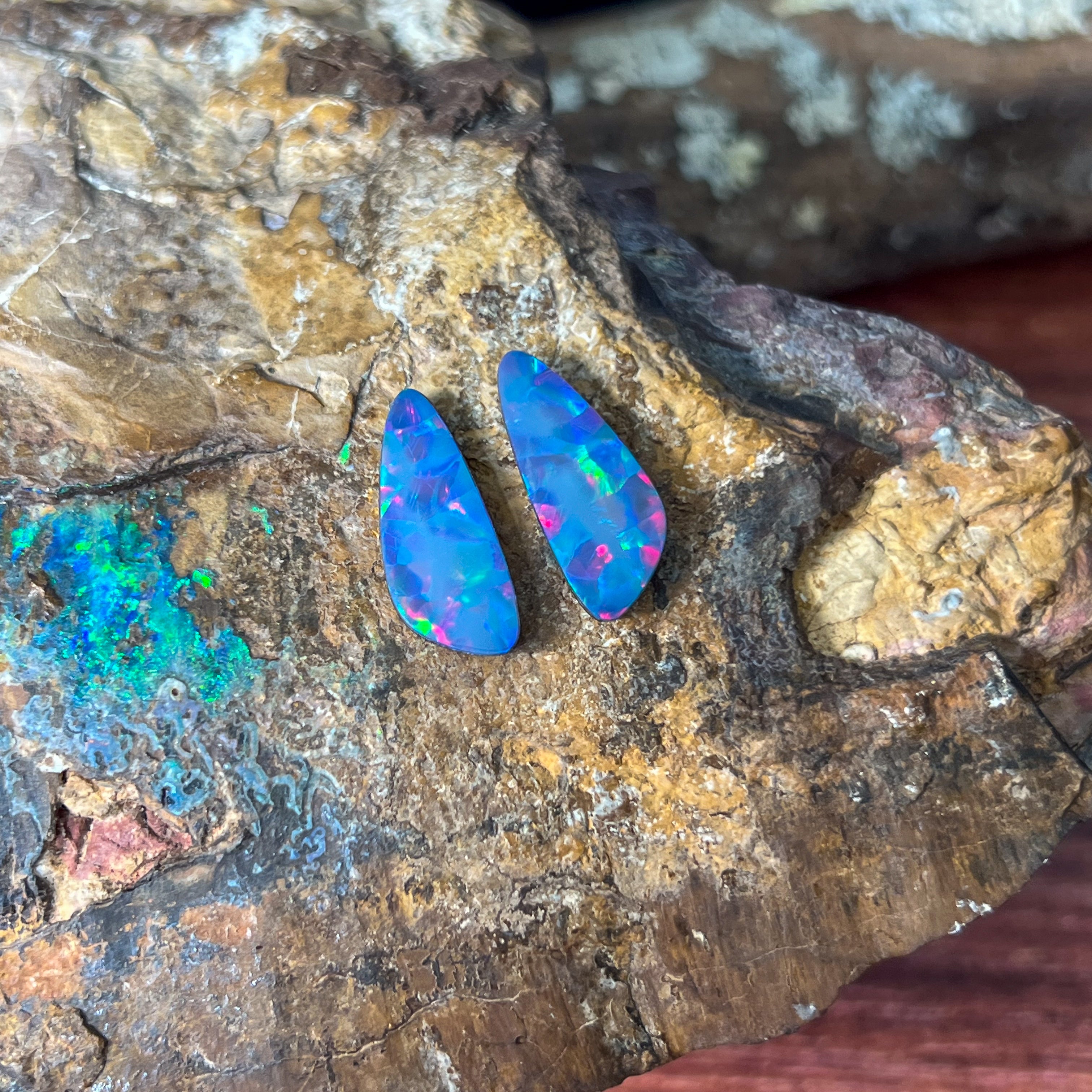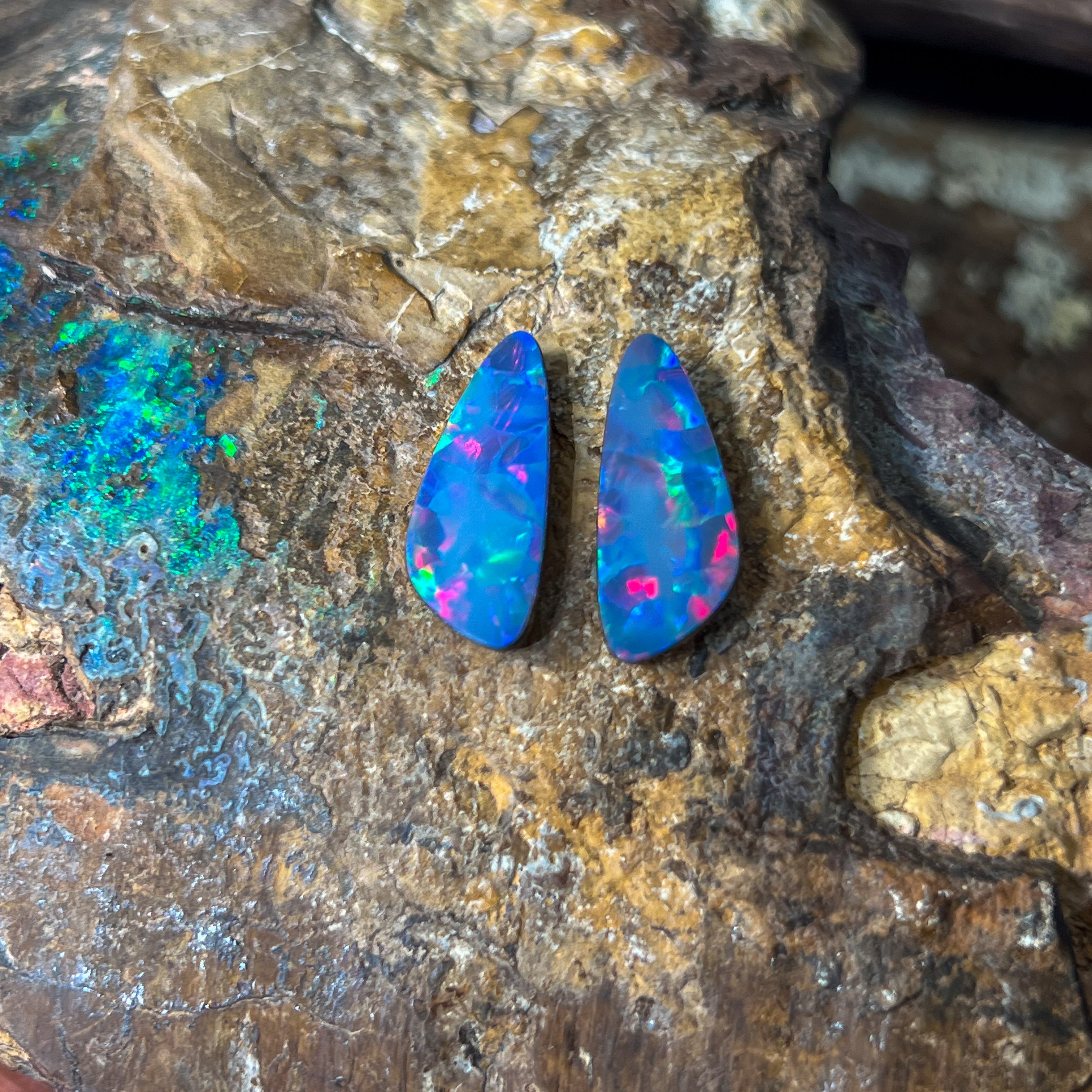 Discover the captivating beauty of this pair of opal doublet earrings, featuring a striking long triangle drop shape. The mesmerizing blue and red play of colour creates a vibrant, dynamic effect that catches the light with every movement. Perfect for designing your own unique jewellery look, these earrings add a bold yet elegant touch to any outfit. Elevate your style with this exquisite combination of colour and shape, crafted to make a lasting impression.