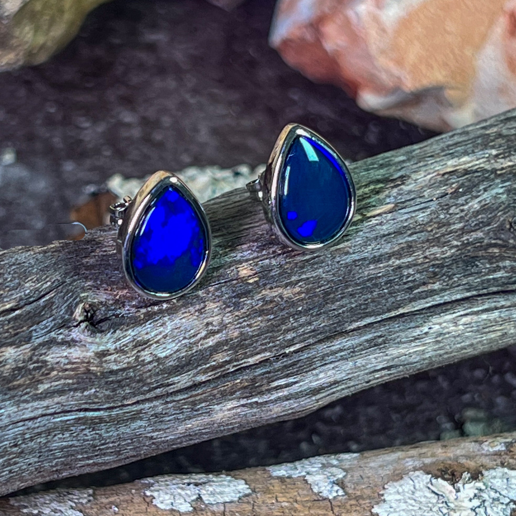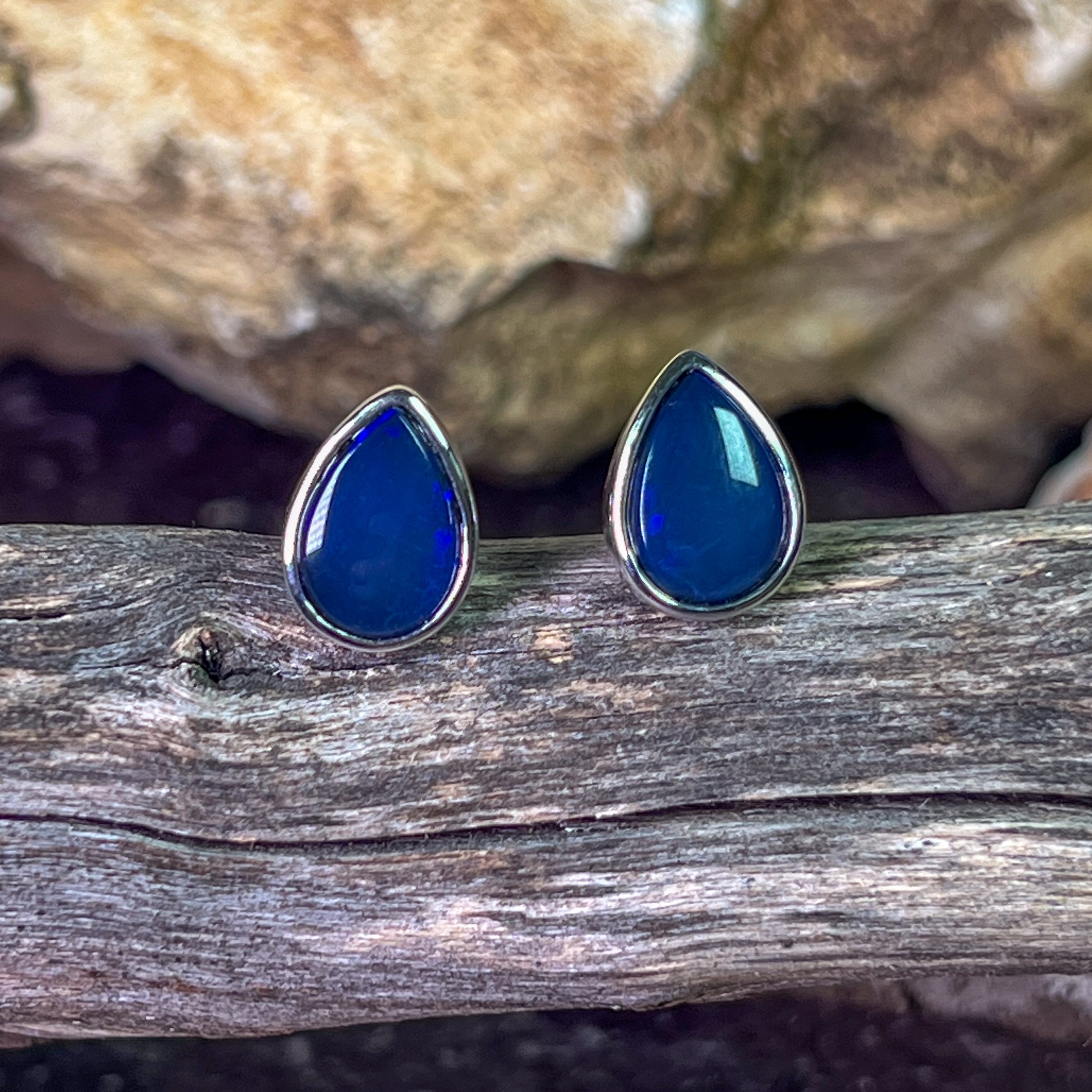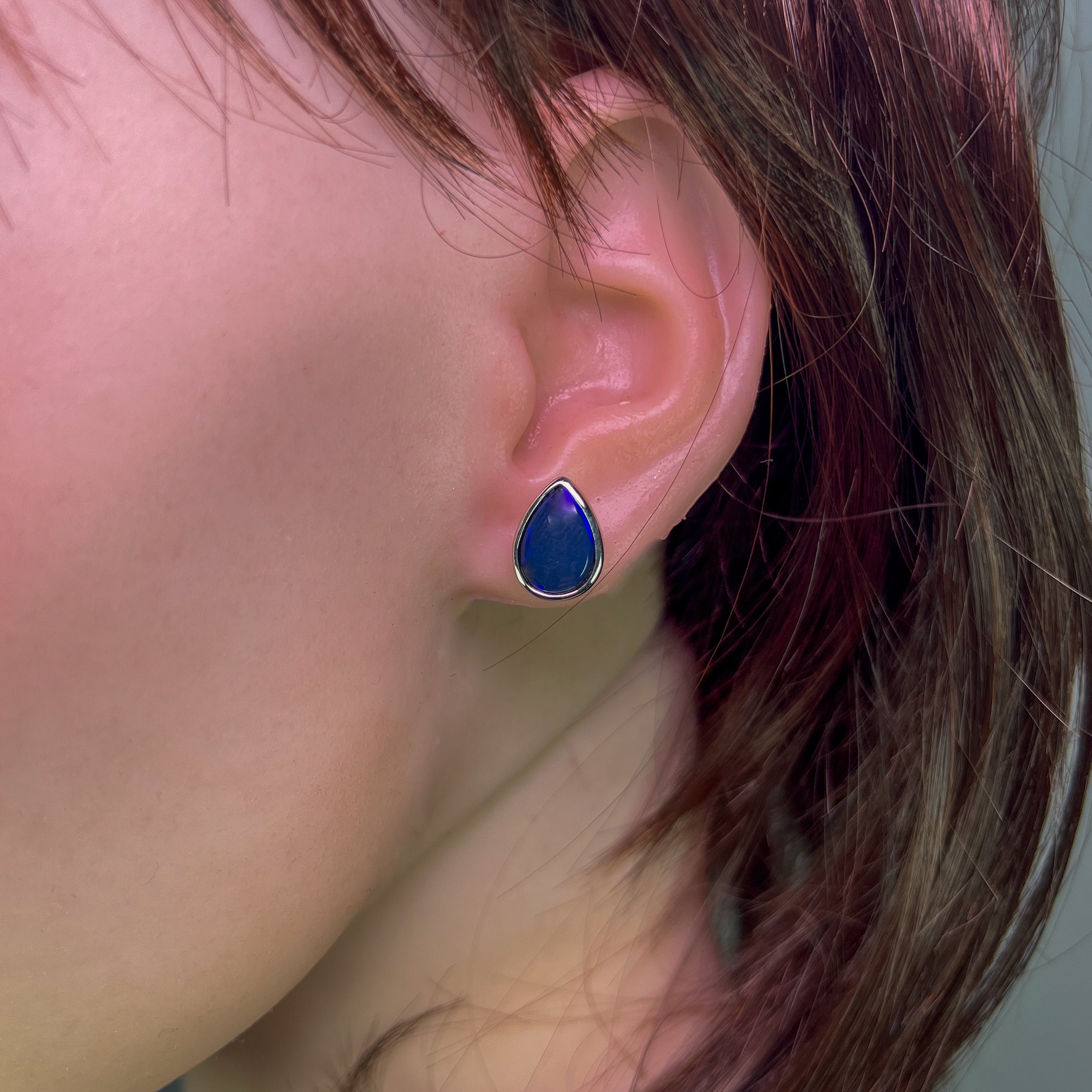 Indulge in the luxury of these Sterling Silver Pear shape Black Blue Opal studs. Each solid black opal from Lightning Ridge opal fine jewellery boasts exquisite beauty, providing a sophisticated touch to any outfit. Elevate your style with these exclusive, handcrafted studs.