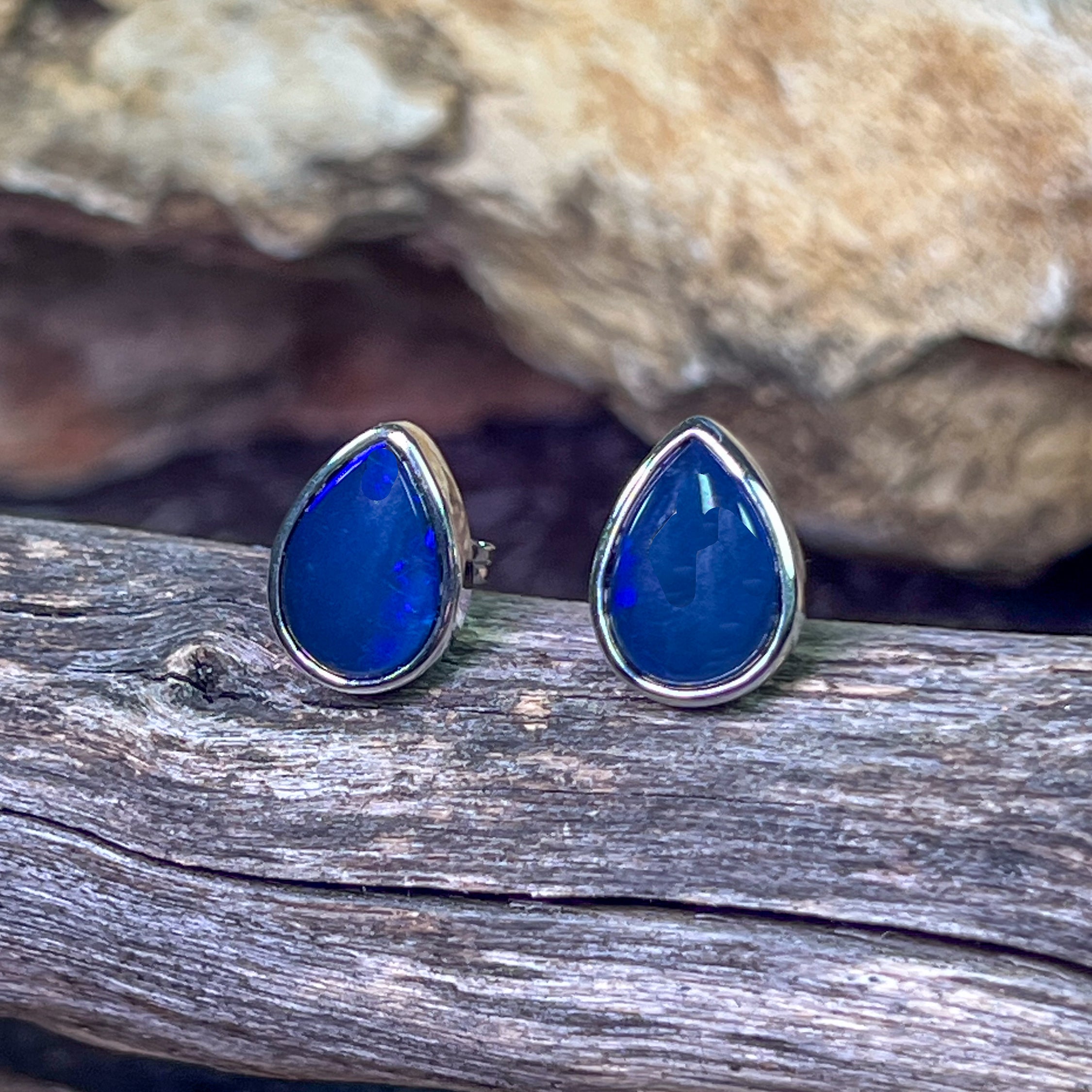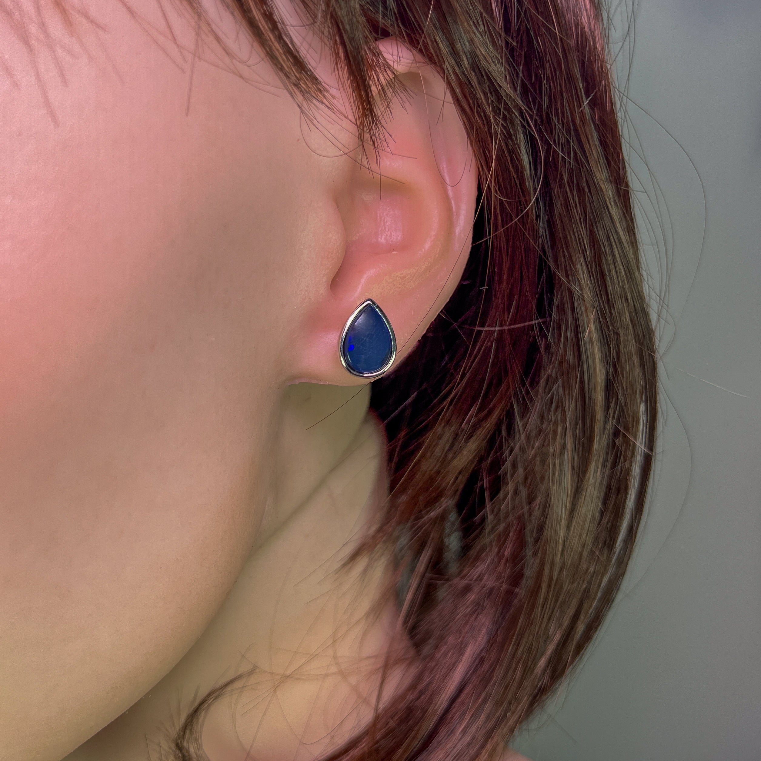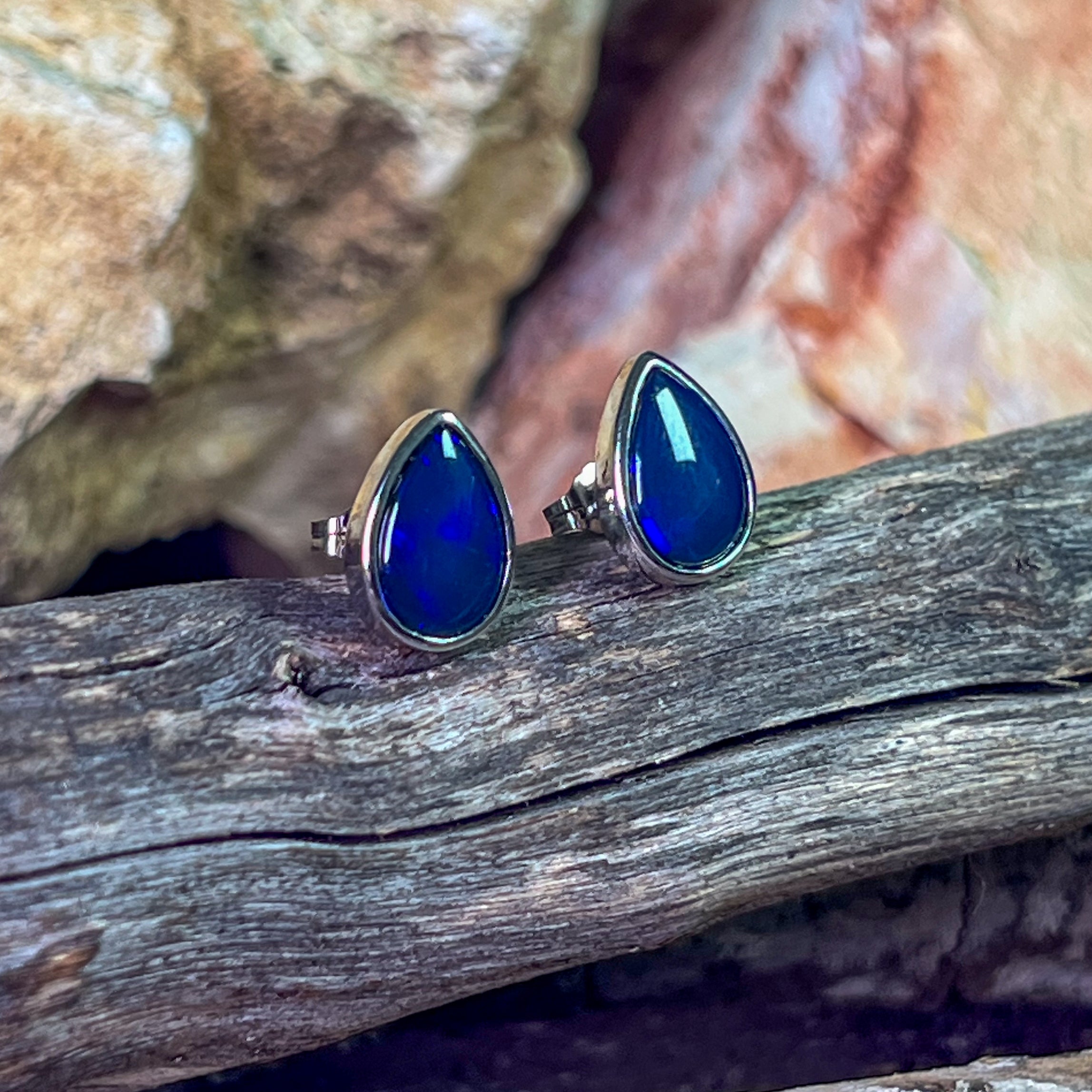 Indulge in the luxury of these Sterling Silver Pear shape Black Blue Opal studs. Each solid black opal from Lightning Ridge opal fine jewellery boasts exquisite beauty, providing a sophisticated touch to any outfit. Elevate your style with these exclusive, handcrafted studs.