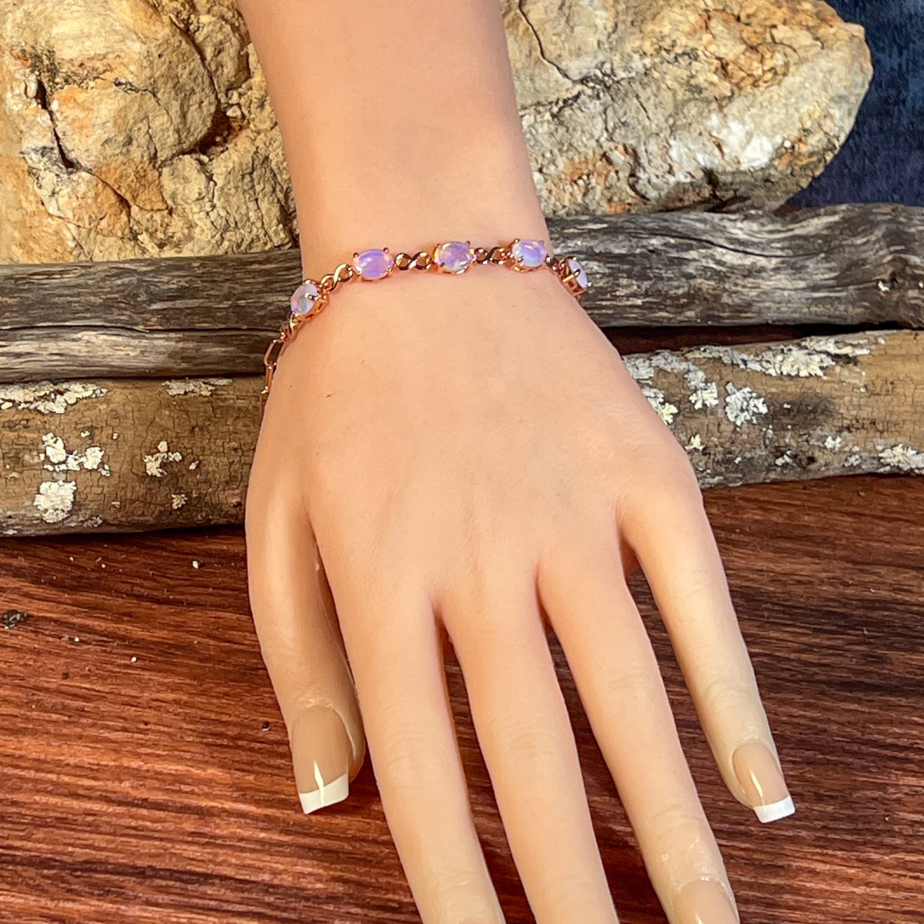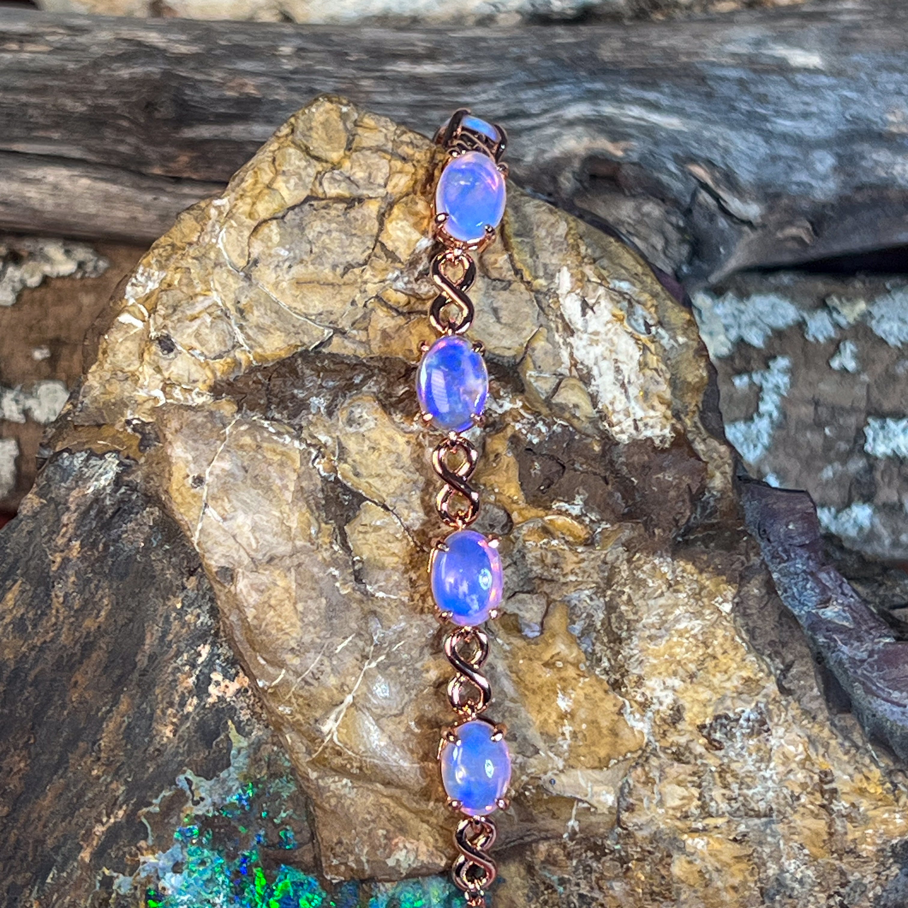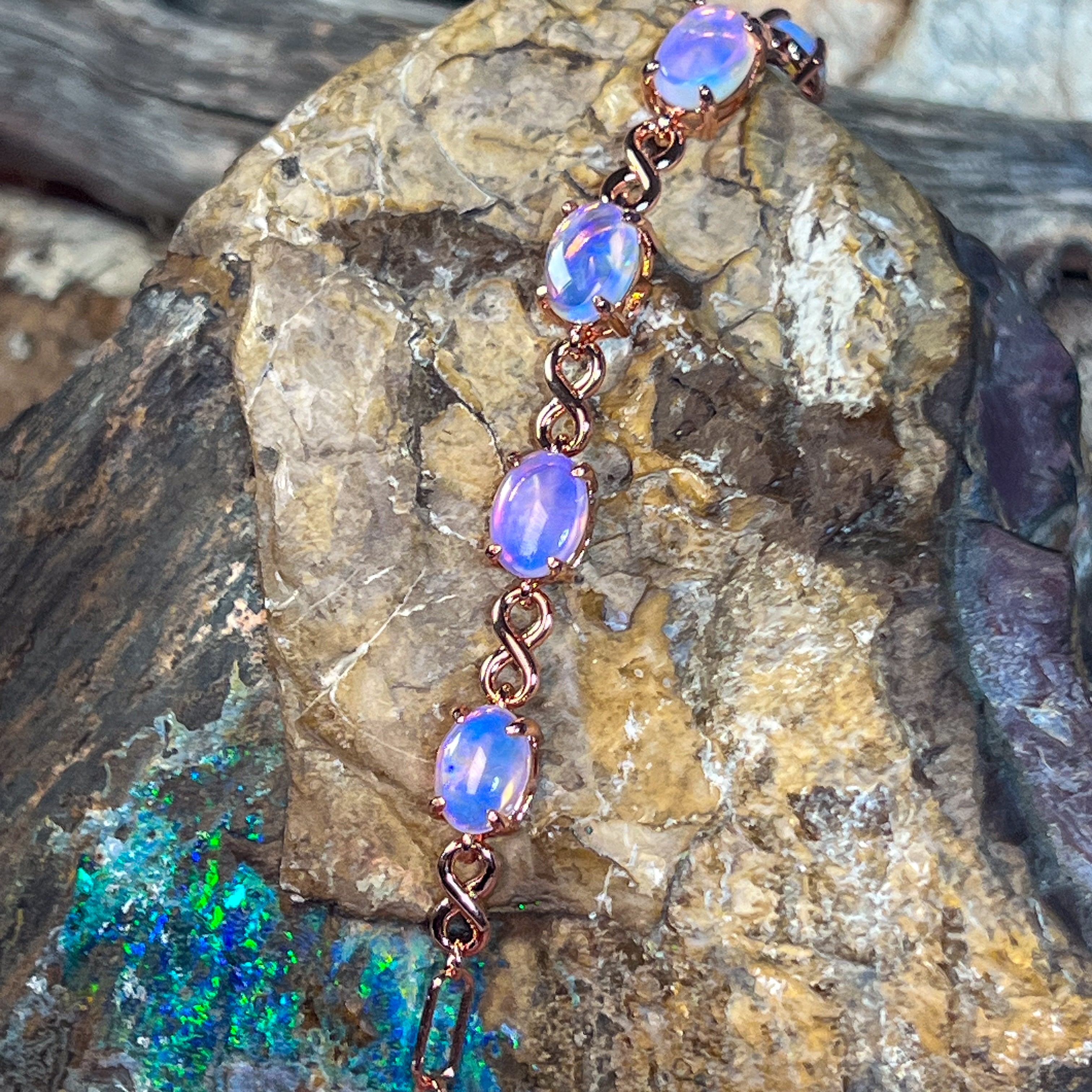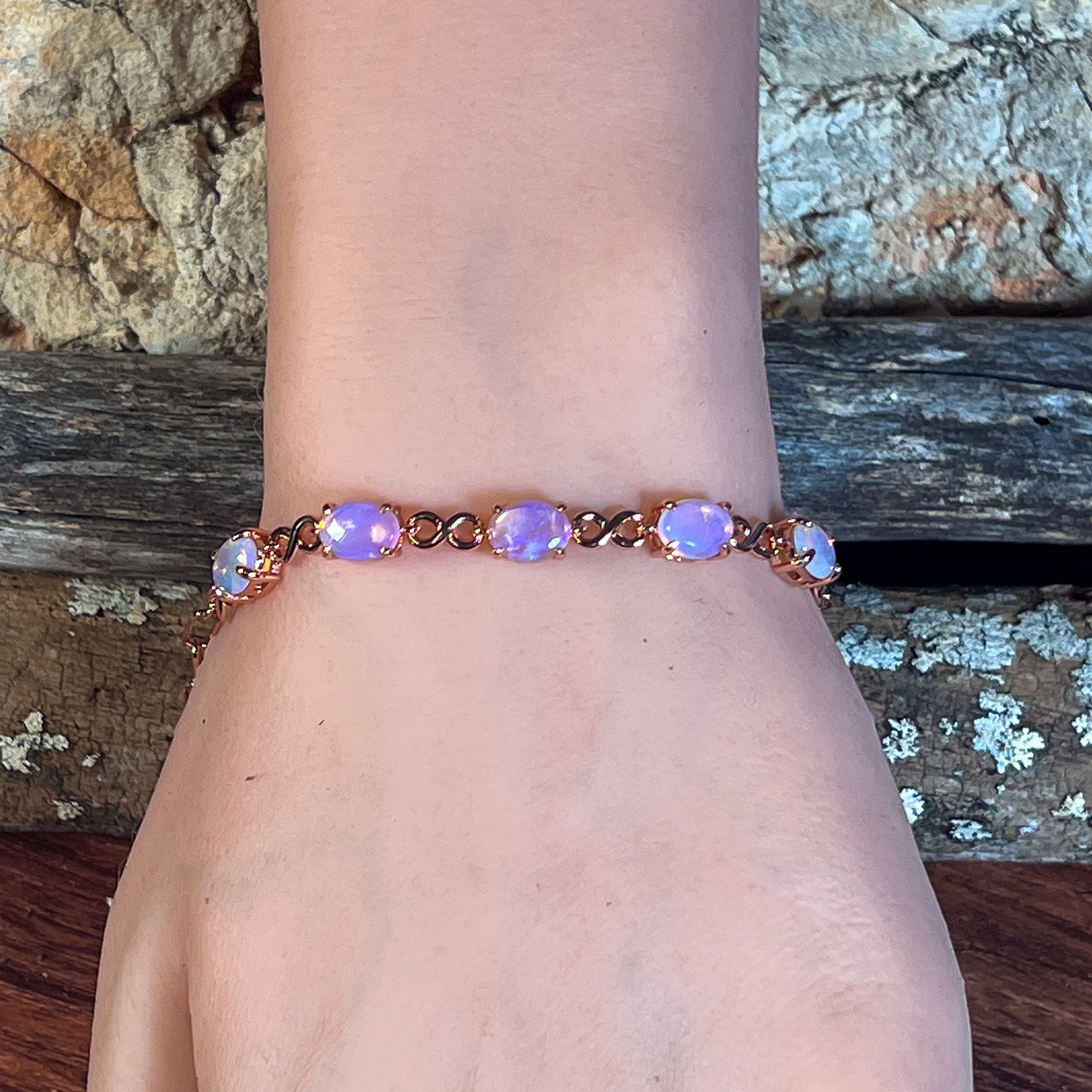 Elevate your style with this Rose Gold Plated Silver bracelet featuring a delicate 8x6mm light opal set in an elegant infinity design. The shimmering opal adds a touch of timeless beauty, while the rose gold plating offers a warm, modern finish. Perfect for everyday wear or special occasions, this bracelet symbolizes endless elegance and grace.