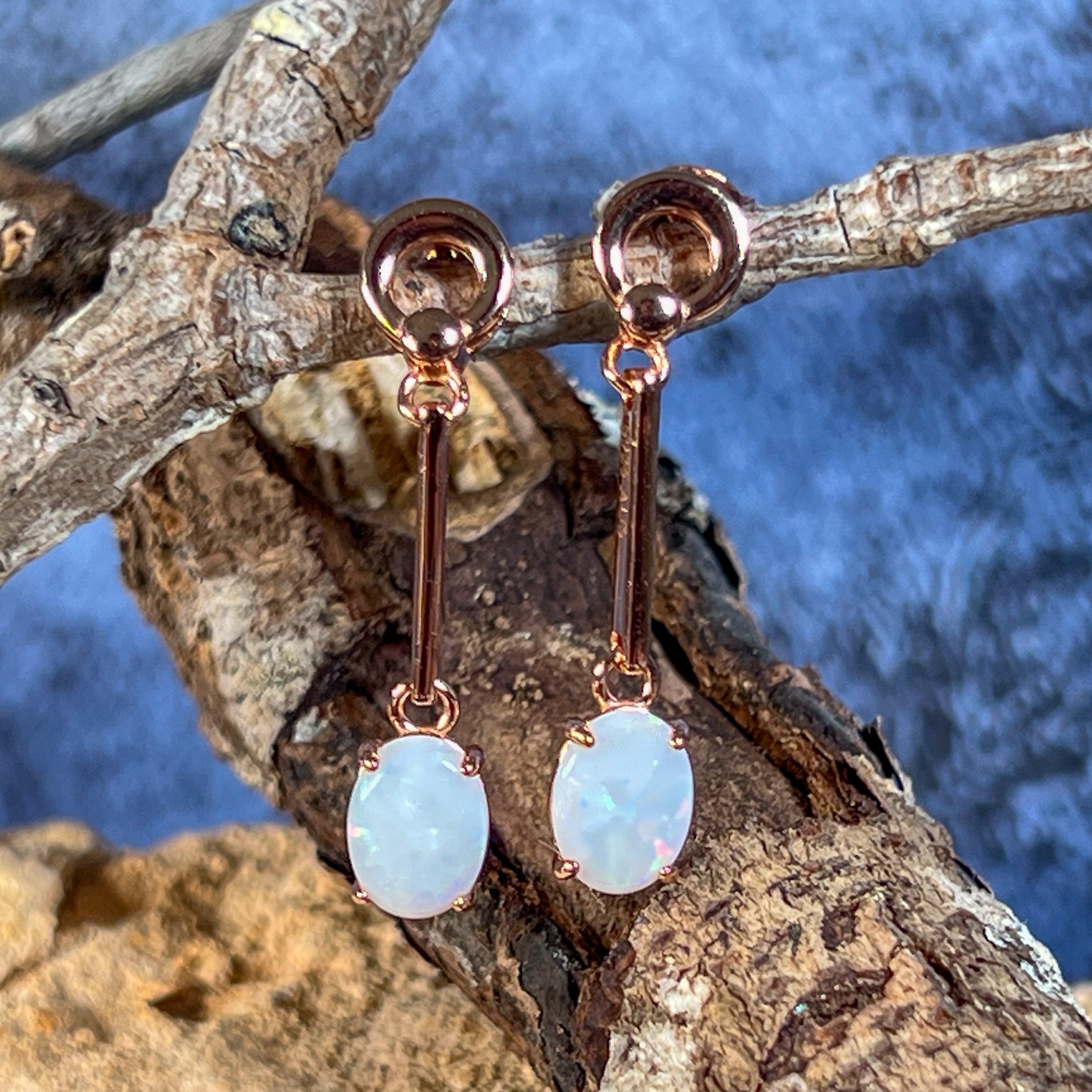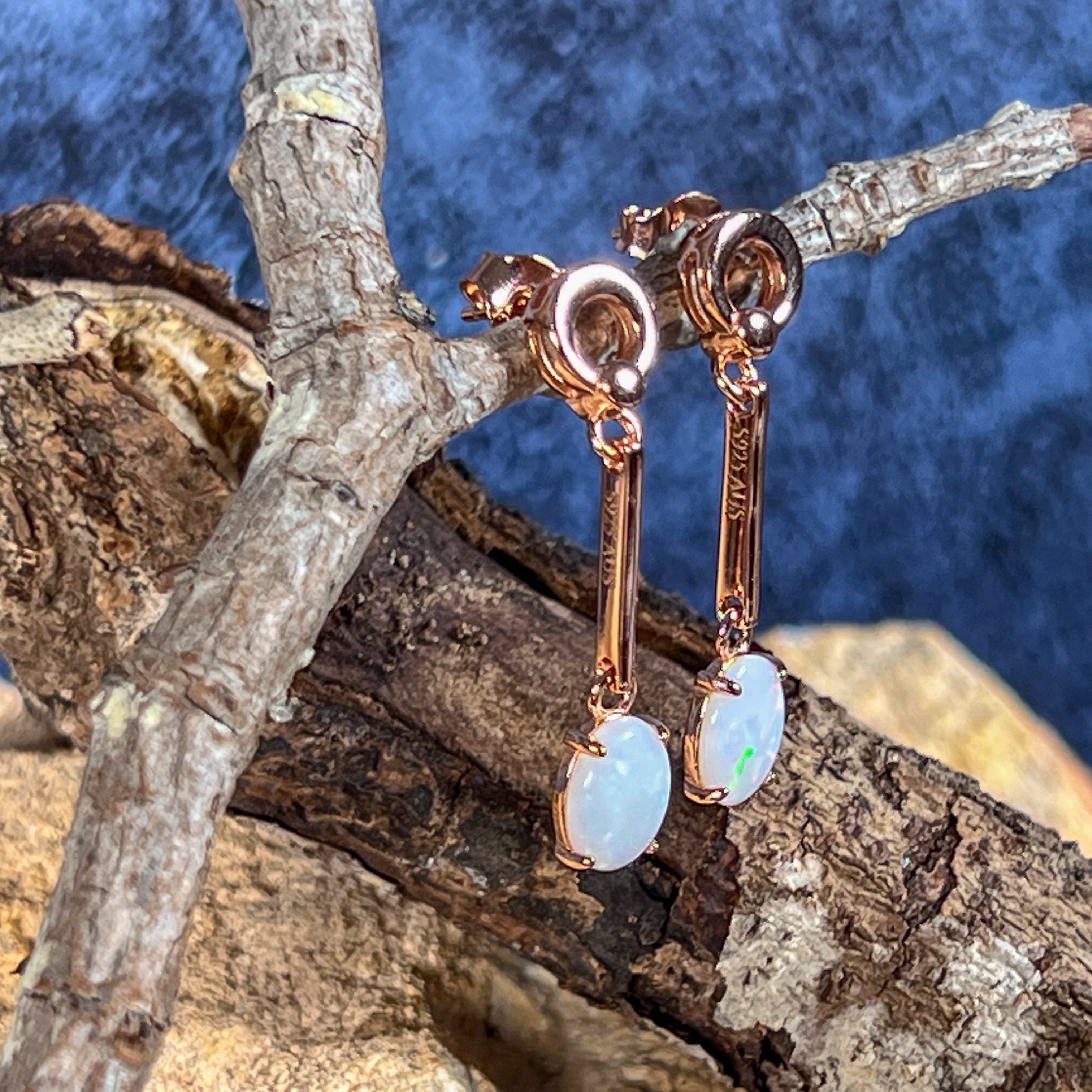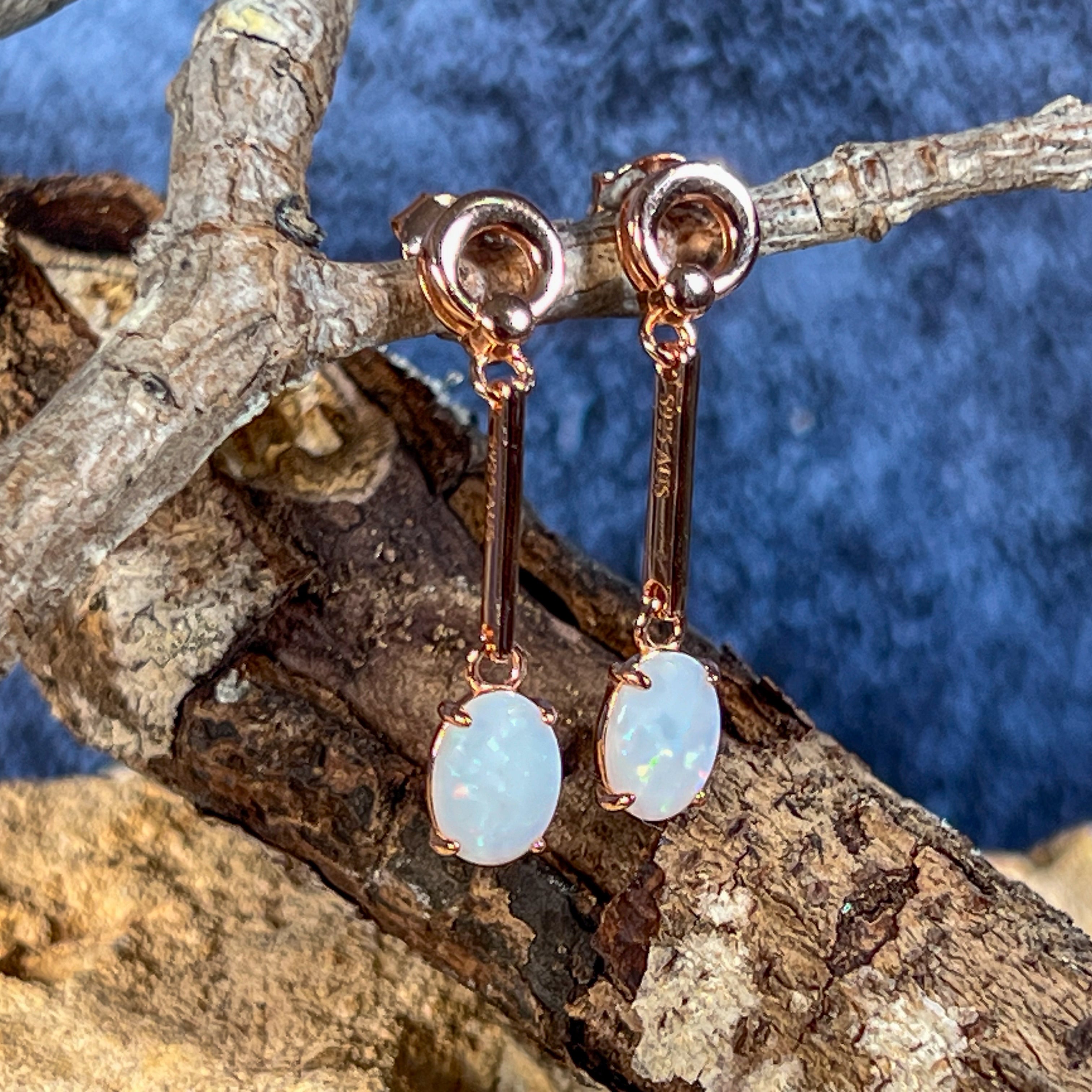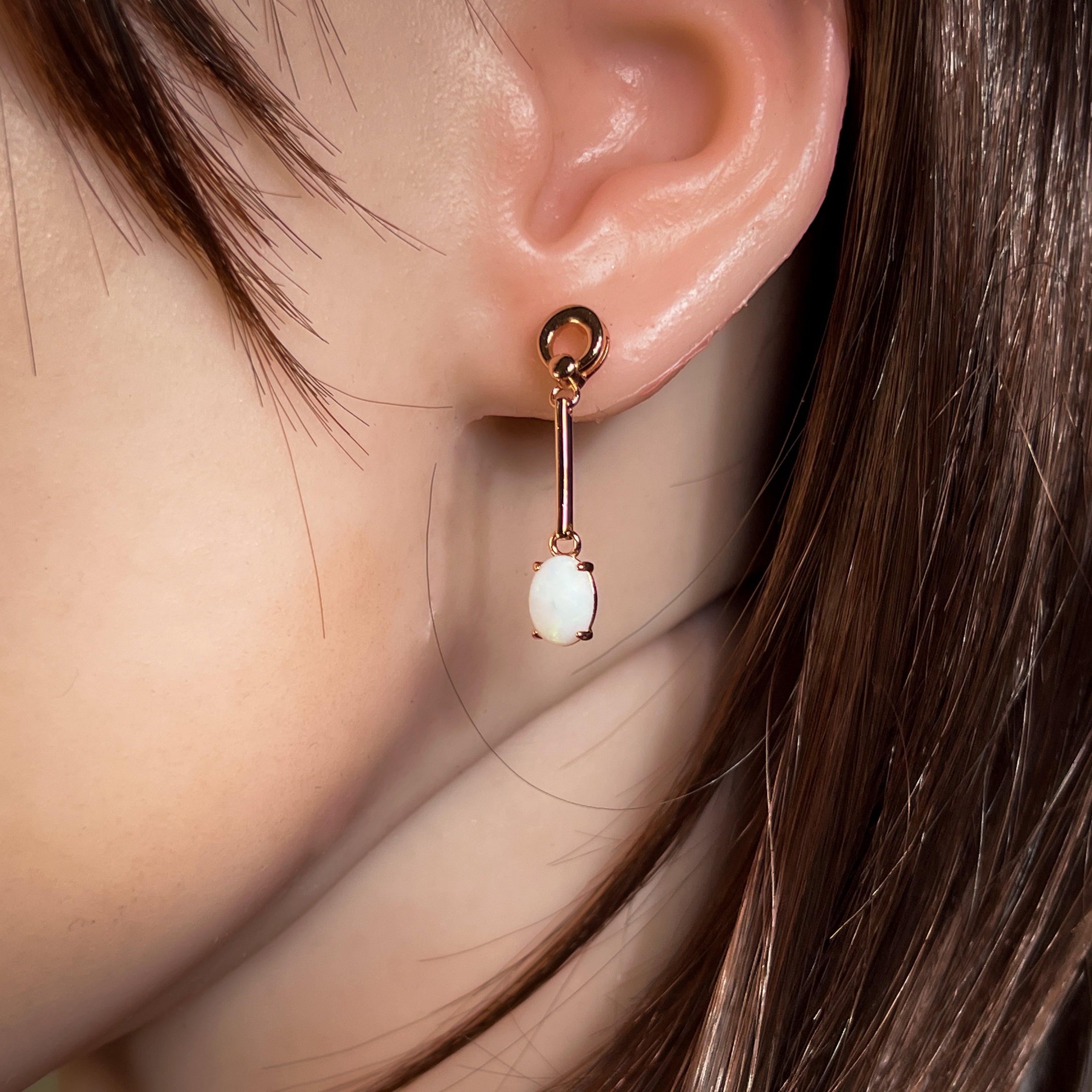Add a touch of elegance with our Rose Gold plated Silver dangling claw set White Opal earrings featuring a long bar design. These earrings will effortlessly elevate any outfit and make a statement. Sparkle and shine with the unique opal stones, making you stand out from the crowd. Treat yourself or someone special to this stunning piece of jewelry!
