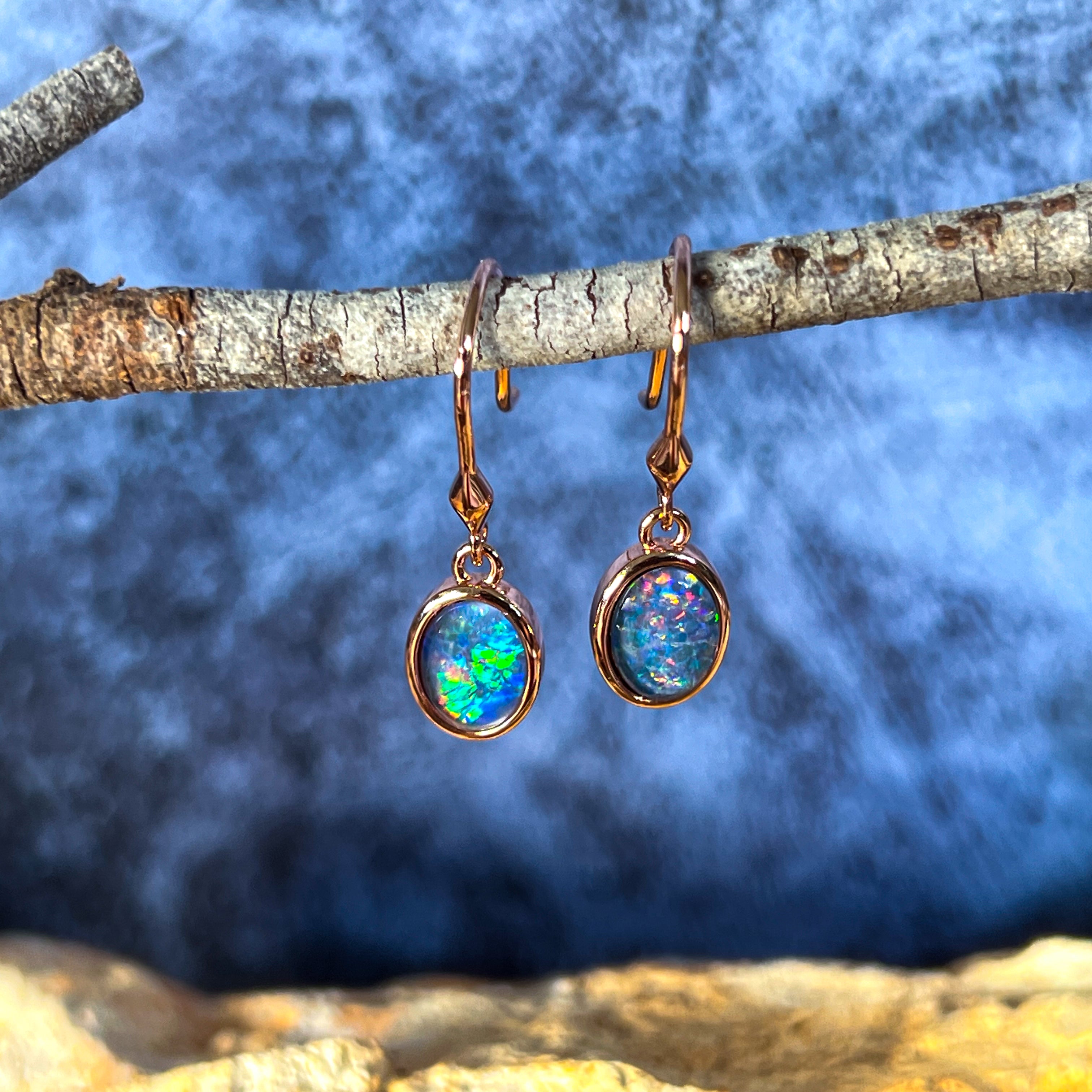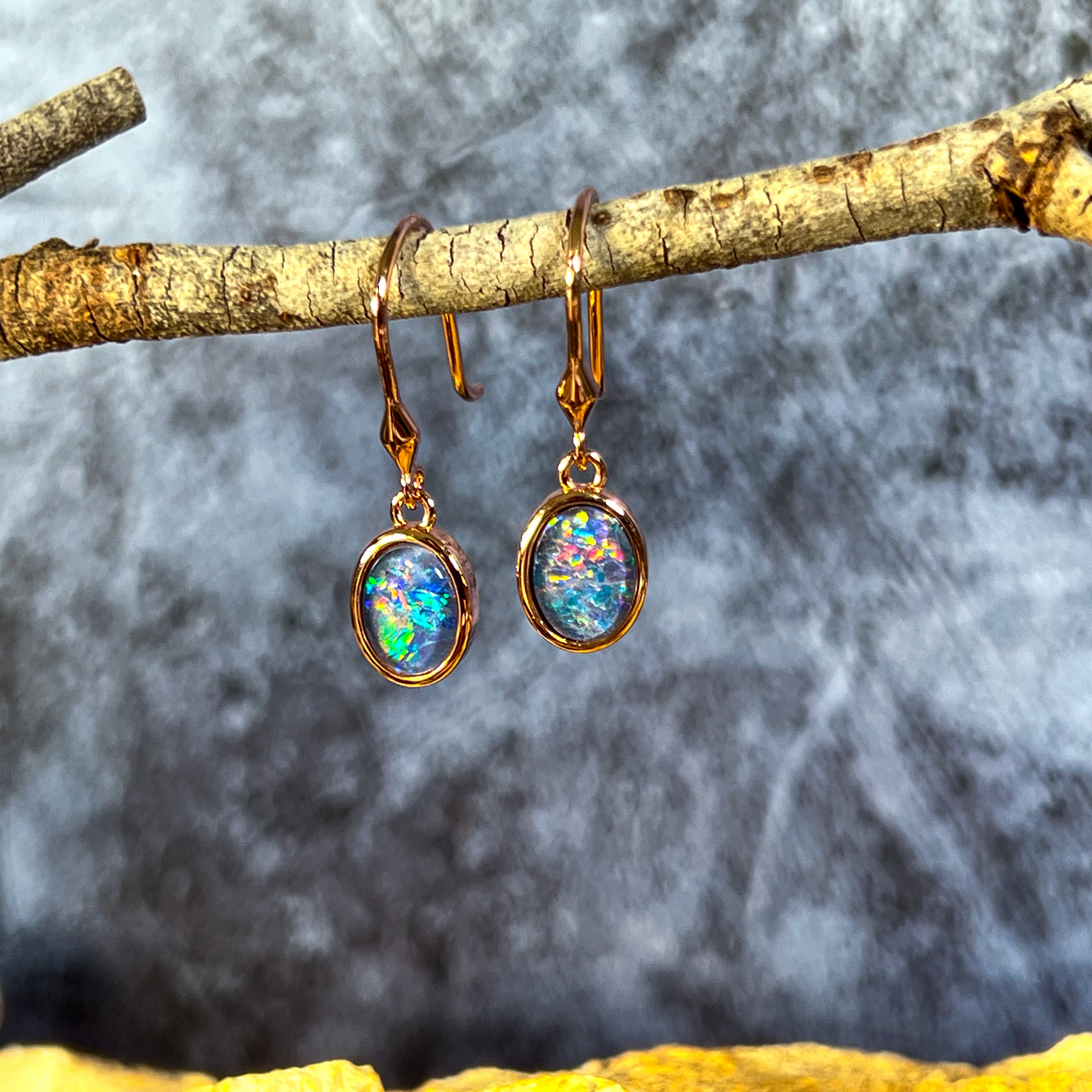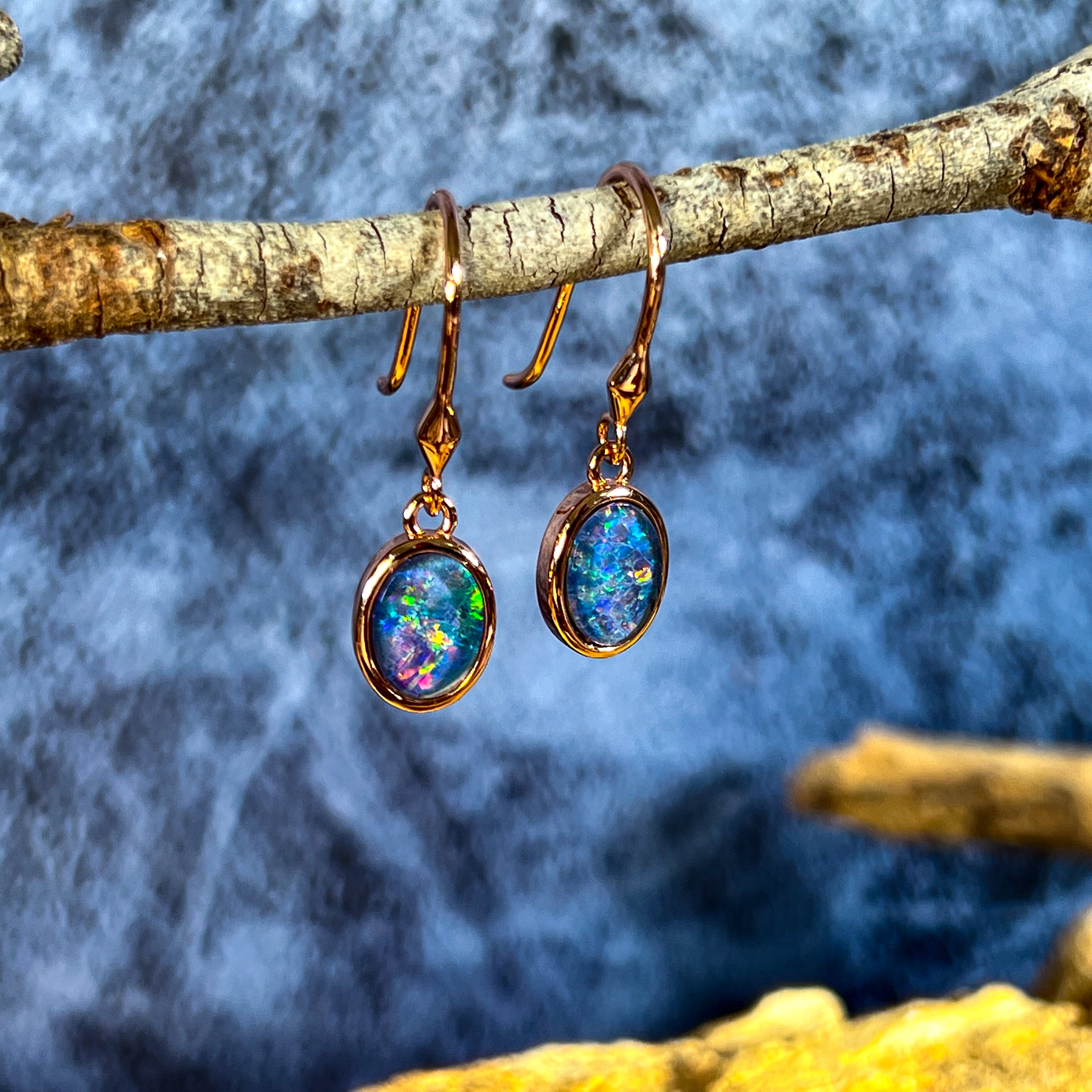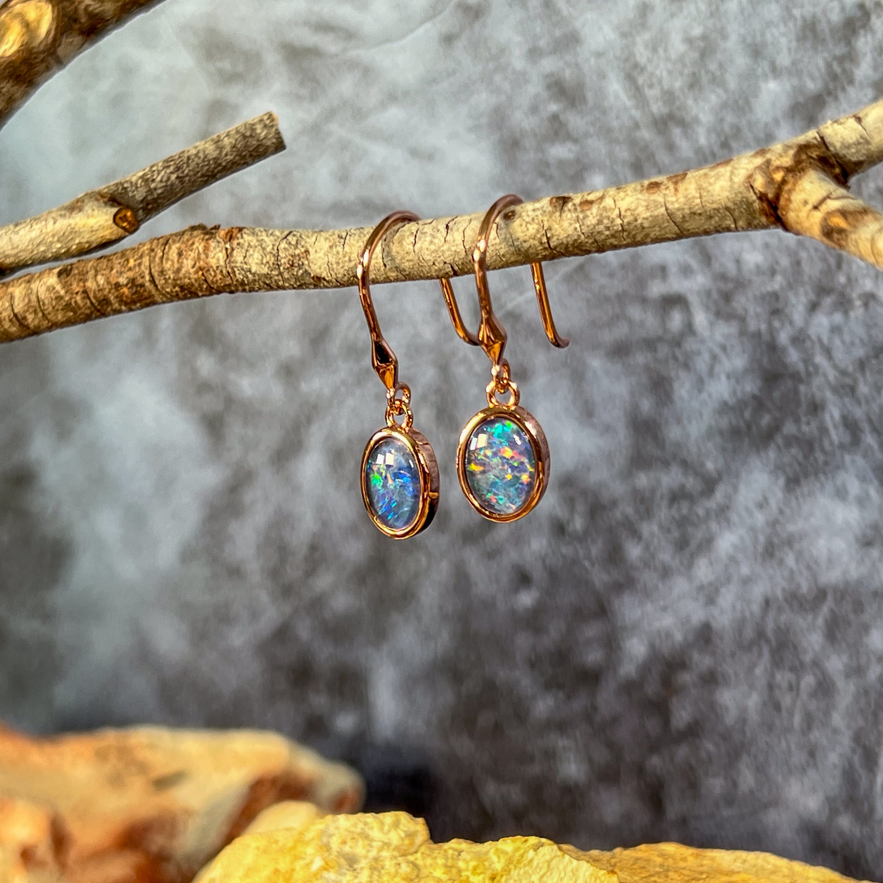 Rose Gold plated silver dangling Opal triplet 8x6mm hook earrings