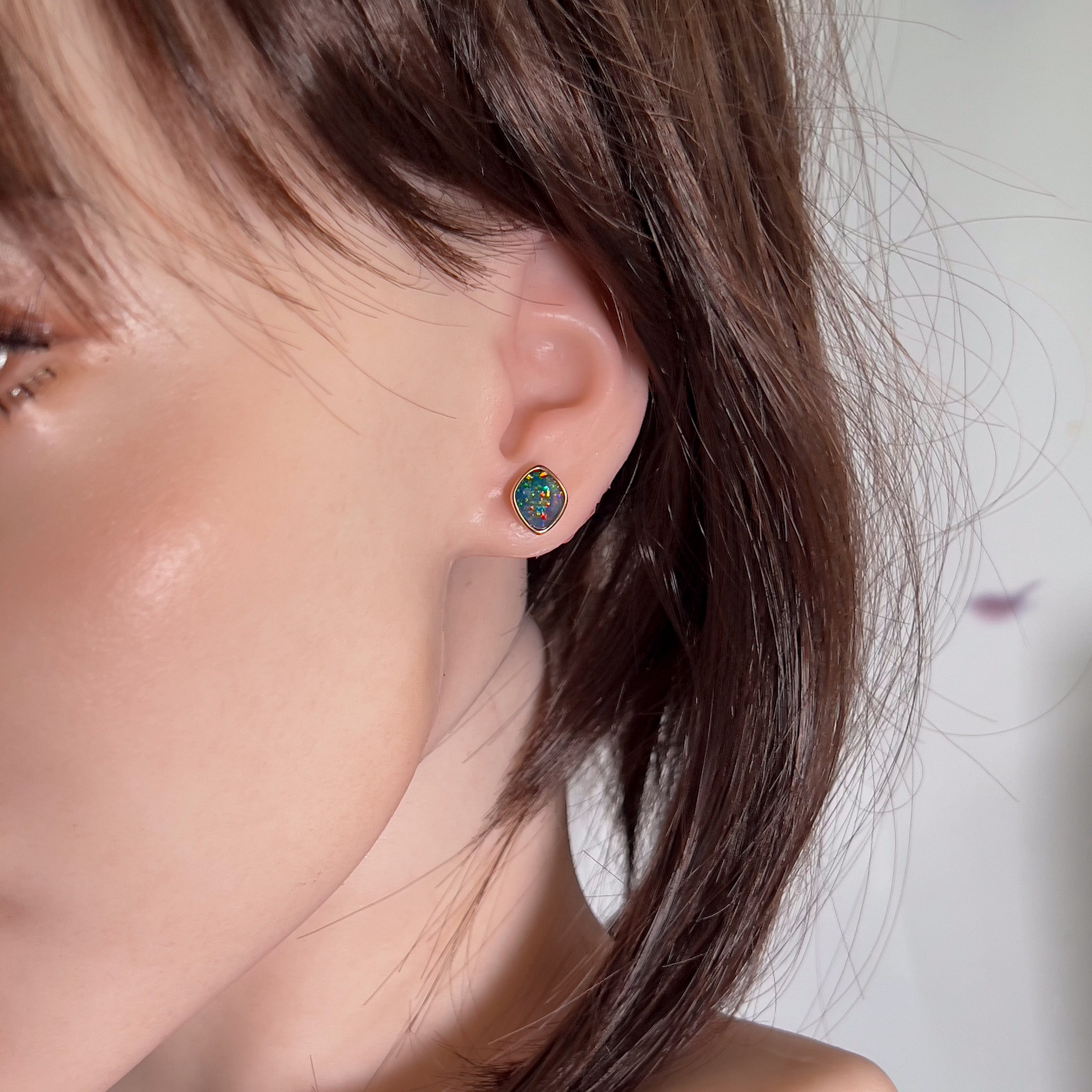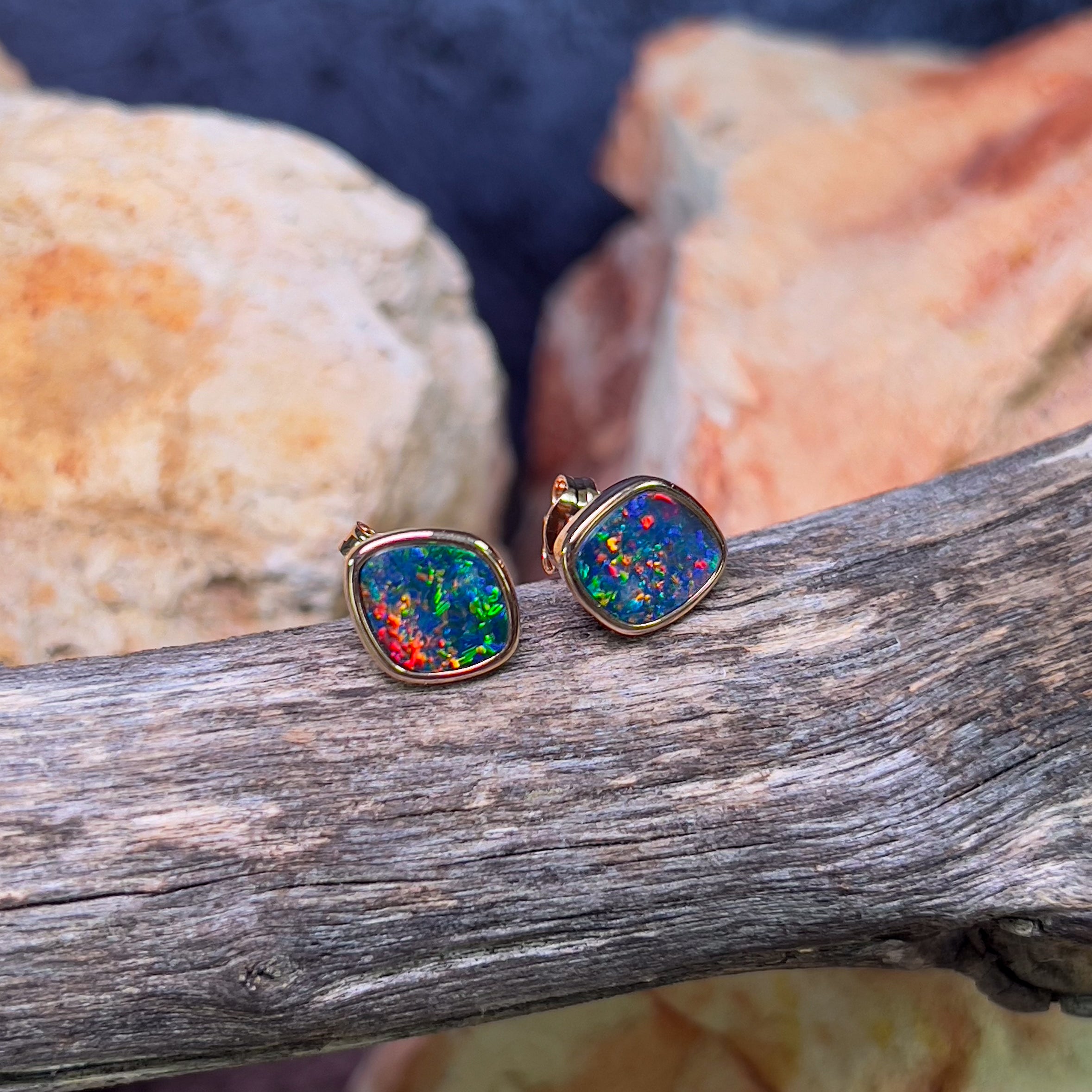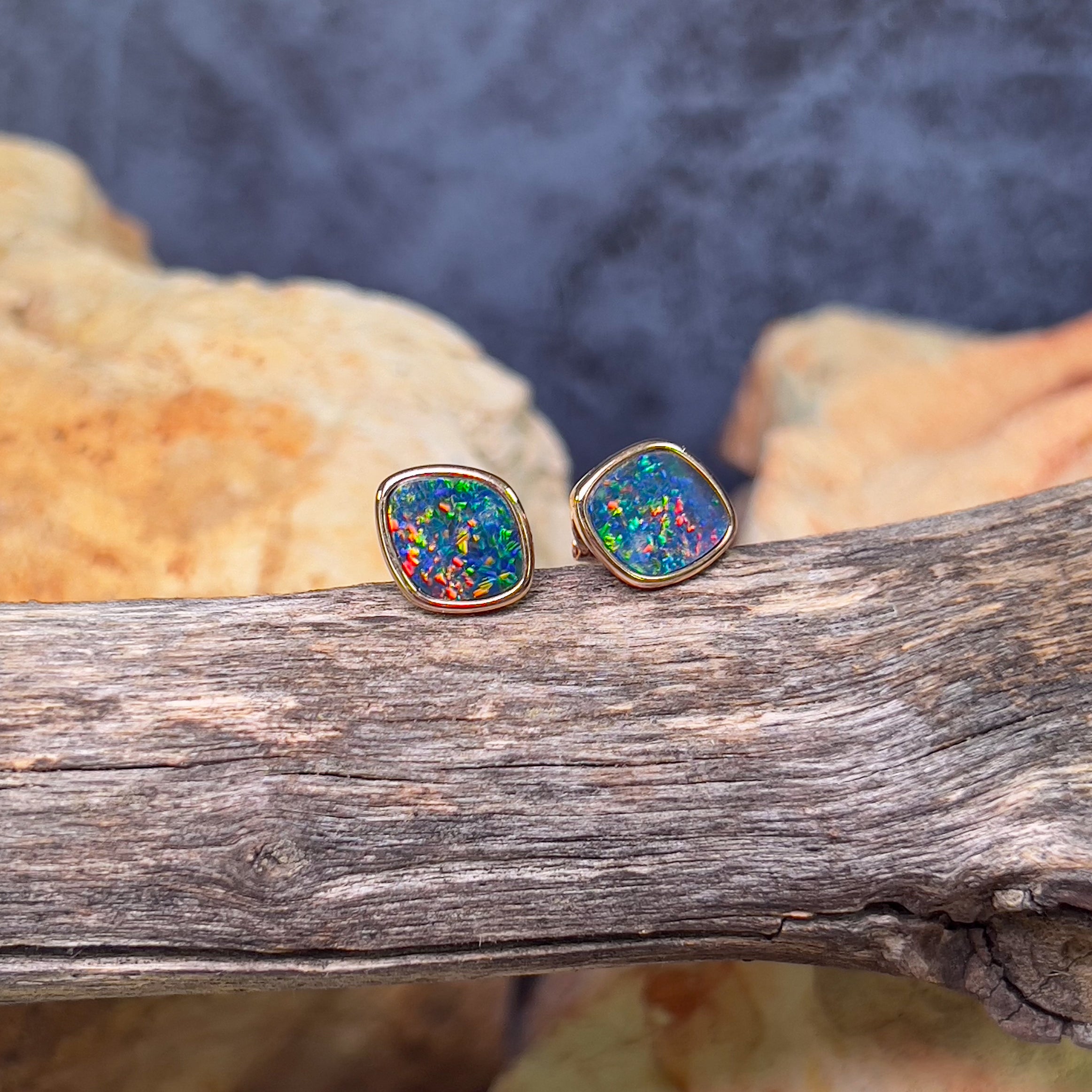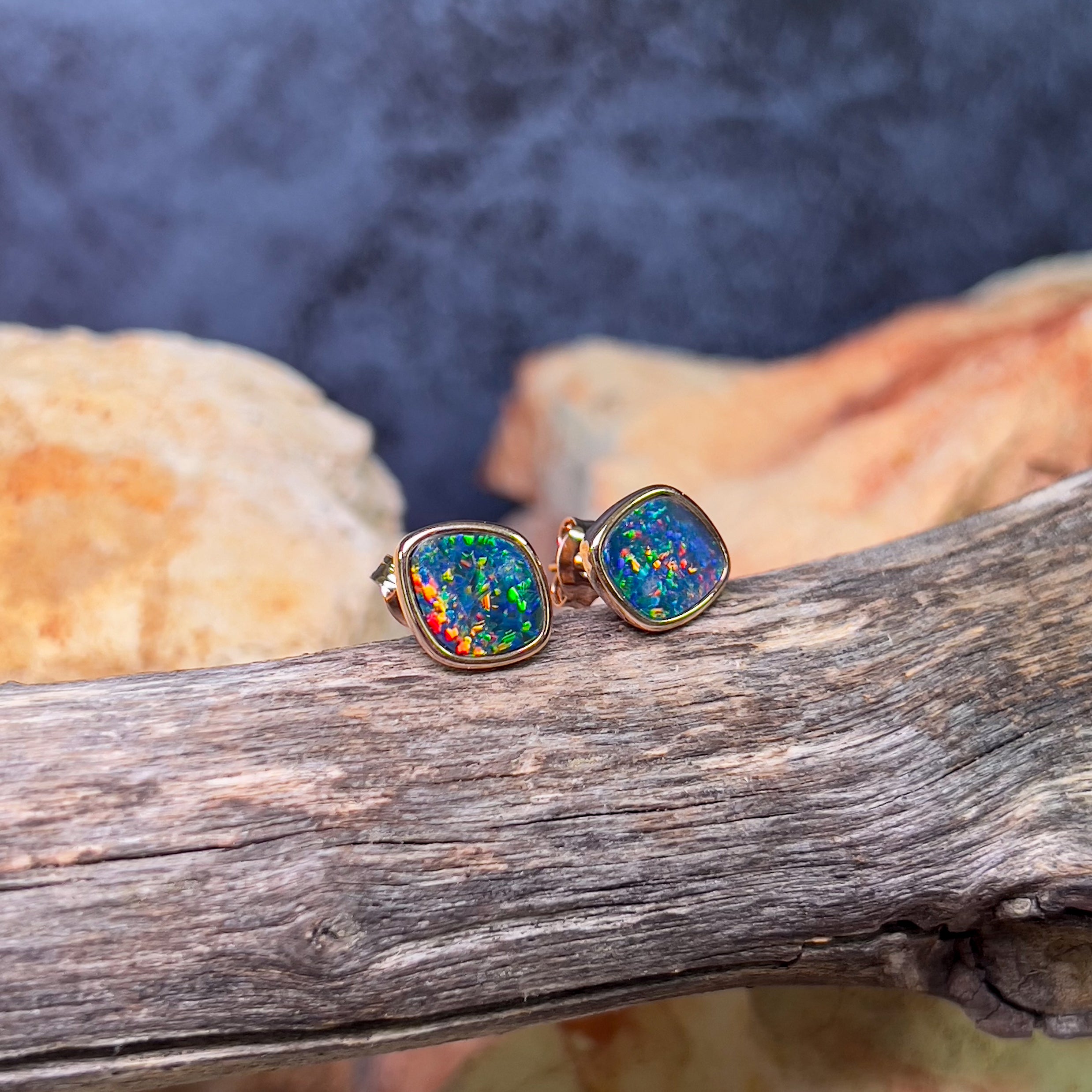 Add a touch of whimsy to your look with our Rose Gold plated silver diamond shape Opal doublet studs. Each stud features a stunning multi-color opal, creating a unique and playful accessory for any occasion. Upgrade your earring game and sparkle with these beautiful studs!
