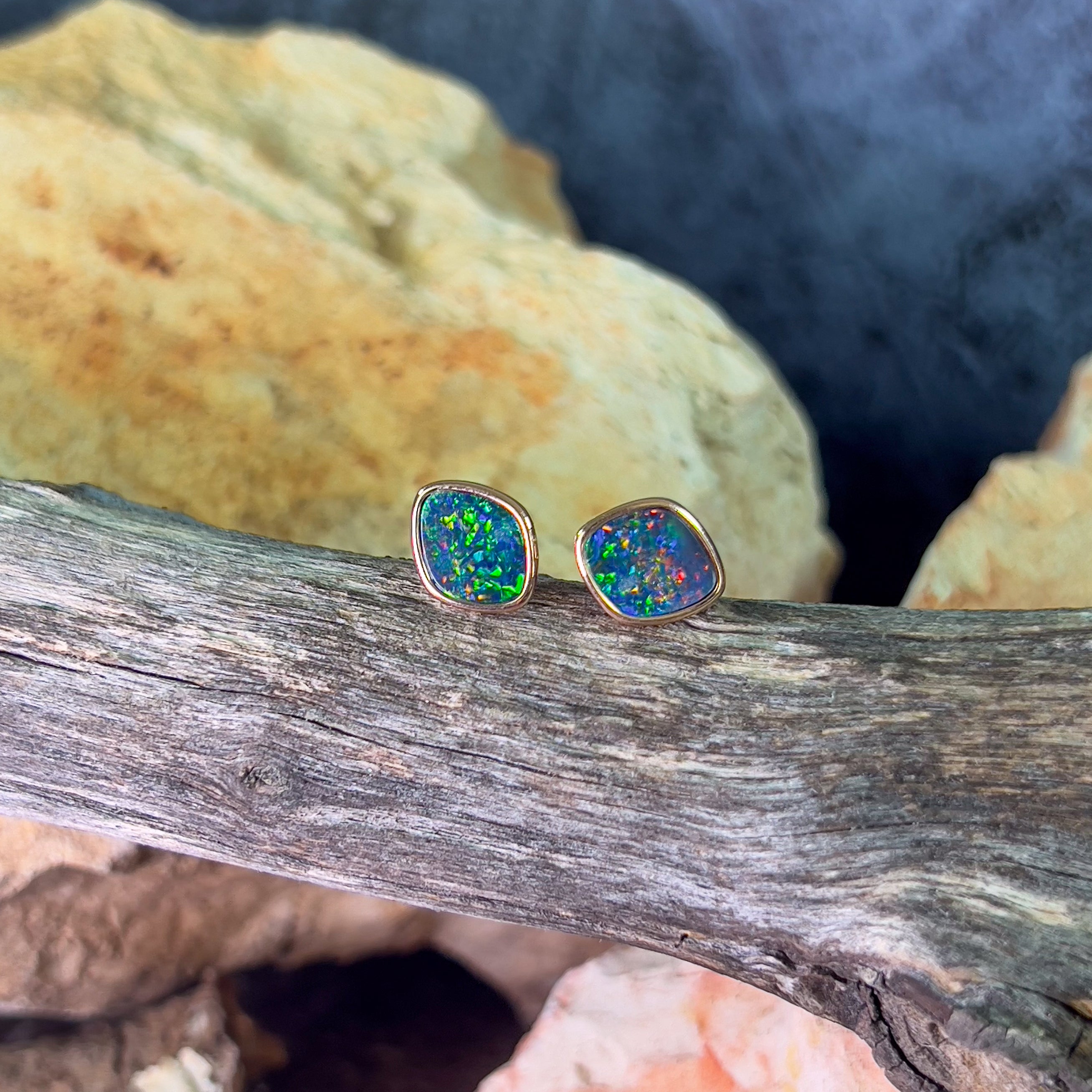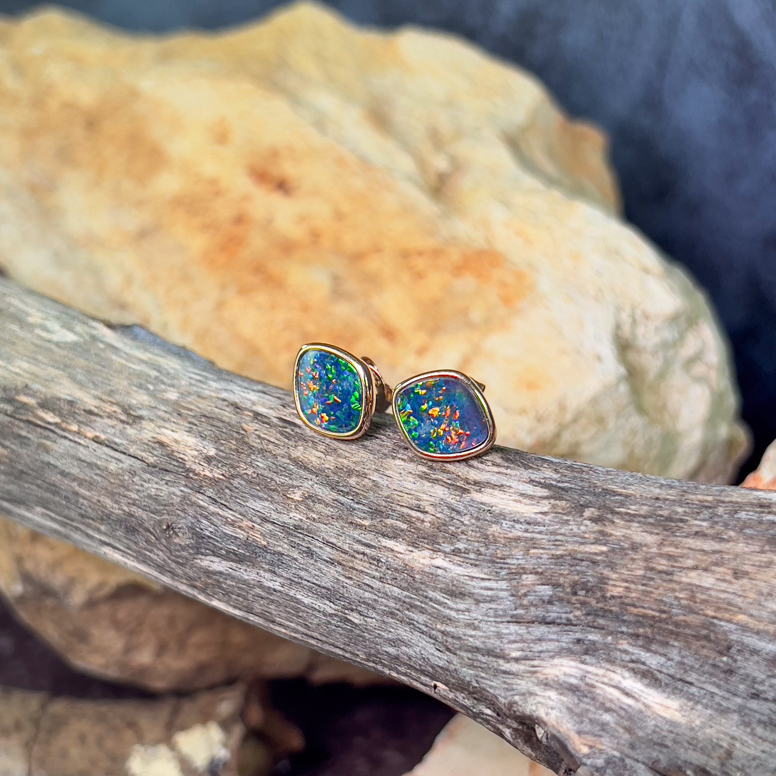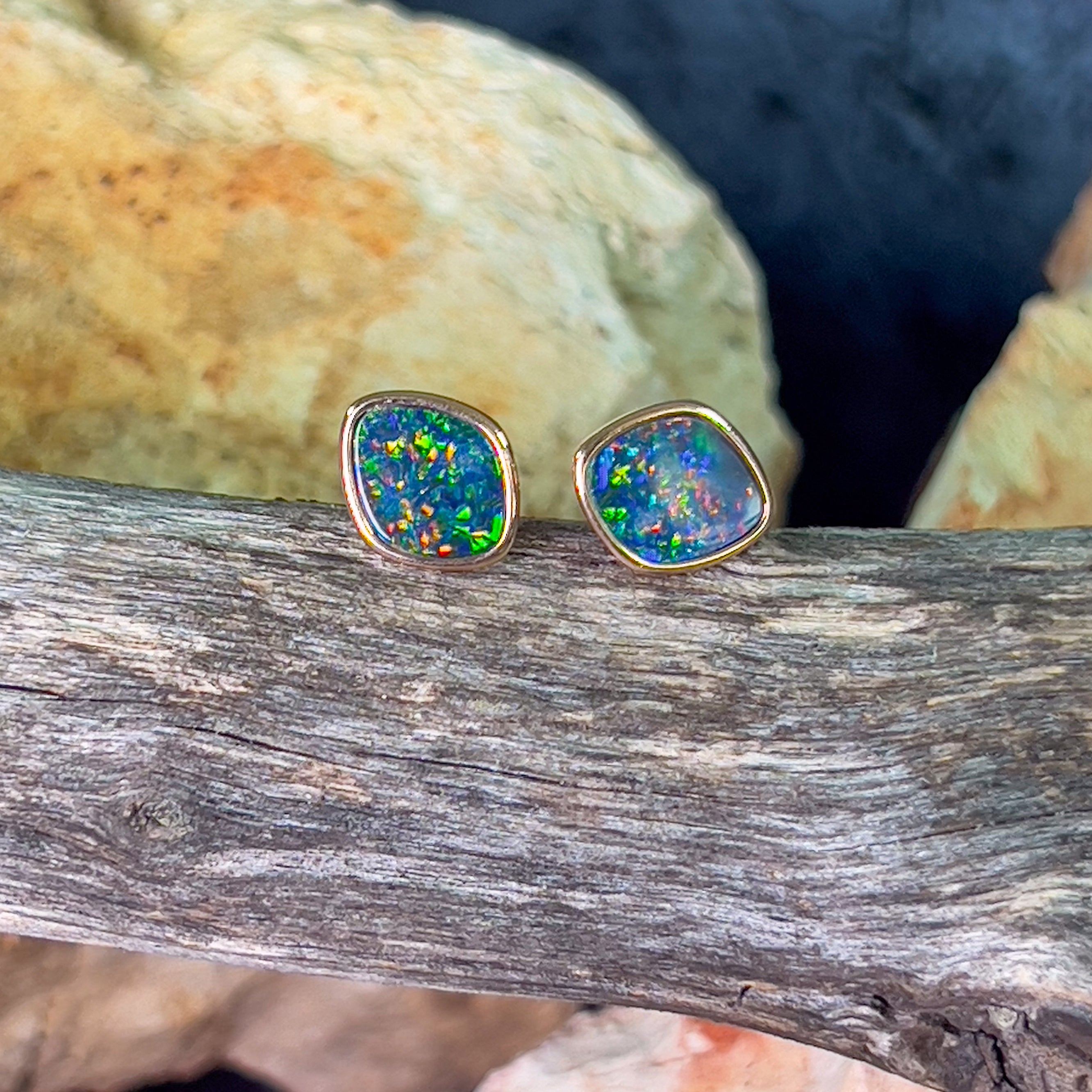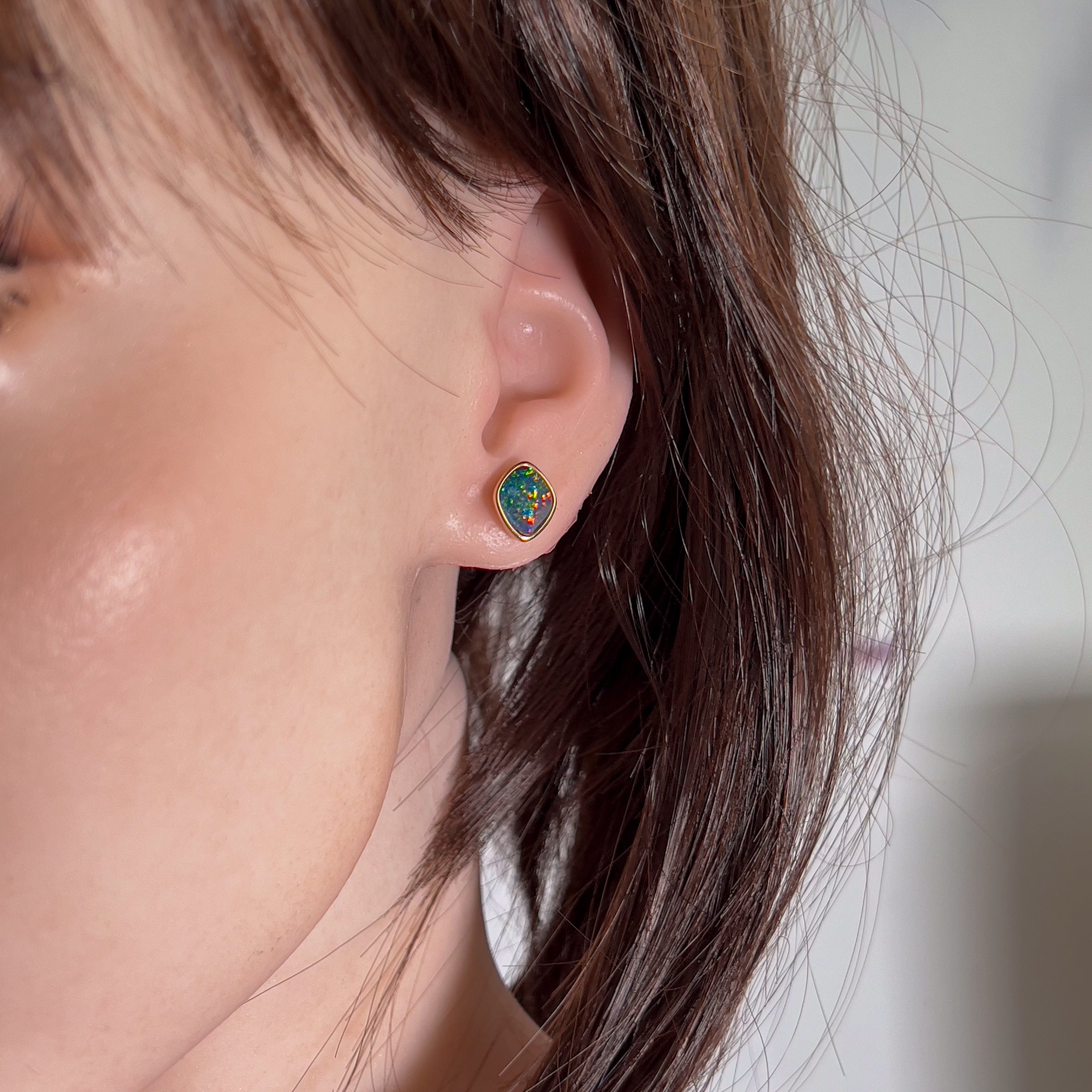 Add a touch of whimsy to your look with our Rose Gold plated silver diamond shape Opal doublet studs. Each stud features a stunning multi-color opal, creating a unique and playful accessory for any occasion. Upgrade your earring game and sparkle with these beautiful studs!