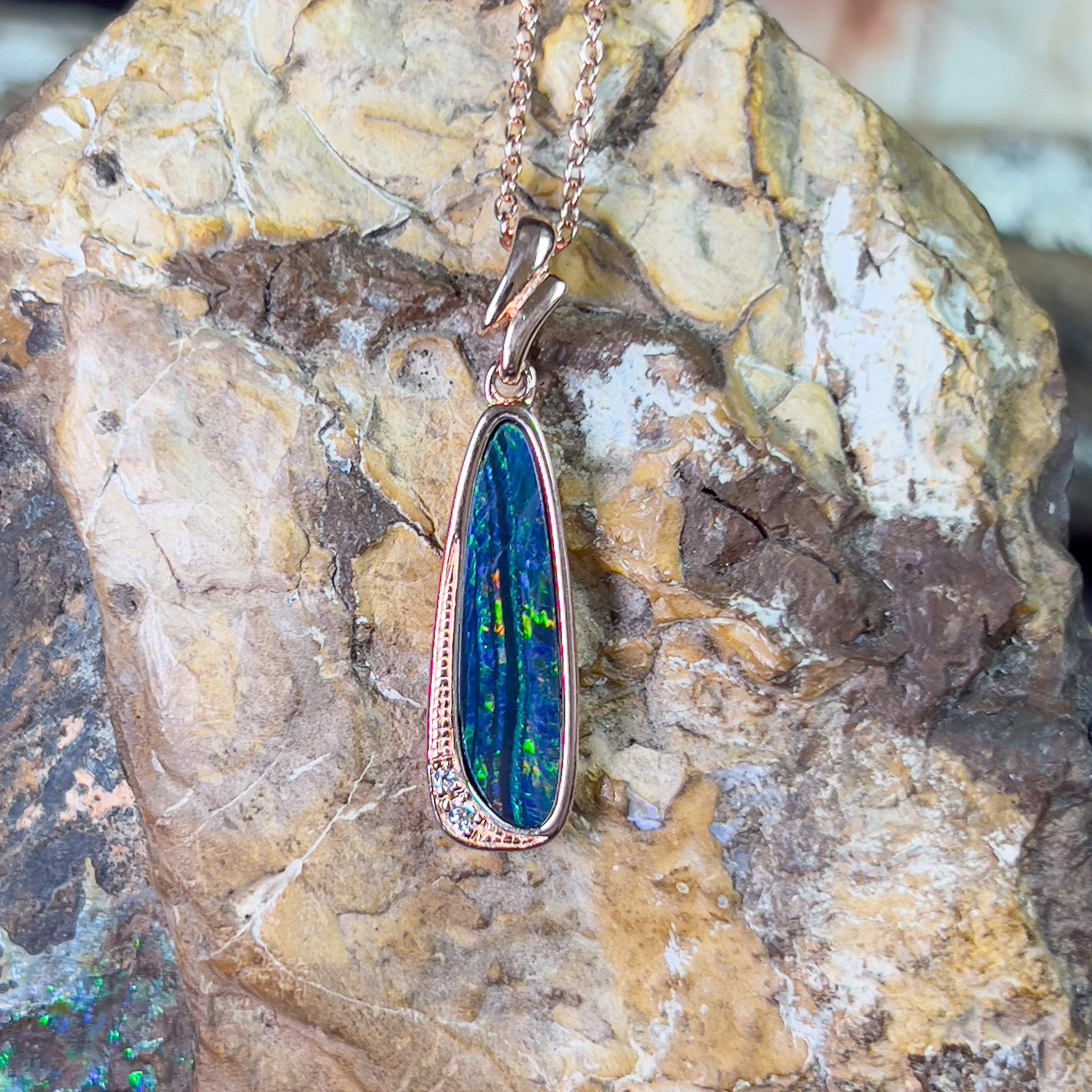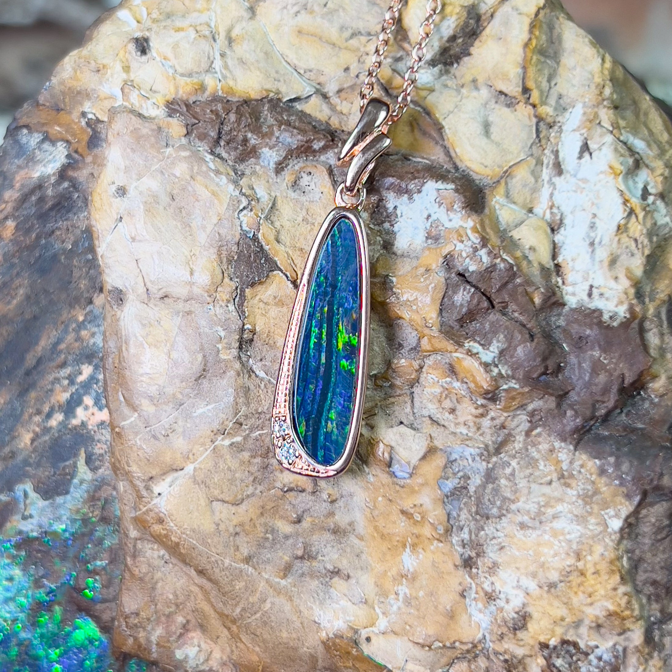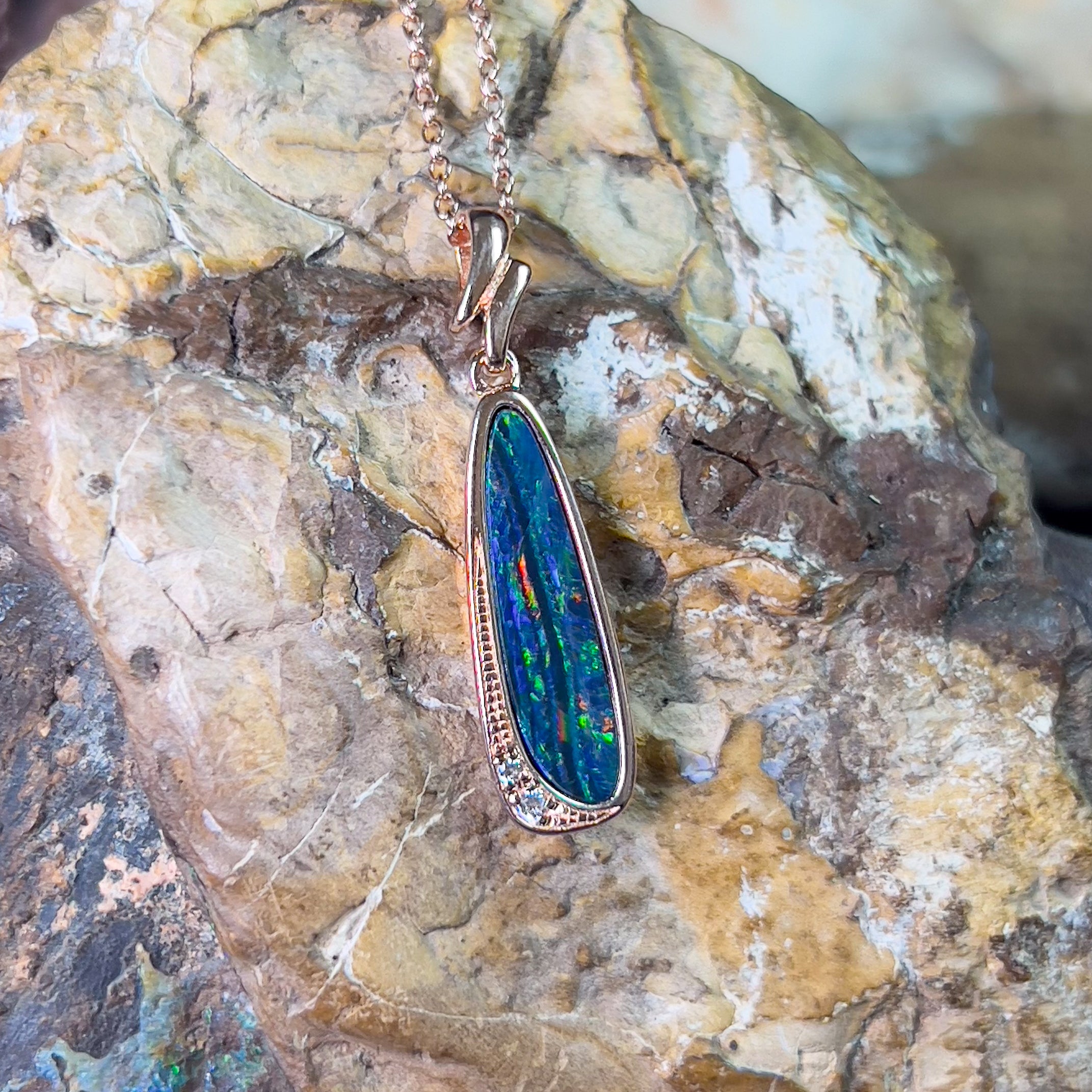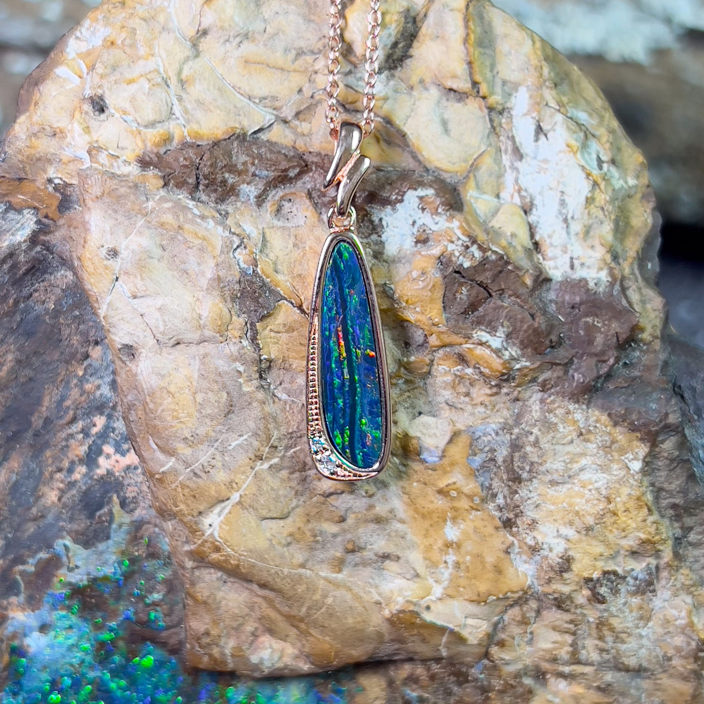 Elevate your style with our Rose Gold plated Sterling Silver Opal doublet long thin drop pendant. The delicate long and thin drop design adds a touch of elegance to any outfit. Crafted with stunning opal doublet, this pendant is perfect for adding a pop of color to your wardrobe.
