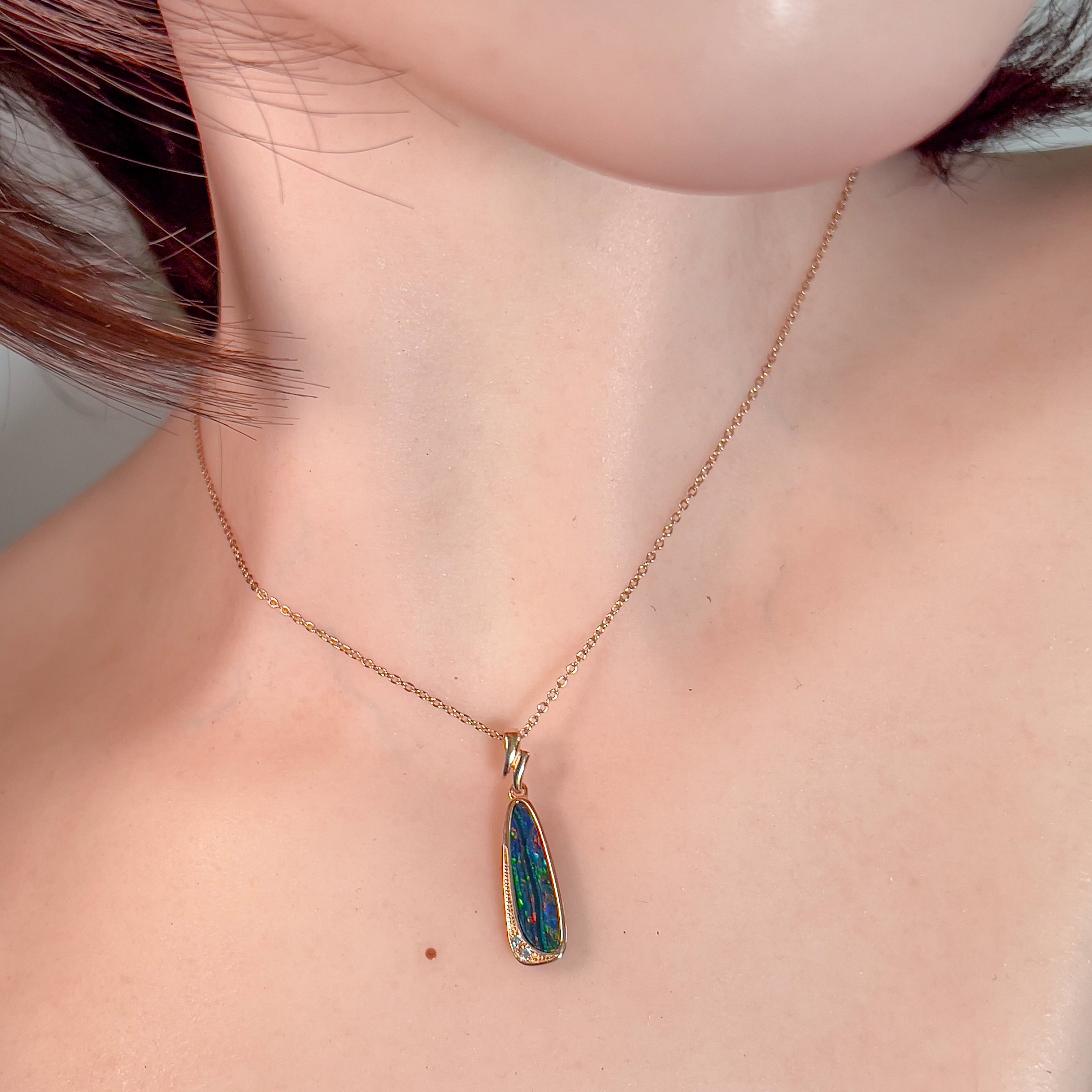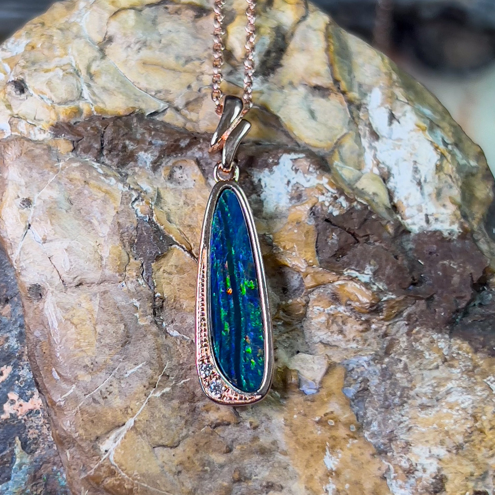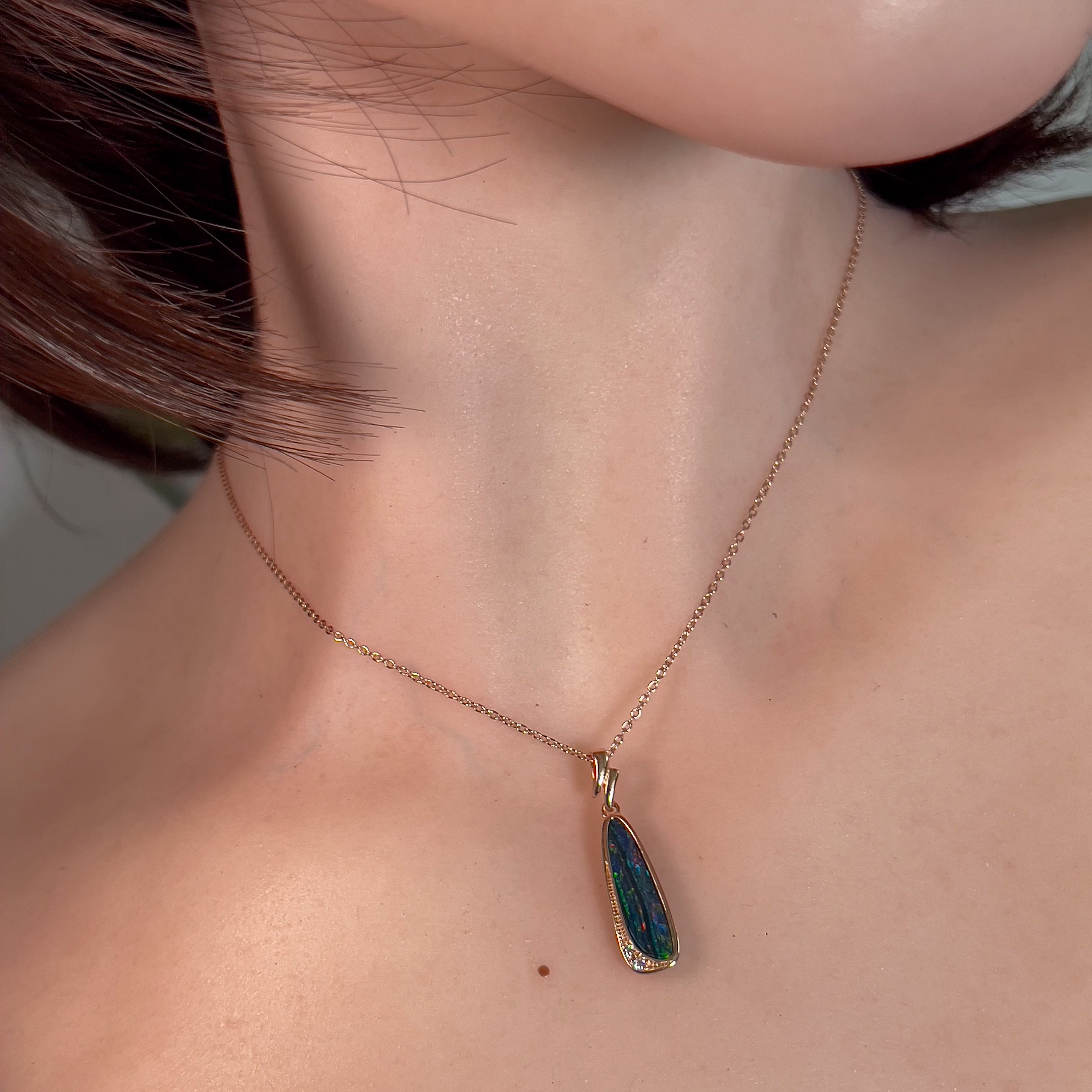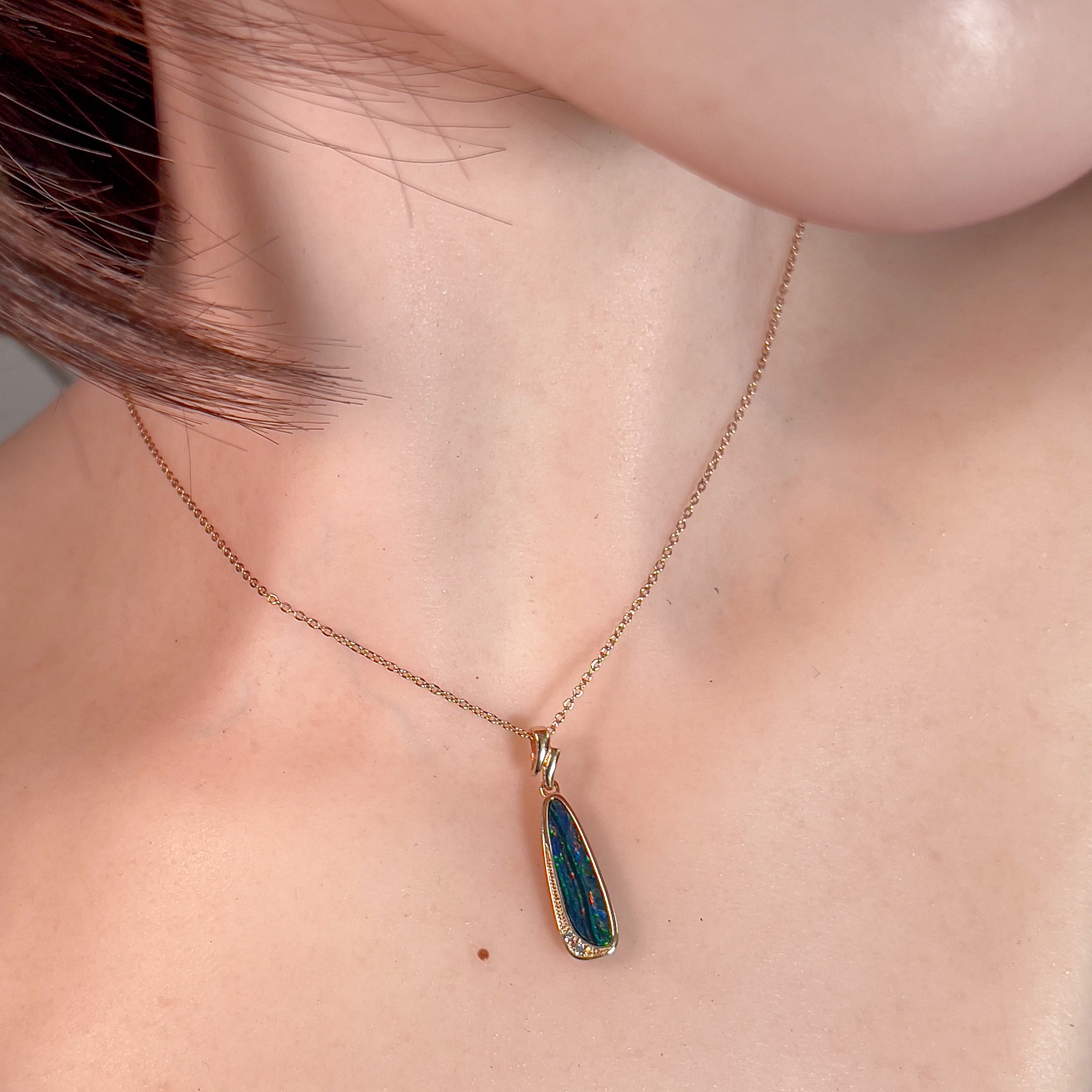 Elevate your style with our Rose Gold plated Sterling Silver Opal doublet long thin drop pendant. The delicate long and thin drop design adds a touch of elegance to any outfit. Crafted with stunning opal doublet, this pendant is perfect for adding a pop of color to your wardrobe.