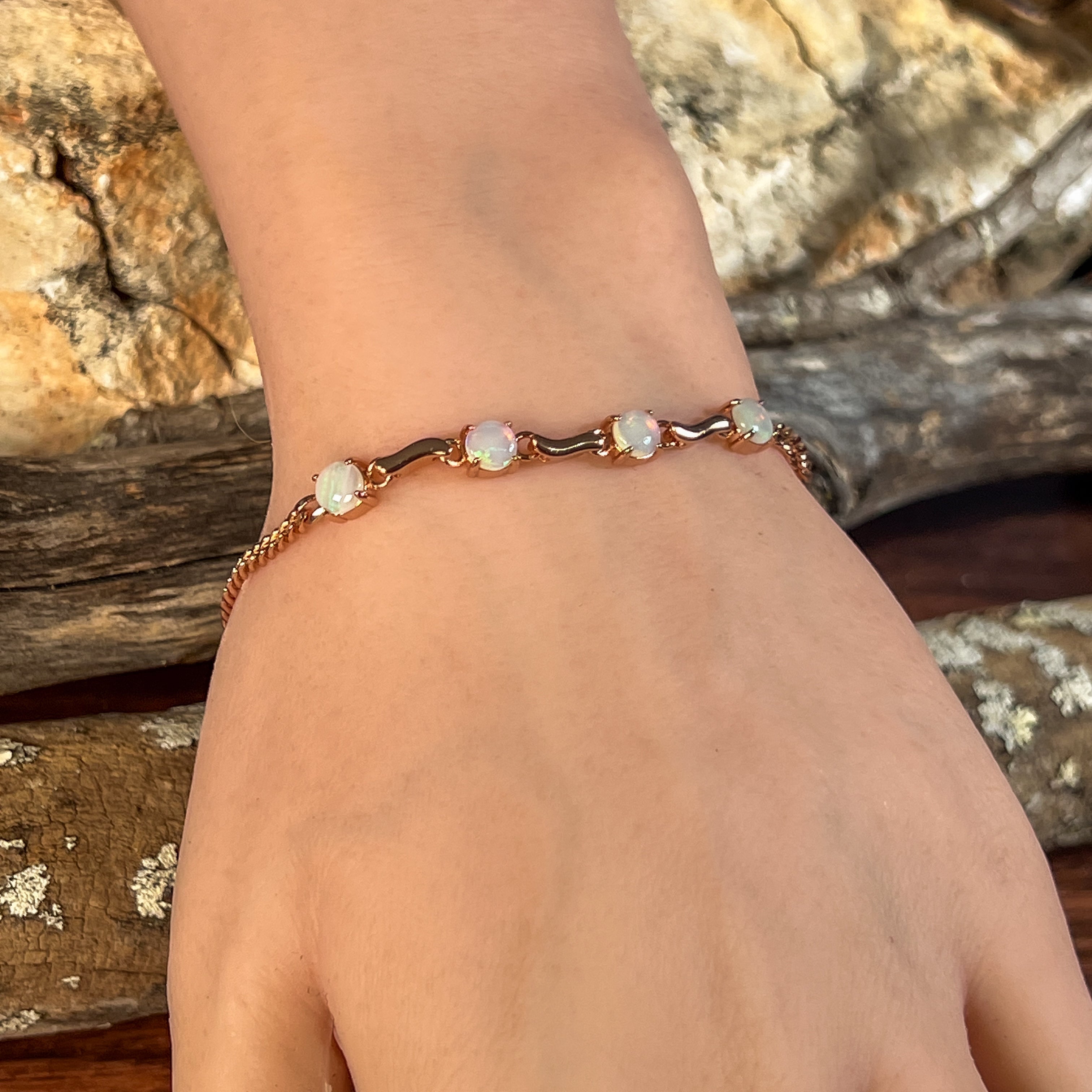 Indulge in delicate luxury with our Rose Gold Plated Sterling Silver White Opal 5mm Bracelet. The exquisite wave pattern adds a touch of elegance to the dainty design. Stand out with this stunning piece, perfect for any occasion. Elevate your style and feel confident in your unique beauty.