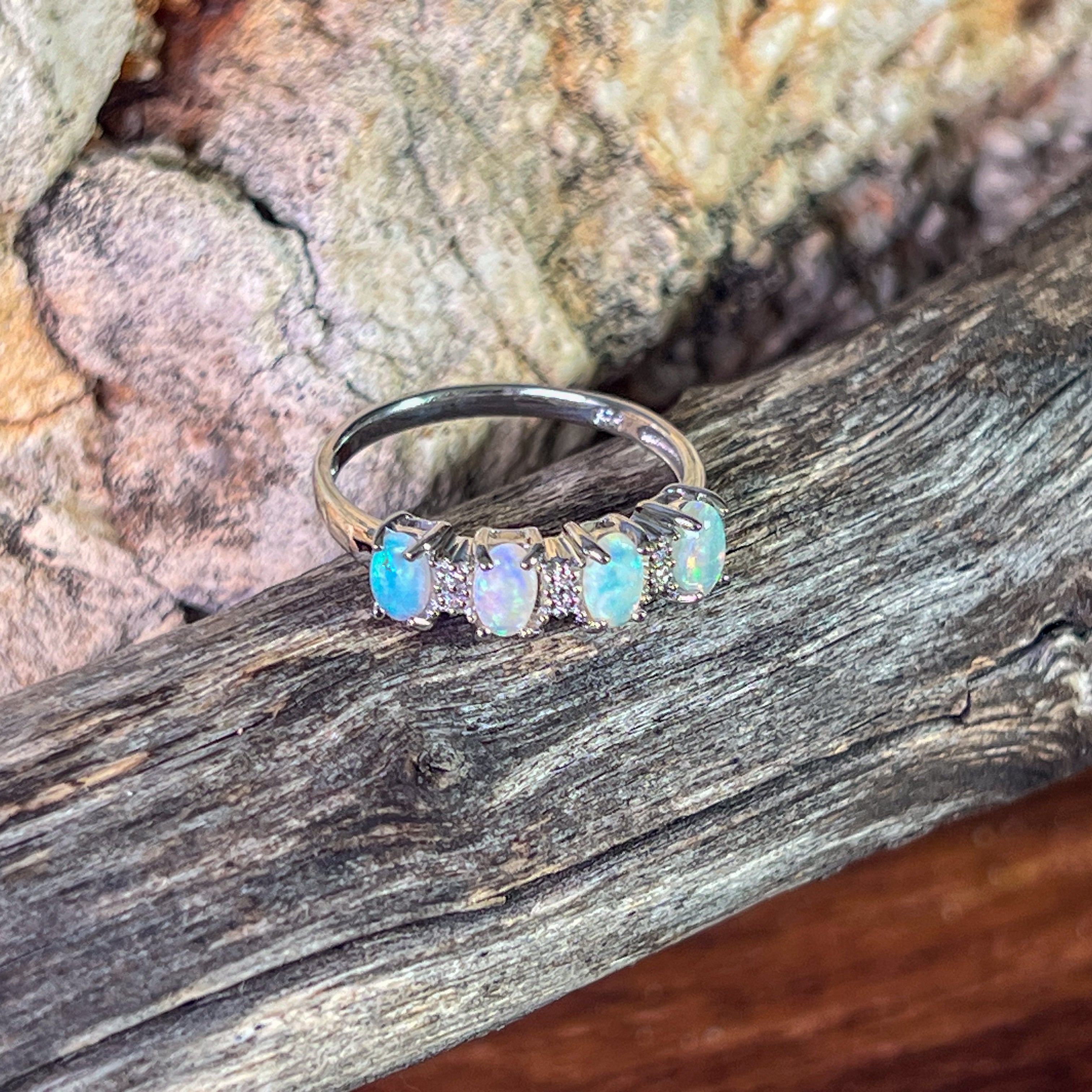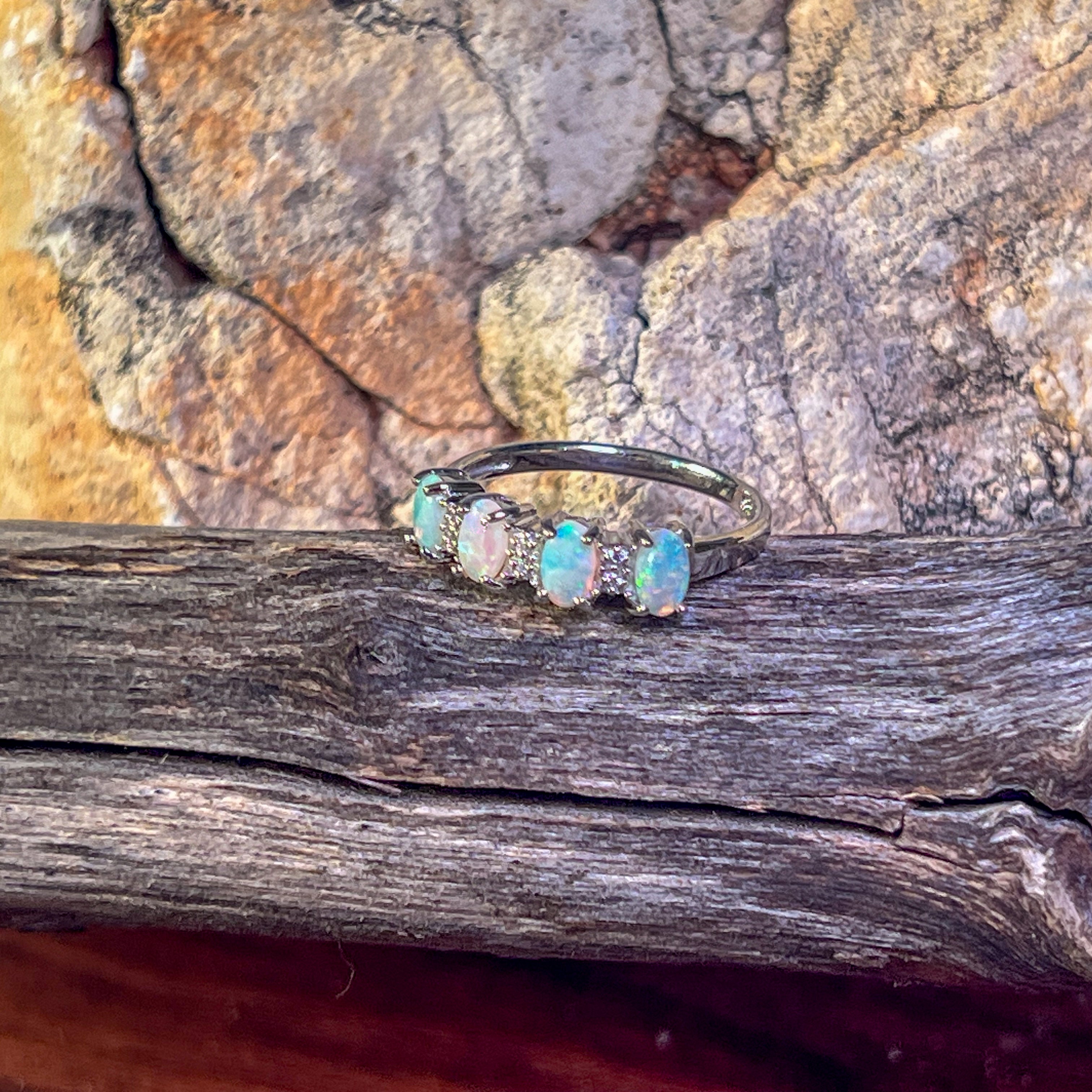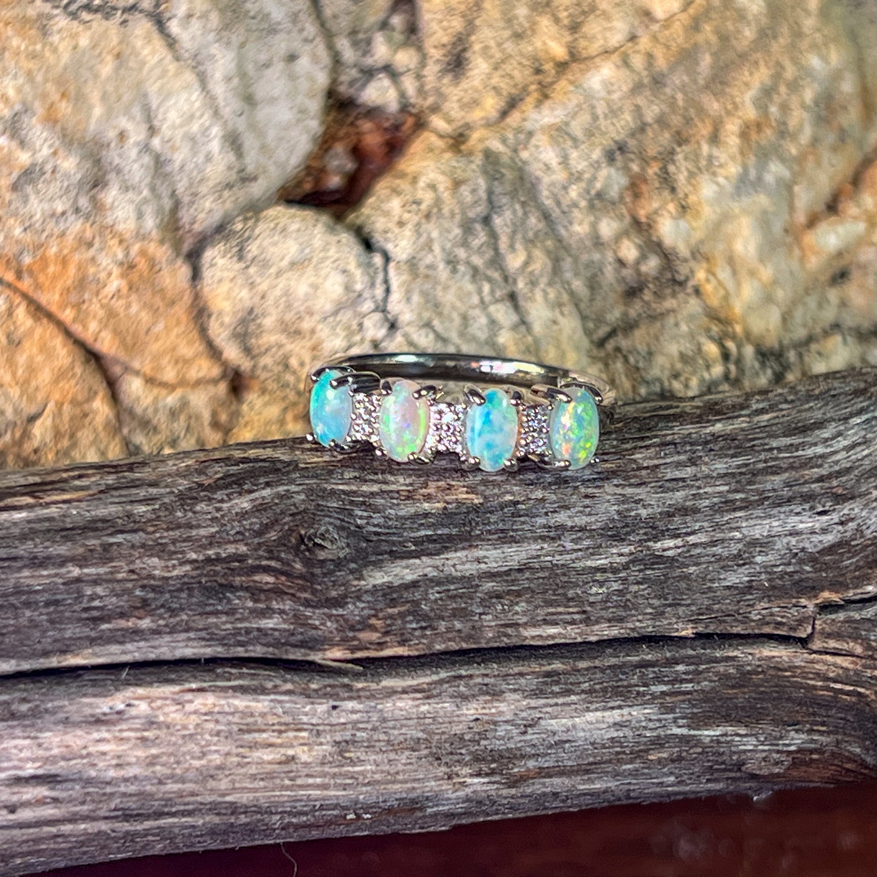 Add a touch of elegance to any outfit with our Sterling Silver 5x3mm Opal half eternity band. This stunning ring features a half eternity design, perfect for symbolizing everlasting love and commitment. Crafted in high-quality sterling silver, it is both beautiful and durable.