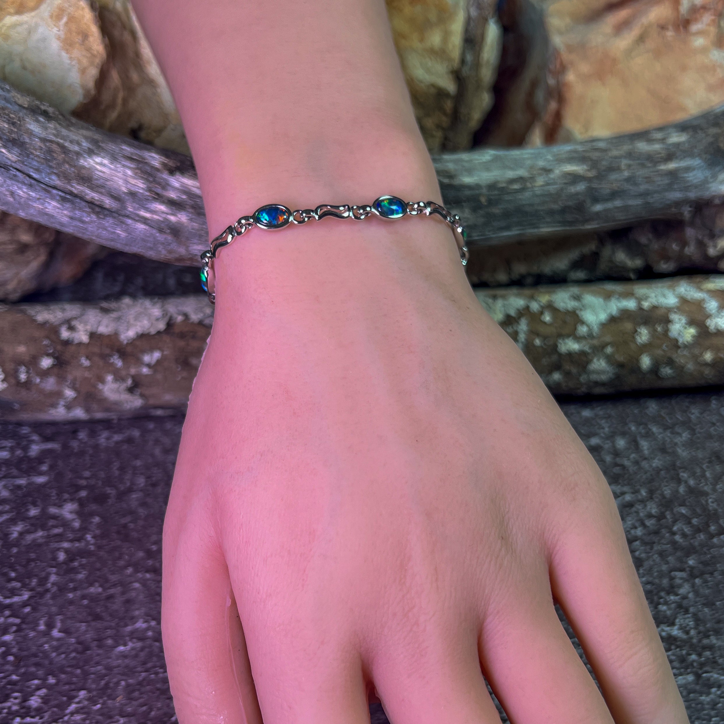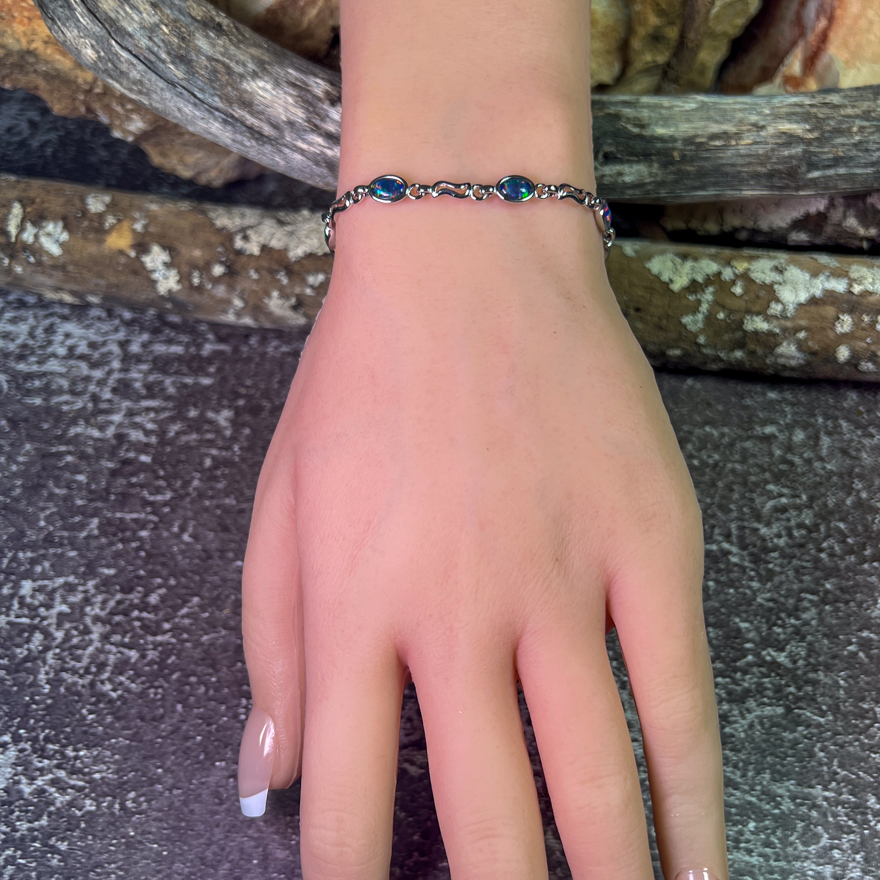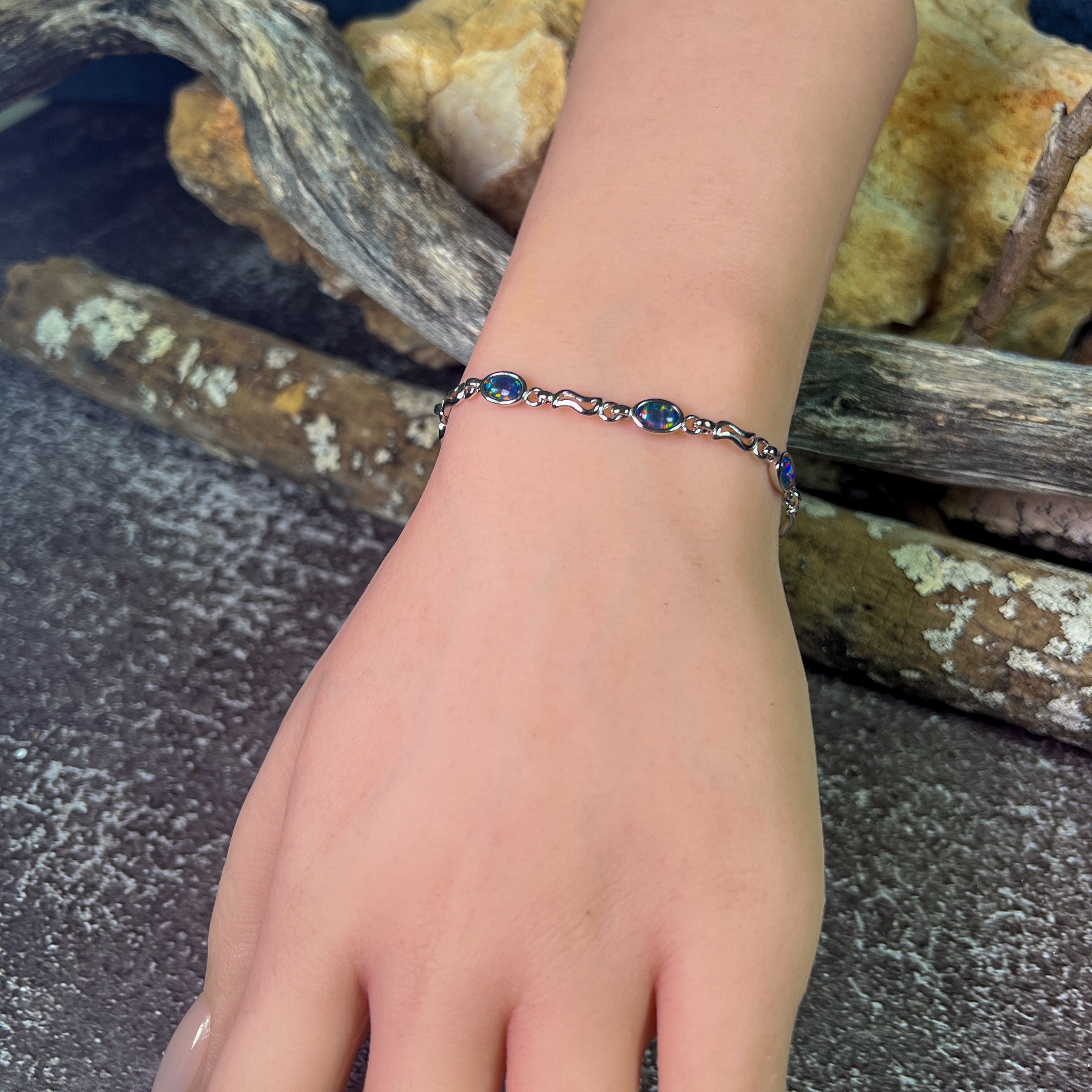 Sparkle and shine with our Sterling Silver Opal triplet bracelet. Featuring a stunning 6x4mm Opal triplet in a range of mesmerizing hues, this bracelet is a must-have for any jewelry collection. Elevate any look with the multi-color rainbow effect of this beautiful gemstone. Let its beauty and iridescence captivate you and those around you!