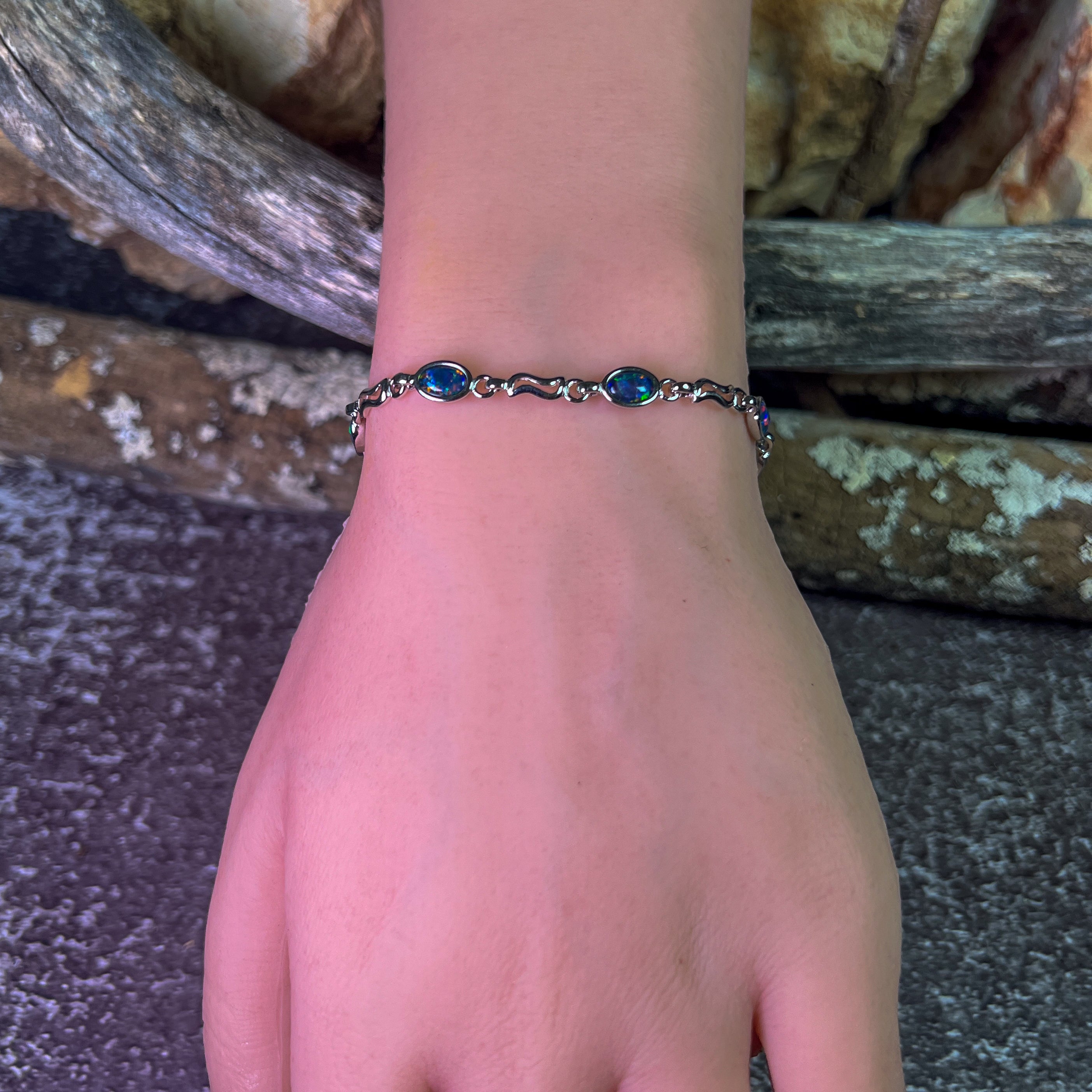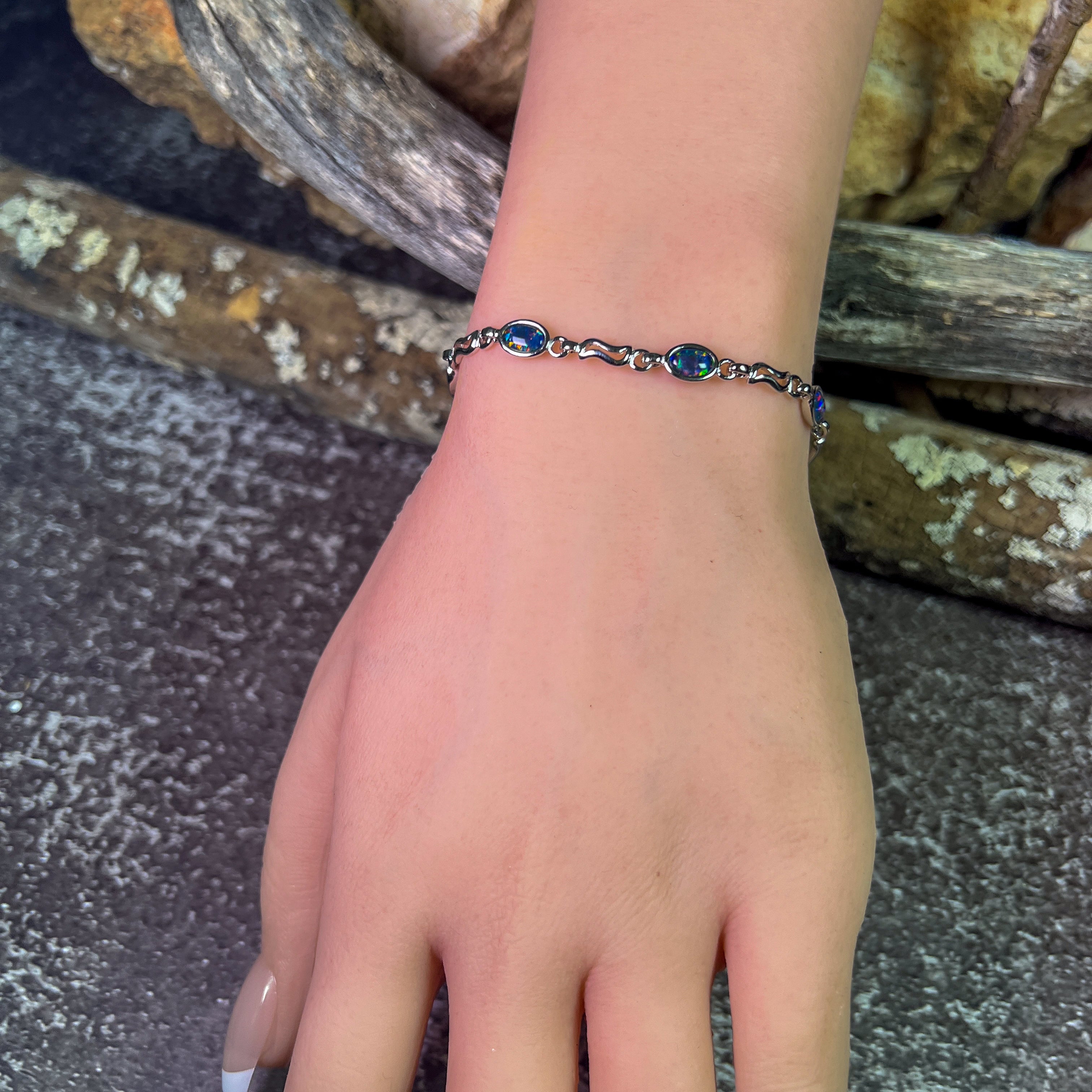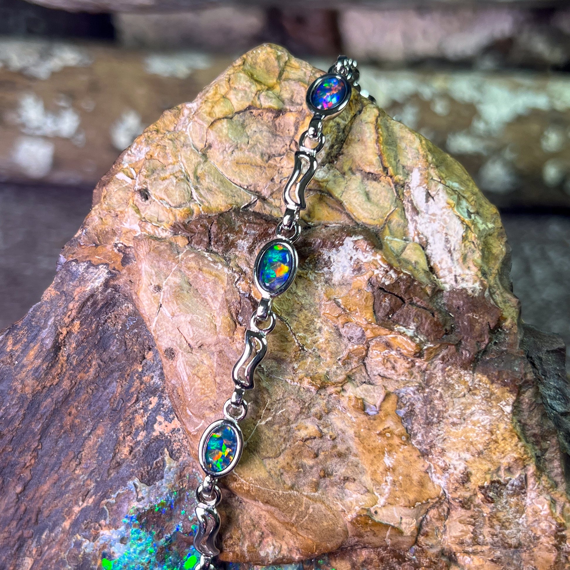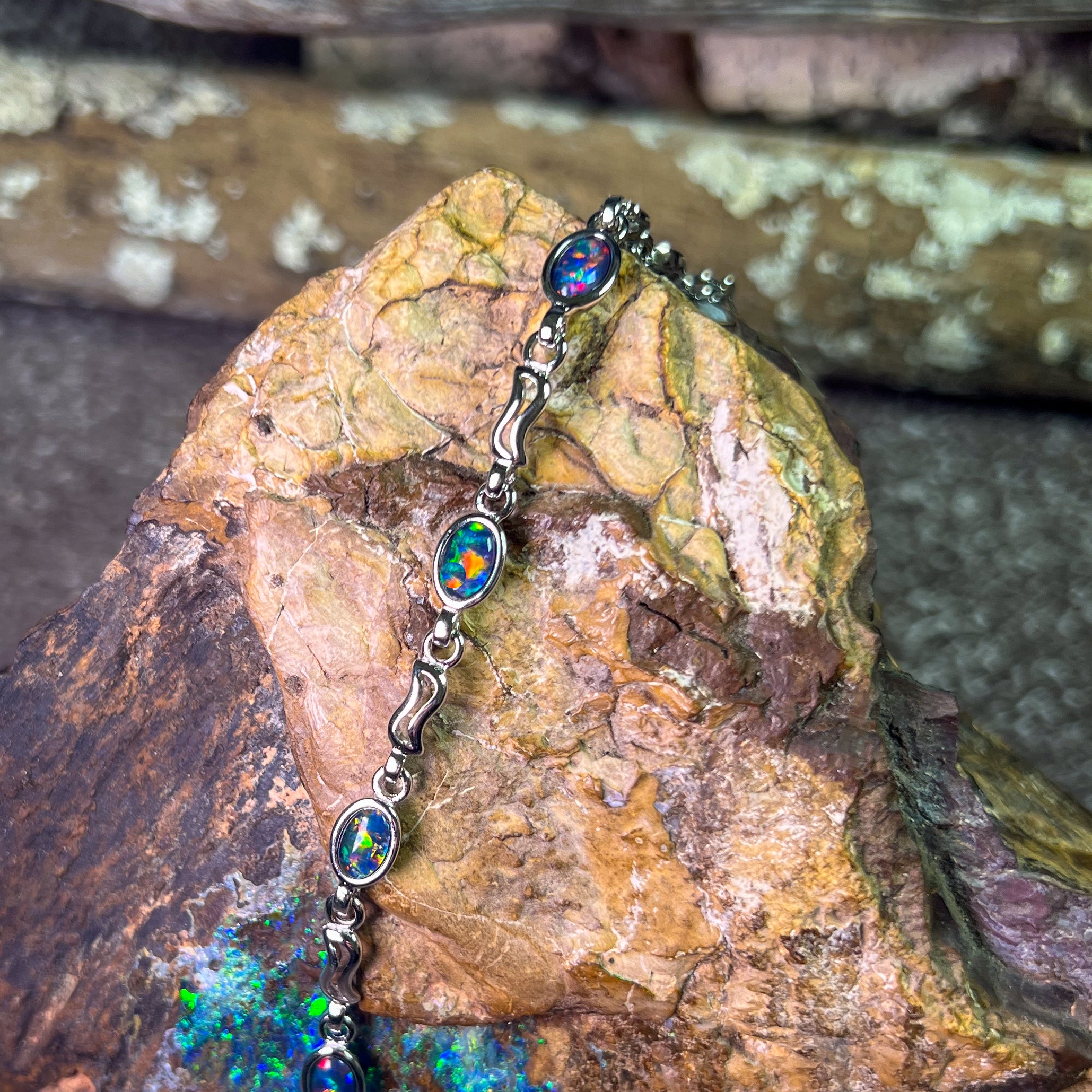 Sparkle and shine with our Sterling Silver Opal triplet bracelet. Featuring a stunning 6x4mm Opal triplet in a range of mesmerizing hues, this bracelet is a must-have for any jewelry collection. Elevate any look with the multi-color rainbow effect of this beautiful gemstone. Let its beauty and iridescence captivate you and those around you!