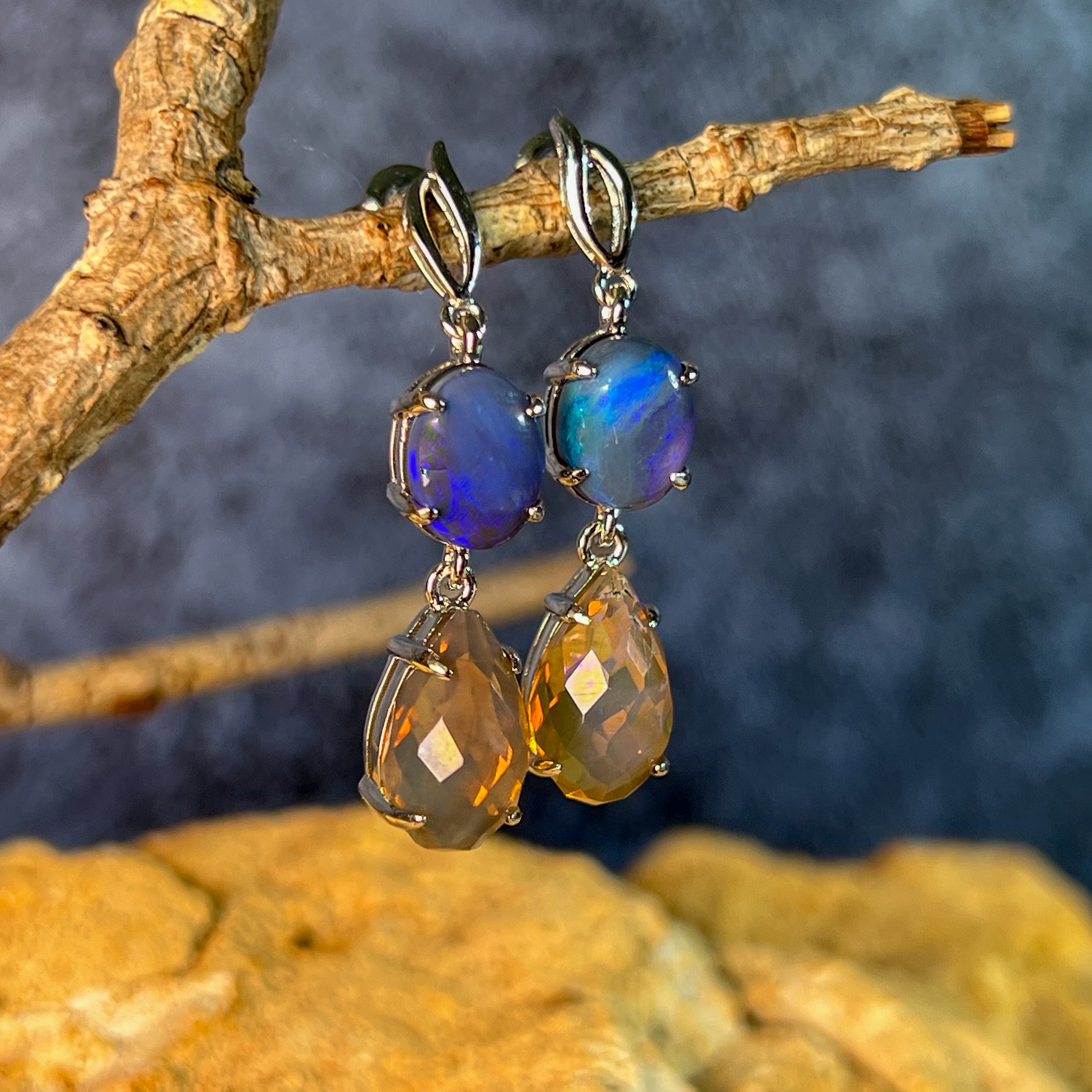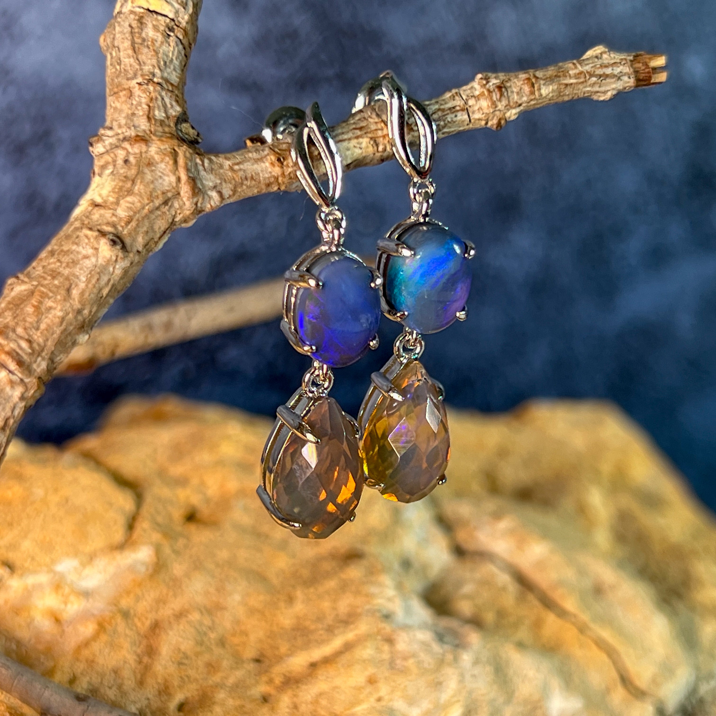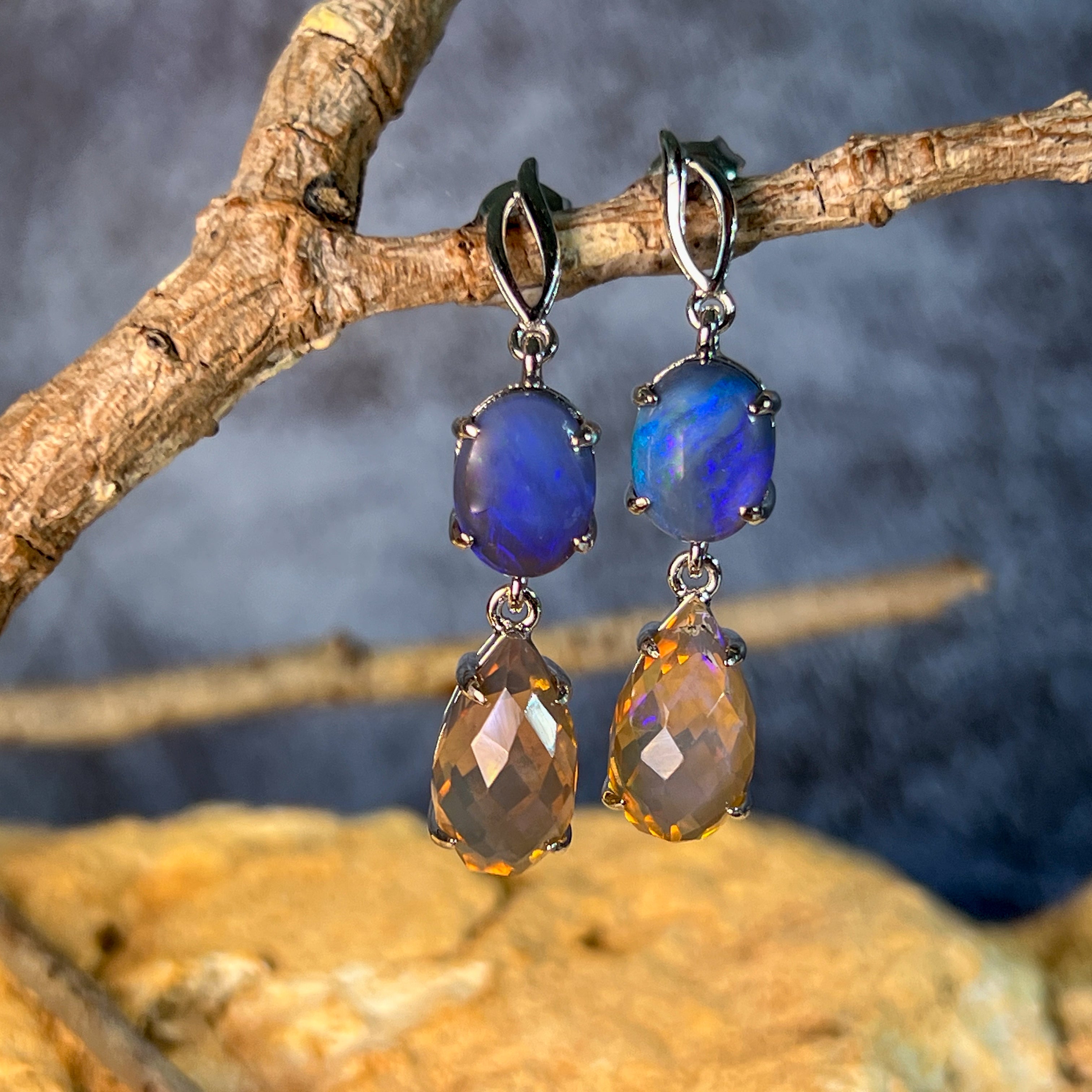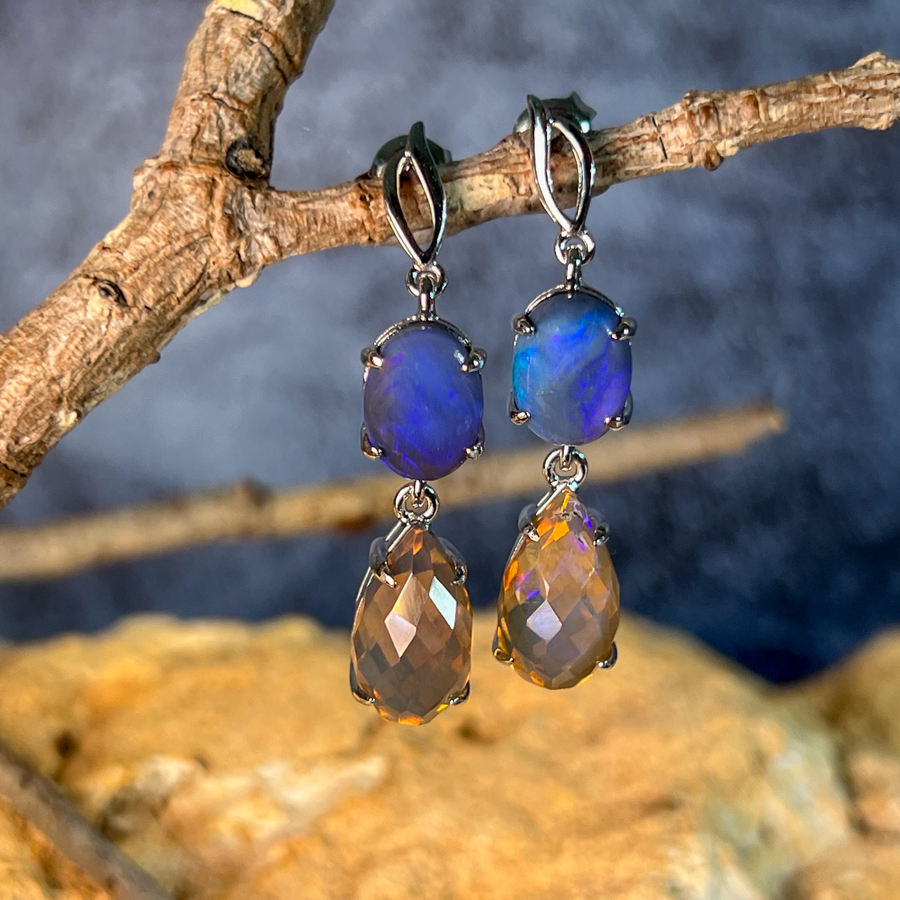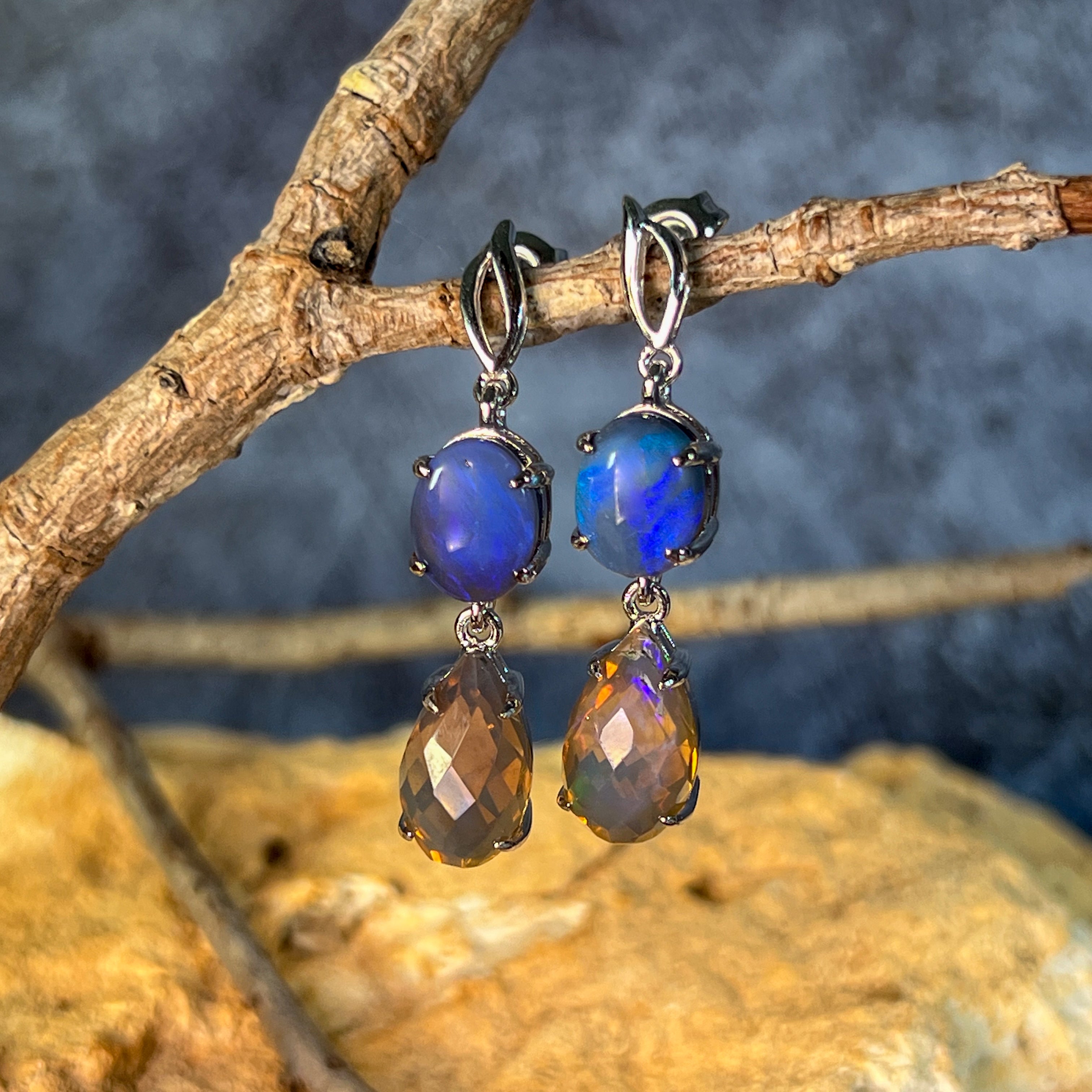 Sterling Silver Black Opal dangling earrings with Briolette cut Opal