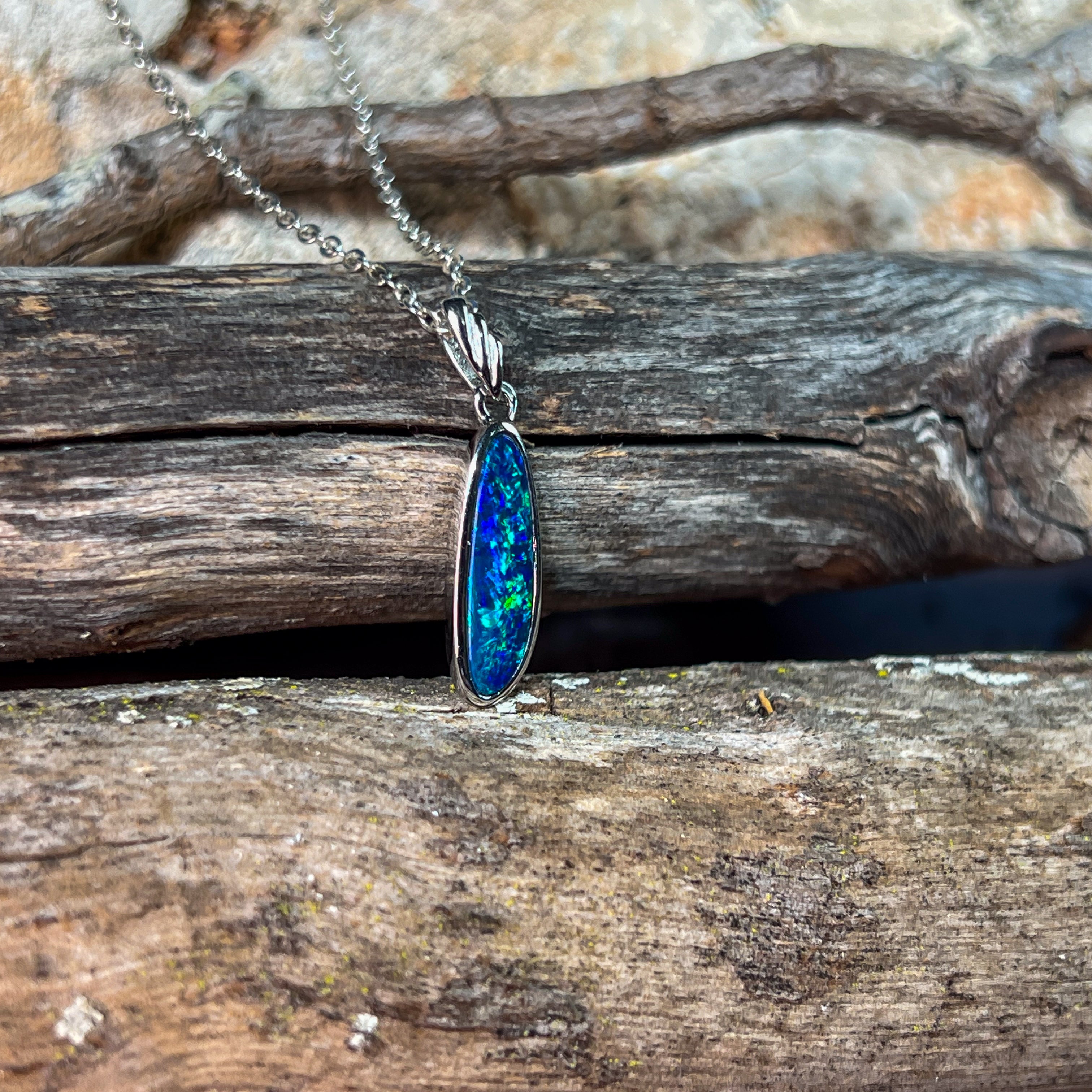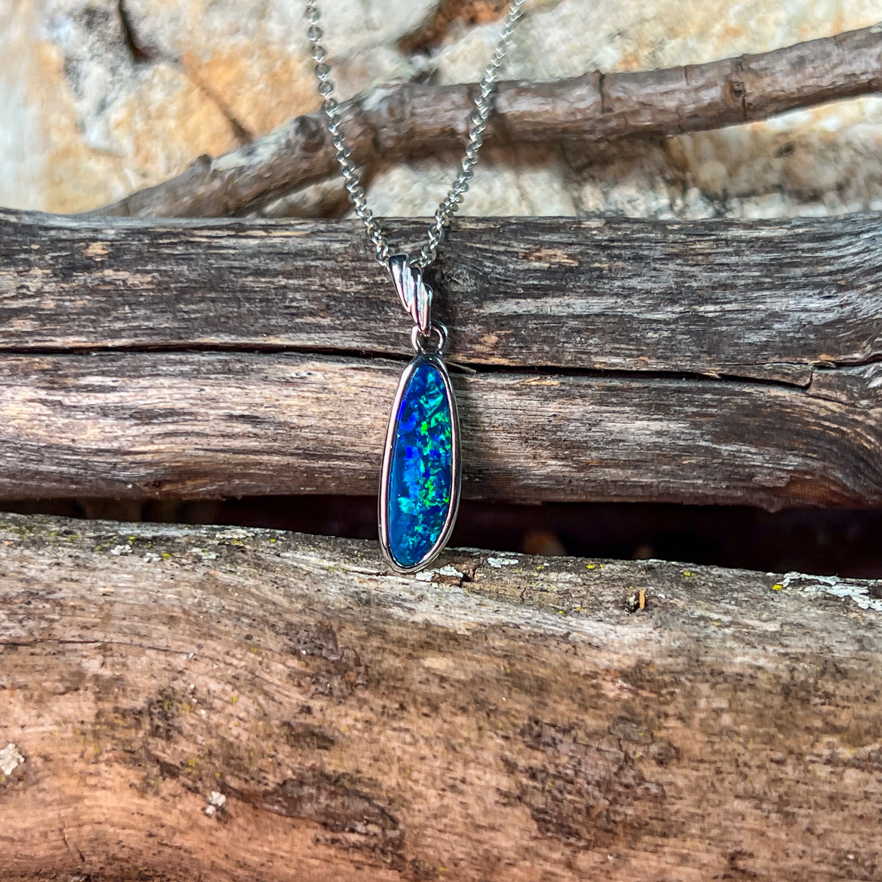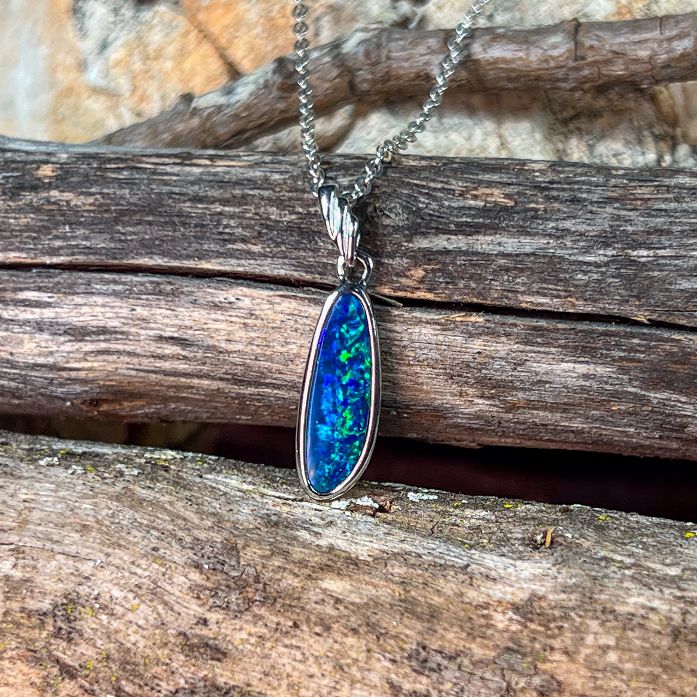 Discover the serene beauty of our Sterling Silver Blue Green Long Shape Opal Doublet Pendant. This elegant piece captures the mesmerizing ocean hues of premium opal, showcasing stunning blue and green tones that shift with every movement. Expertly crafted in lustrous sterling silver, the elongated design creates a sophisticated silhouette that flatters any neckline. Perfect for those seeking a statement piece that combines natural gemstone allure with timeless craftsmanship. An investment in wearable art that transforms any outfit into something extraordinary.