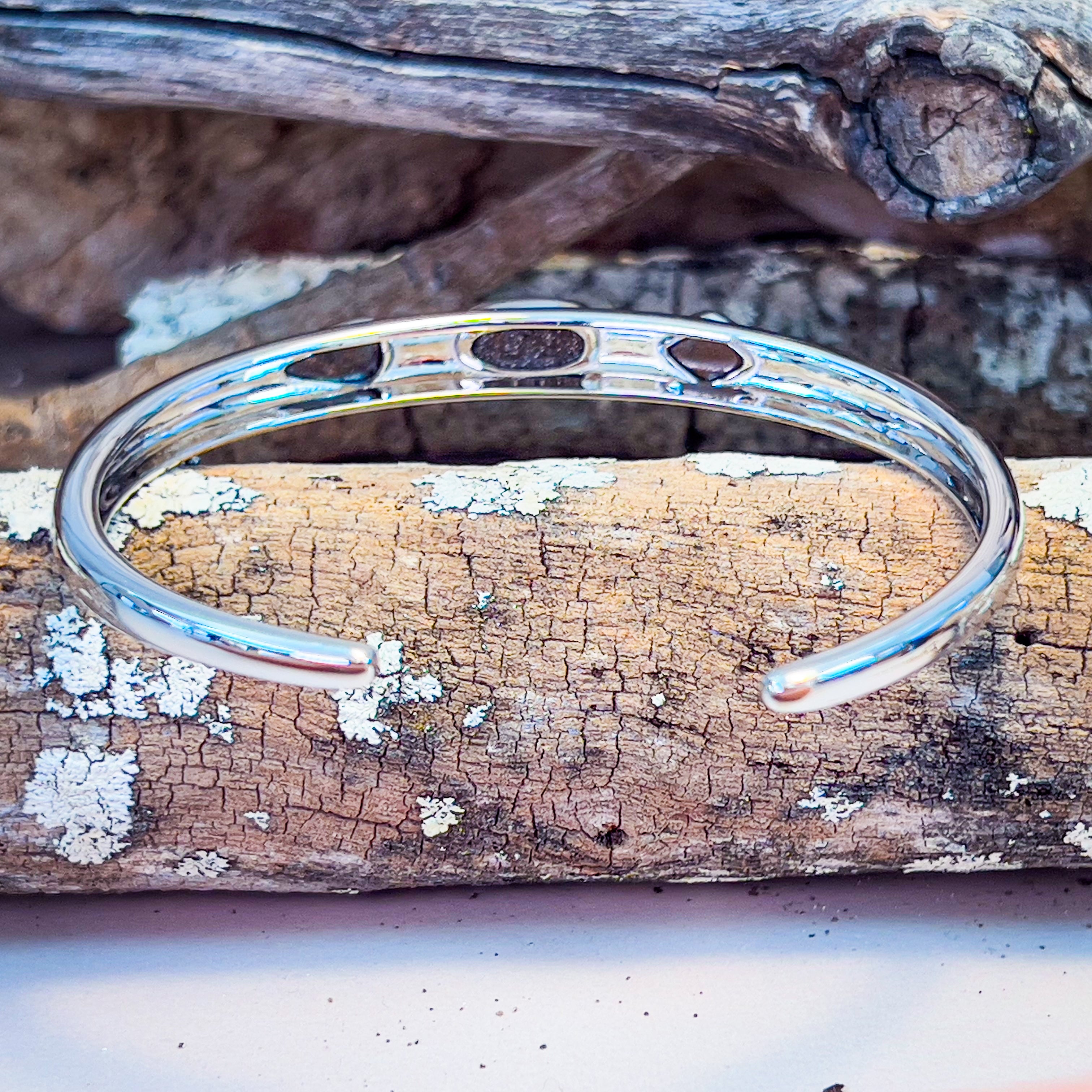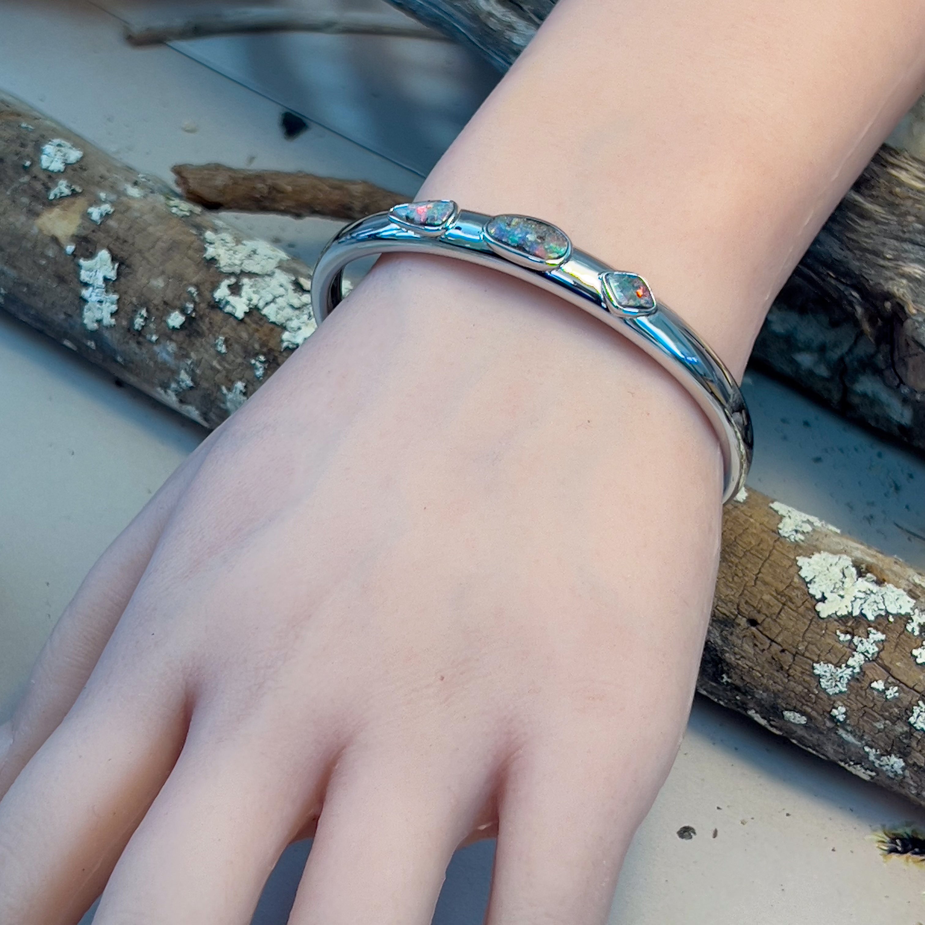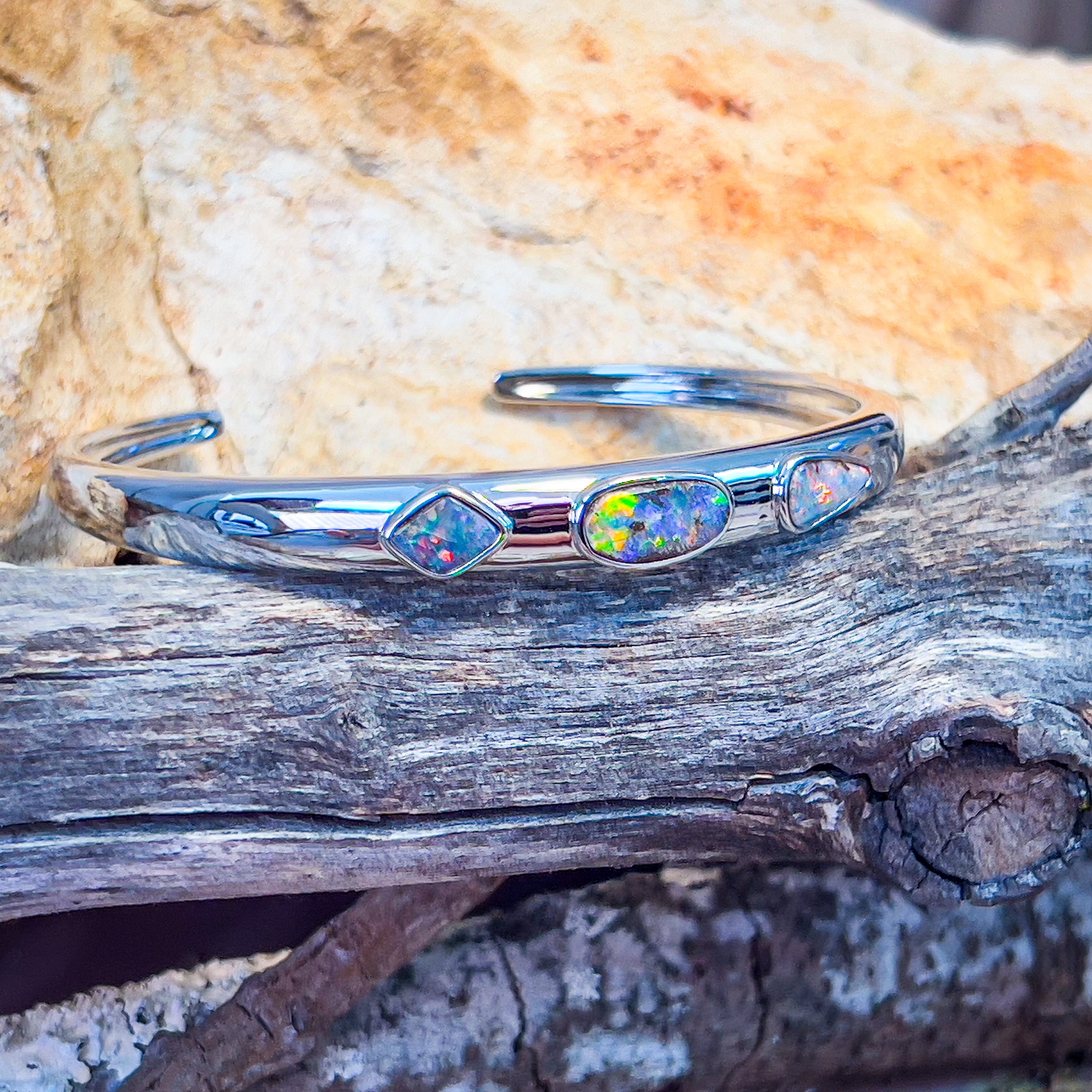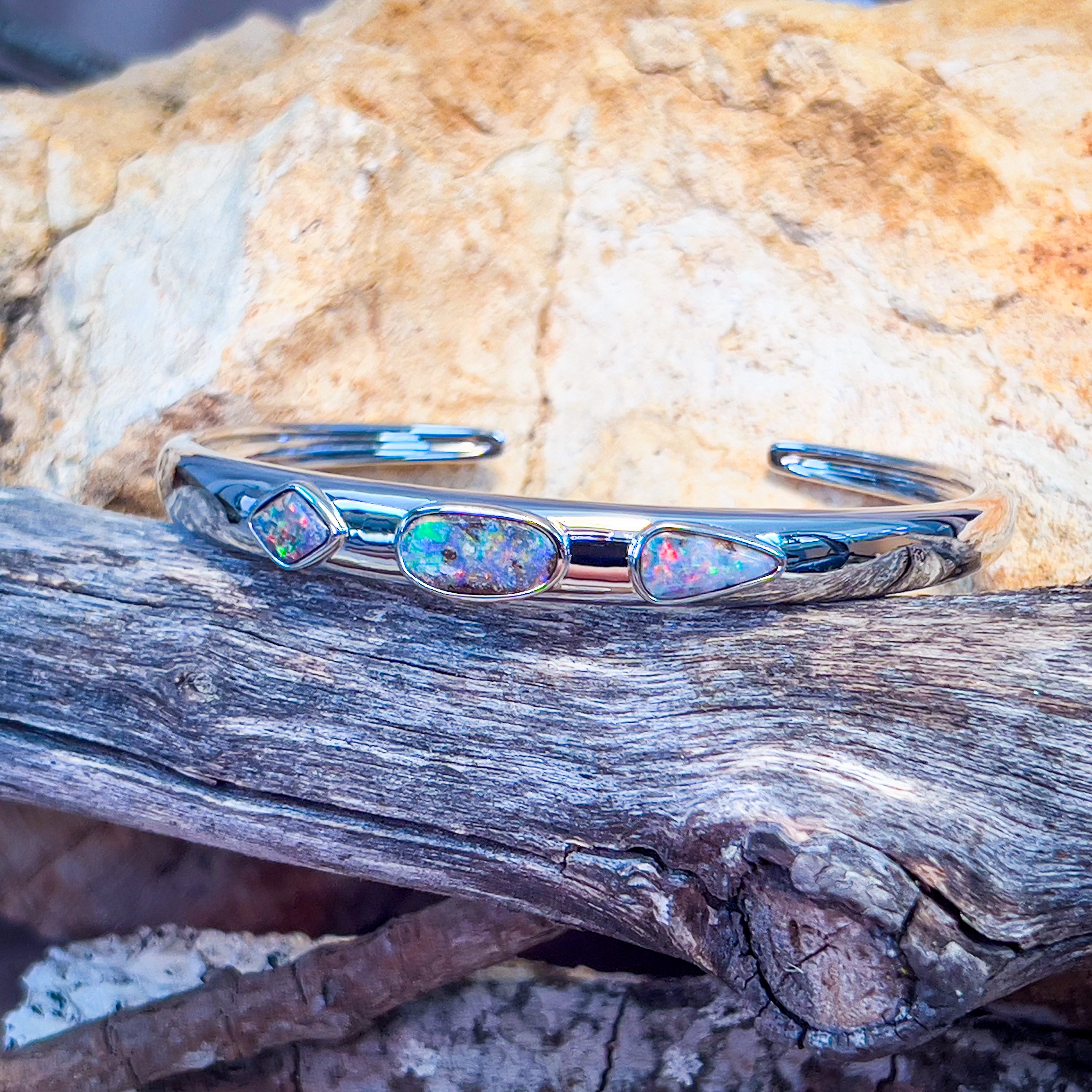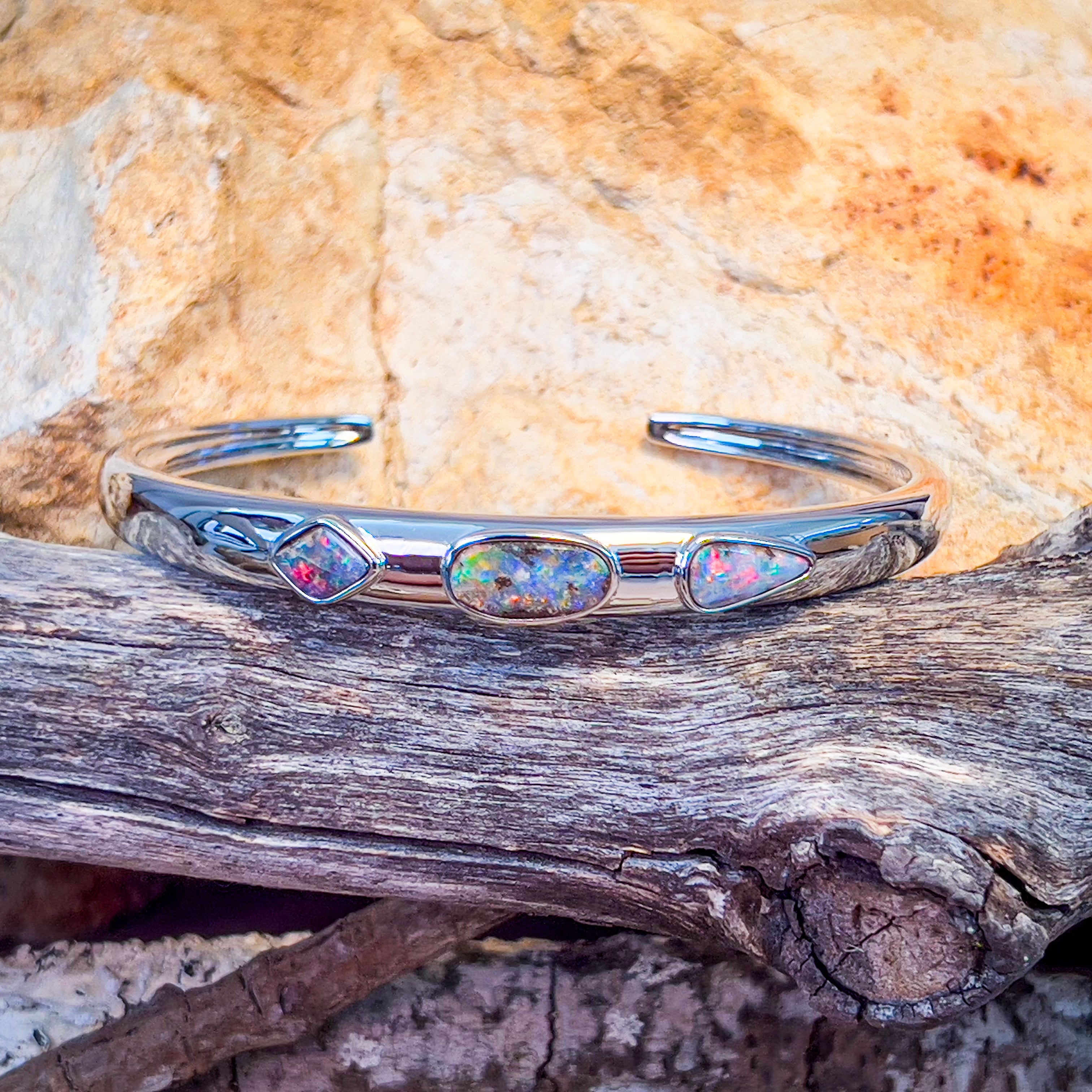 Indulge in a luxurious piece with our stunning Sterling Silver Boulder Opal 3 stone bangle. Handcrafted with exquisite Queensland Boulder opal, this bangle is the perfect gift for her. Elevate any outfit with its vibrant colors and unique design. Treat yourself or a loved one to a one-of-a-kind accessory.