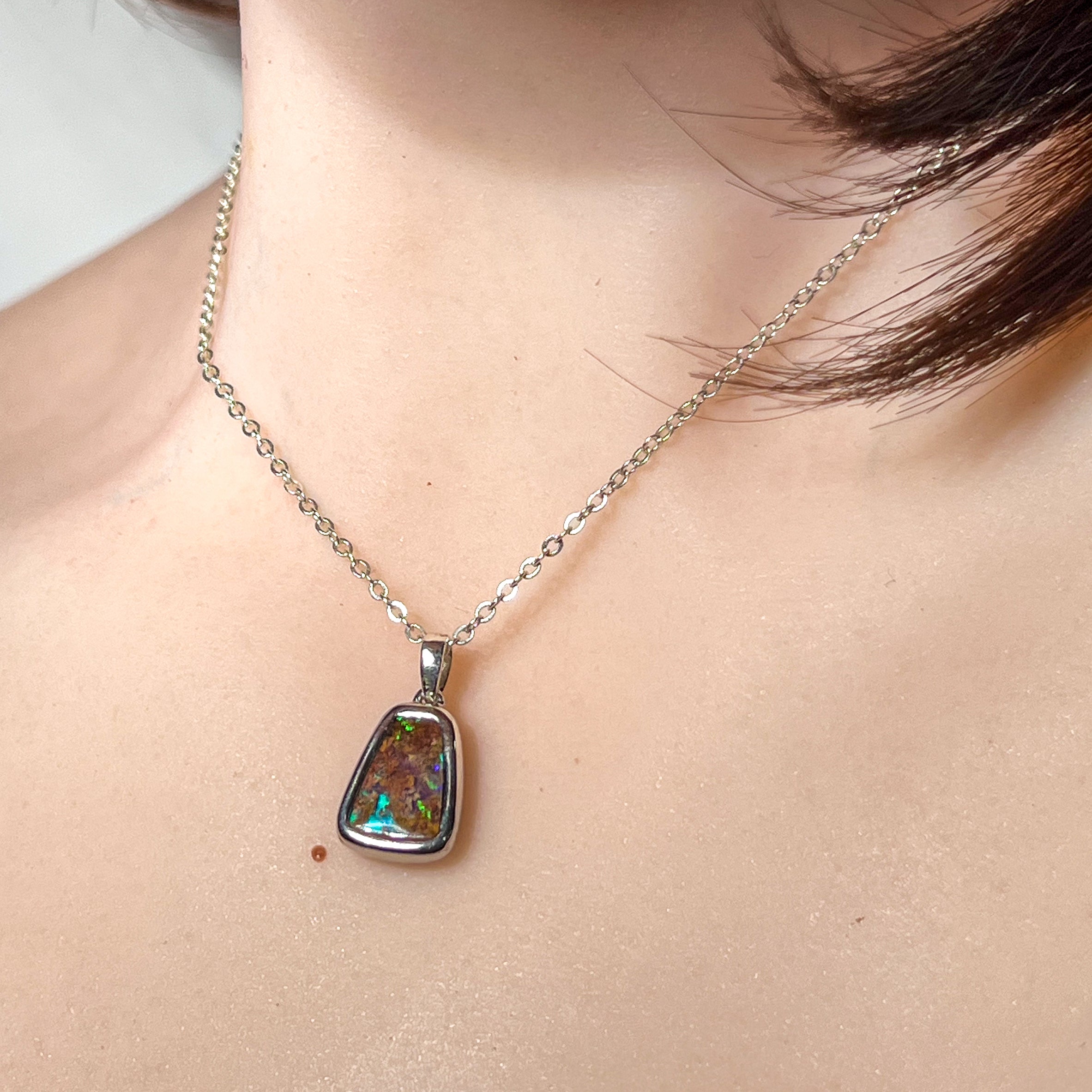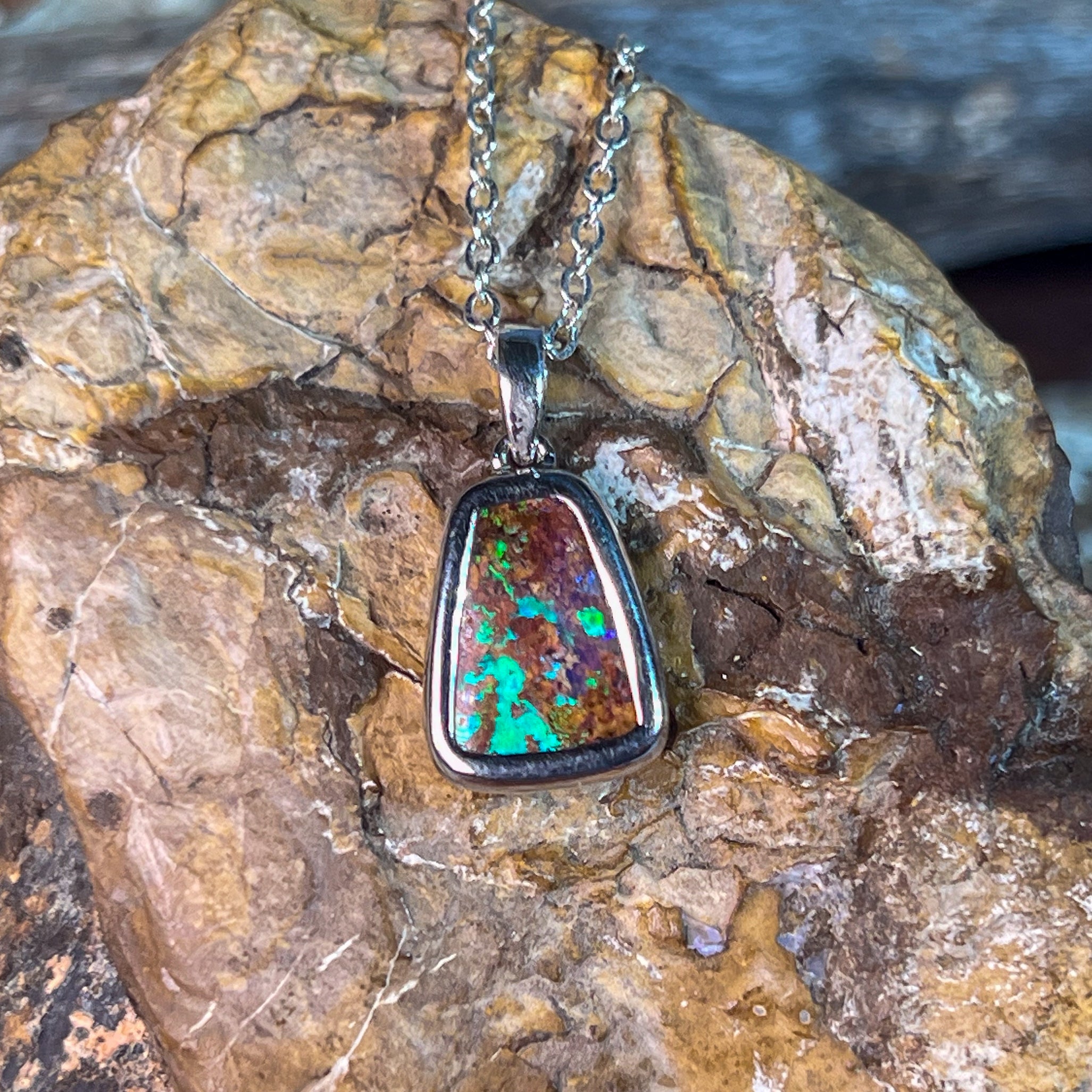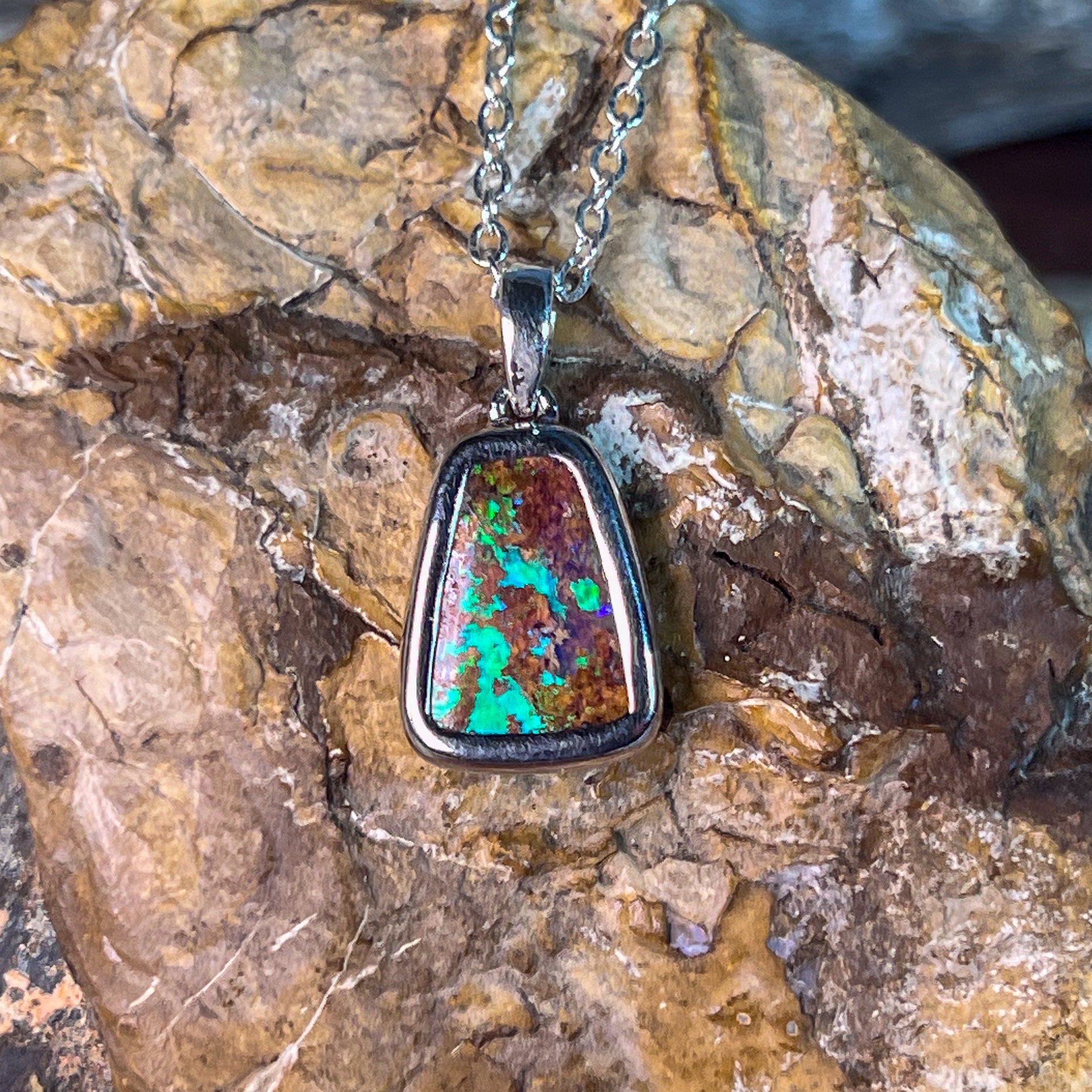 Experience the beauty of nature with our Sterling Silver Boulder Opal pendant in a striking trapezoid shape. Each piece features a one-of-a-kind matrix opal, making your necklace truly unique. Embrace the captivating colors and patterns of this stunning piece.