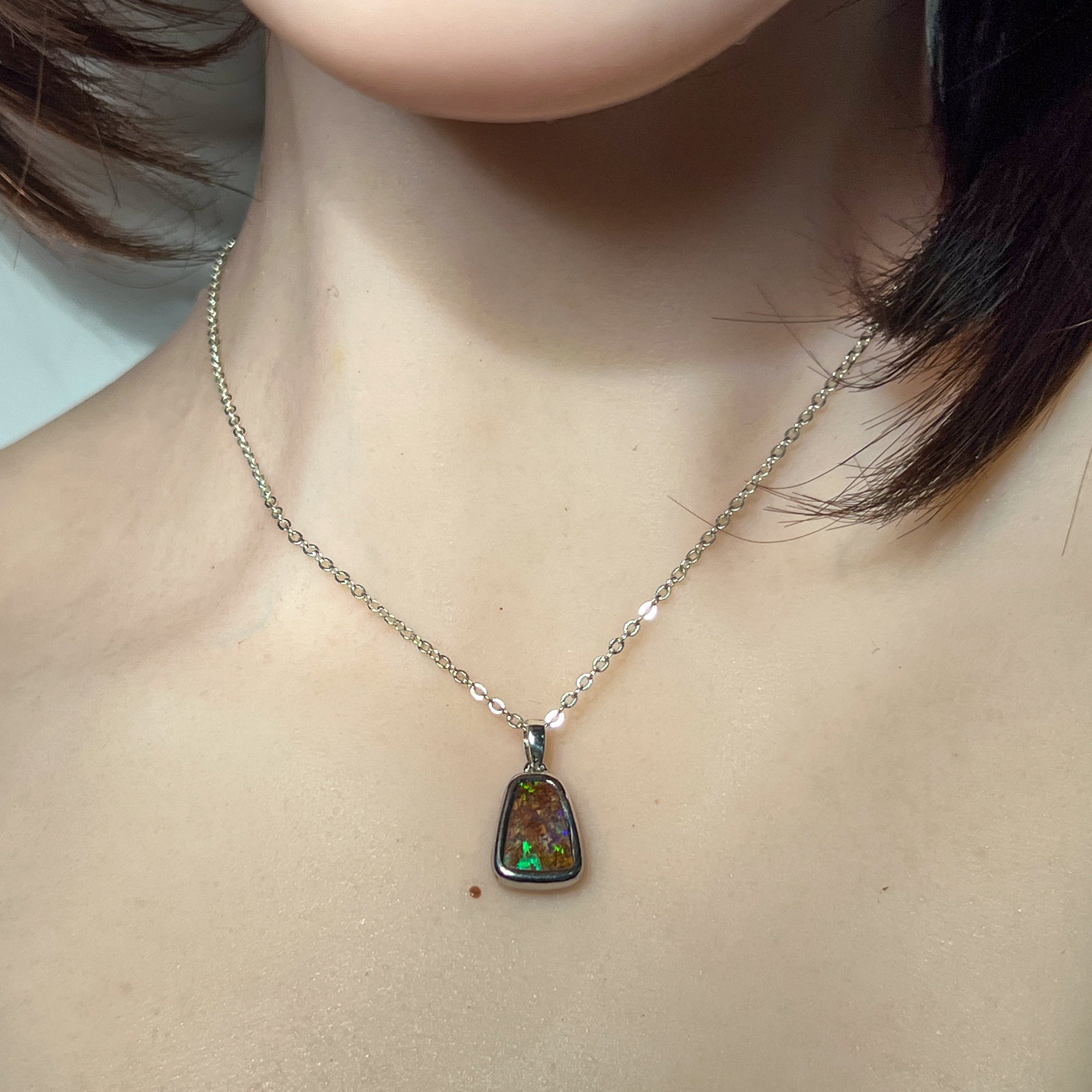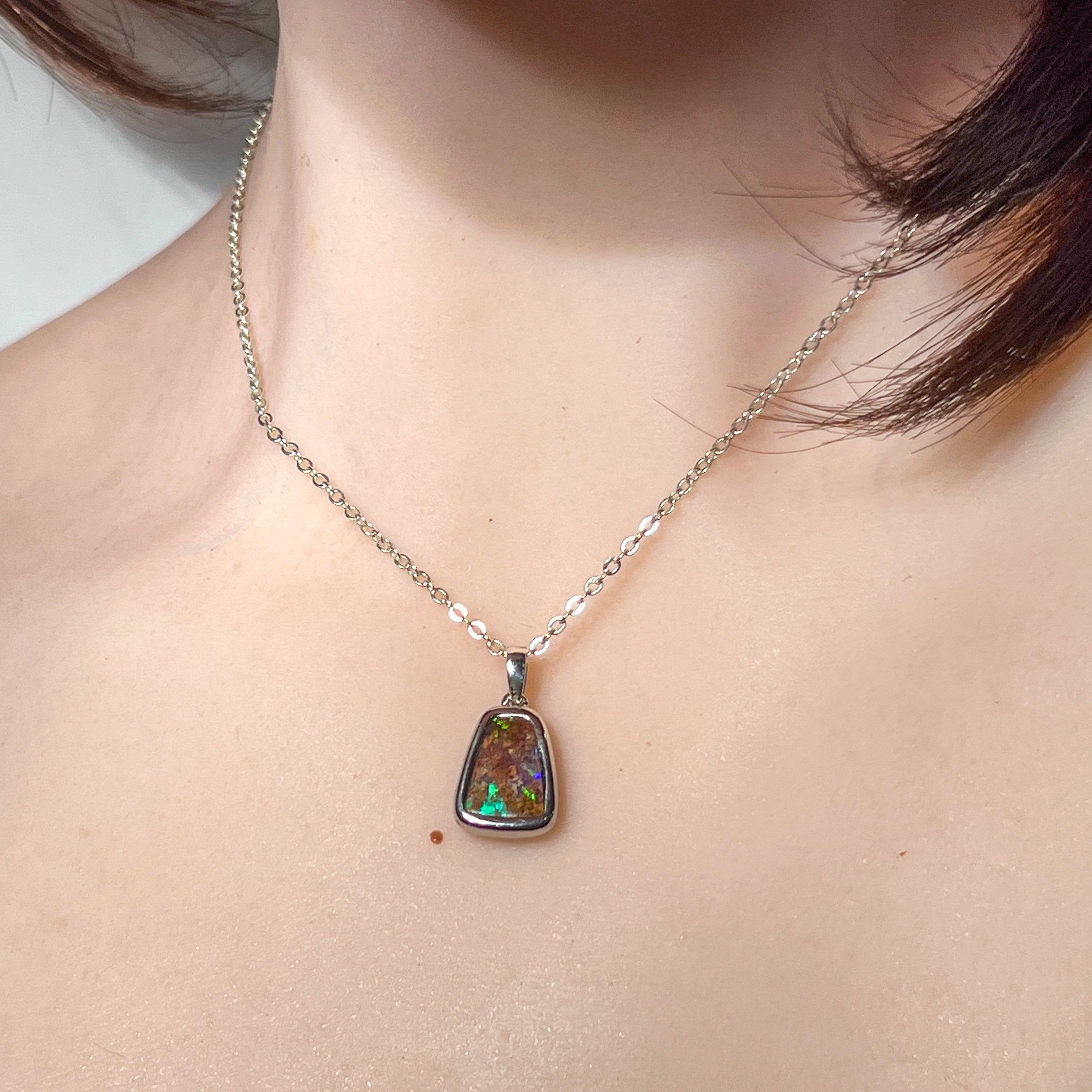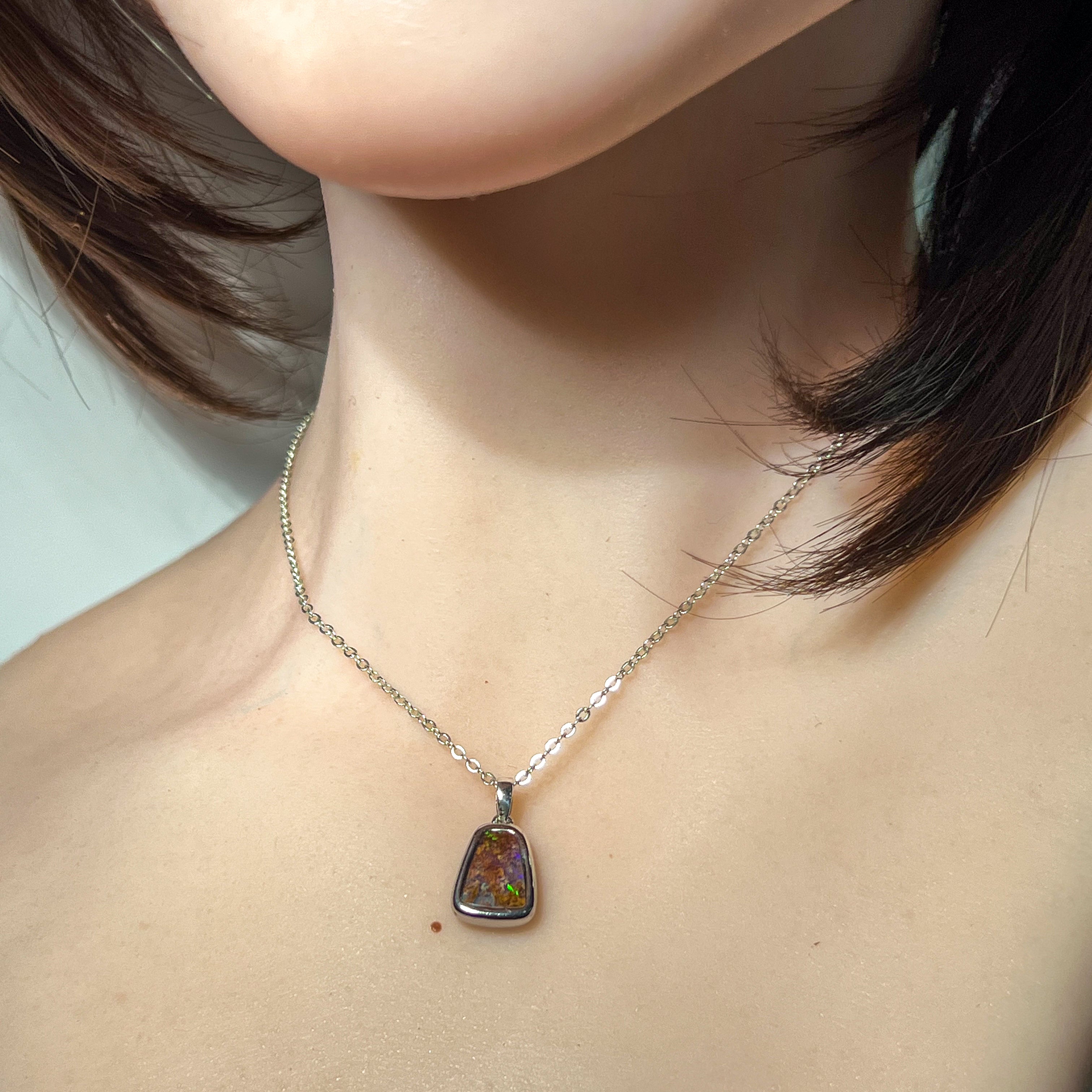 Experience the beauty of nature with our Sterling Silver Boulder Opal pendant in a striking trapezoid shape. Each piece features a one-of-a-kind matrix opal, making your necklace truly unique. Embrace the captivating colors and patterns of this stunning piece.
