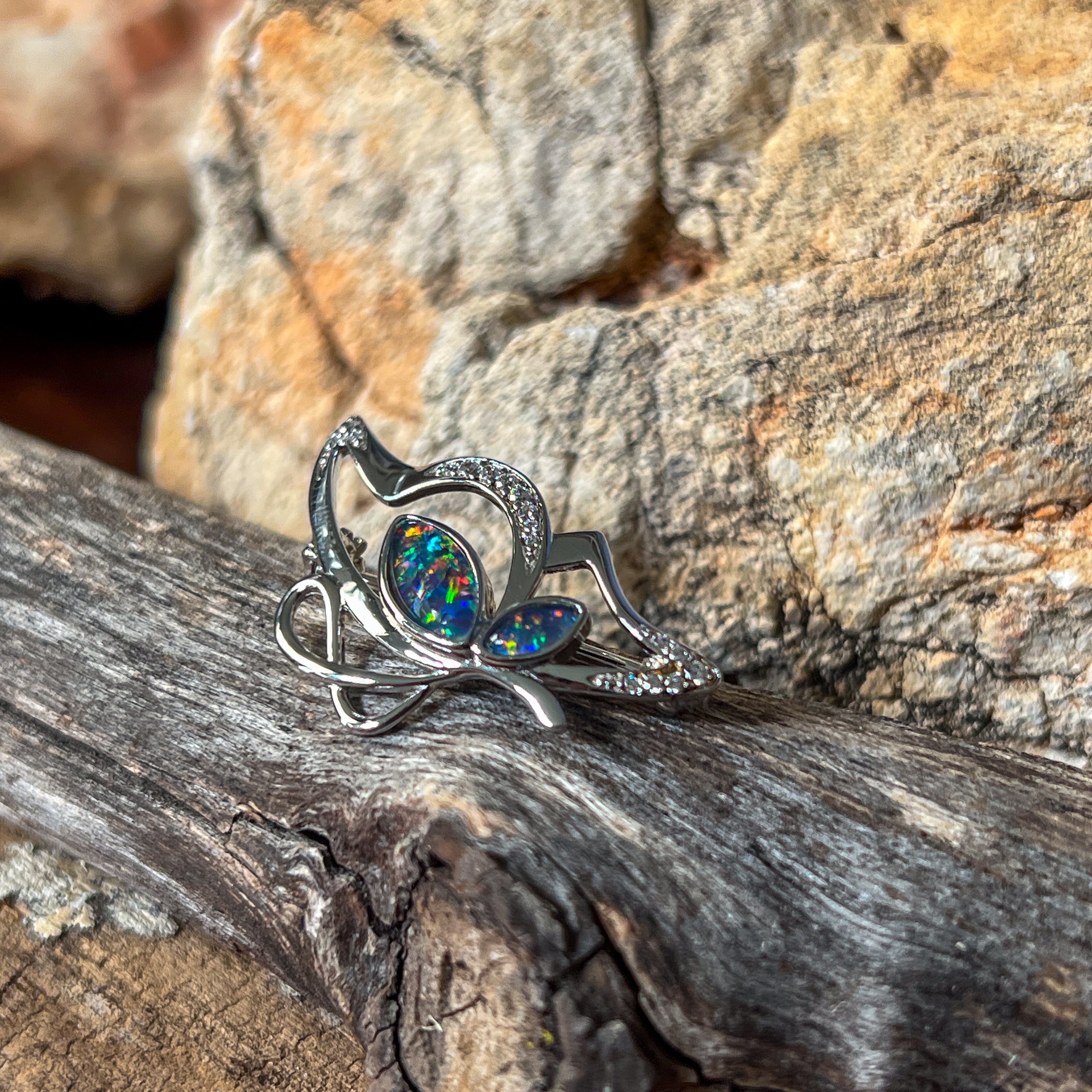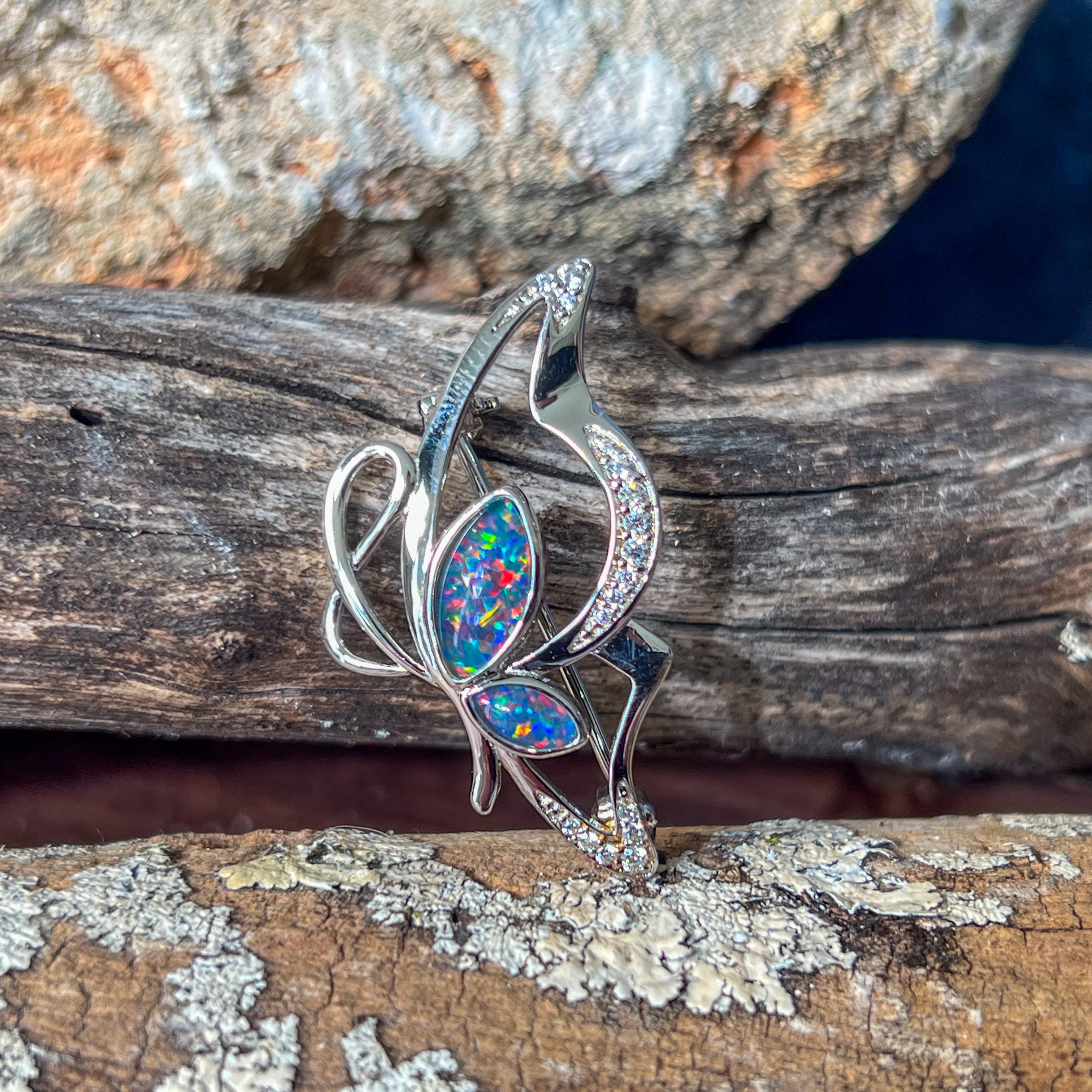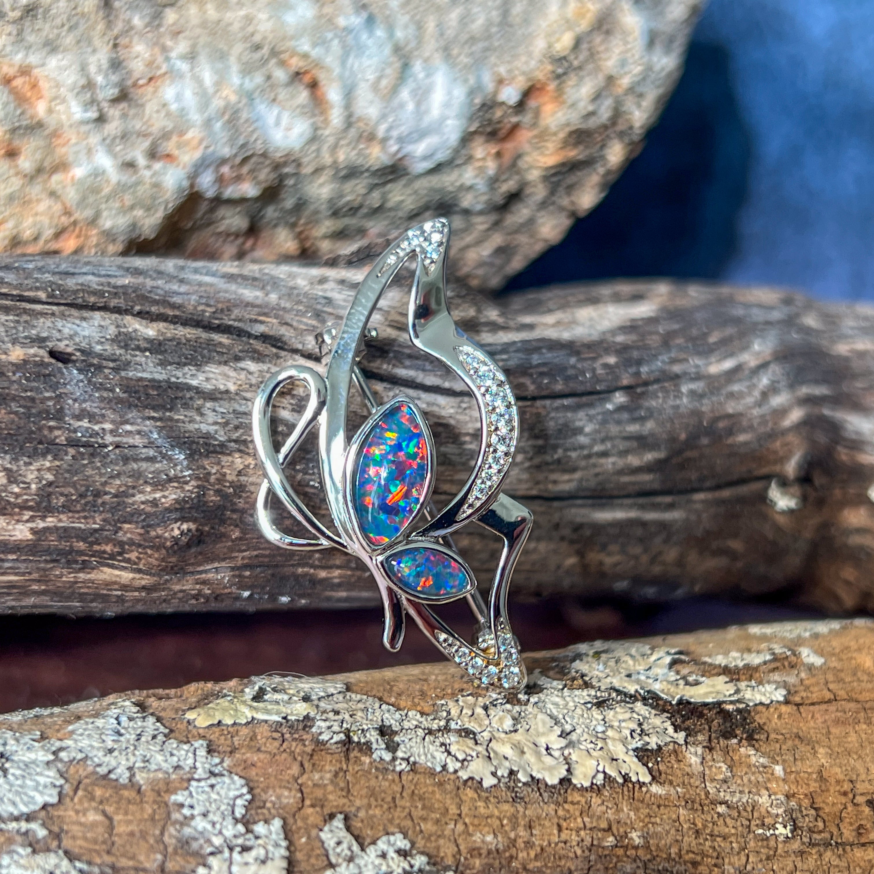 Elevate her elegance with this sterling silver butterfly brooch, featuring exquisite marquise-cut opal triplets. The delicate design captures the beauty of nature, while the vibrant opals add a touch of iridescent charm. Perfect as a thoughtful gift, this brooch complements any outfit with timeless sophistication.