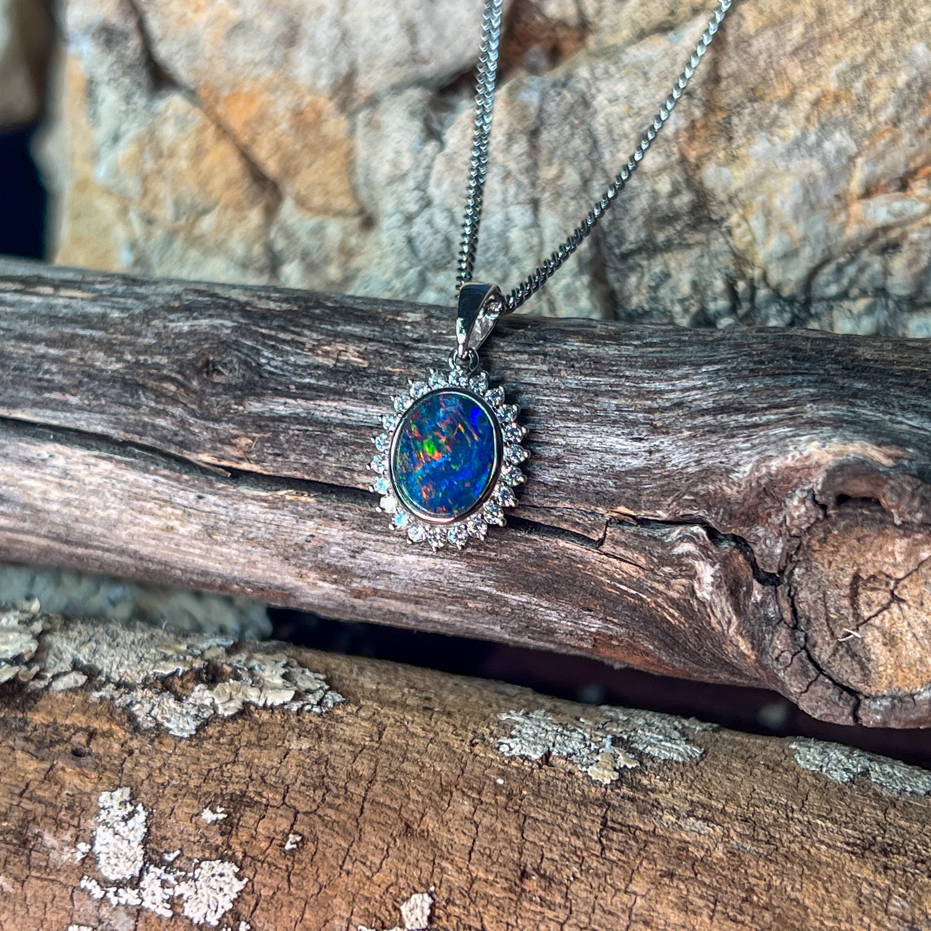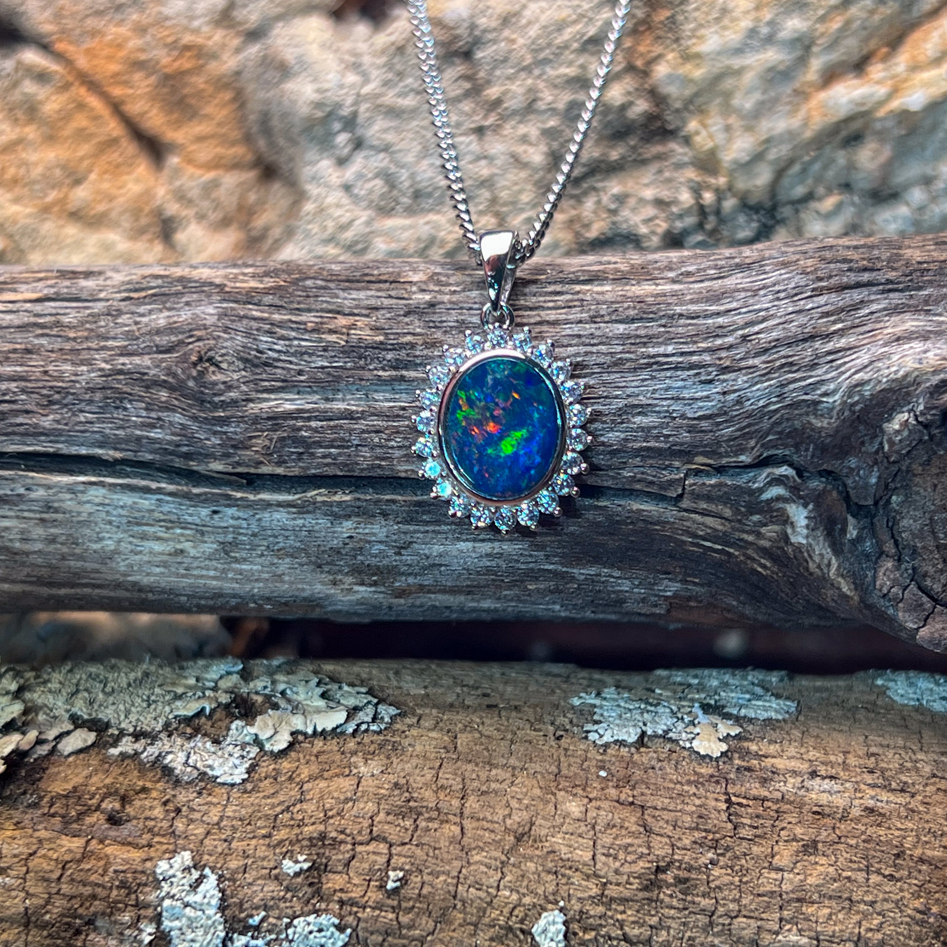 Elevate your elegance with this sterling silver pendant featuring a classic cluster design. The 9x7mm opal doublet showcases mesmerizing blue and red hues, capturing light with every movement. Perfectly crafted to add a refined touch to any ensemble, this pendant blends timeless