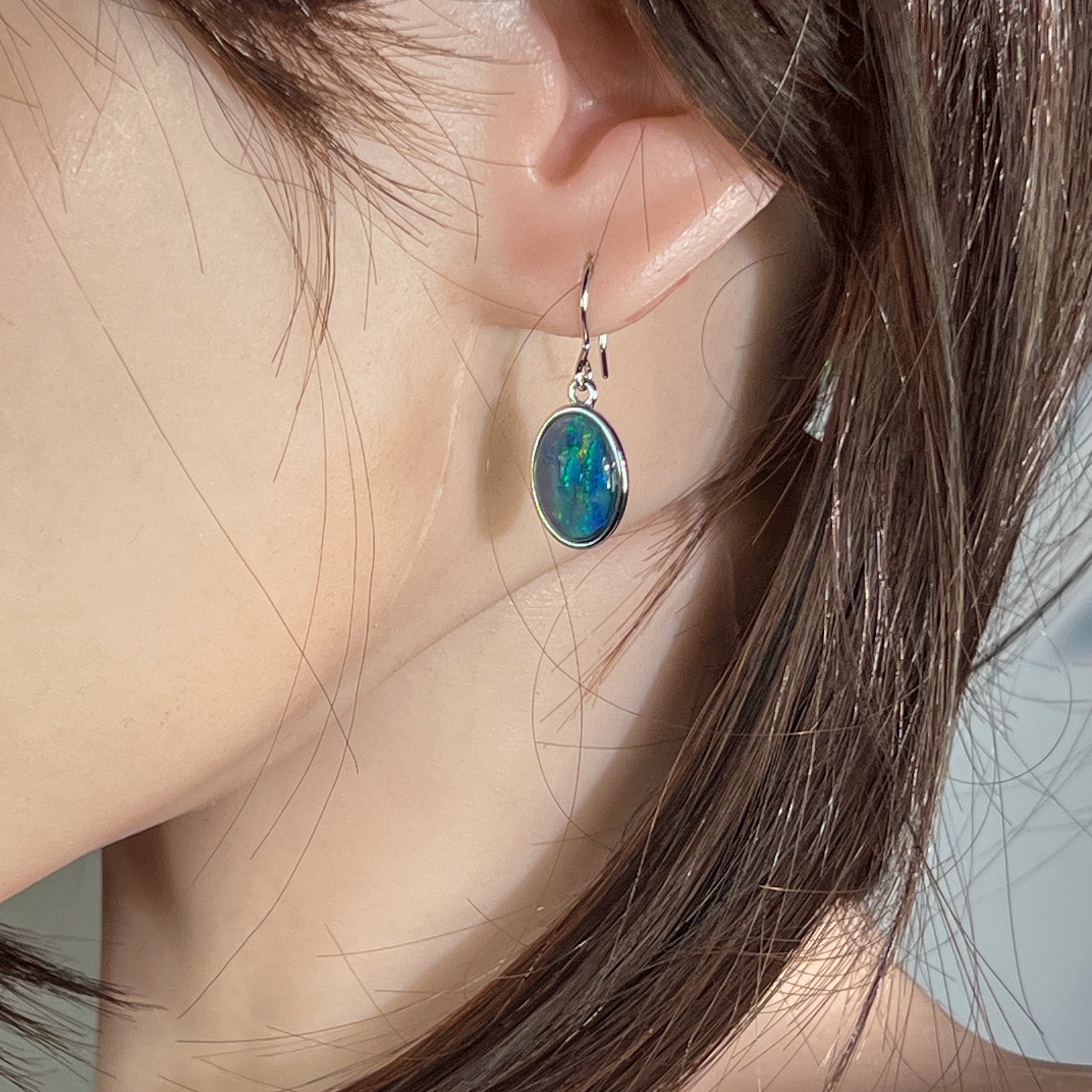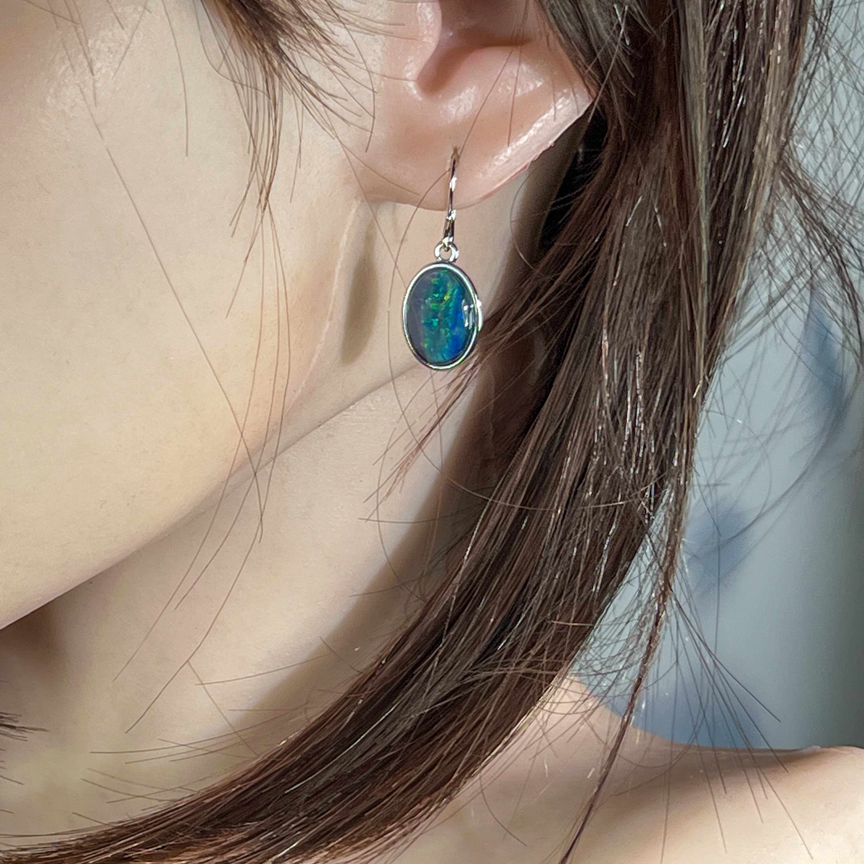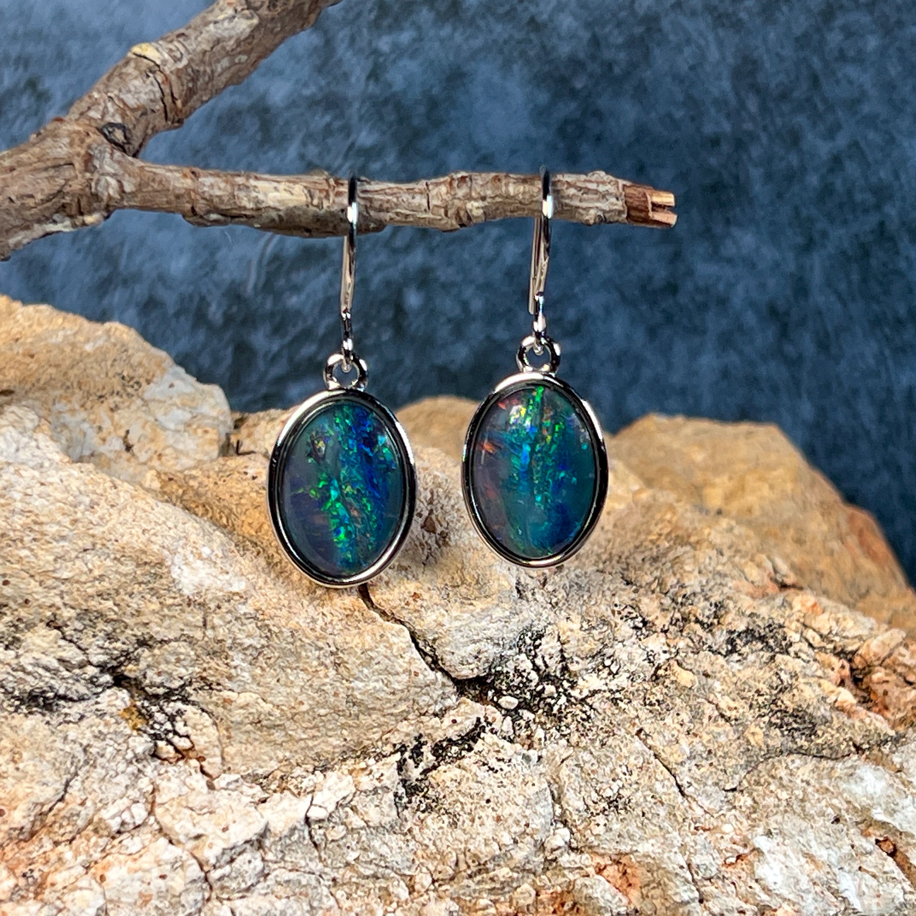 Catch light and movement with these captivating sterling silver dangle earrings, featuring stunning opal triplet ovals that shimmer with every turn of your head. The secure hook closures ensure they stay put while the graceful drop design flatters all face shapes. Perfect for adding a touch of elegance to everyday wear or special occasions, these earrings showcase the mesmerising play-of-colour that makes Australian opals so treasured. Lightweight yet eye-catching, they're the ideal choice for anyone seeking jewellery that combines beauty with wearability.