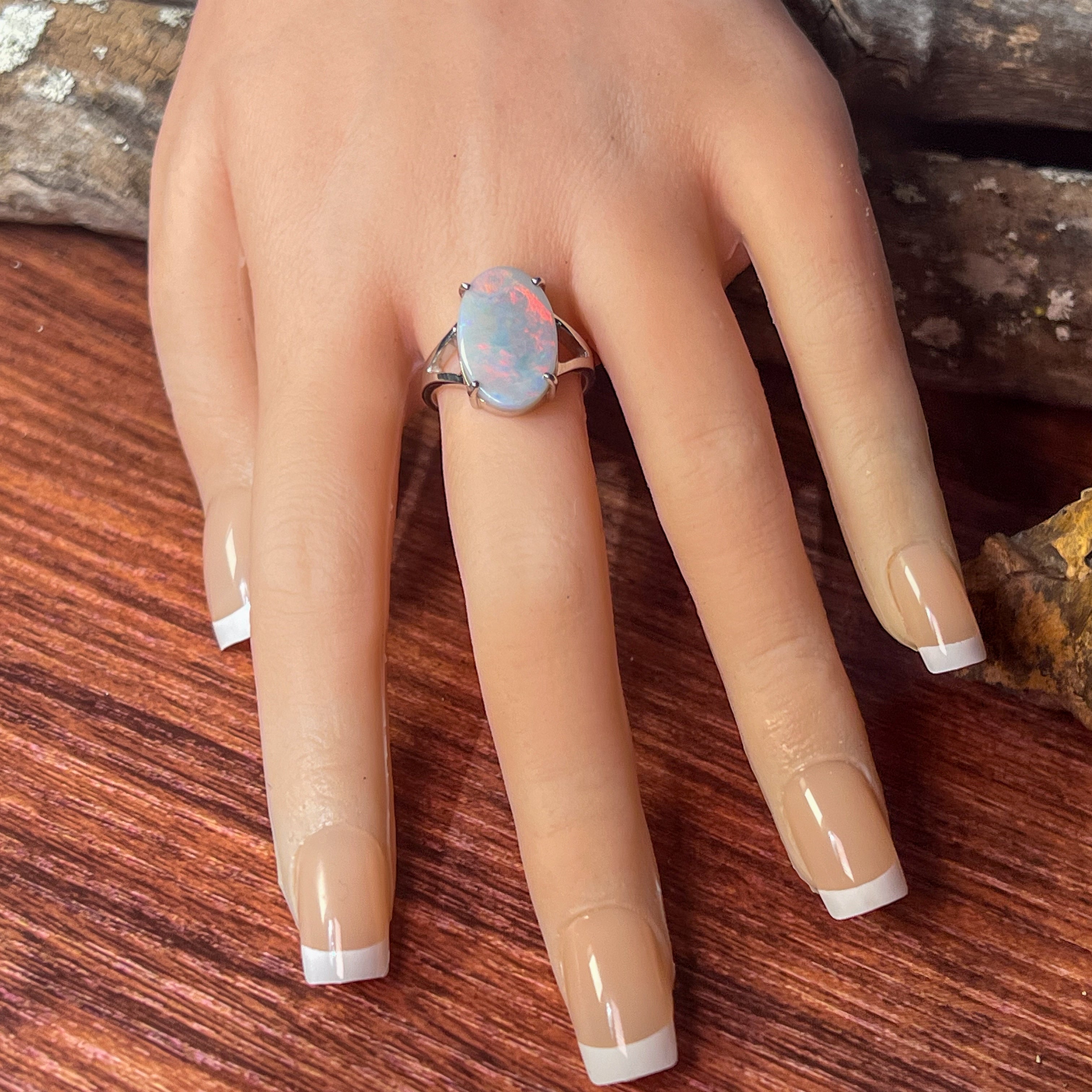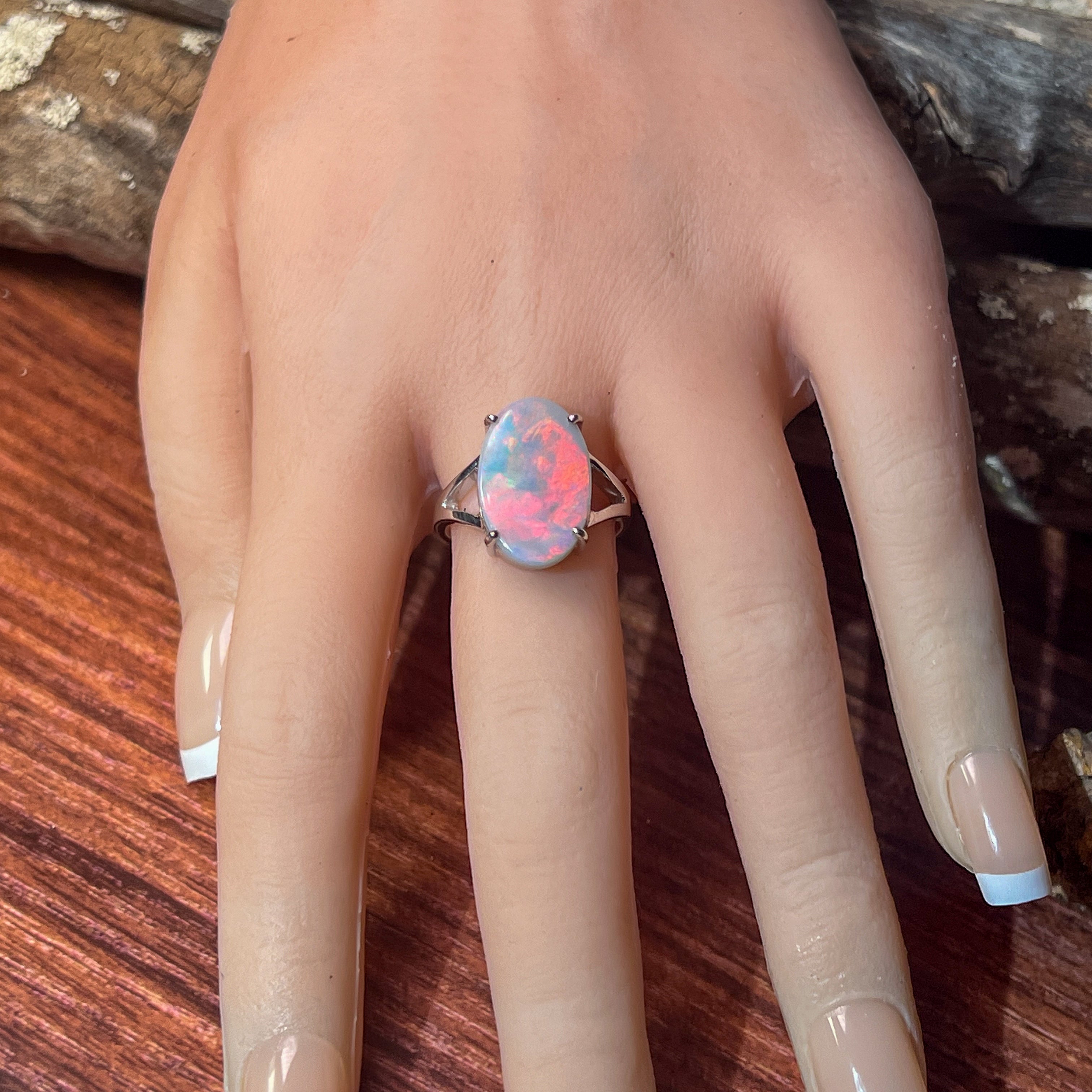 Make a striking impression with this large oval-shaped statement ring featuring a stunning 6.35ct dark opal set in sterling silver. The claw setting and split shank design enhance the opal’s deep, captivating colors, offering a unique blend of elegance and bold style. Perfect for elevating any look, this ring combines craftsmanship with eye-catching beauty.