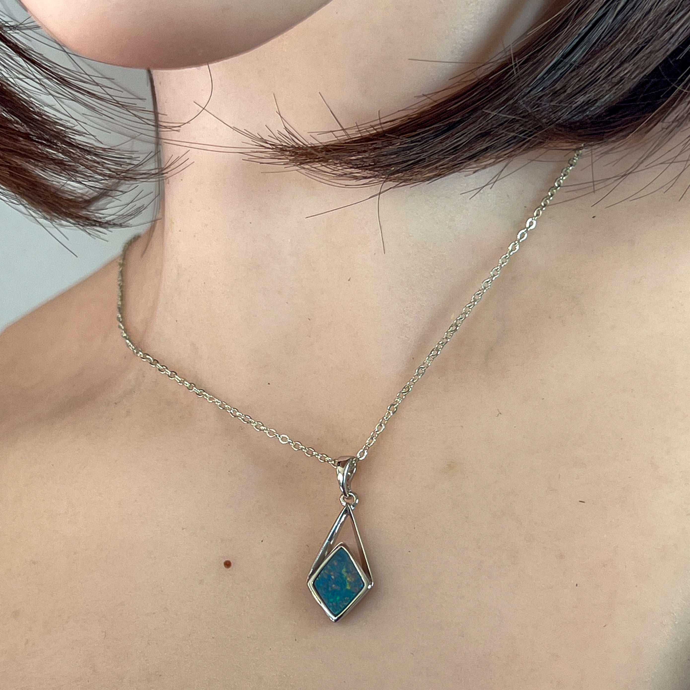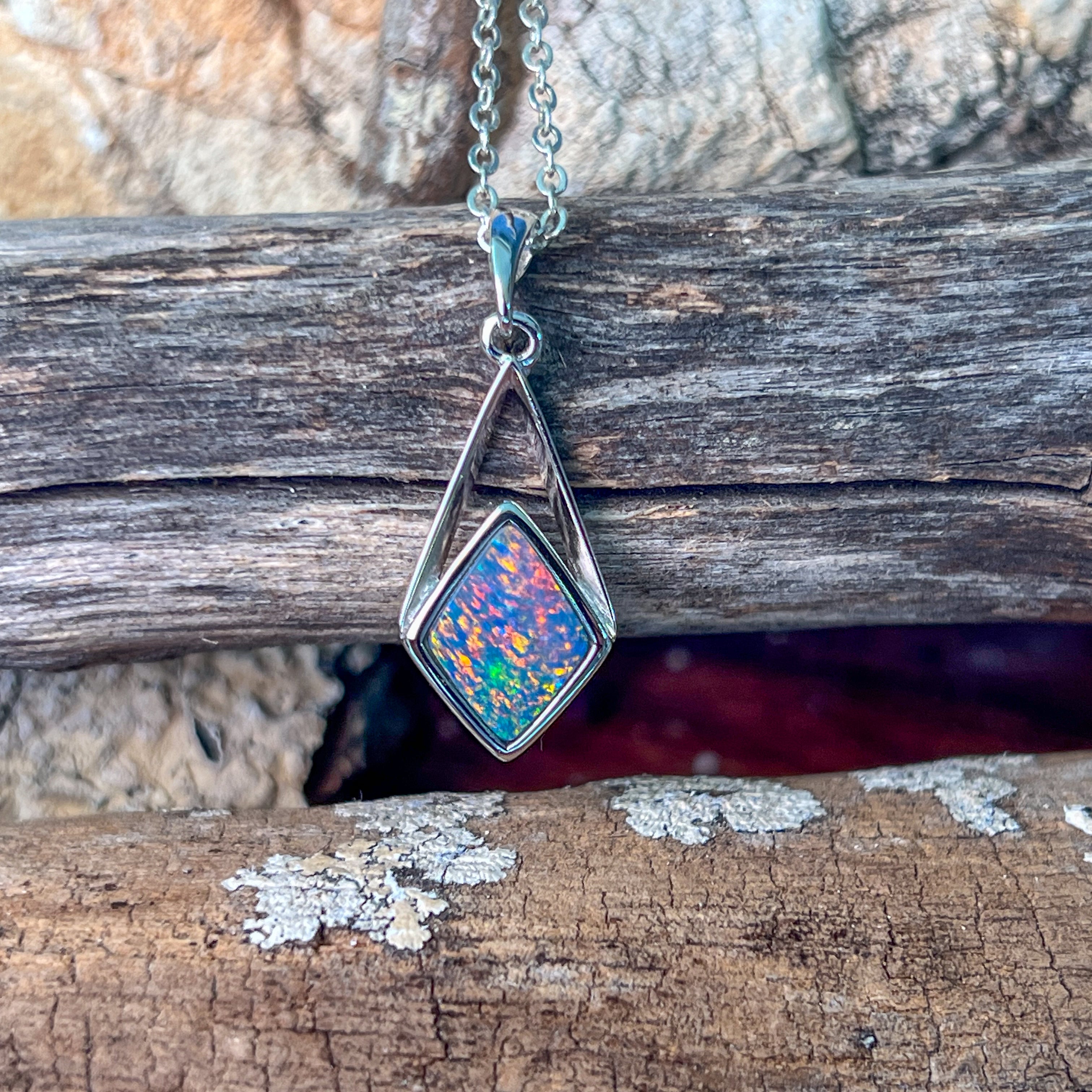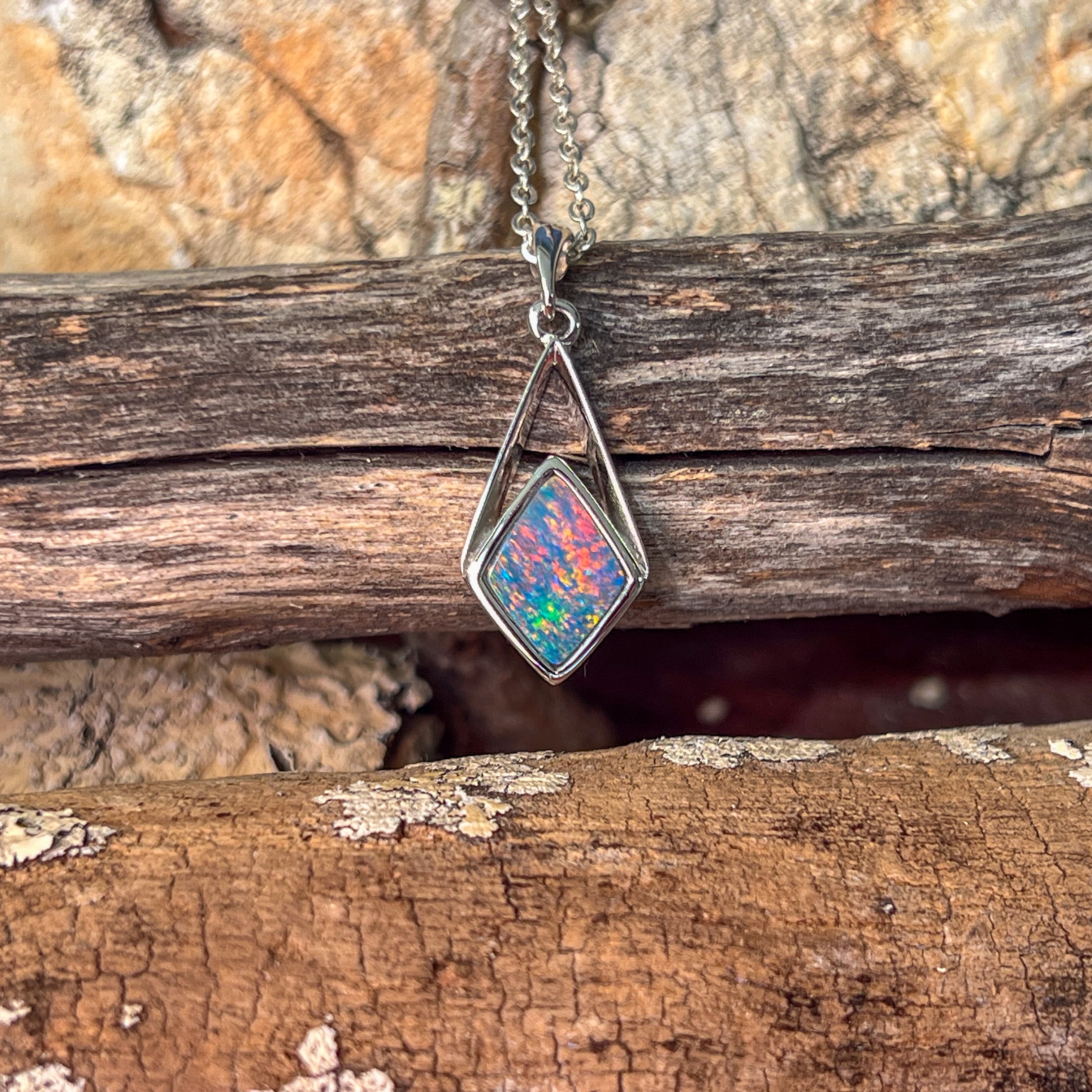 Add a touch of whimsy to your look with this sterling silver pendant featuring a dazzling diamond-shaped opal doublet. Its playful sparkle catches the light beautifully, making it the perfect accessory to brighten any outfit and spark conversations wherever you go.