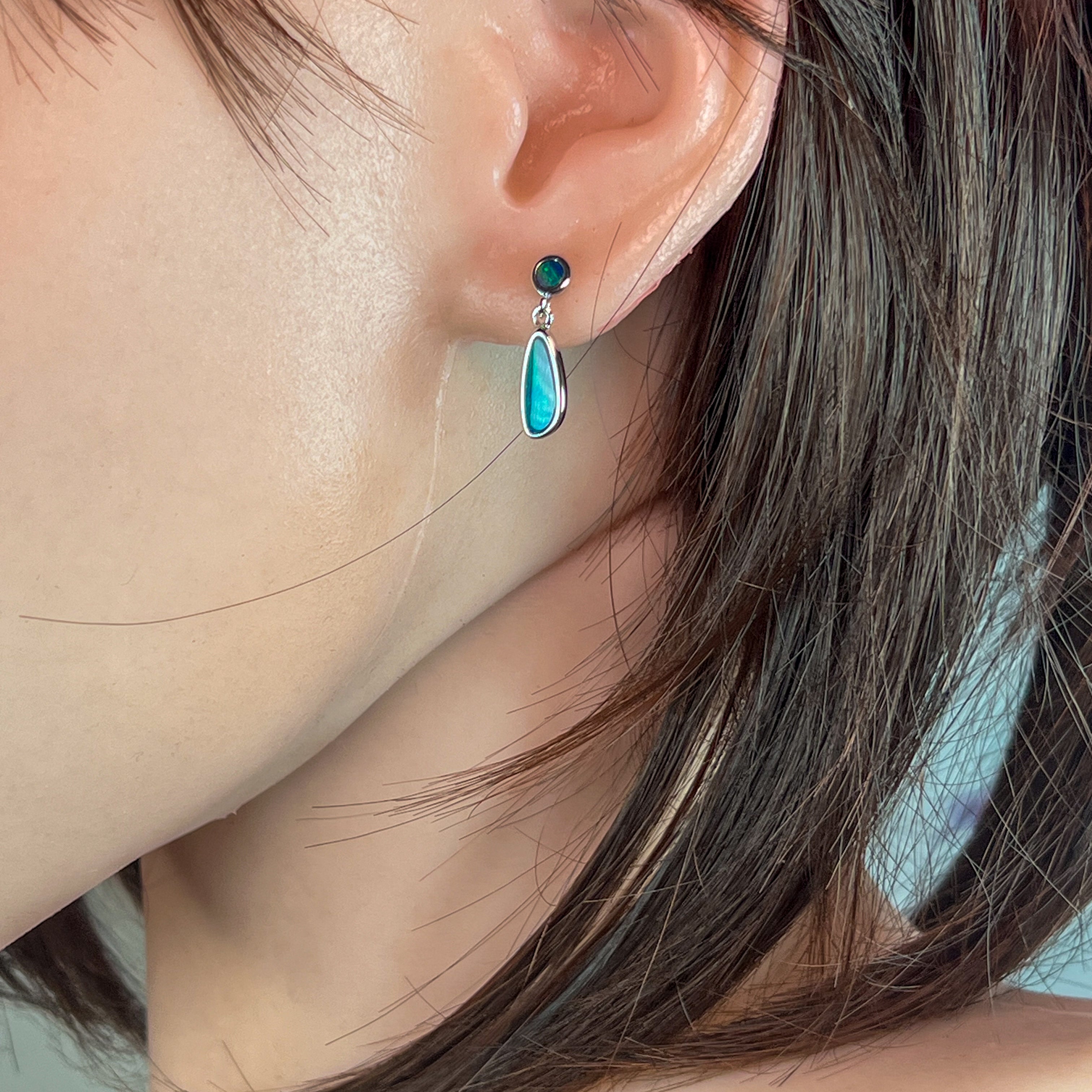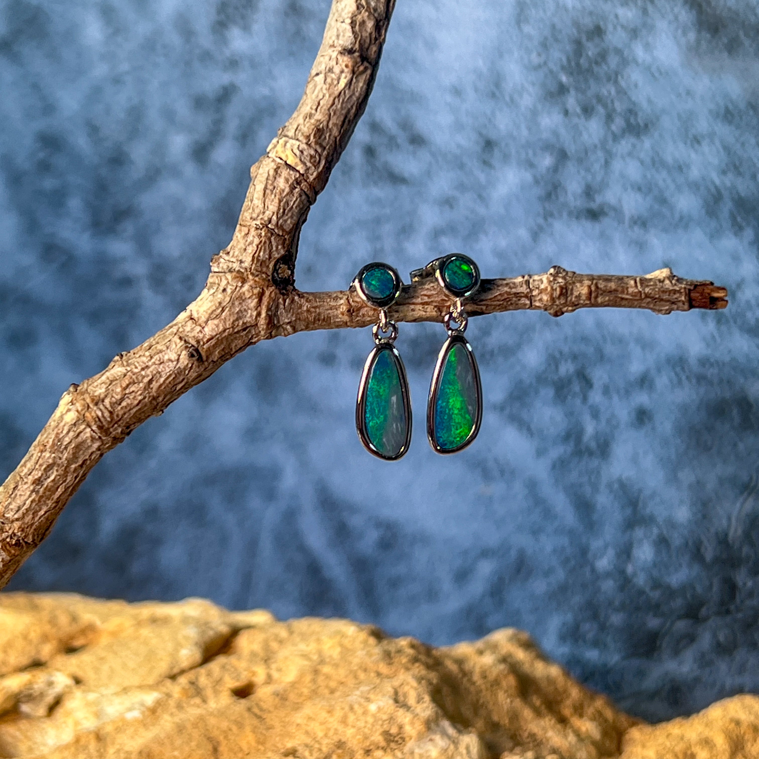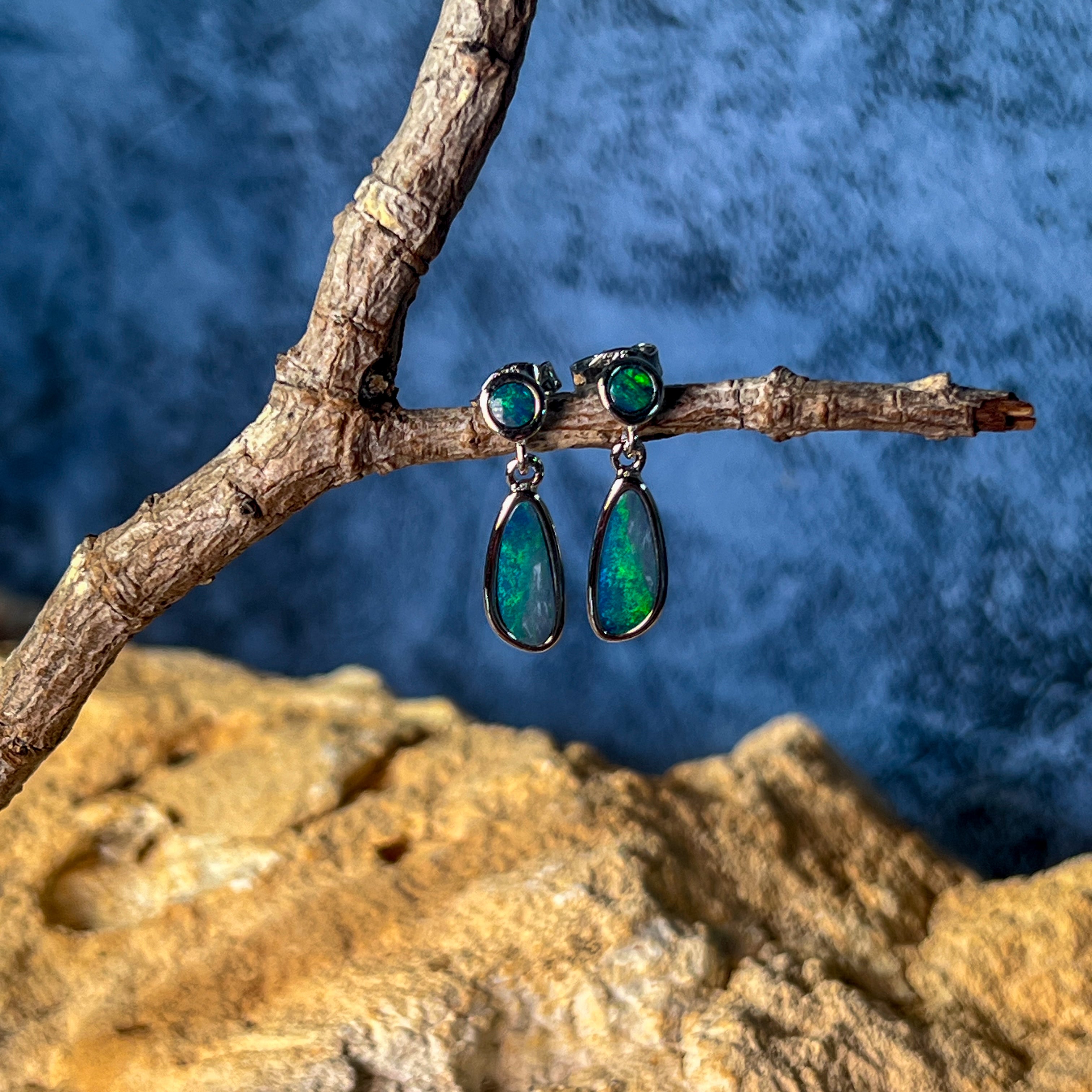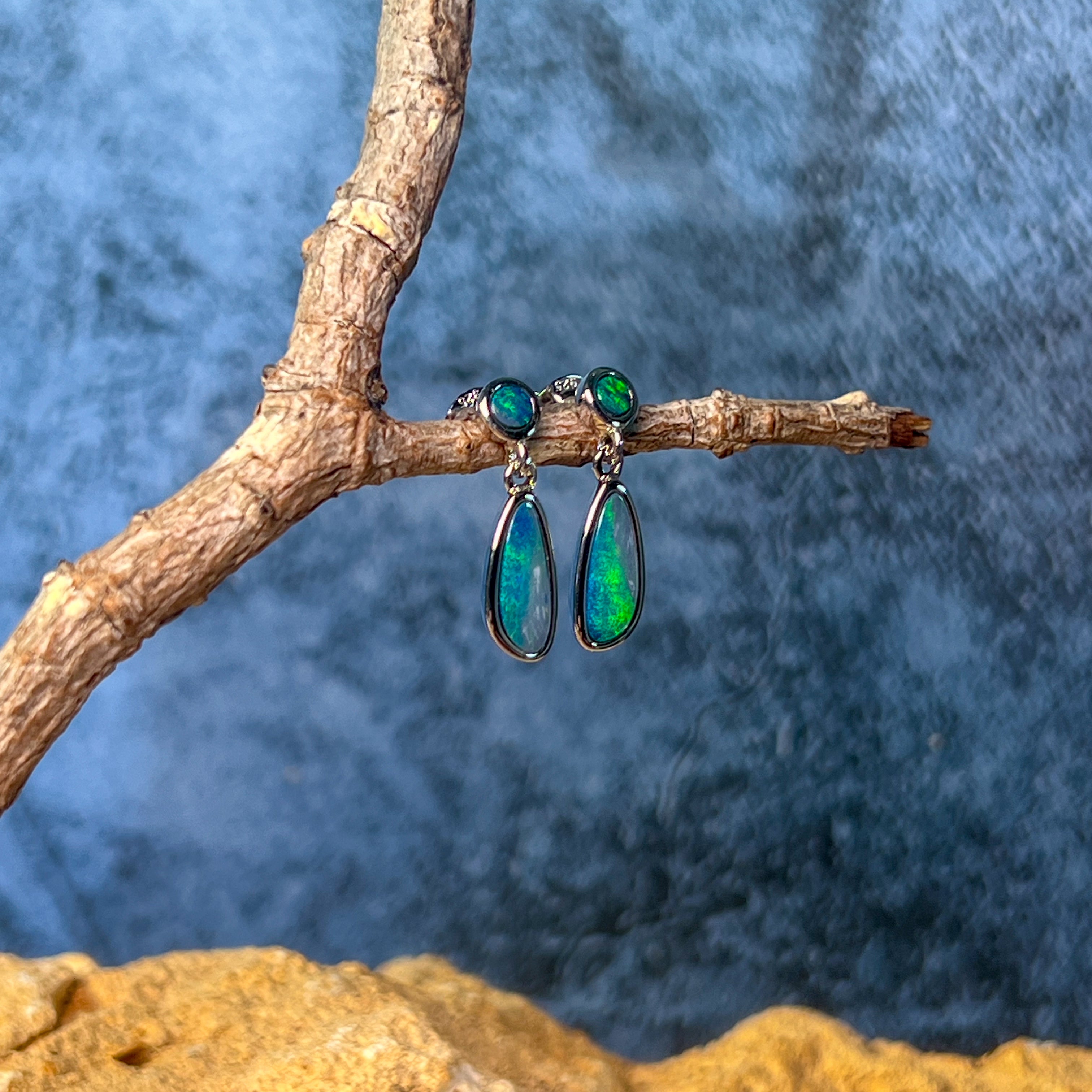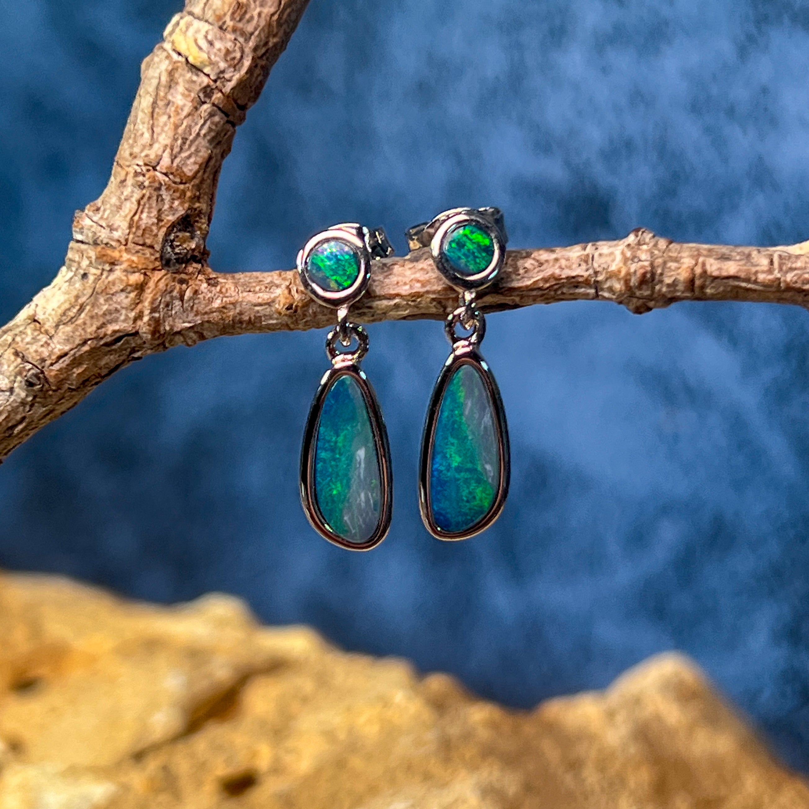 Sterling Silver drop earrings Blue Green Red line pattern Opal doublets bezel set