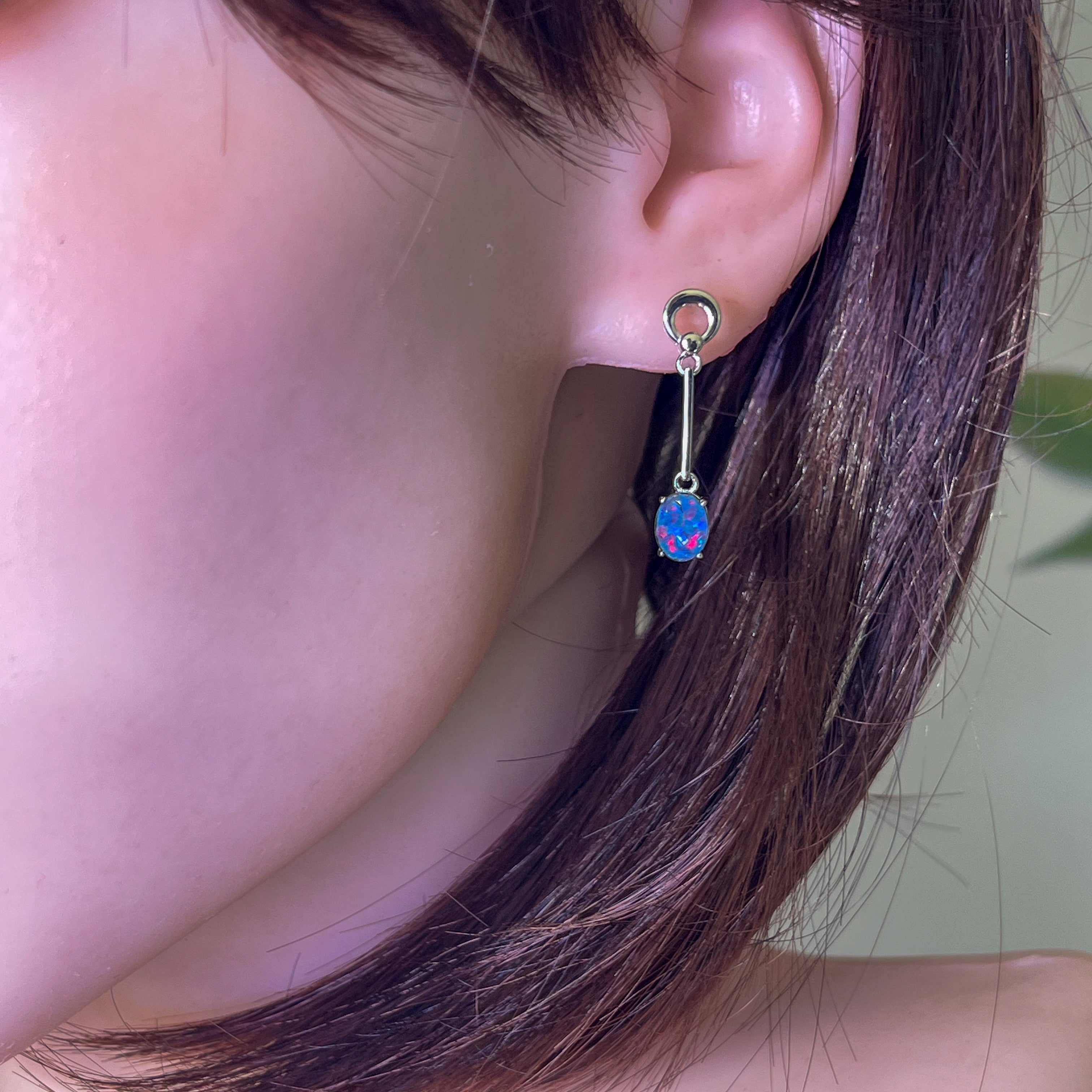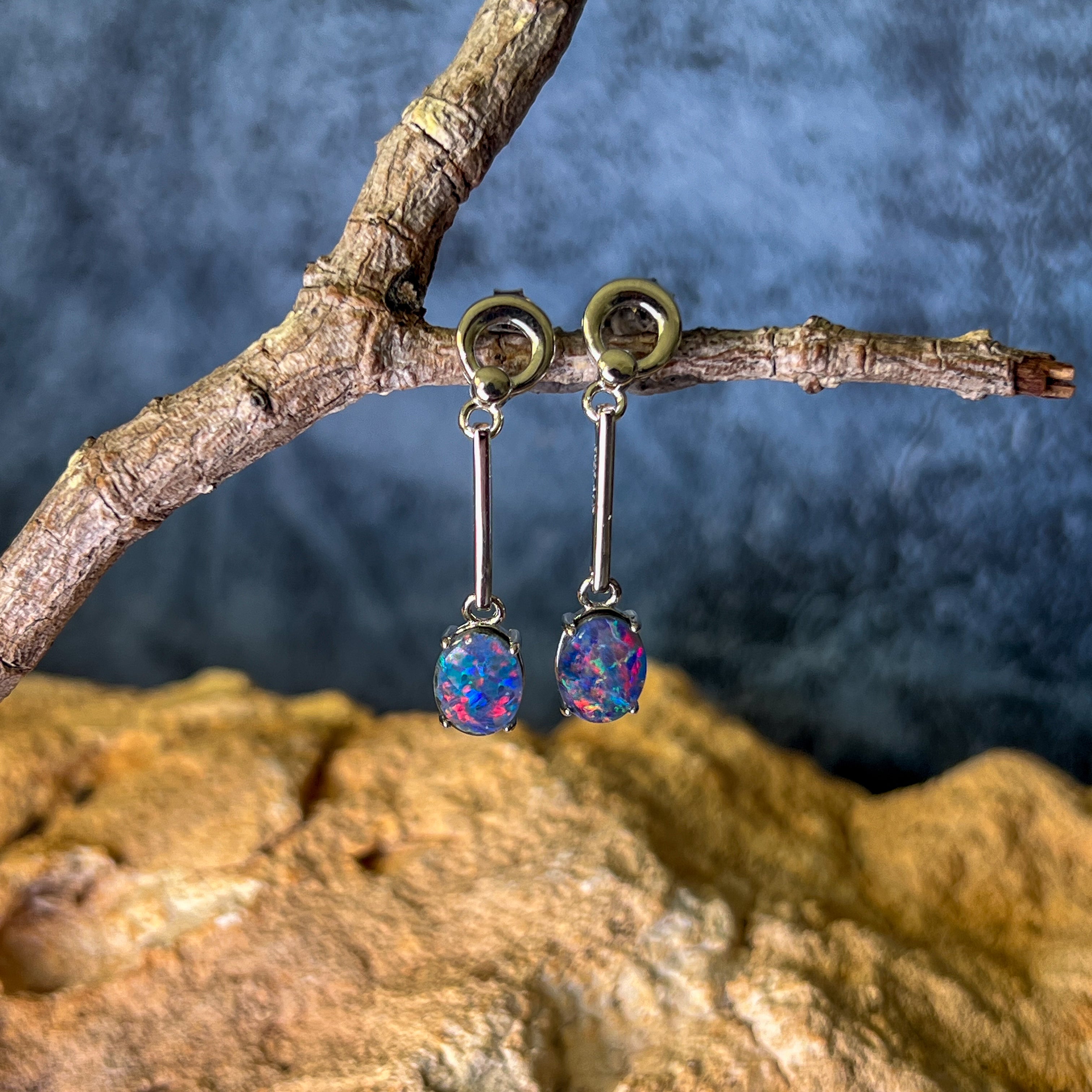 Elevate your style with these daring sterling silver drop bar earrings, featuring vibrant 8x6mm opal triplets. Their sleek, minimalistic design makes a bold statement while adding a touch of fiery color and elegance to any look. Perfect for those who dare to stand out with subtle sophistication.