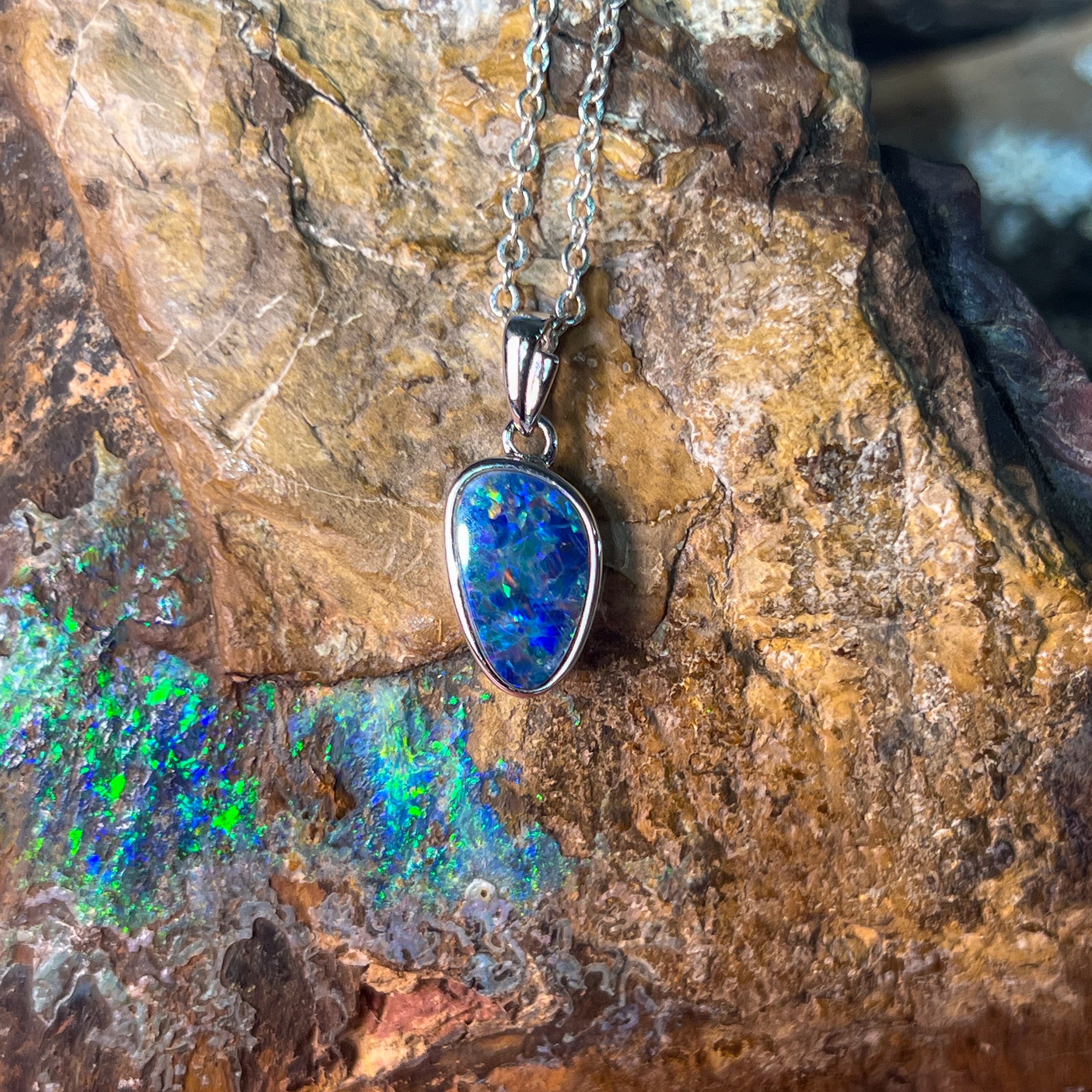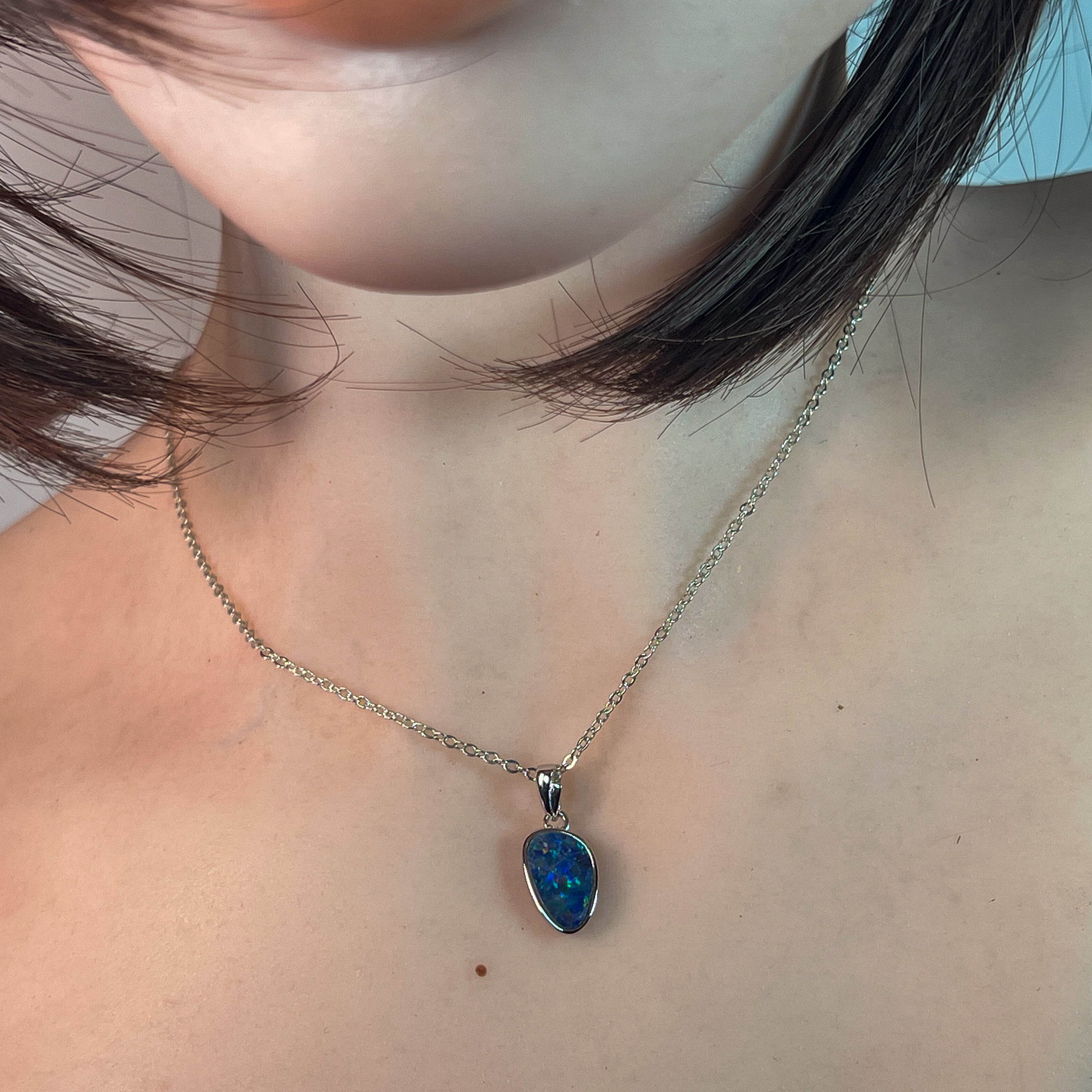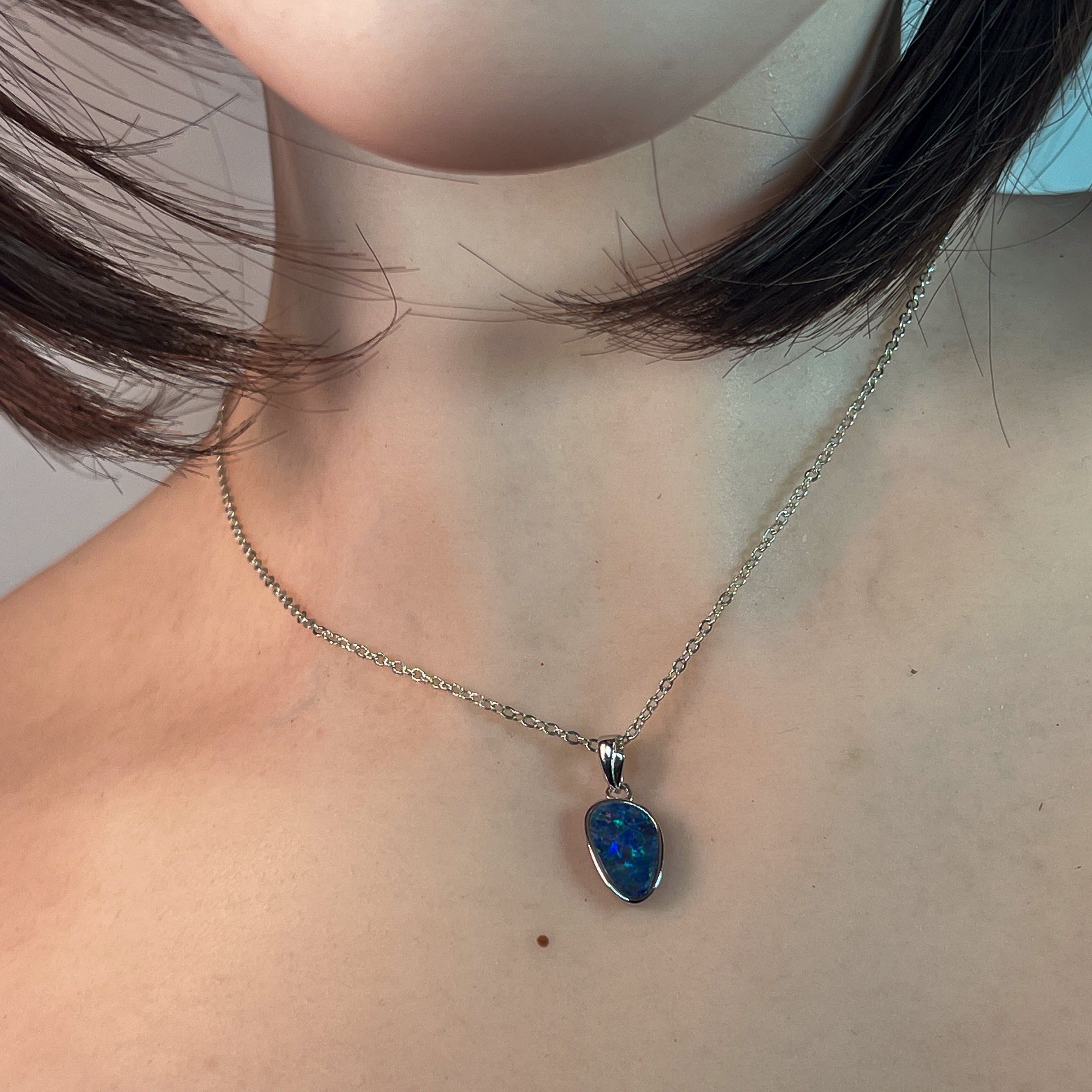 Elevate your everyday style with this sterling silver pendant featuring a freeform doublet opal shimmering in blue, green, and orange hues. Its delicate, classic design offers a subtle yet captivating touch, perfect for adding refined elegance to any outfit. Crafted to highlight the unique colors of the opal, this pendant ensures you stand out with effortless charm.