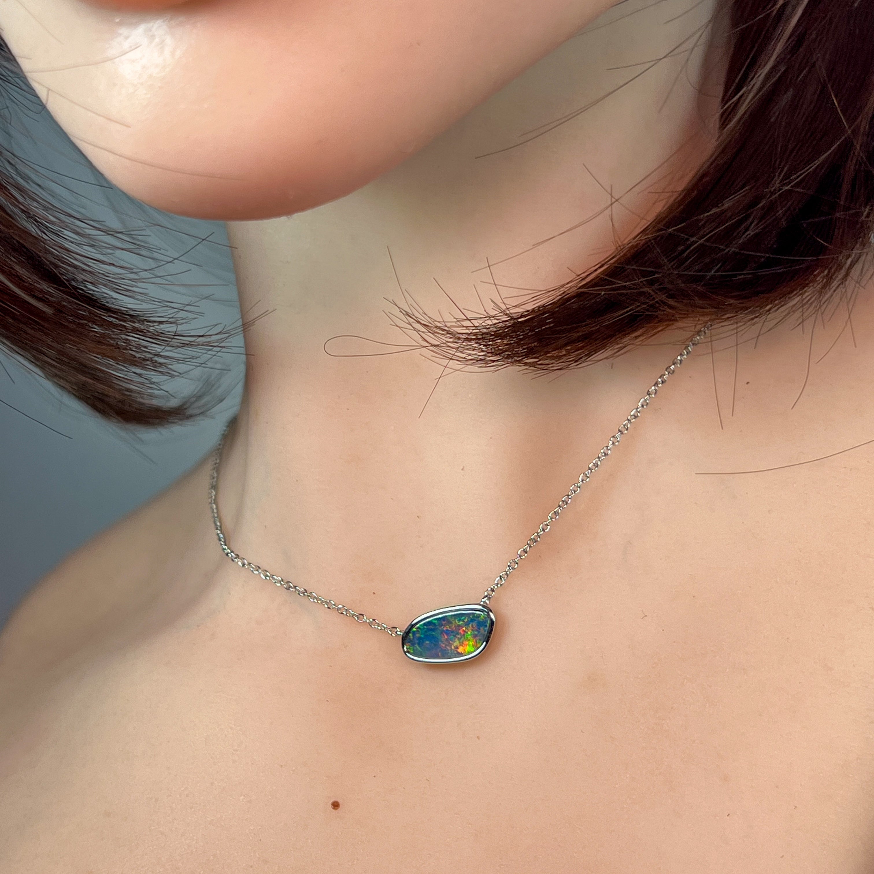 Elevate your elegance with this sterling silver necklace featuring a freeform horizontal bezel-set opal doublet. The unique shape and secure setting highlight the opal’s vibrant play of color, making it a refined statement piece perfect for any sophisticated wardrobe.