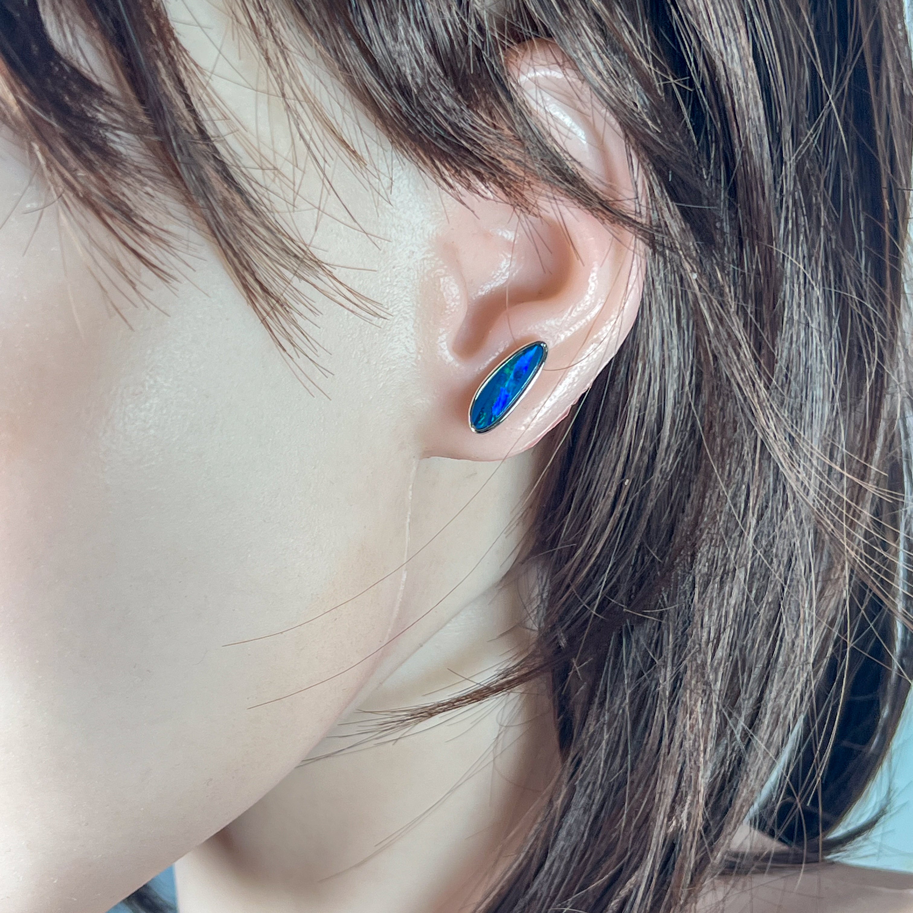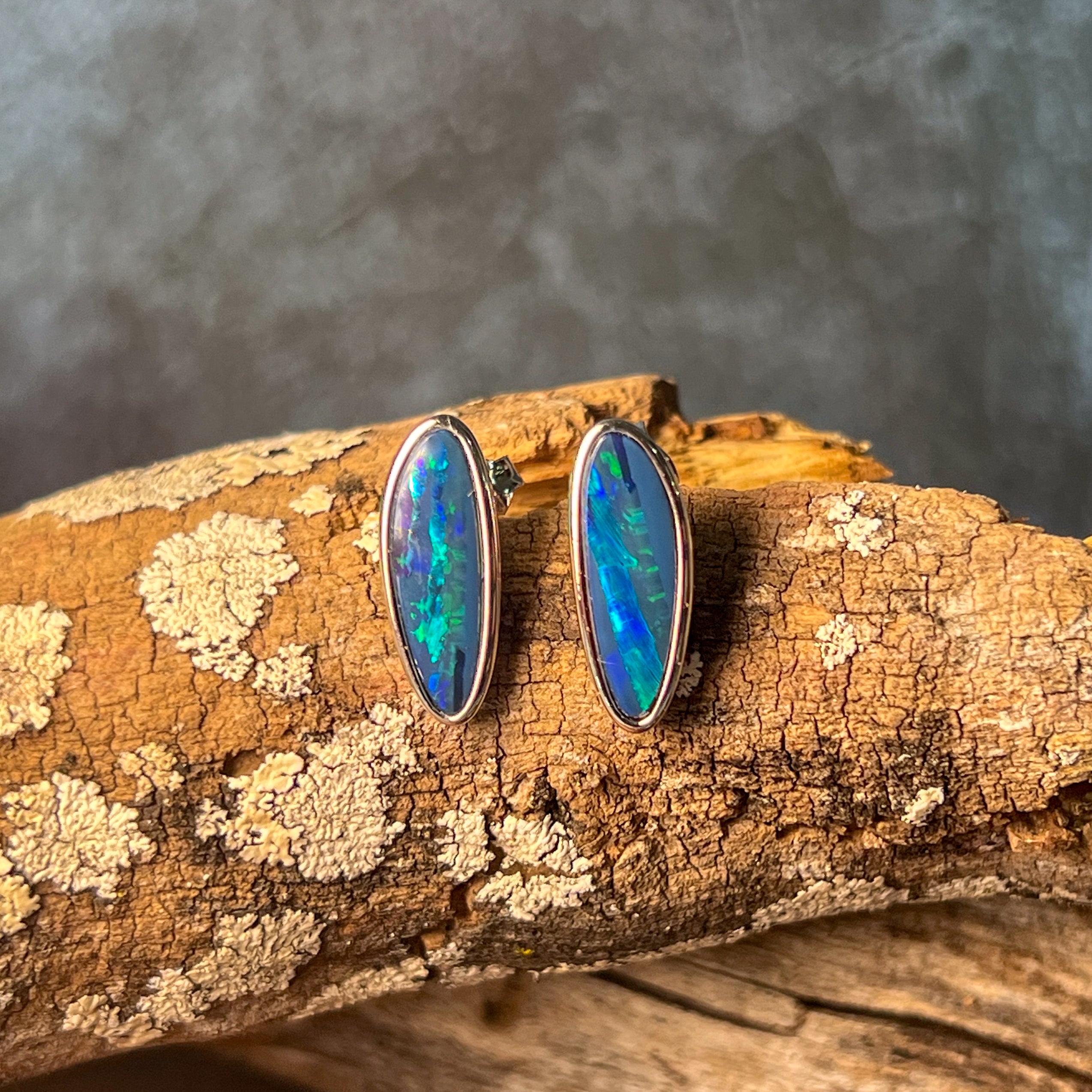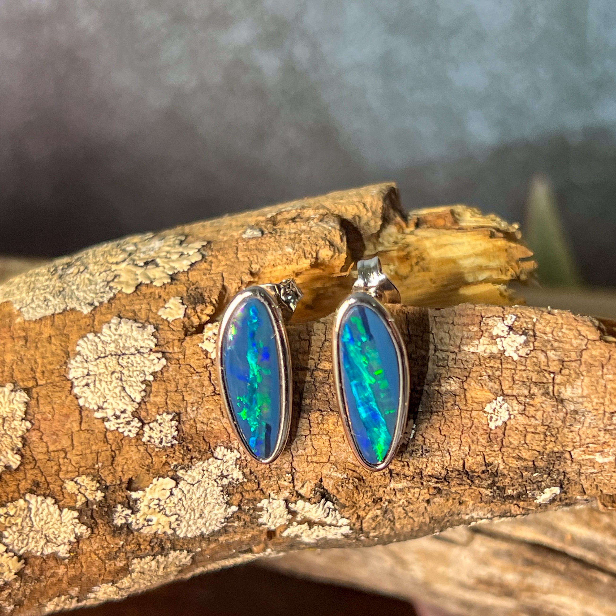 Elevate your elegance with these sterling silver freeform opal doublet earrings, featuring captivating blue-green stripes. Their unique design and rich hues add a refined touch to any ensemble, perfect for those who appreciate subtle sophistication and timeless beauty.