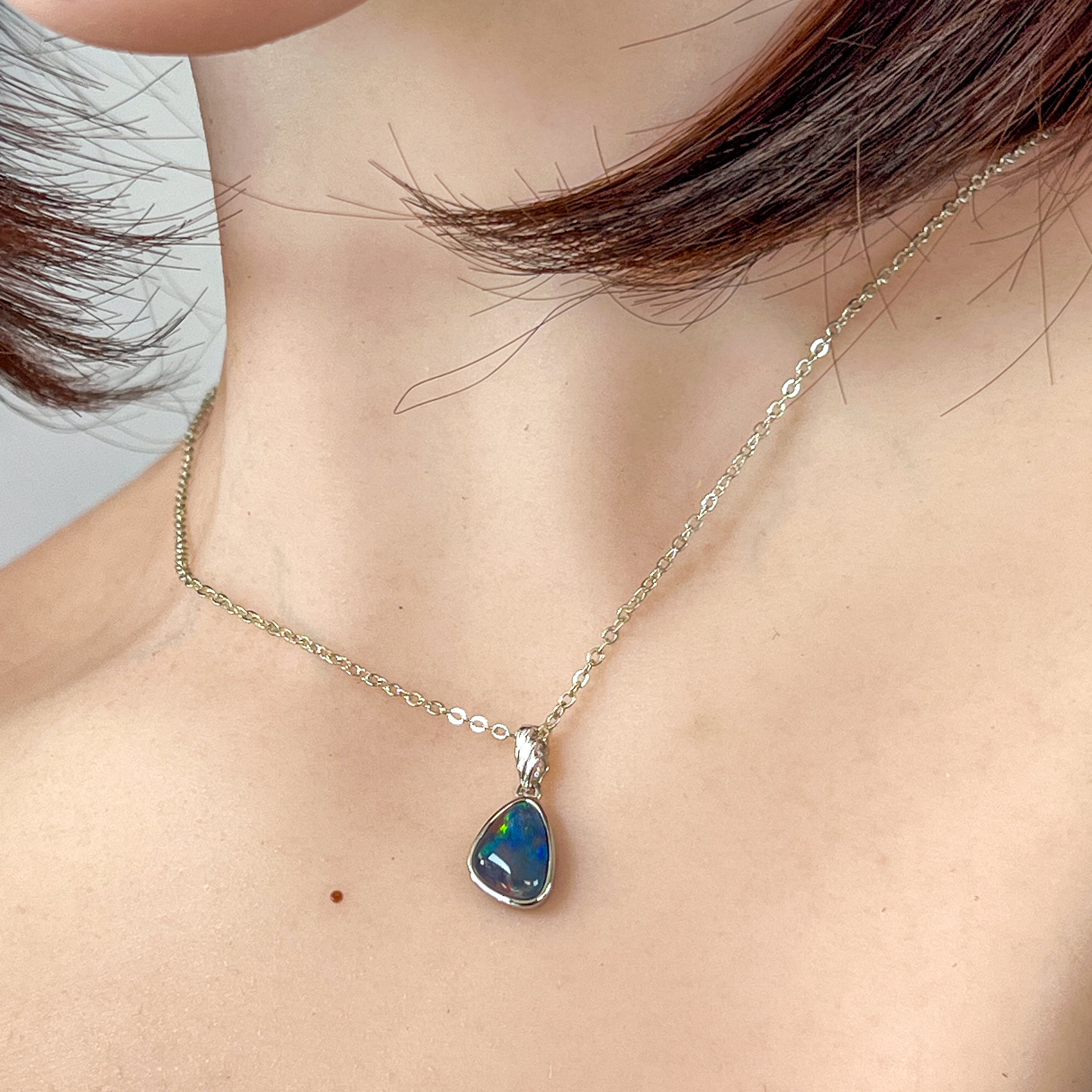 Elevate your elegance with this sterling silver pendant featuring a freeform opal triplet in a striking triangle shape. The vibrant play of bright colors within the opal adds a captivating allure, while the sleek silver setting enhances its sophisticated charm. Perfect for adding a refined touch to any ensemble.