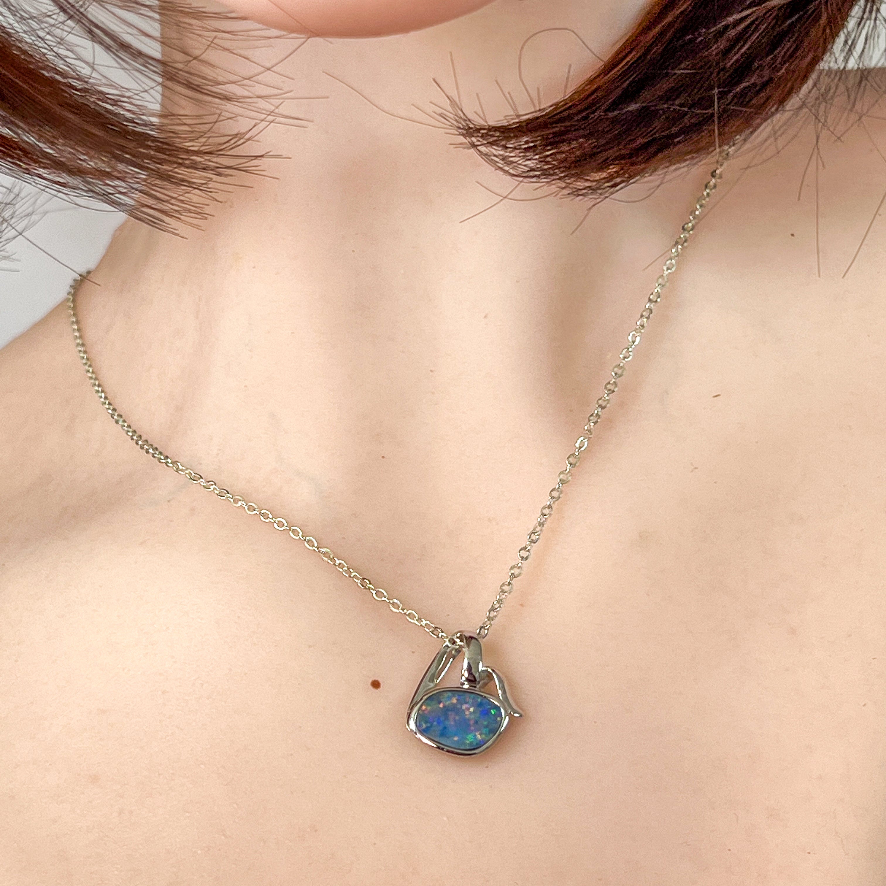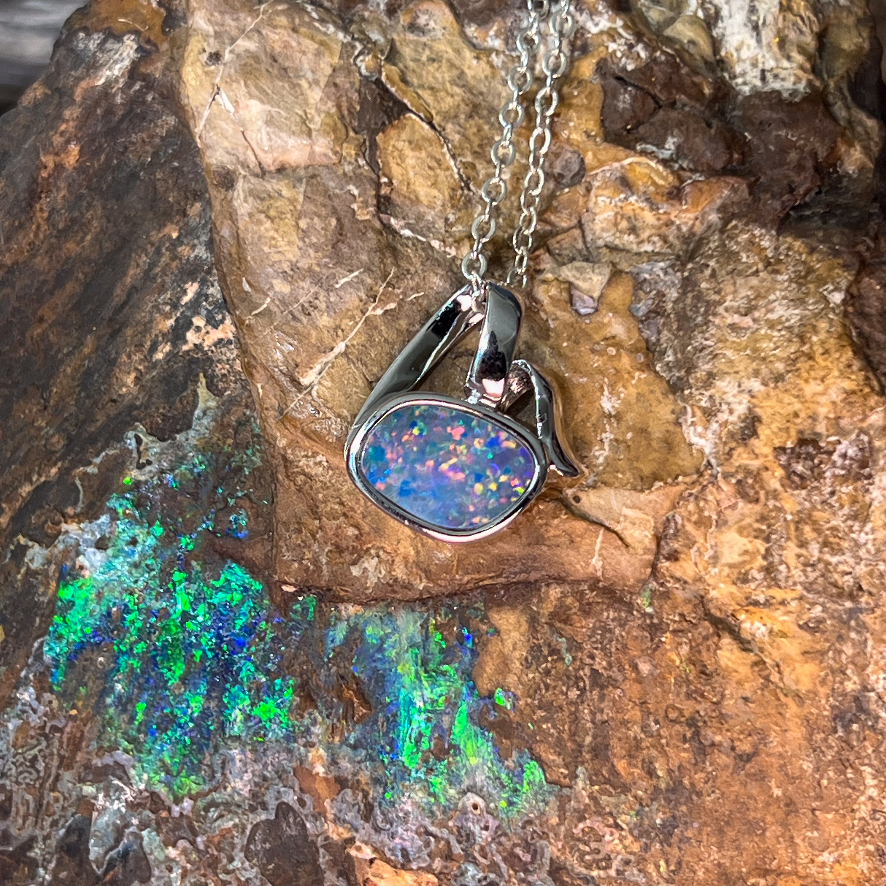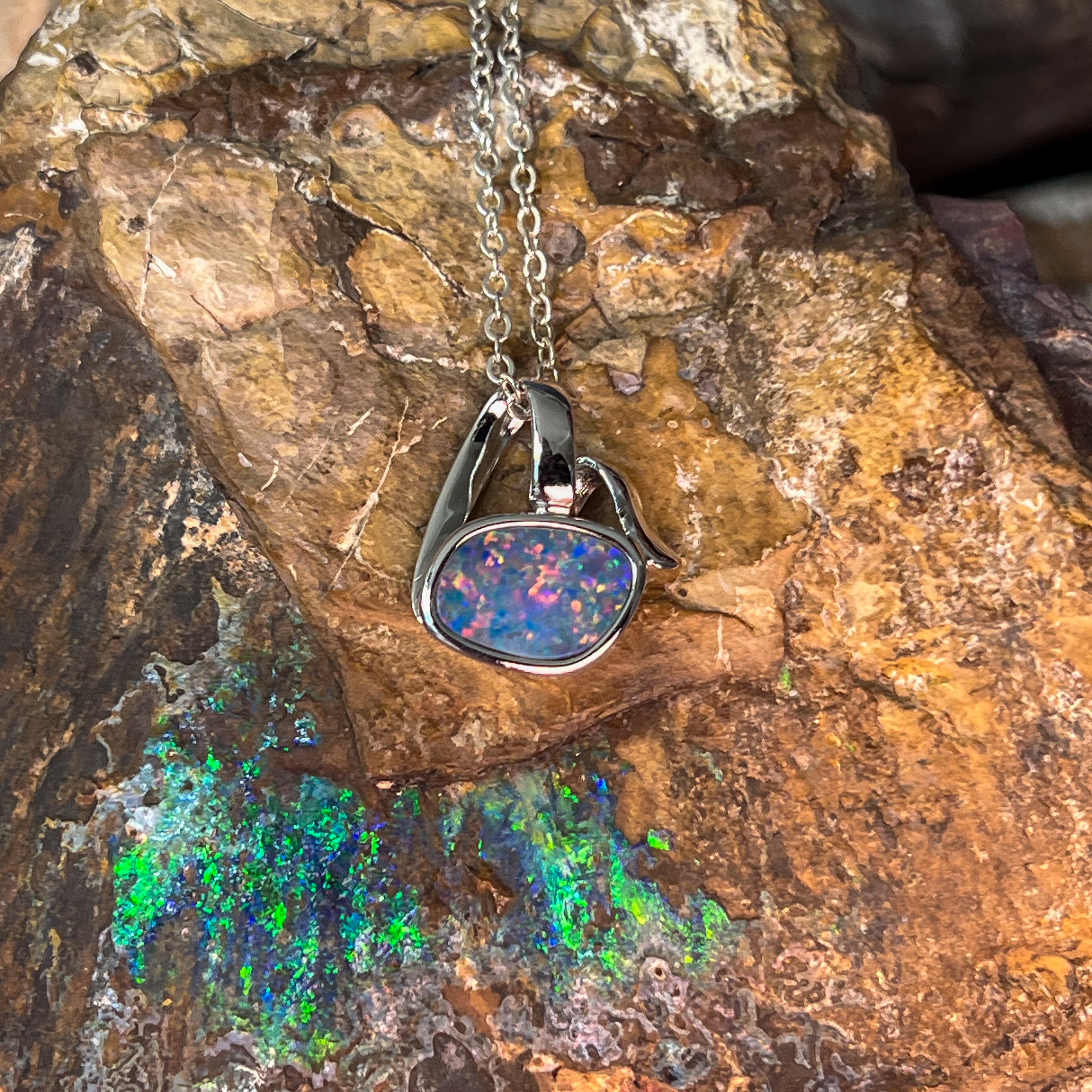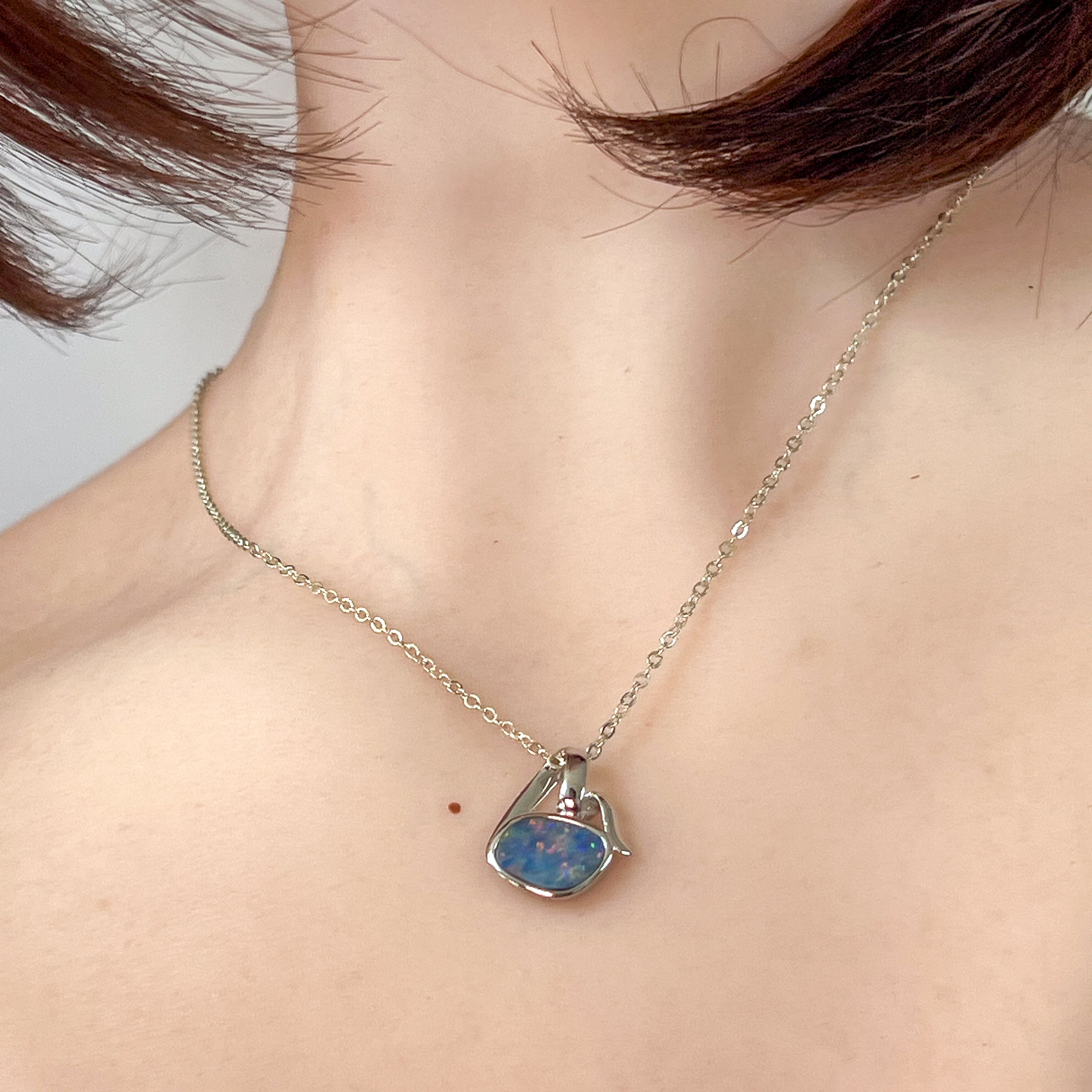 Elevate your style with this sterling silver pendant featuring a horizontal freeform opal doublet. Its modern design combines sleek silver craftsmanship with the unique play of color in the opal, creating a refined accessory that complements both casual and formal looks with understated elegance.