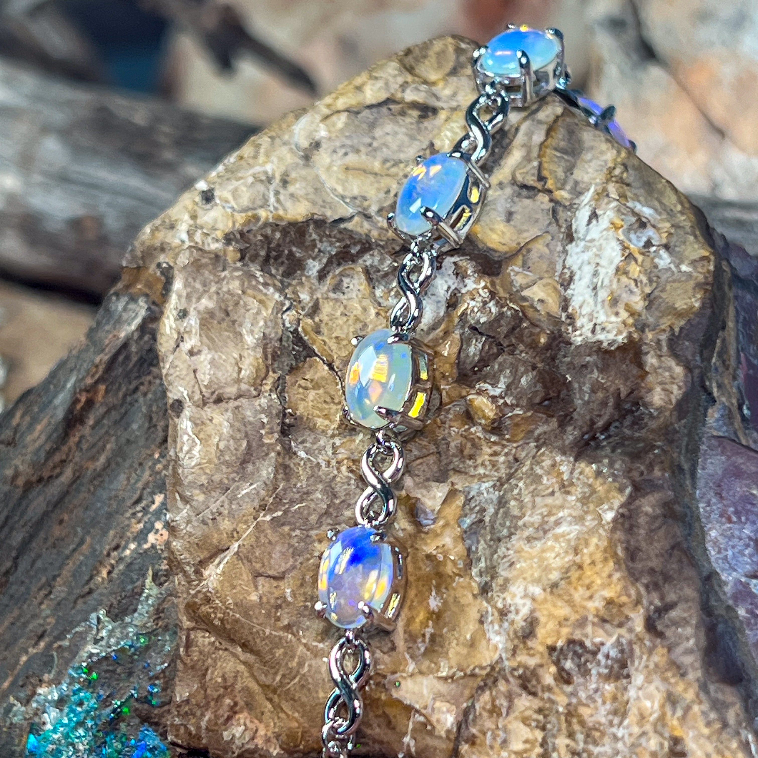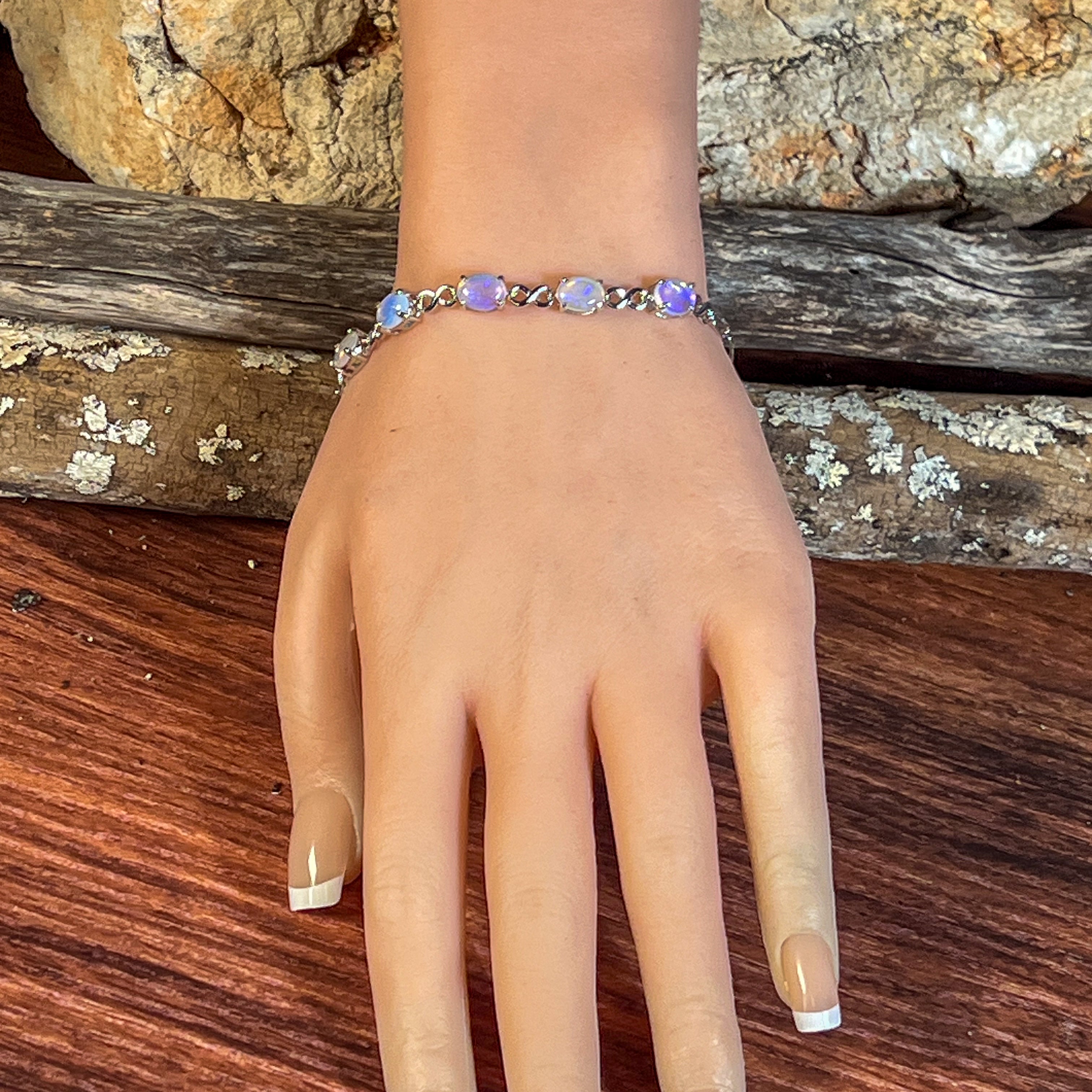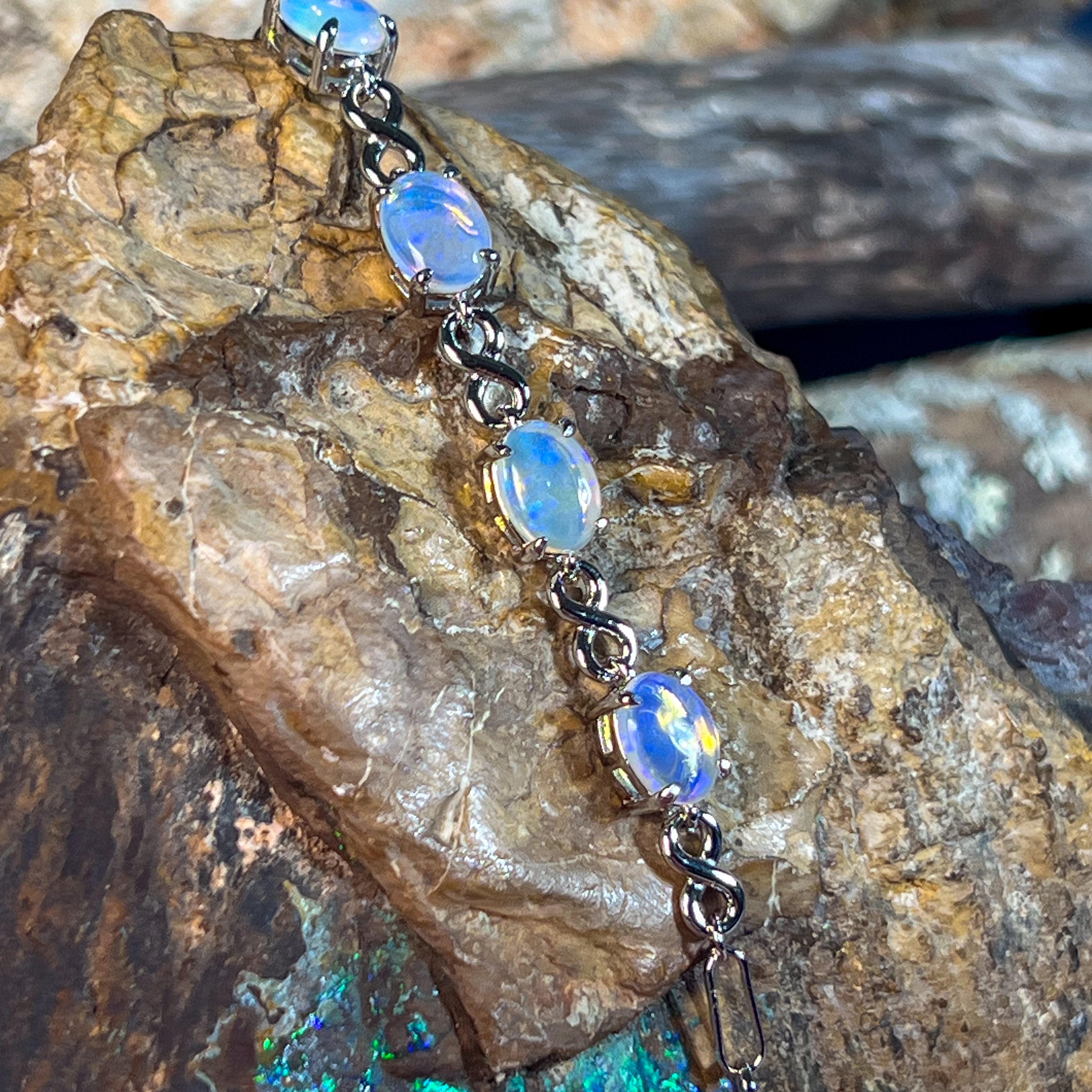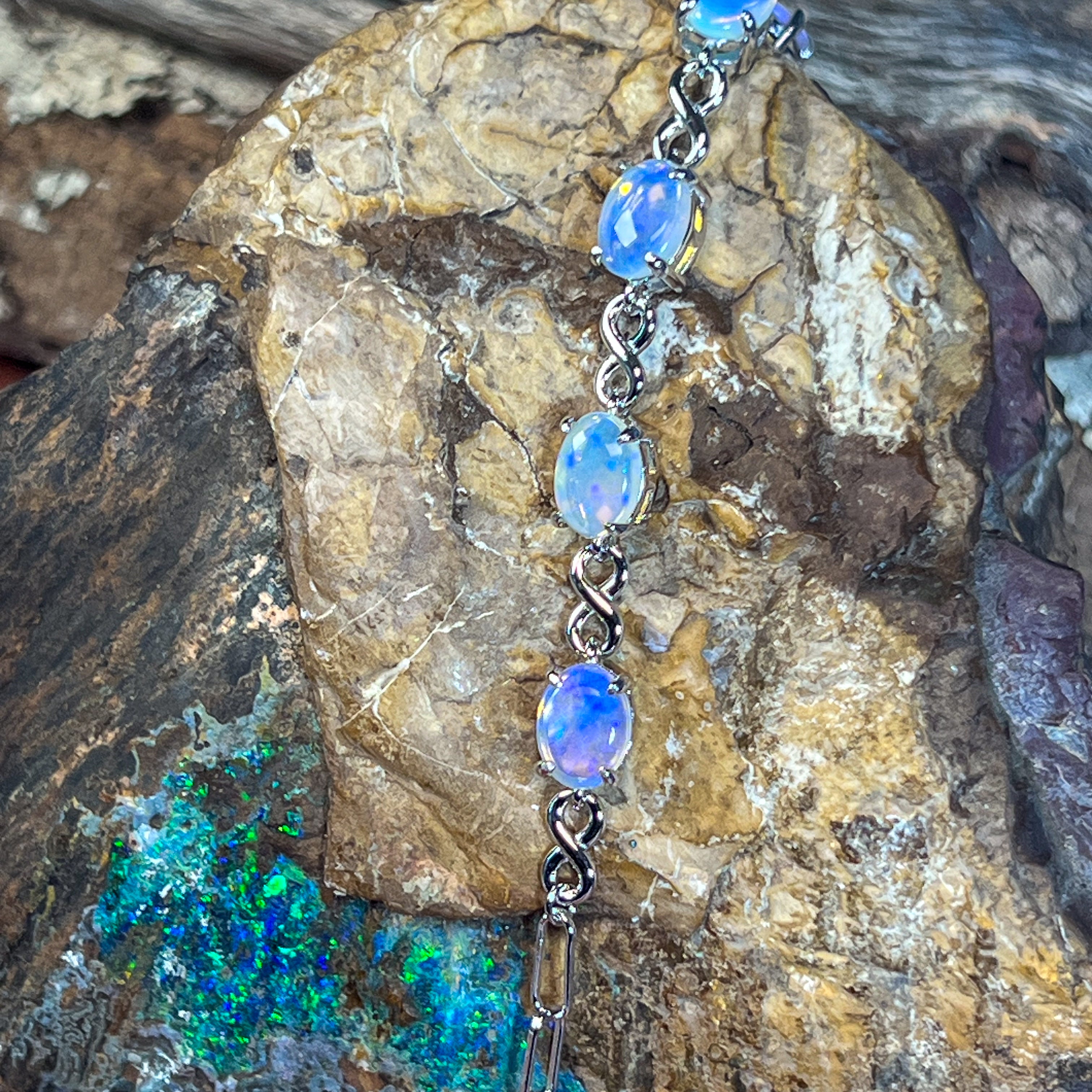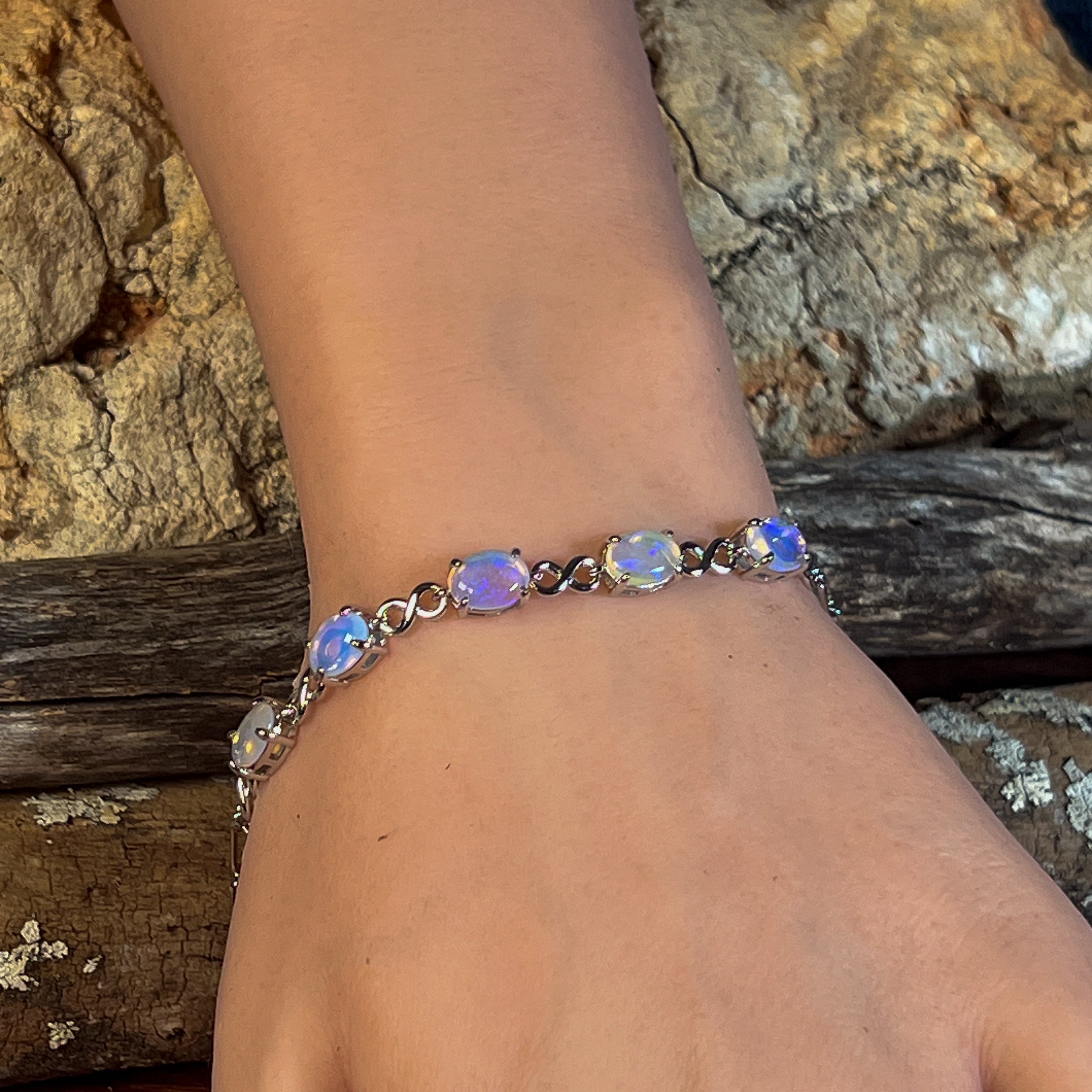 Elevate your style with this sterling silver bracelet featuring a sleek infinity design, symbolizing endless elegance. Adorned with luminous 8x6mm light opals, it captures light beautifully, adding a subtle yet captivating glow to any outfit. Perfect for daily wear or special occasions, this bracelet blends timeless symbolism with modern sophistication.