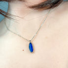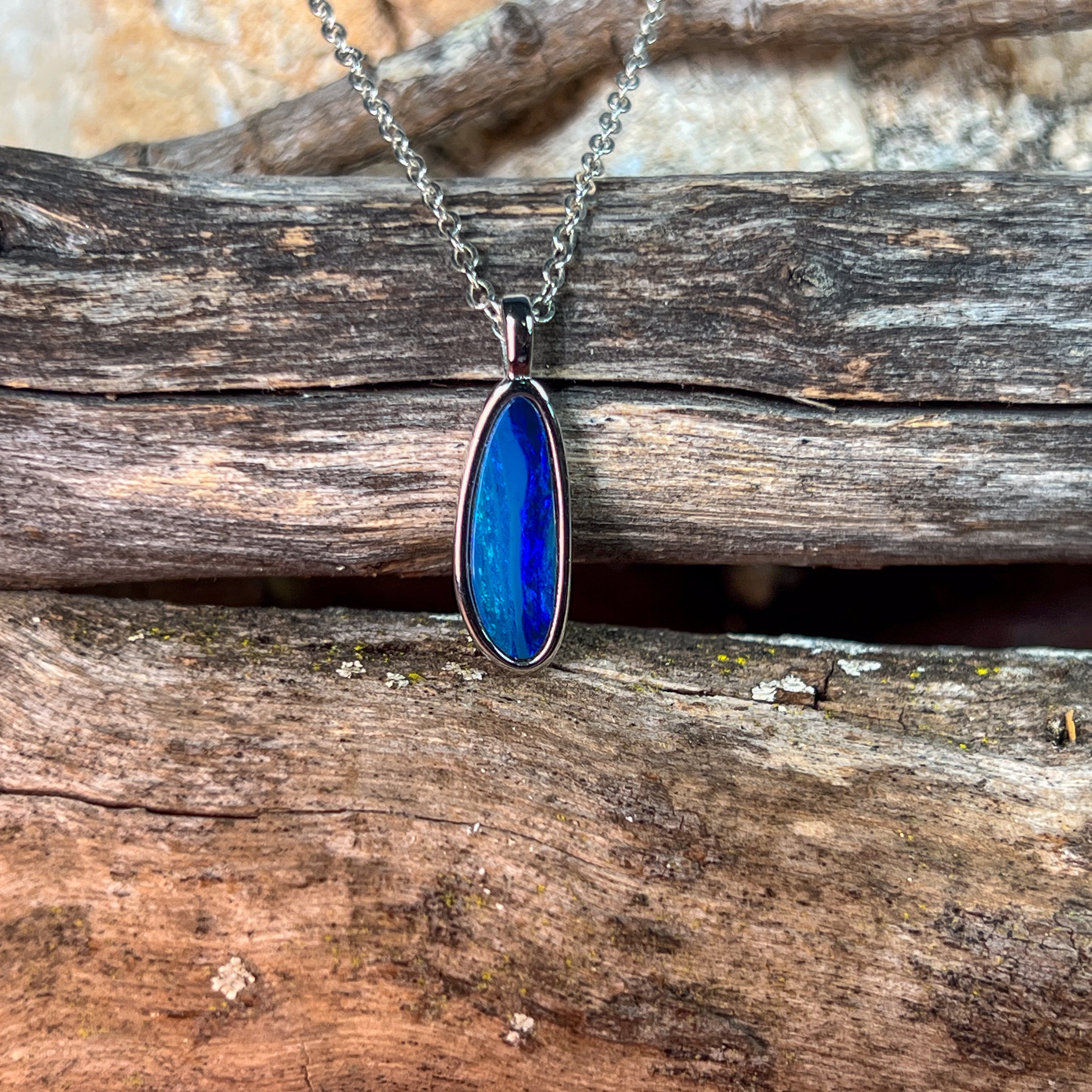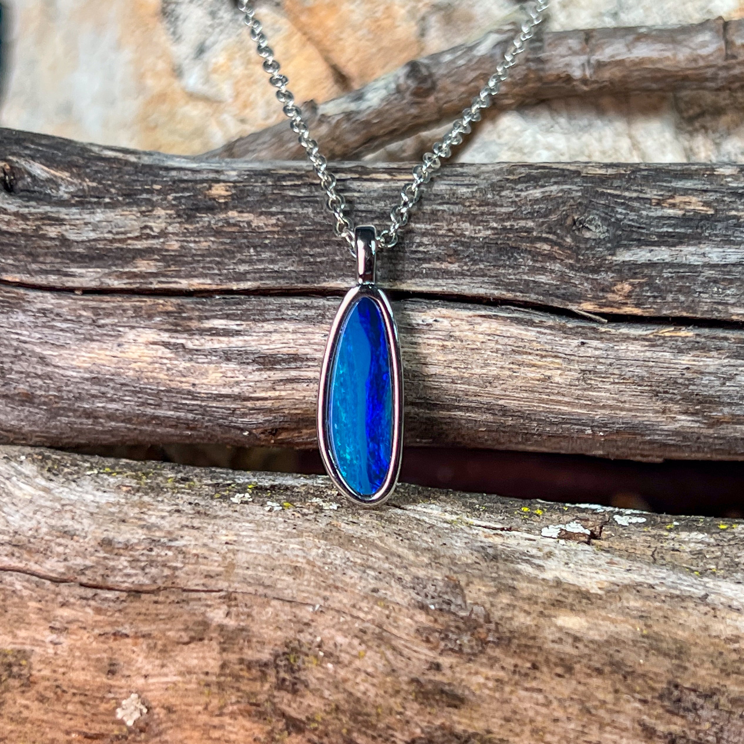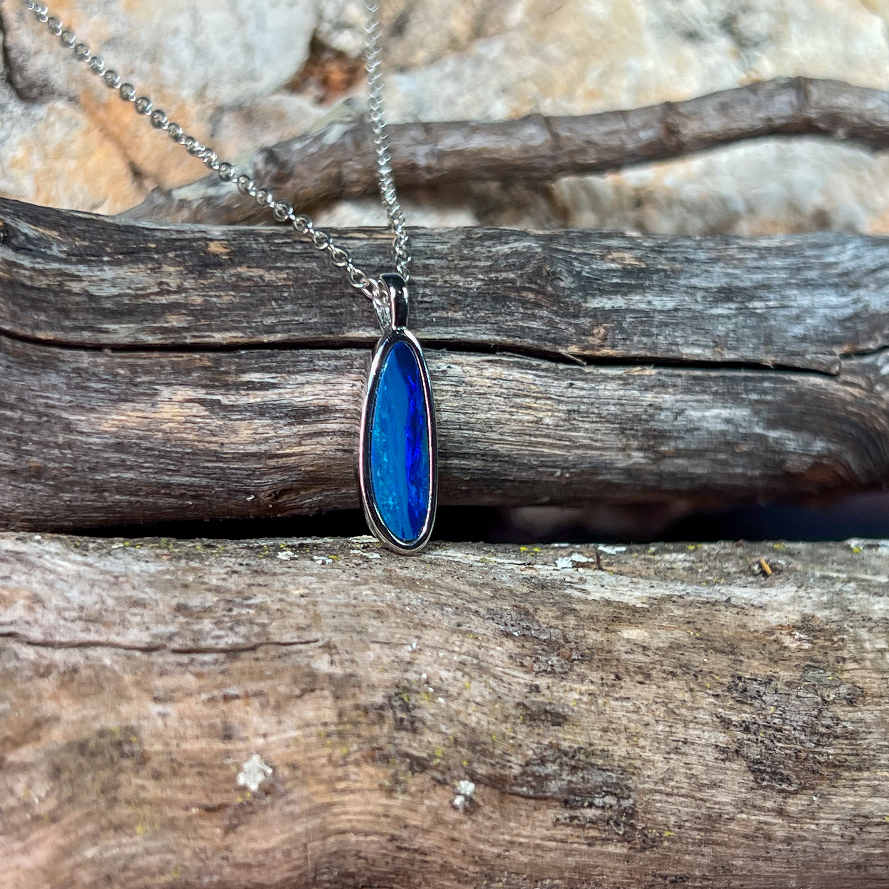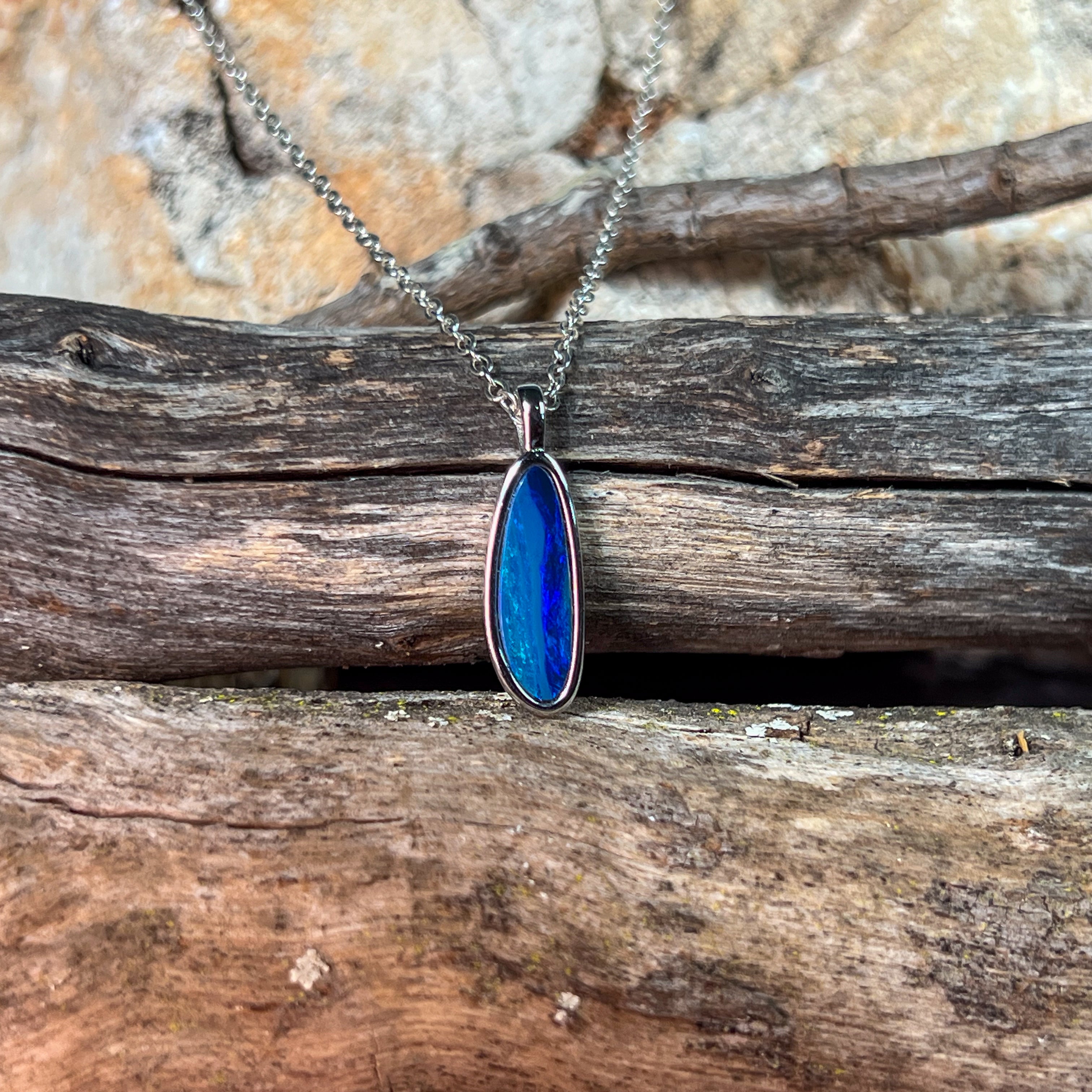 Elongated elegance meets timeless sophistication with this sterling silver pendant featuring a captivating blue-green opal doublet. The drop silhouette creates a graceful line that draws the eye downward, while the opal's mesmerizing play of colour adds depth and movement to any ensemble. Crafted in quality sterling silver, this piece combines durability with refined beauty. Perfect for those seeking a statement pendant that transitions effortlessly from day to evening wear, this design celebrates the natural artistry of opal in a contemporary style that never goes out of fashion.