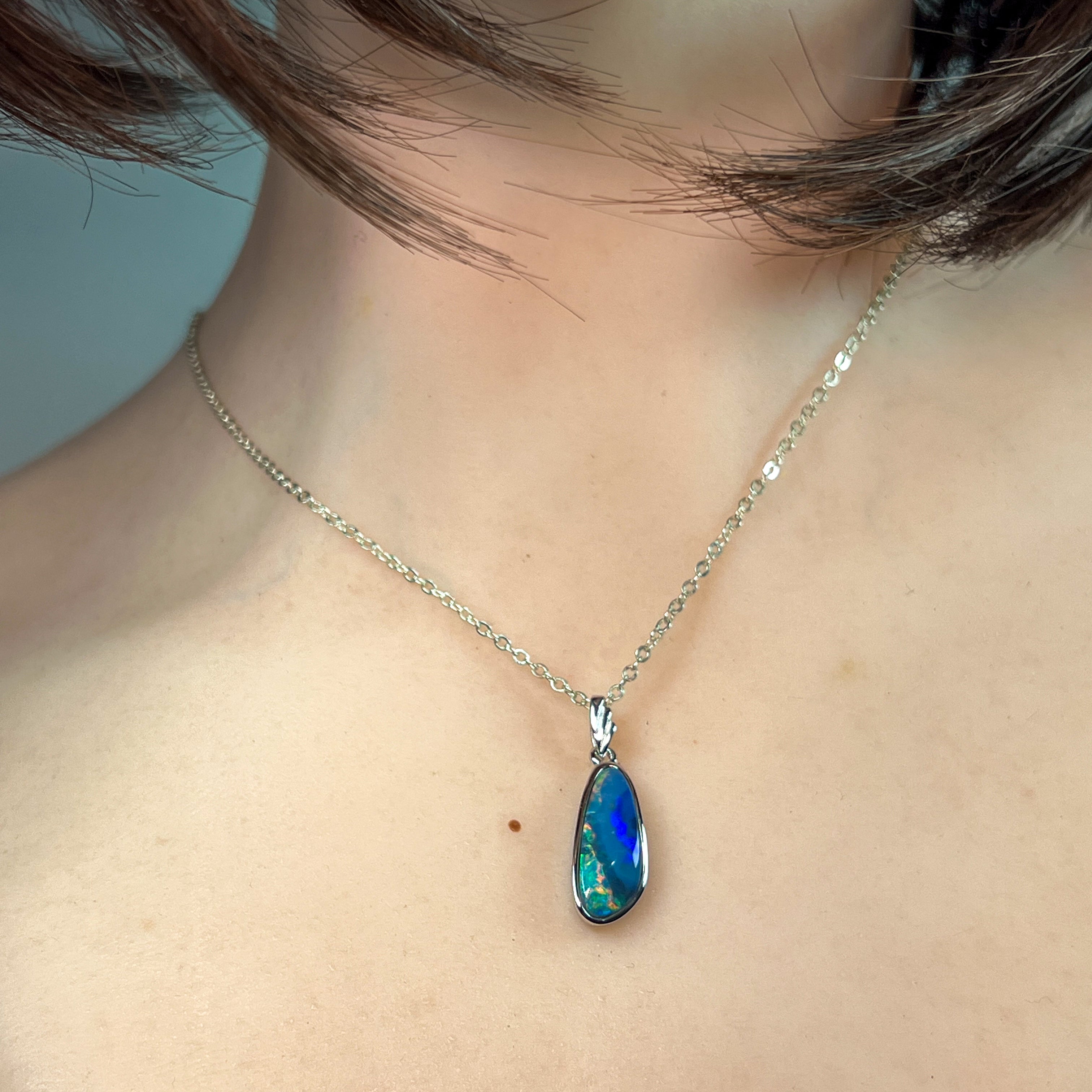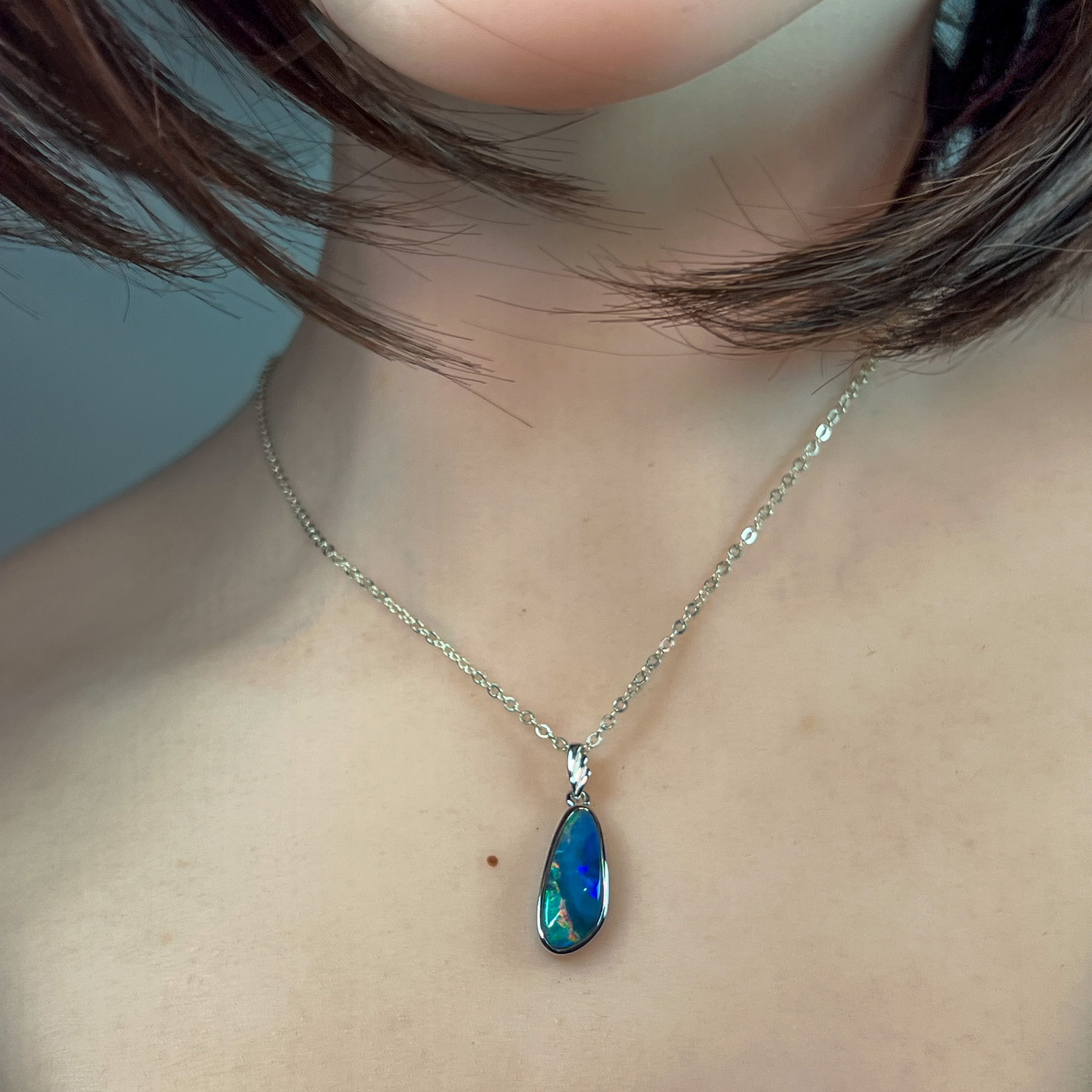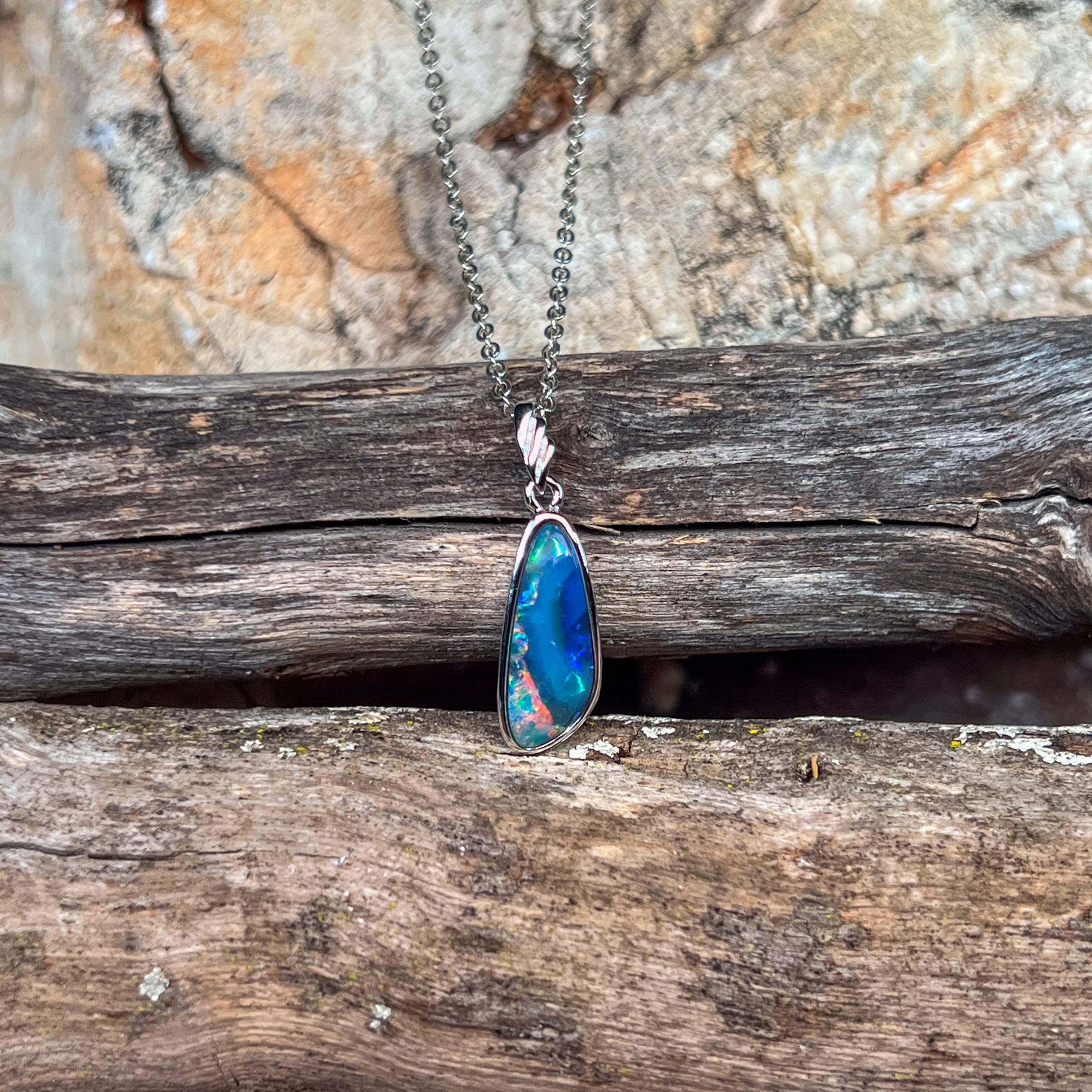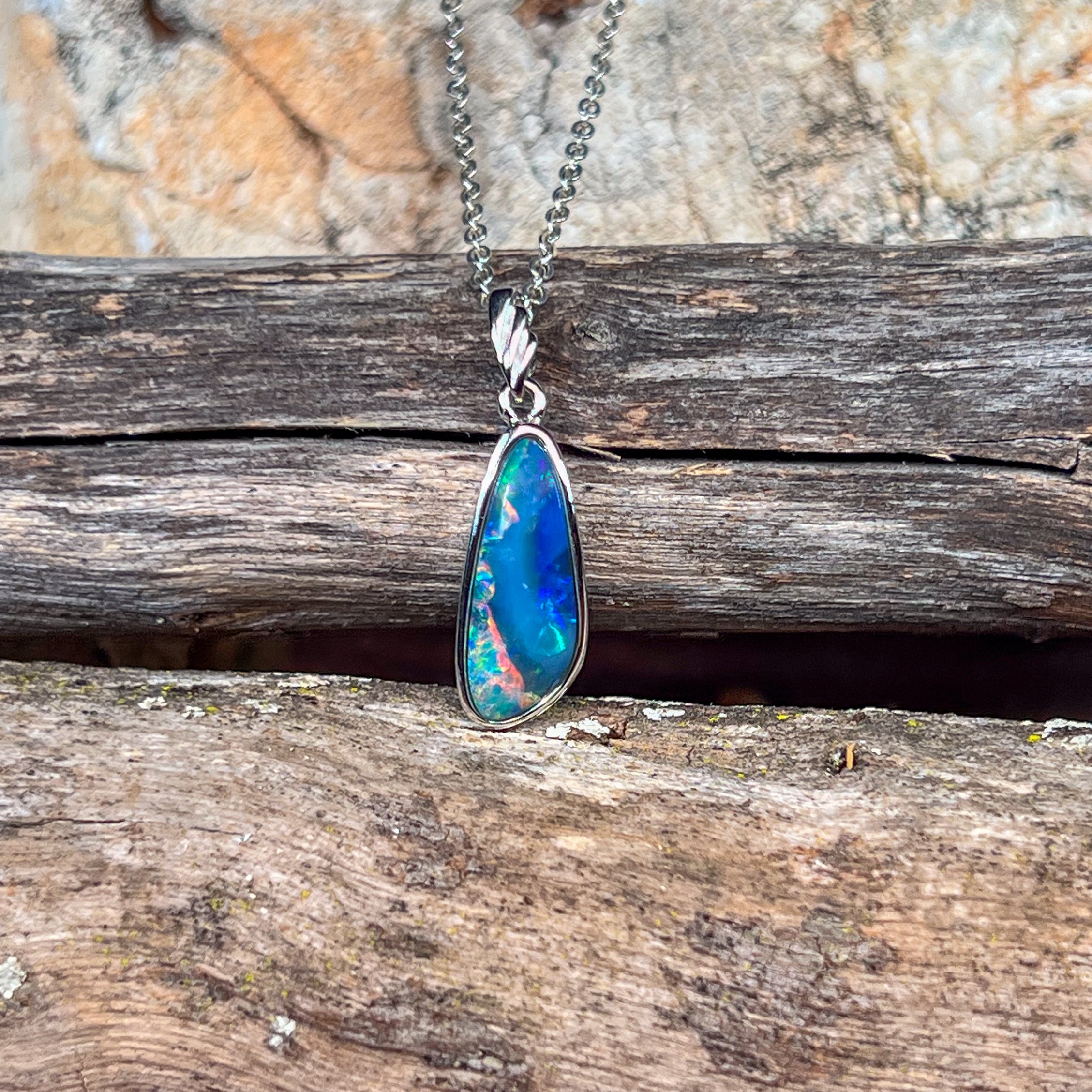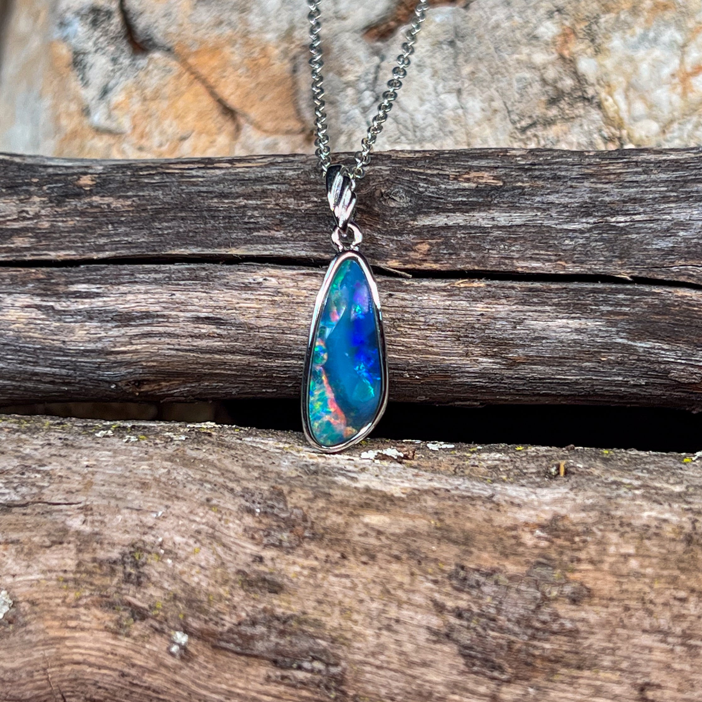 Elevate your jewellery collection with this stunning Sterling Silver Long Drop pendant, featuring a mesmerising triplet pattern opal doublet that dances with multi-coloured brilliance. Each piece showcases nature's most captivating play of colour—vibrant blues, greens, reds, and golds that shift and shimmer with every movement. Crafted from premium sterling silver, this elegant long drop design offers versatile styling for both everyday wear and special occasions. The doublet construction ensures durability while maximising the opal's natural radiance. A timeless investment piece that celebrates the raw beauty of Australian opals.