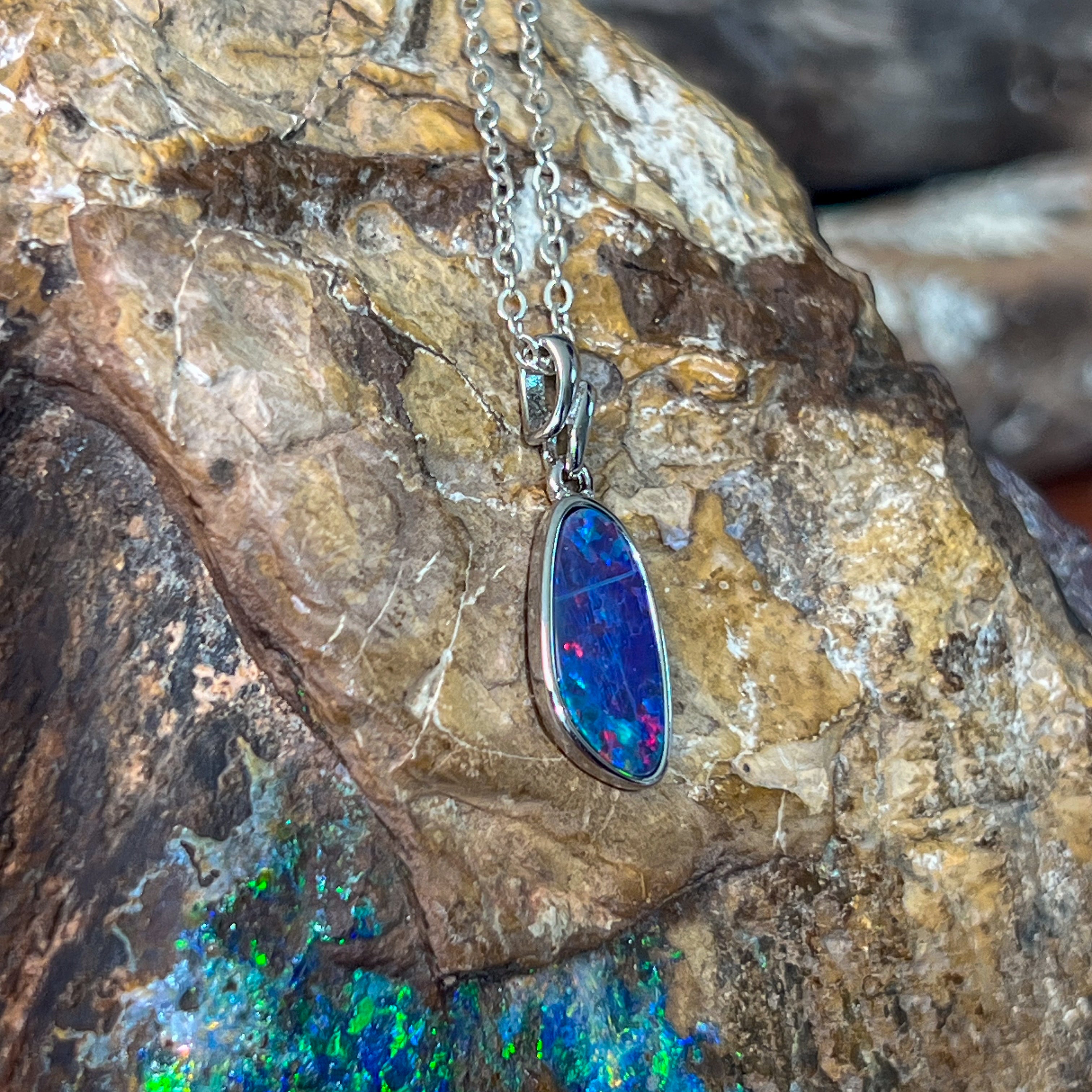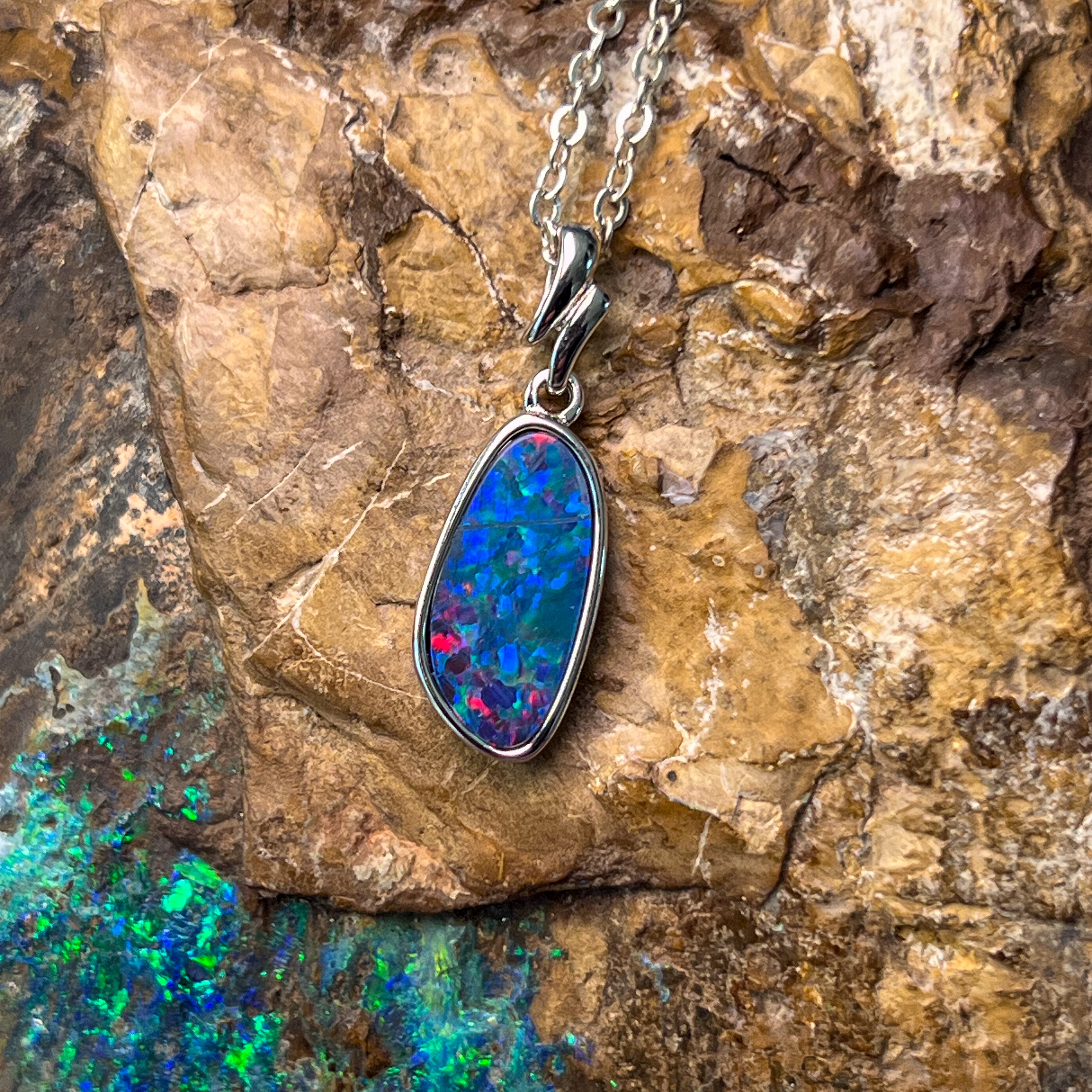 Elevate your elegance with this sterling silver pendant featuring a long, freeform doublet opal. Its fiery red and blue hues create a captivating play of color, making it a striking statement piece. Perfect for adding a refined touch to any ensemble, this pendant combines artistry and sophistication in one exquisite design.