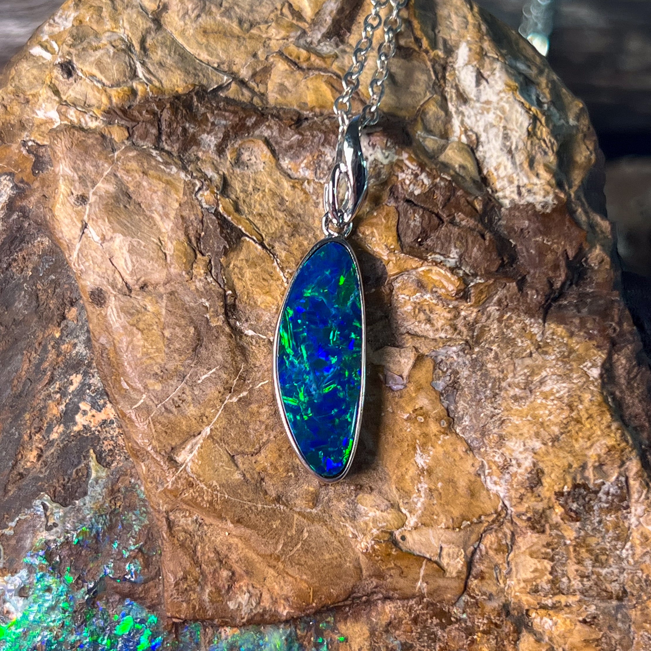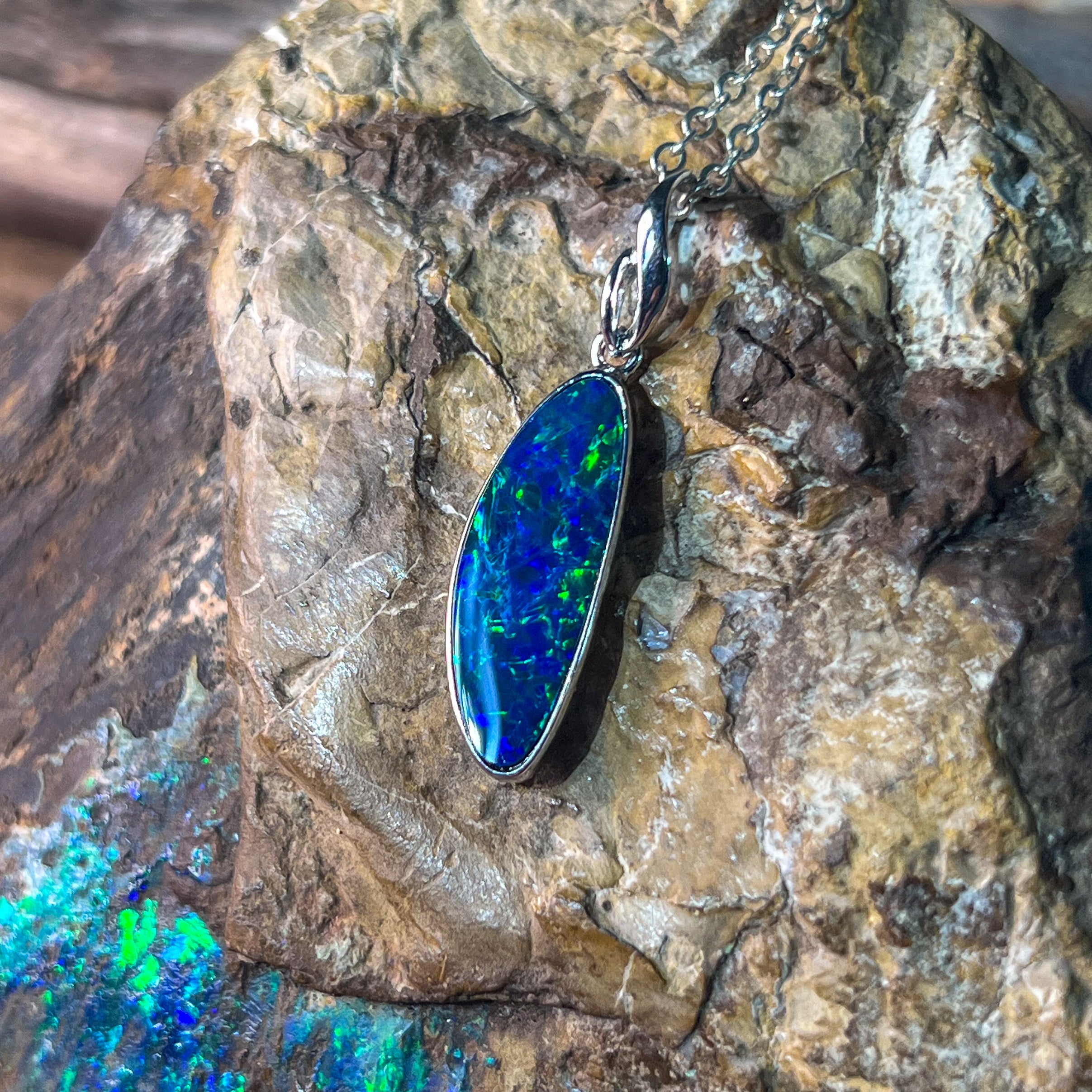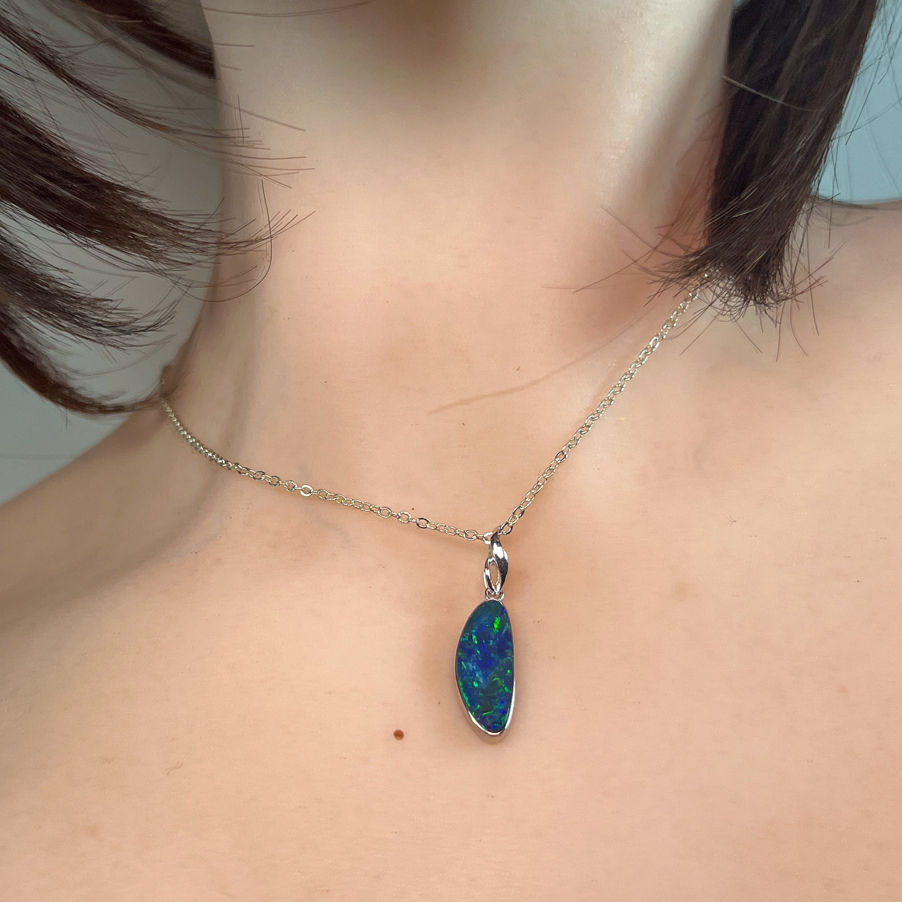 Elevate your style with this Sterling Silver pendant featuring a long, thin freeform design. The deep forest green and rich blue hues of the opal doublet create a captivating contrast that catches the light beautifully. Lightweight yet striking, this pendant adds a touch of elegance and uniqueness to any outfit, perfect for those who appreciate subtle sophistication.