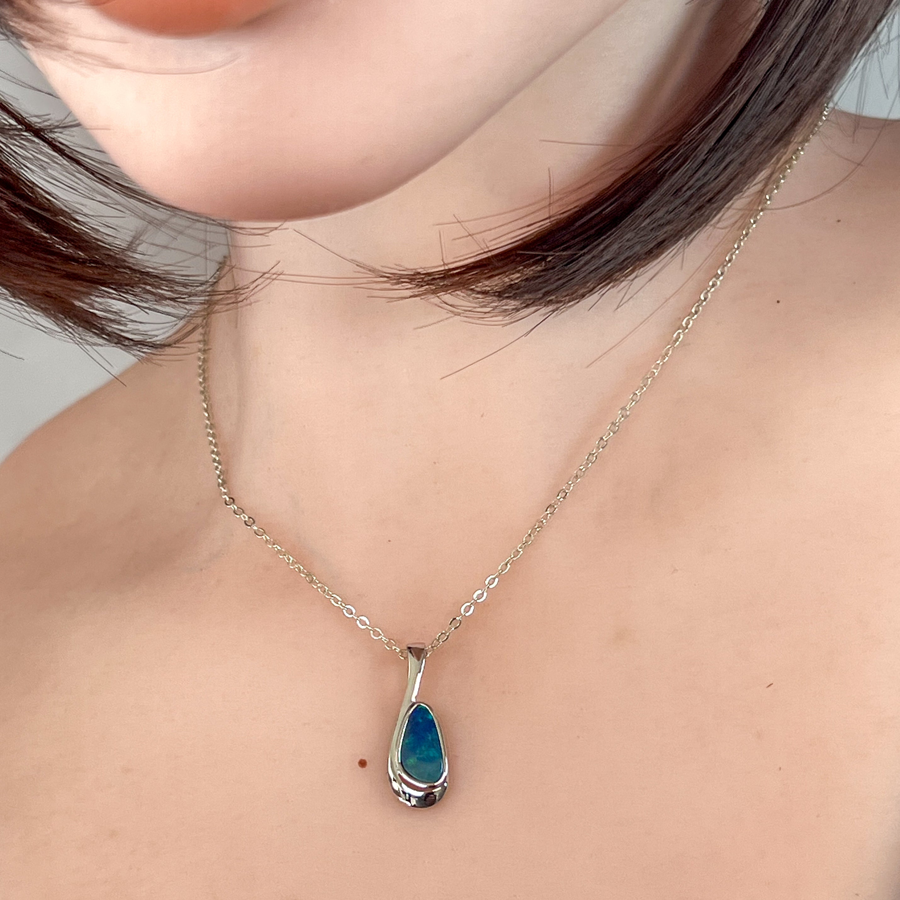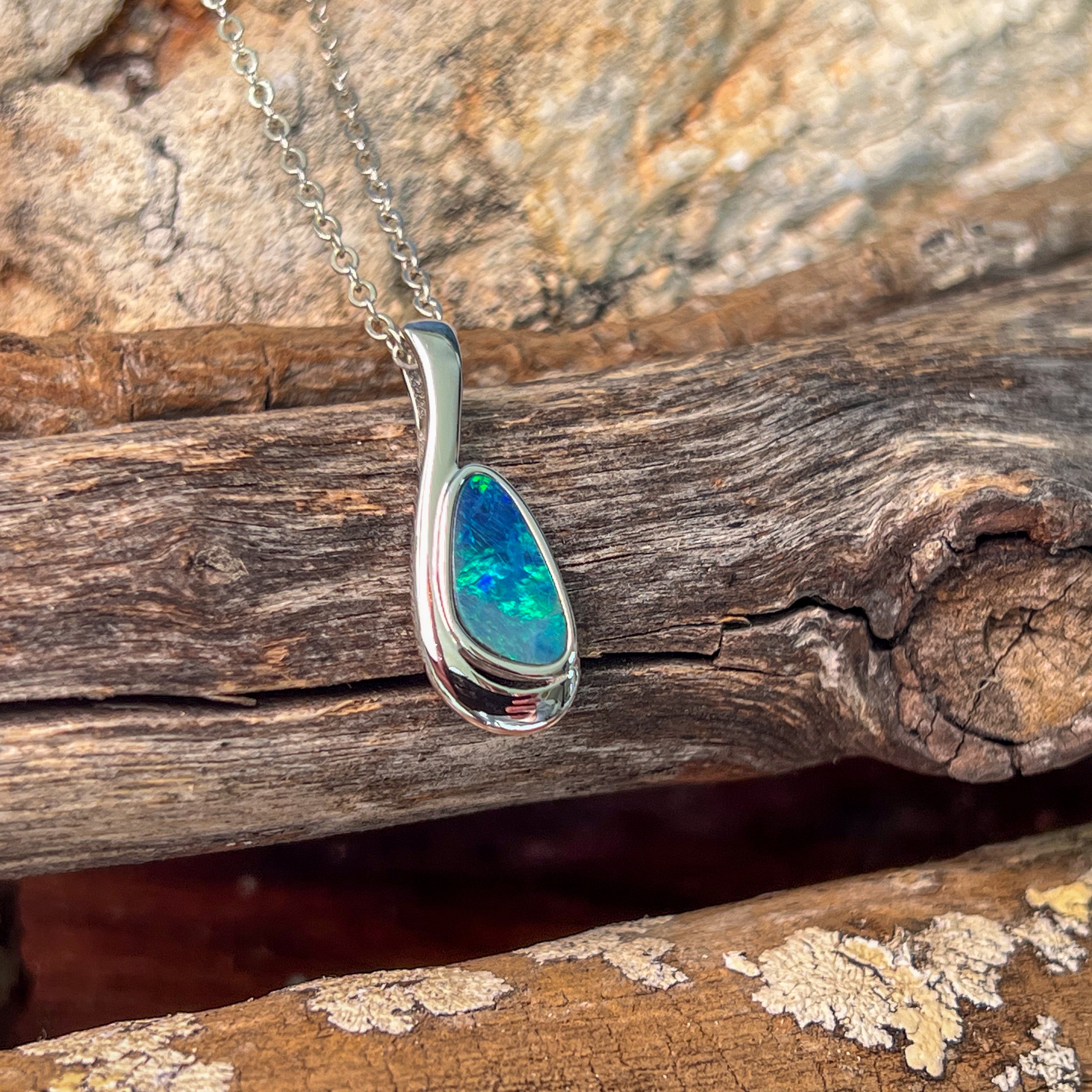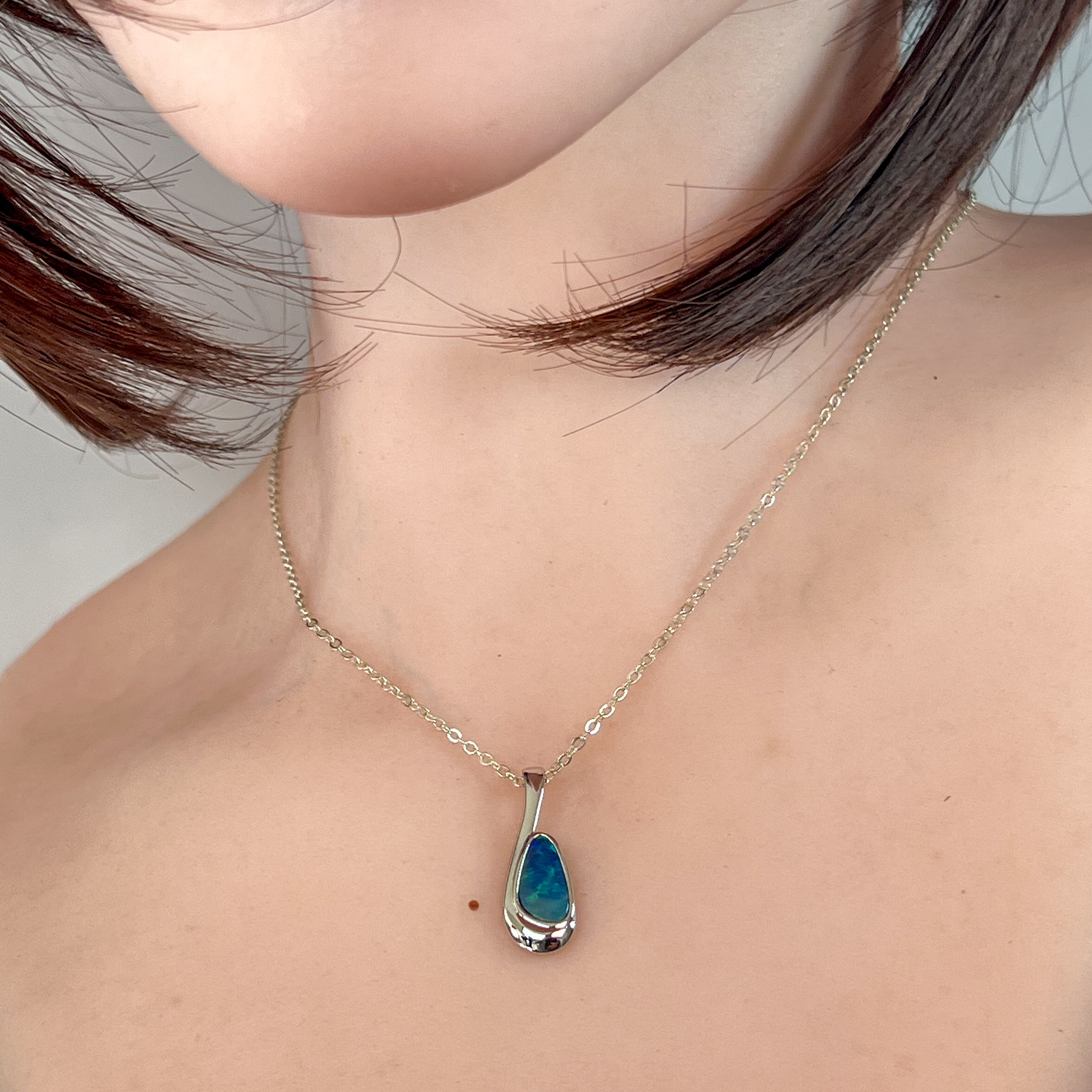 Add a splash of ocean-inspired charm to your look with this sterling silver pendant featuring a mesmerizing blue-green opal drop. Its sleek, modern design effortlessly catches the light, making it the perfect playful accessory to brighten any outfit. Dive into style with a piece that’s as vibrant and unique as you are!