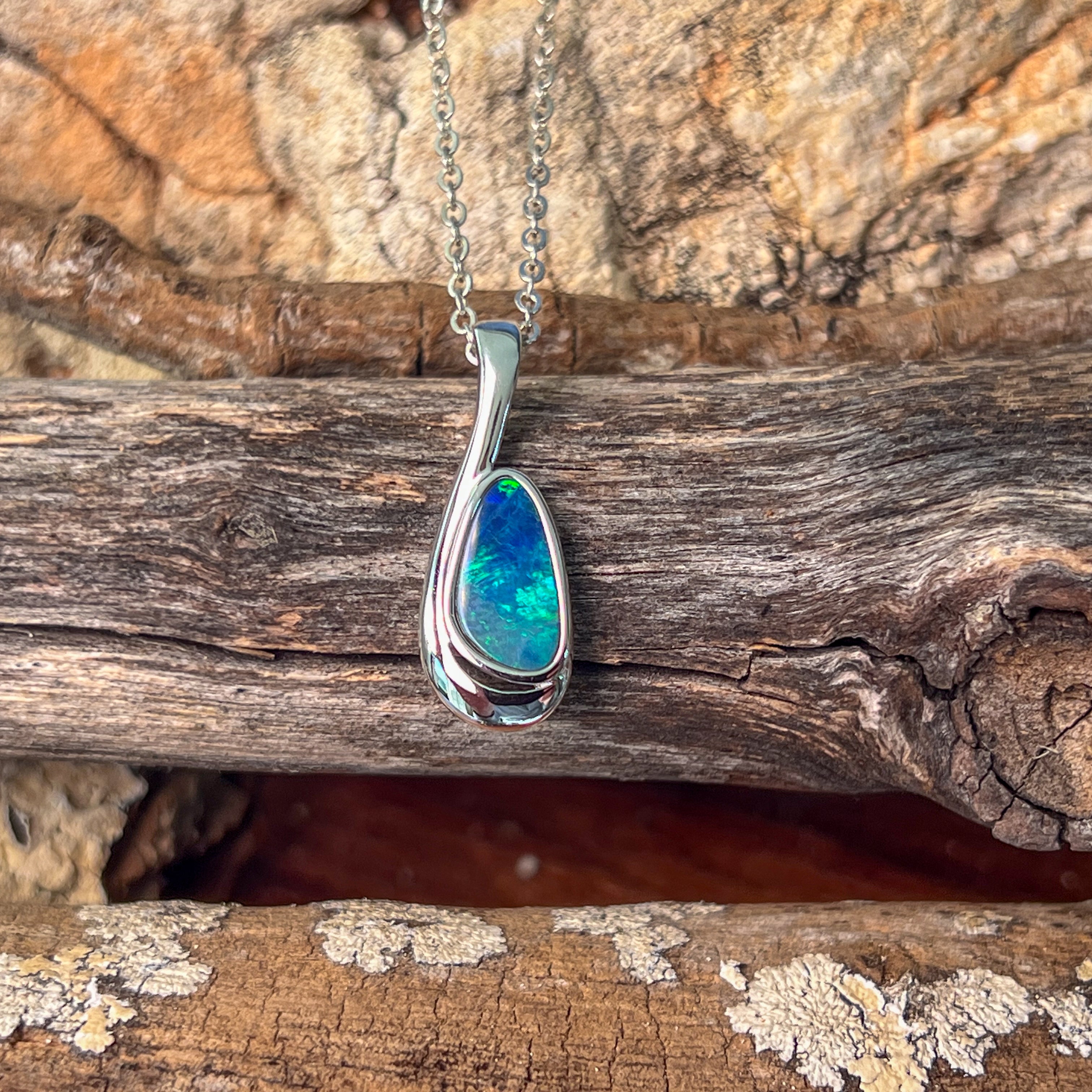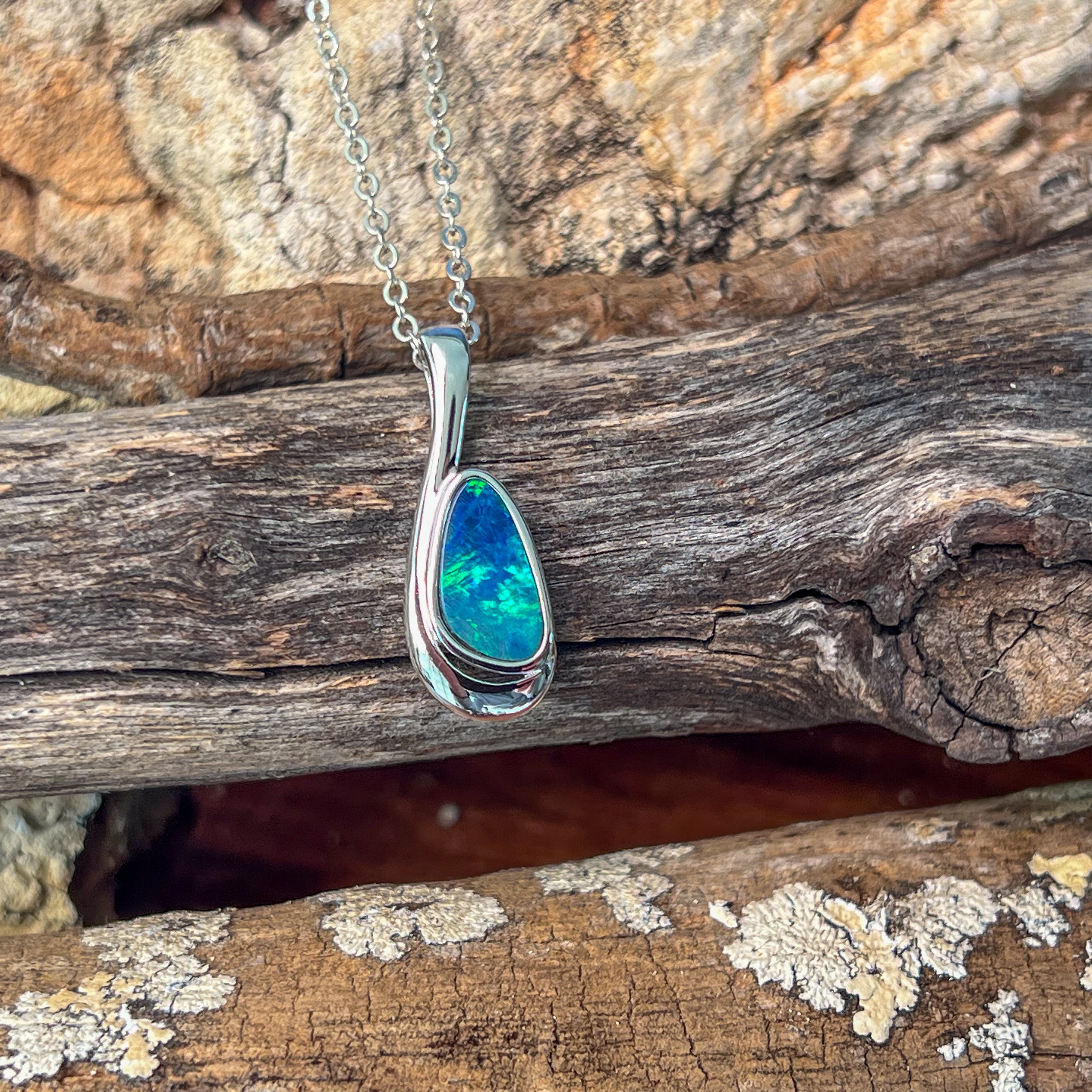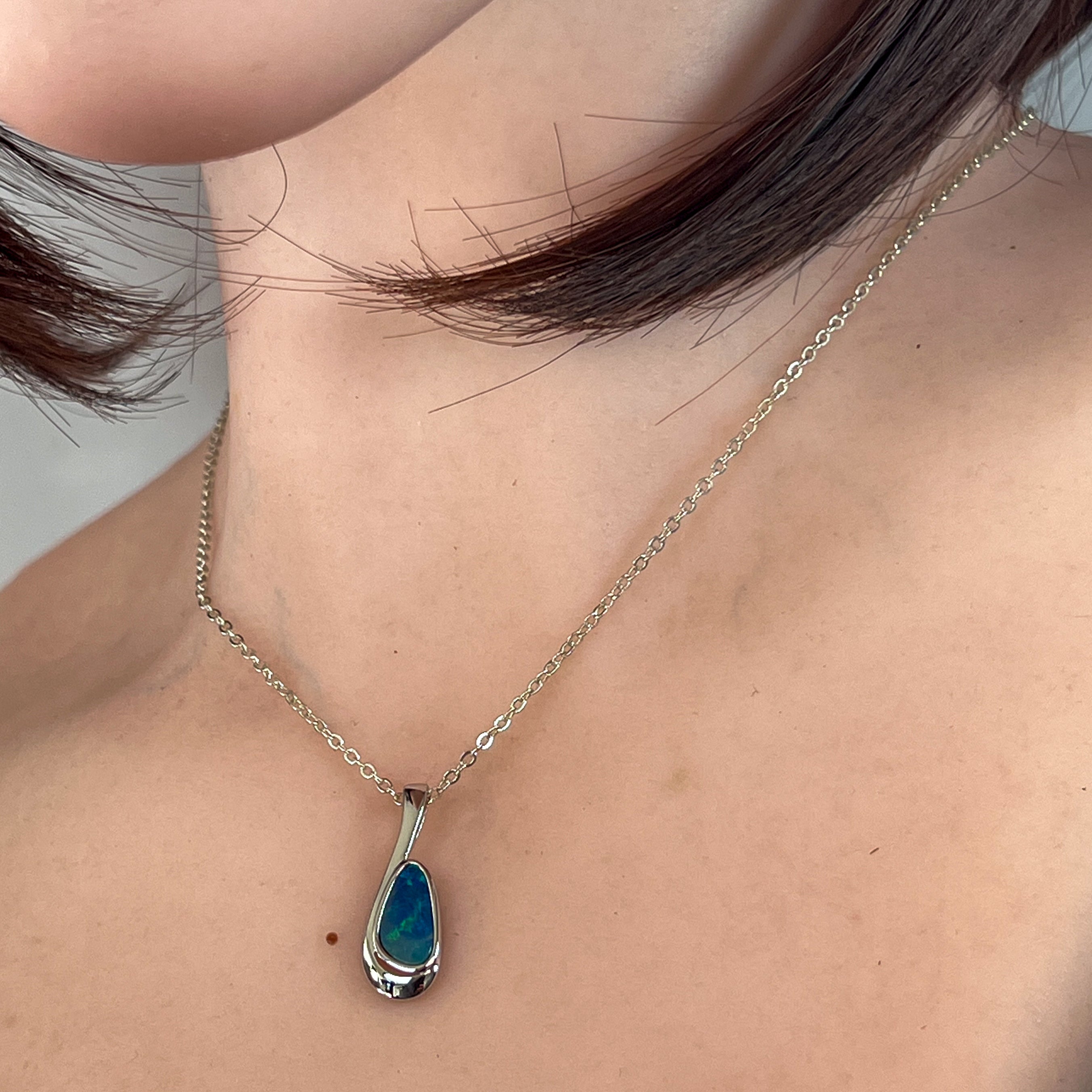 Add a splash of ocean-inspired charm to your look with this sterling silver pendant featuring a mesmerizing blue-green opal drop. Its sleek, modern design effortlessly catches the light, making it the perfect playful accessory to brighten any outfit. Dive into style with a piece that’s as vibrant and unique as you are!