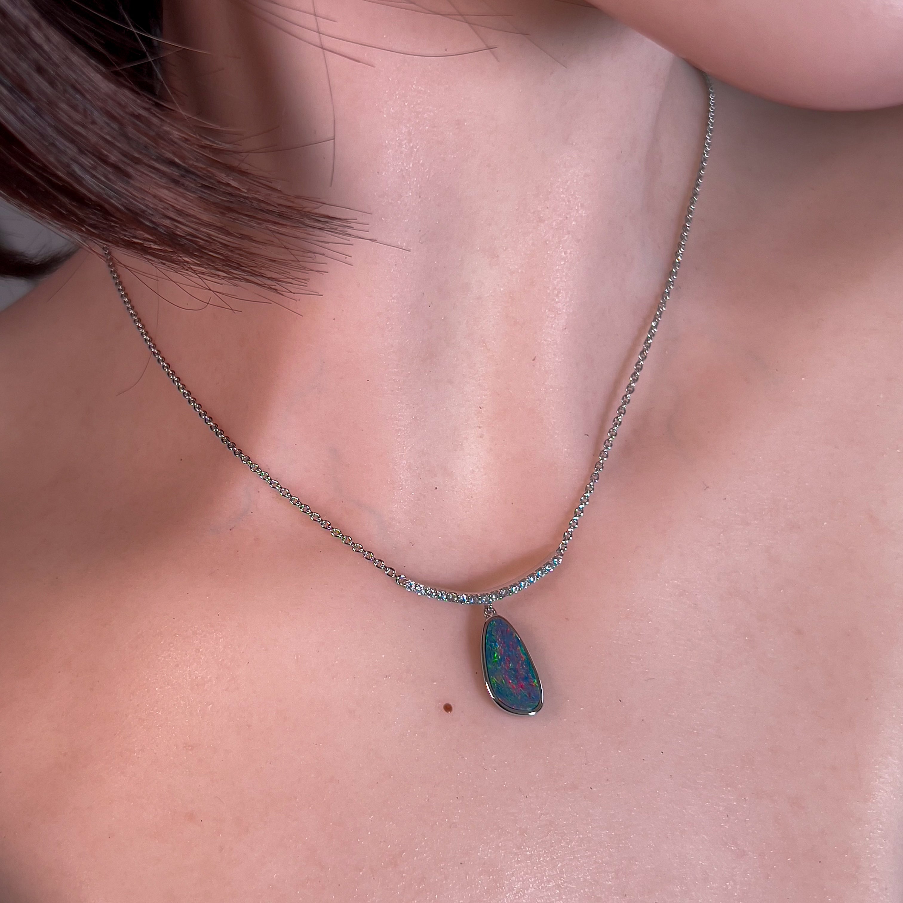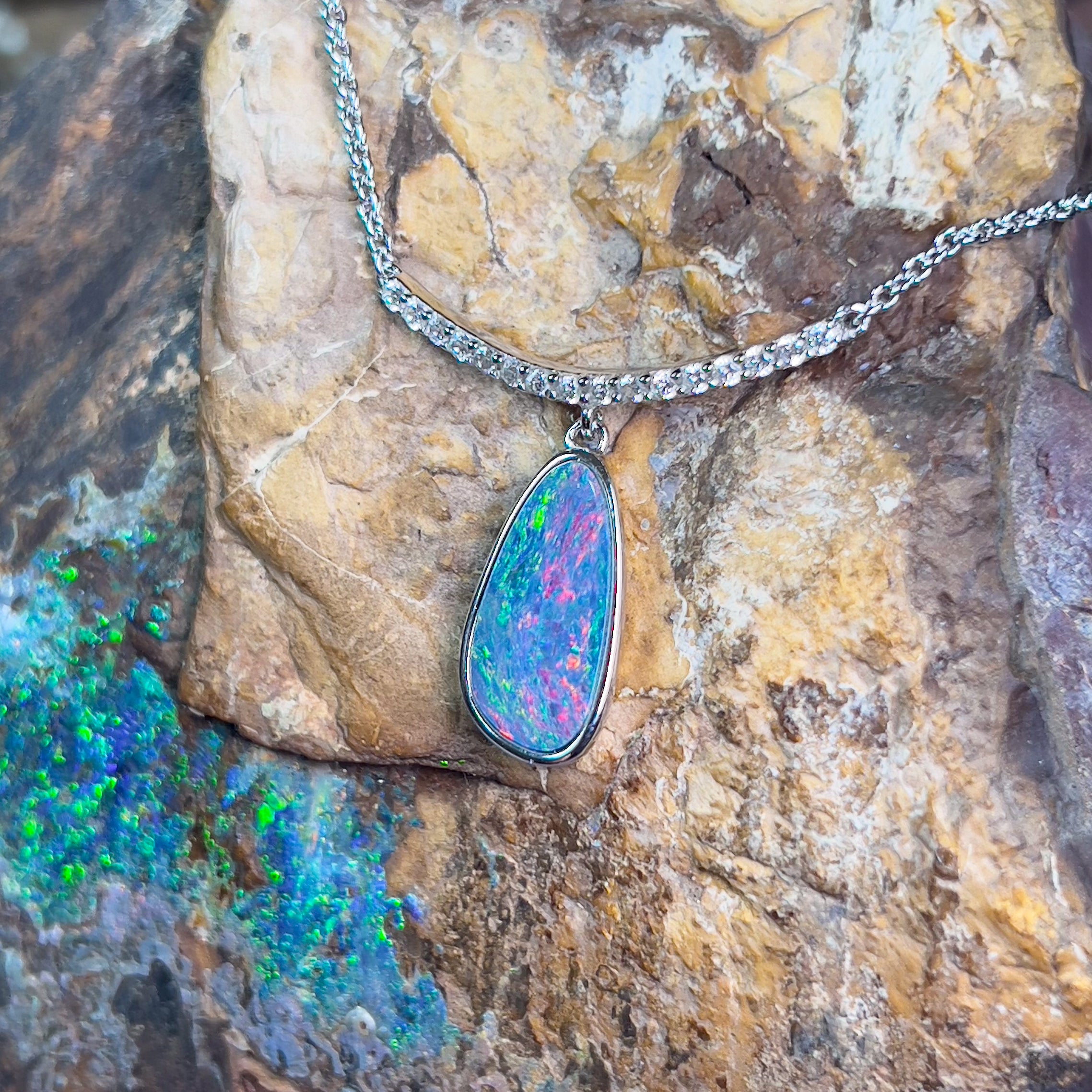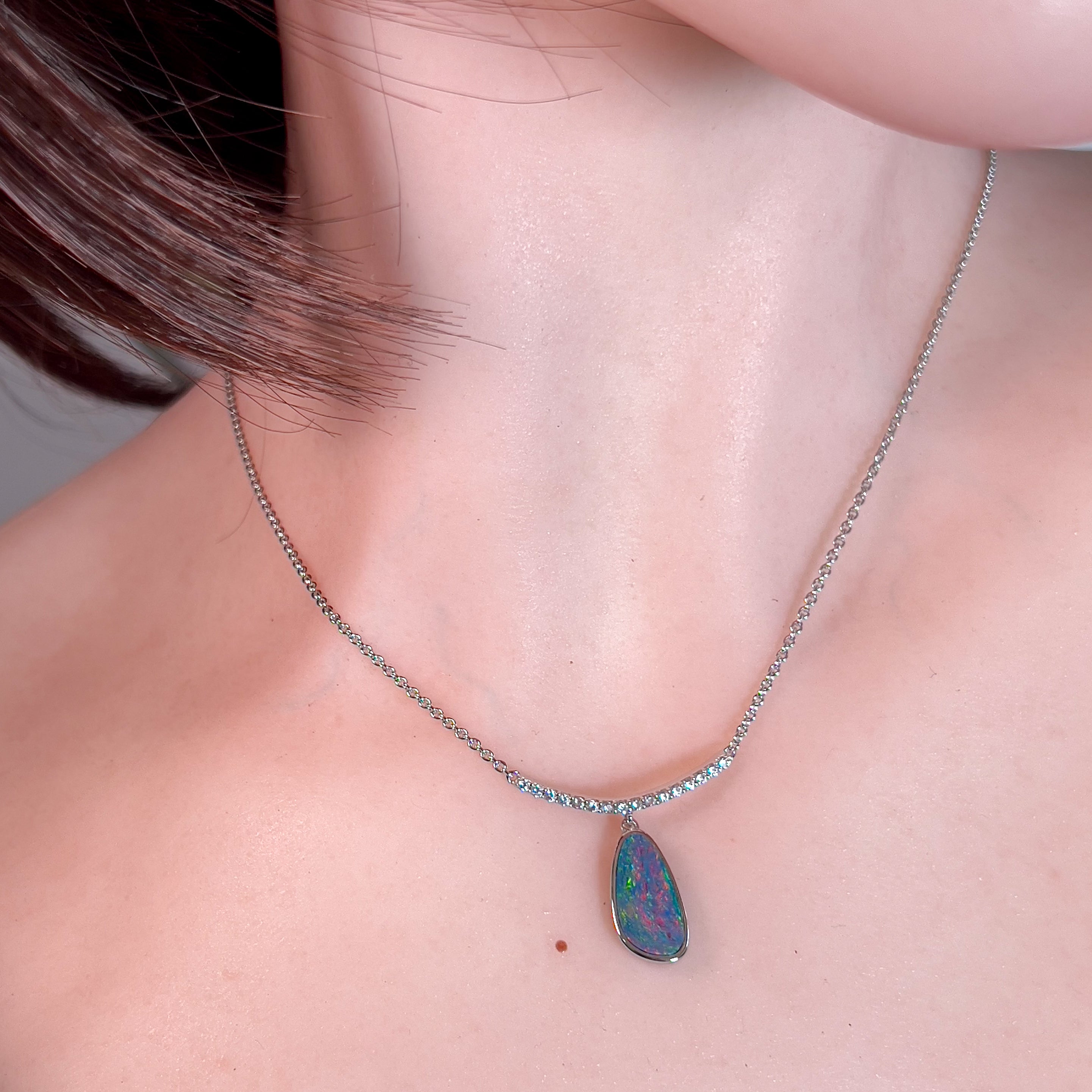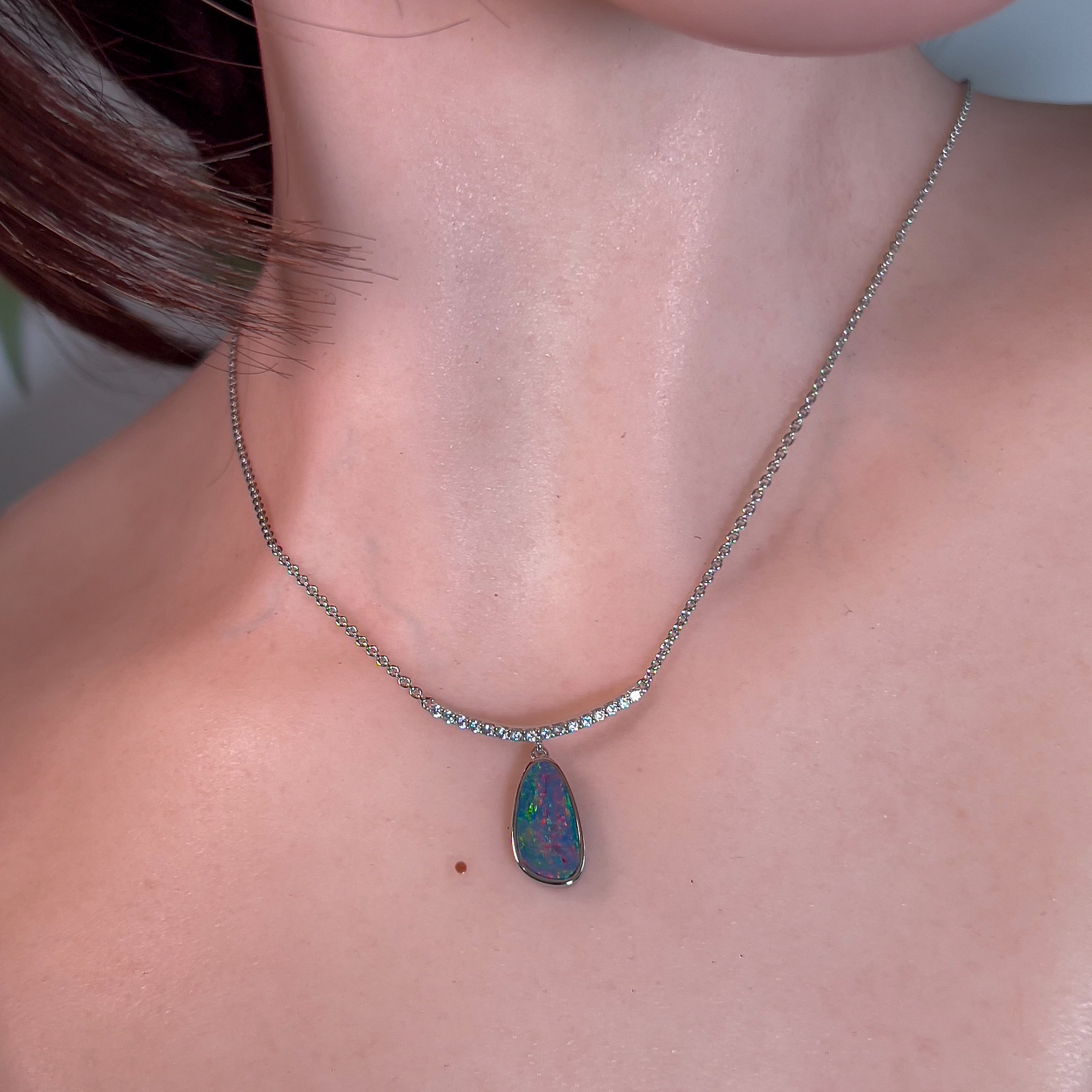 Light up any room with our Sterling Silver Opal doublet and cubic zirconia necklace. The fiery brilliance of the opal doublet paired with shimmering cubic zirconia will make you stand out. Your outfit will never be dull again!